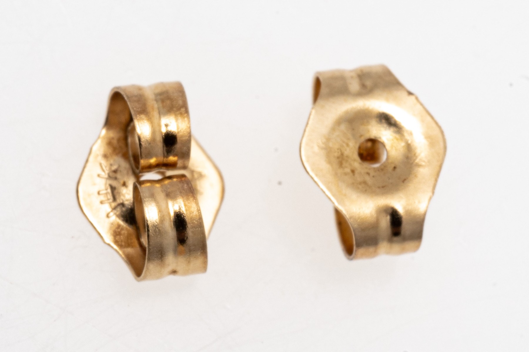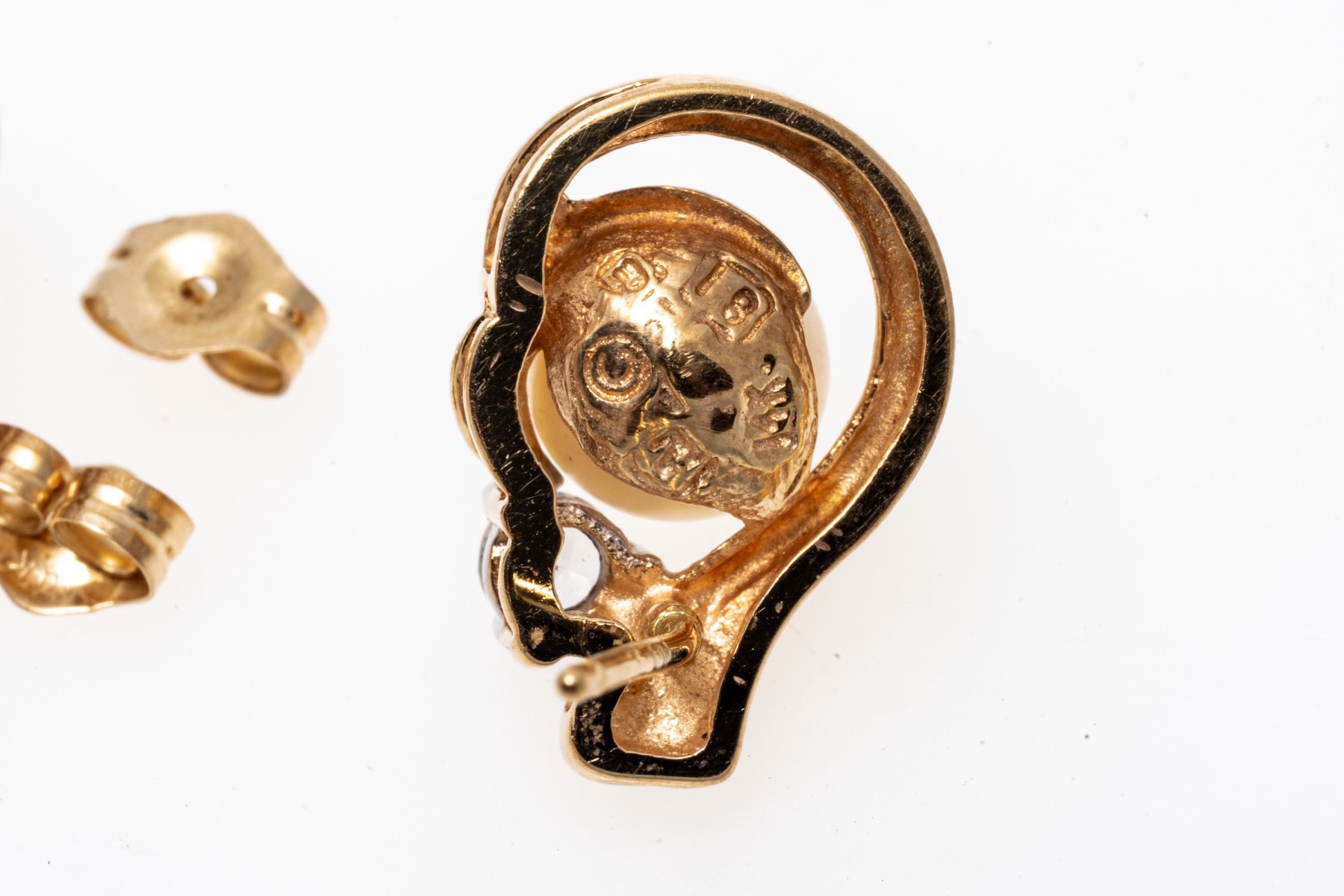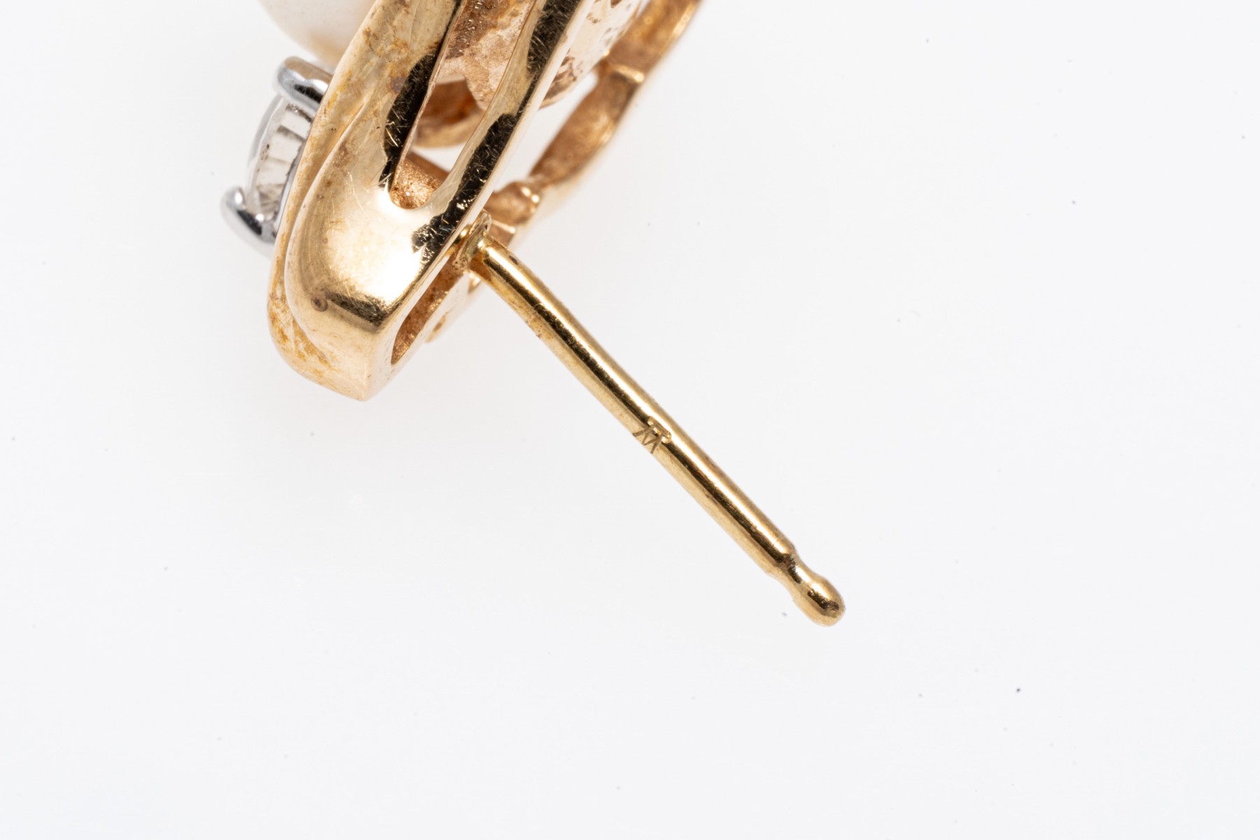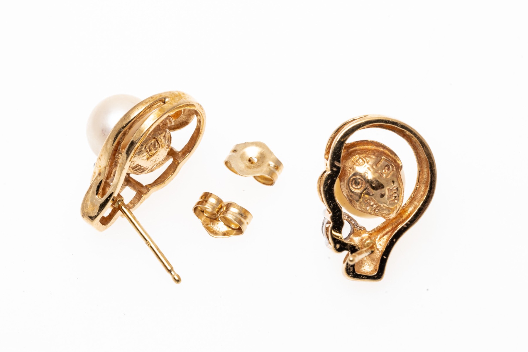 14k yellow gold retro 6.5 mm cultured pearl and white sapphire swirl earrings, finished by posts with clutch style backs