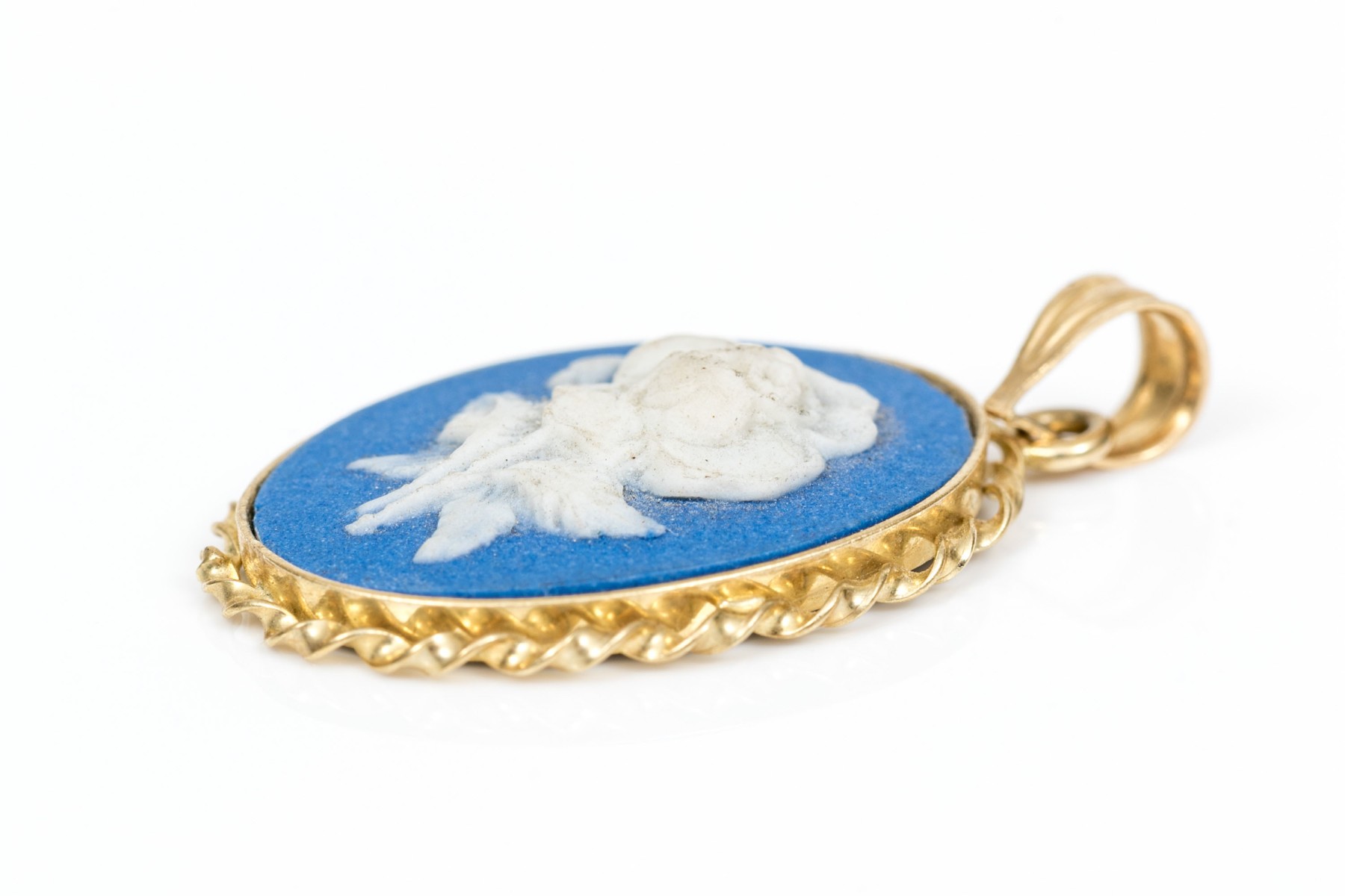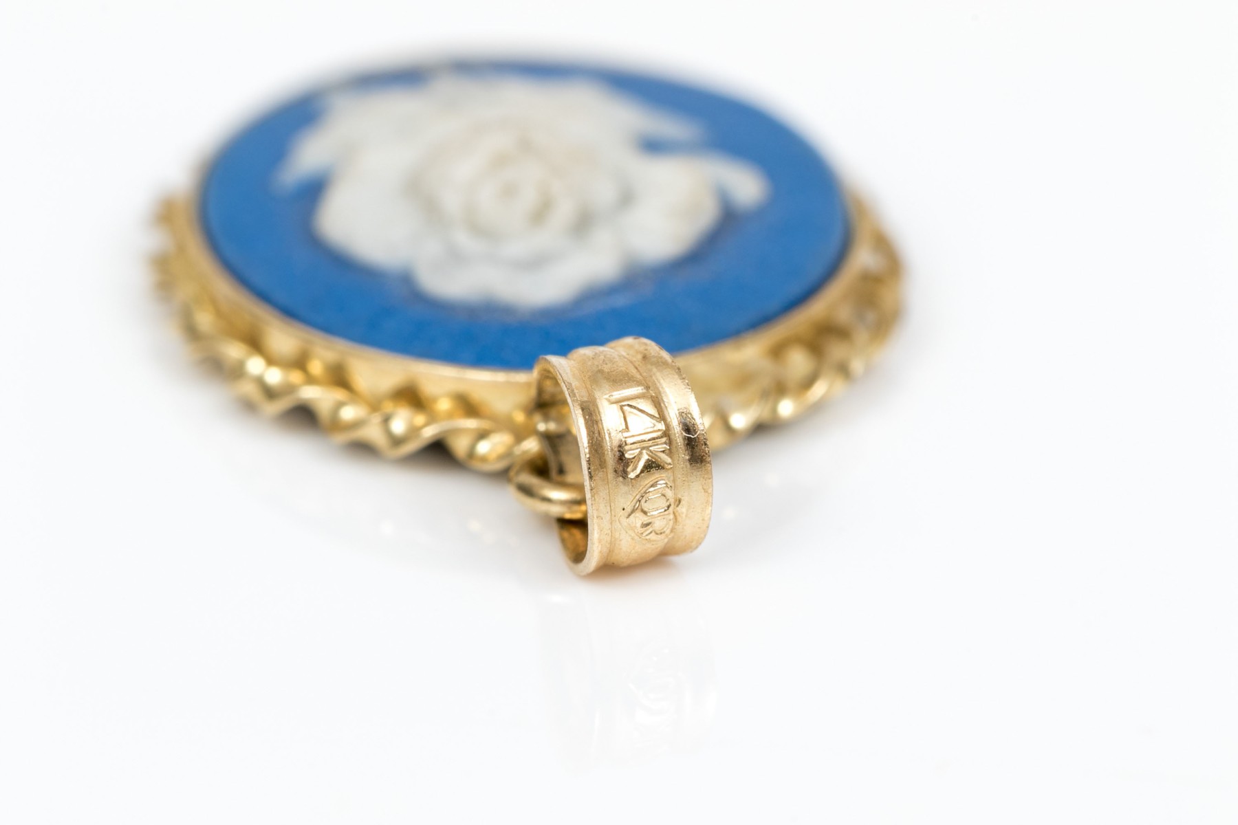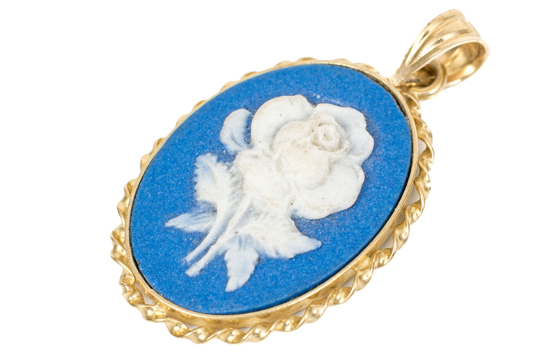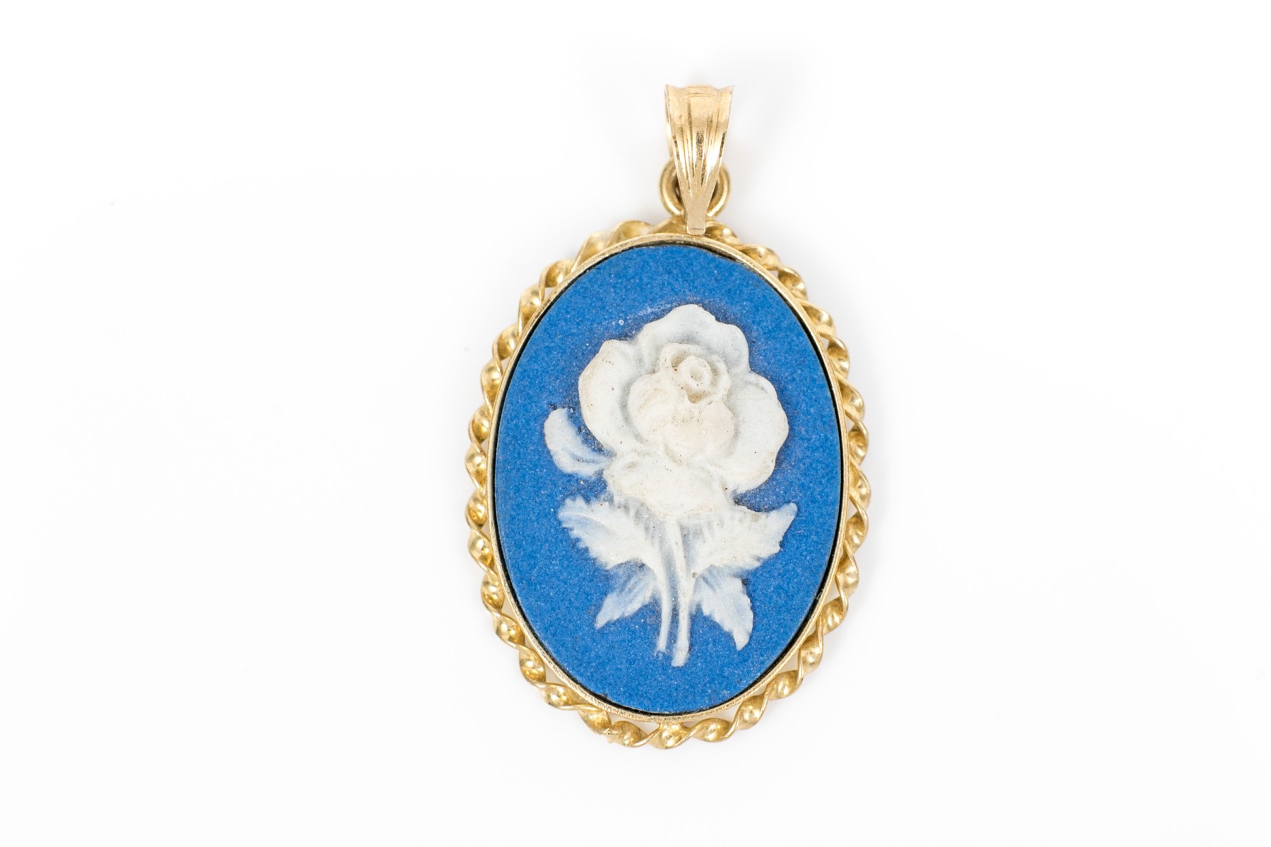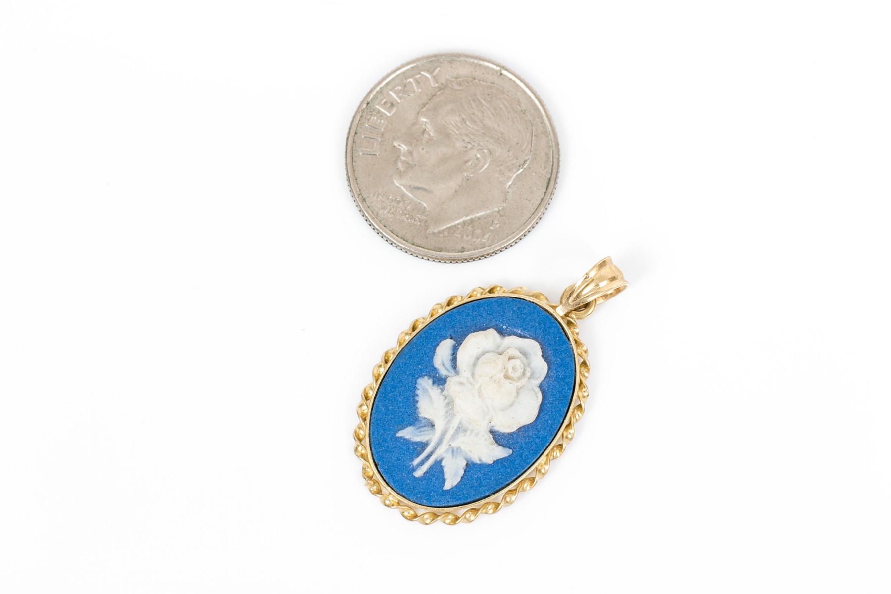 14k yellow gold retro blue Wedgewood style rose motif pendant, patterned edge, finished with a ribbed bale