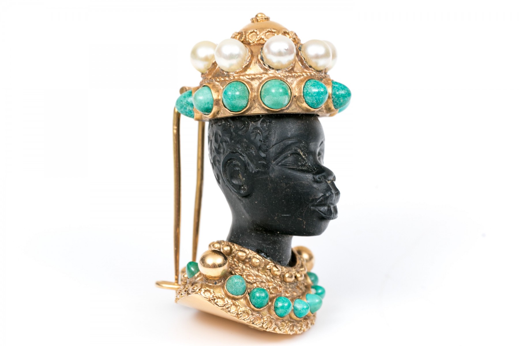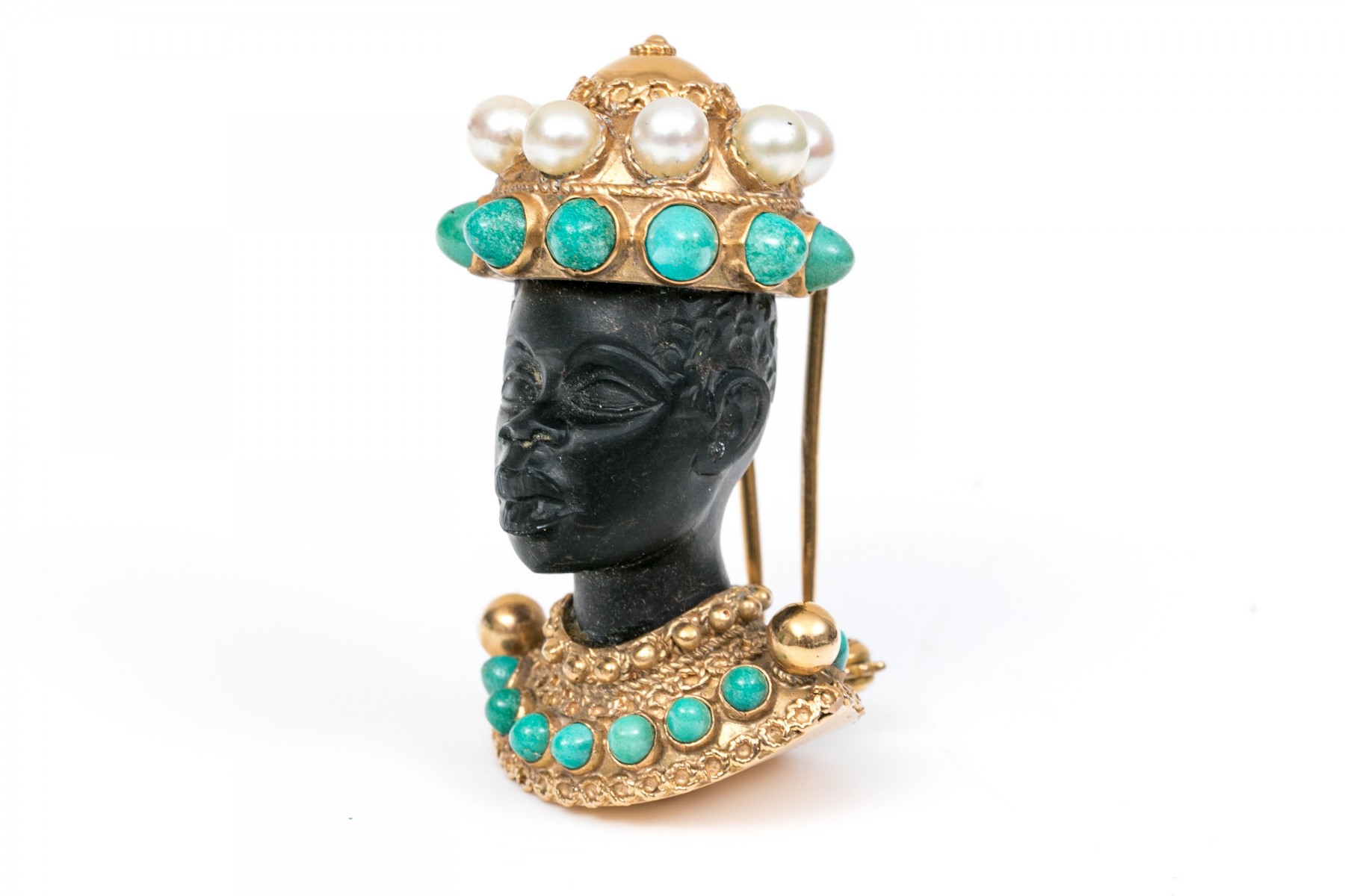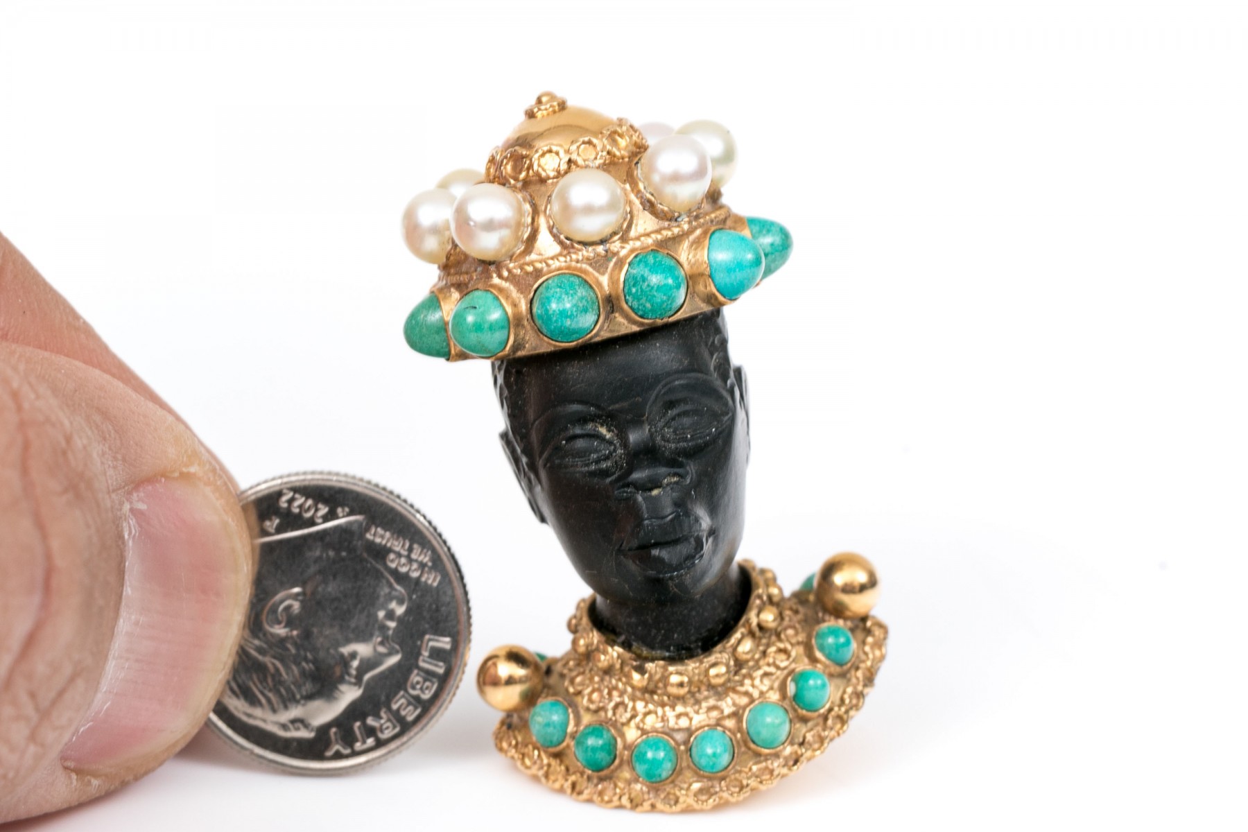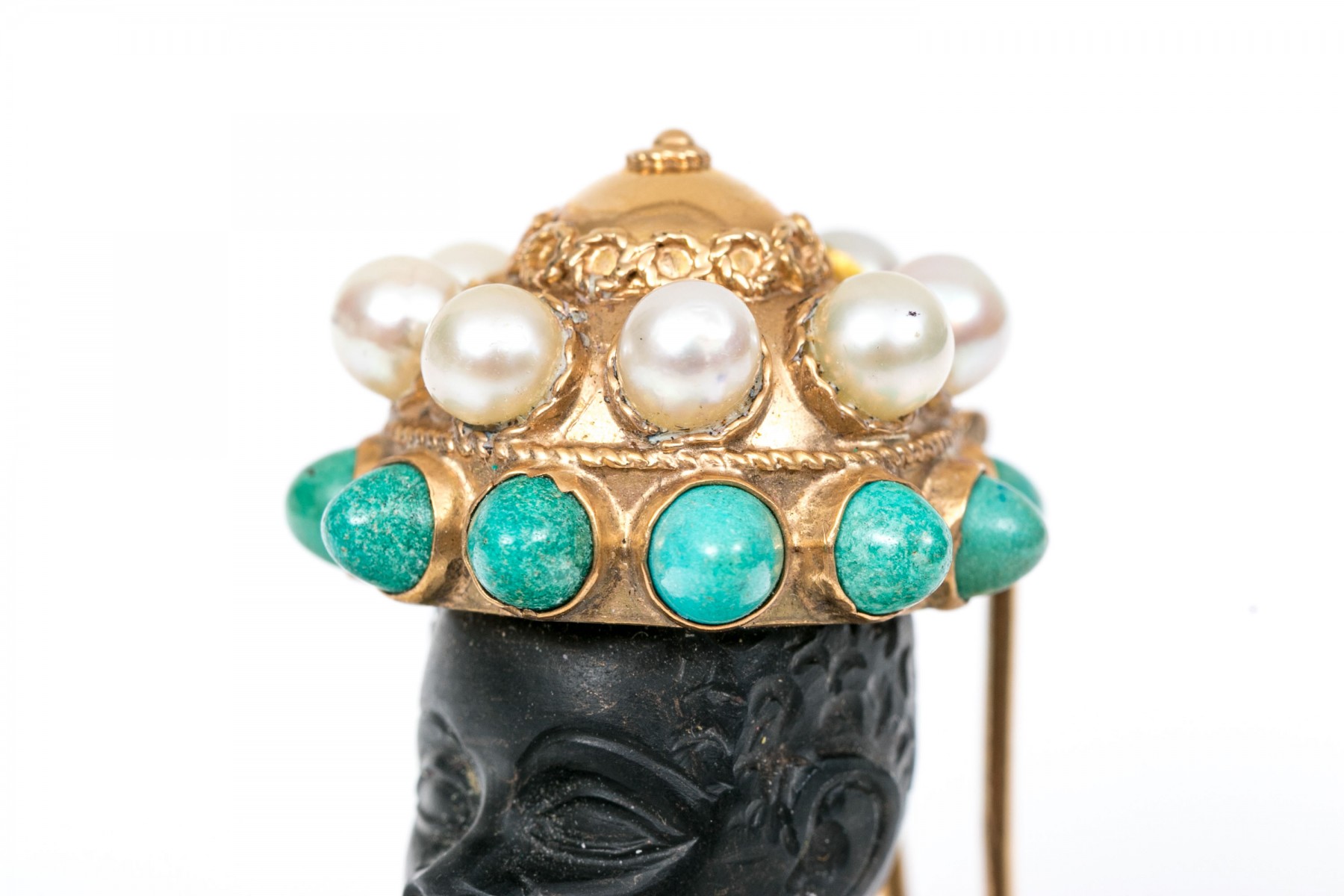 14k yellow gold retro cultured pearl and turquoise blackamoor brooch