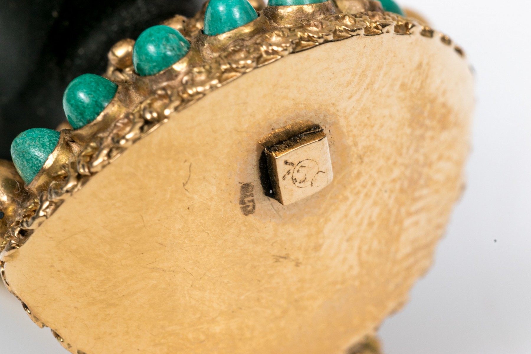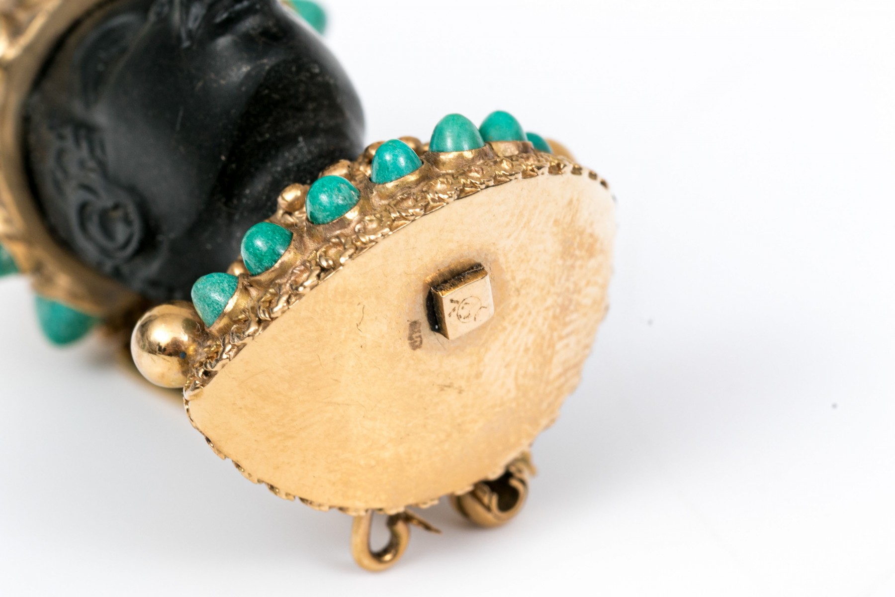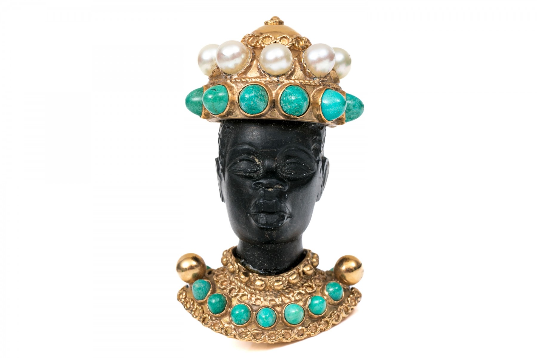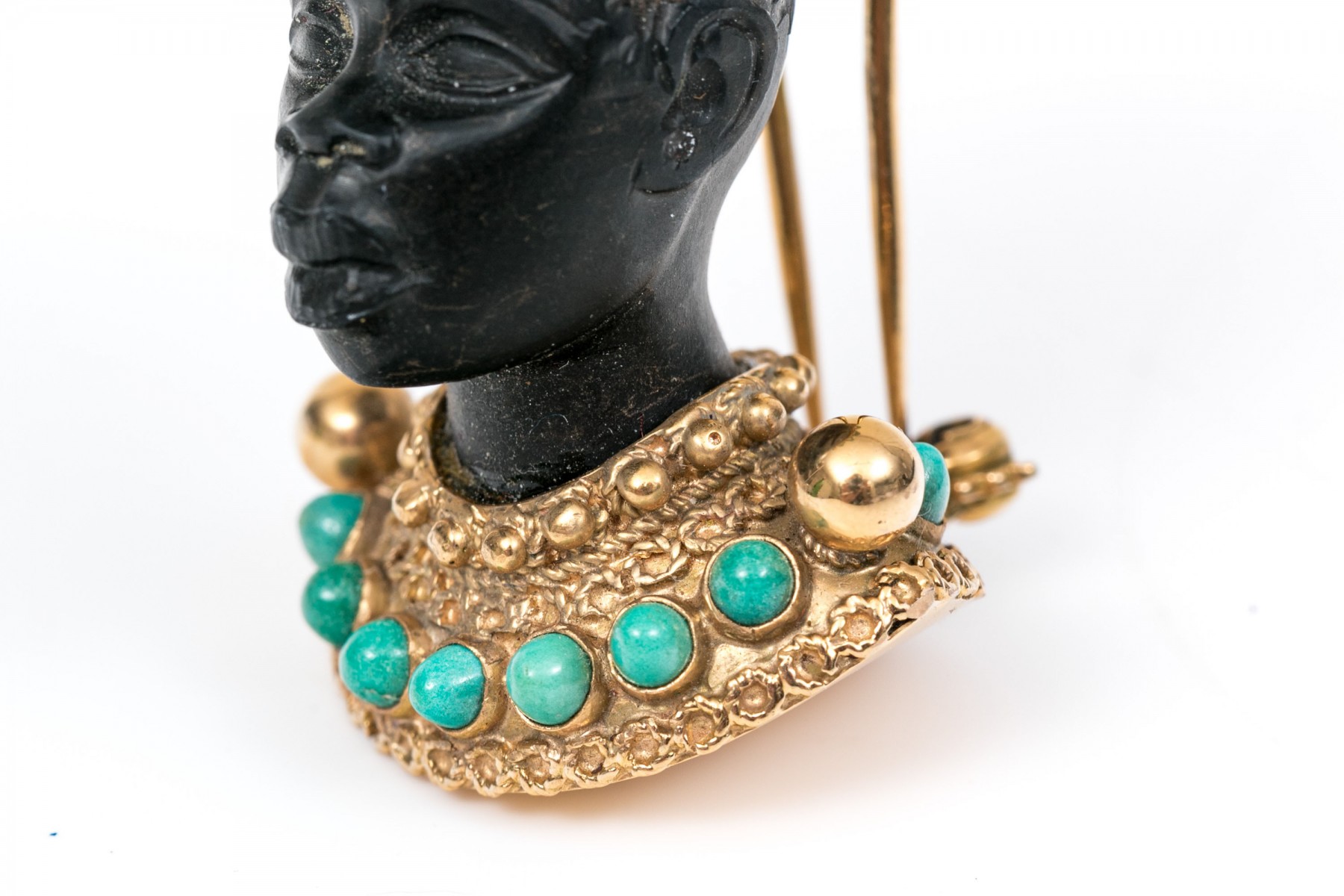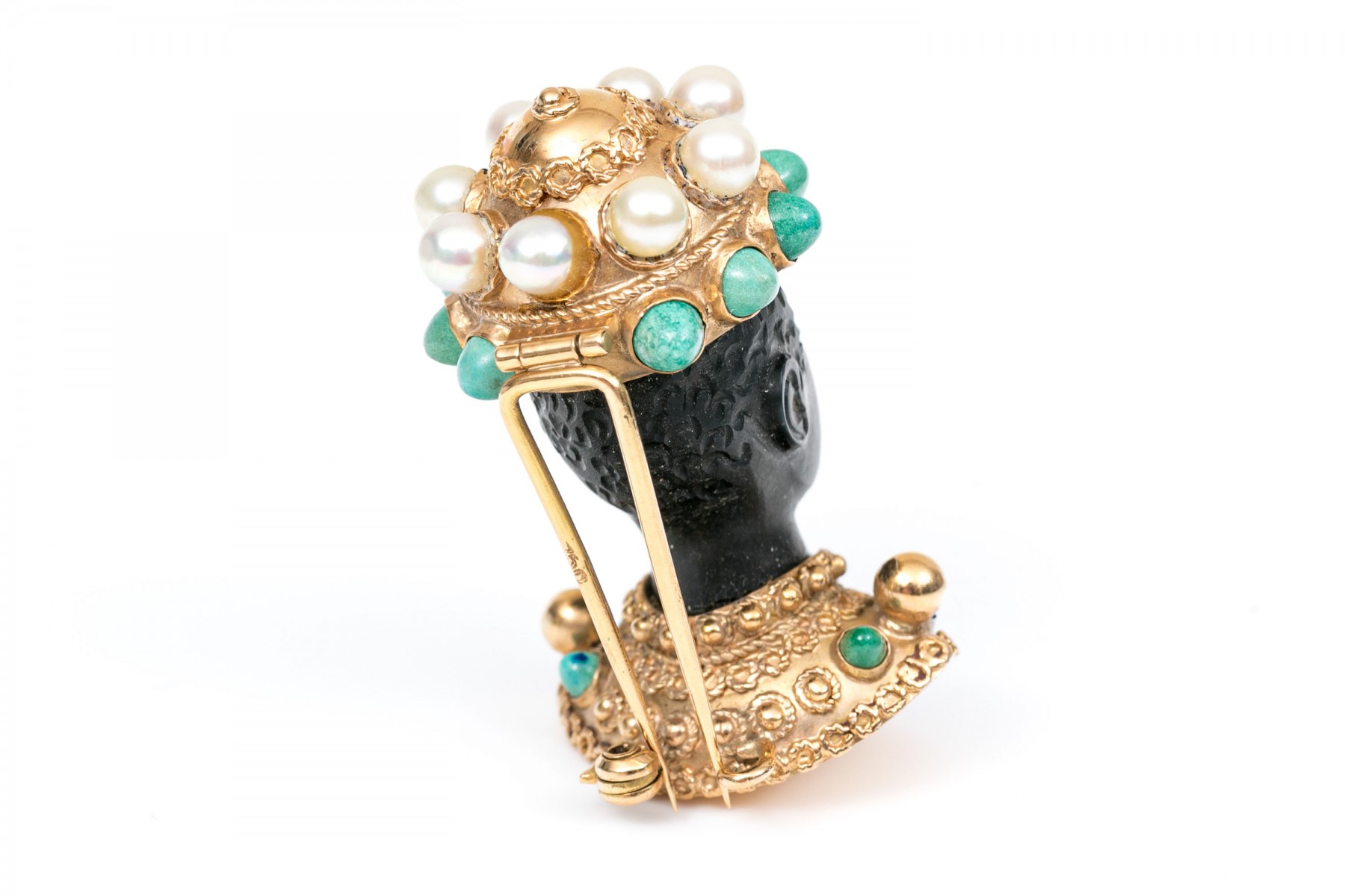 14k yellow gold retro cultured pearl and turquoise blackamoor brooch
