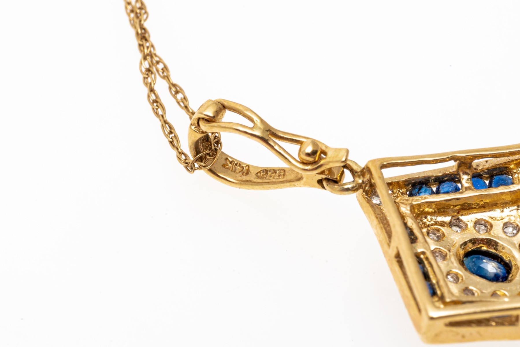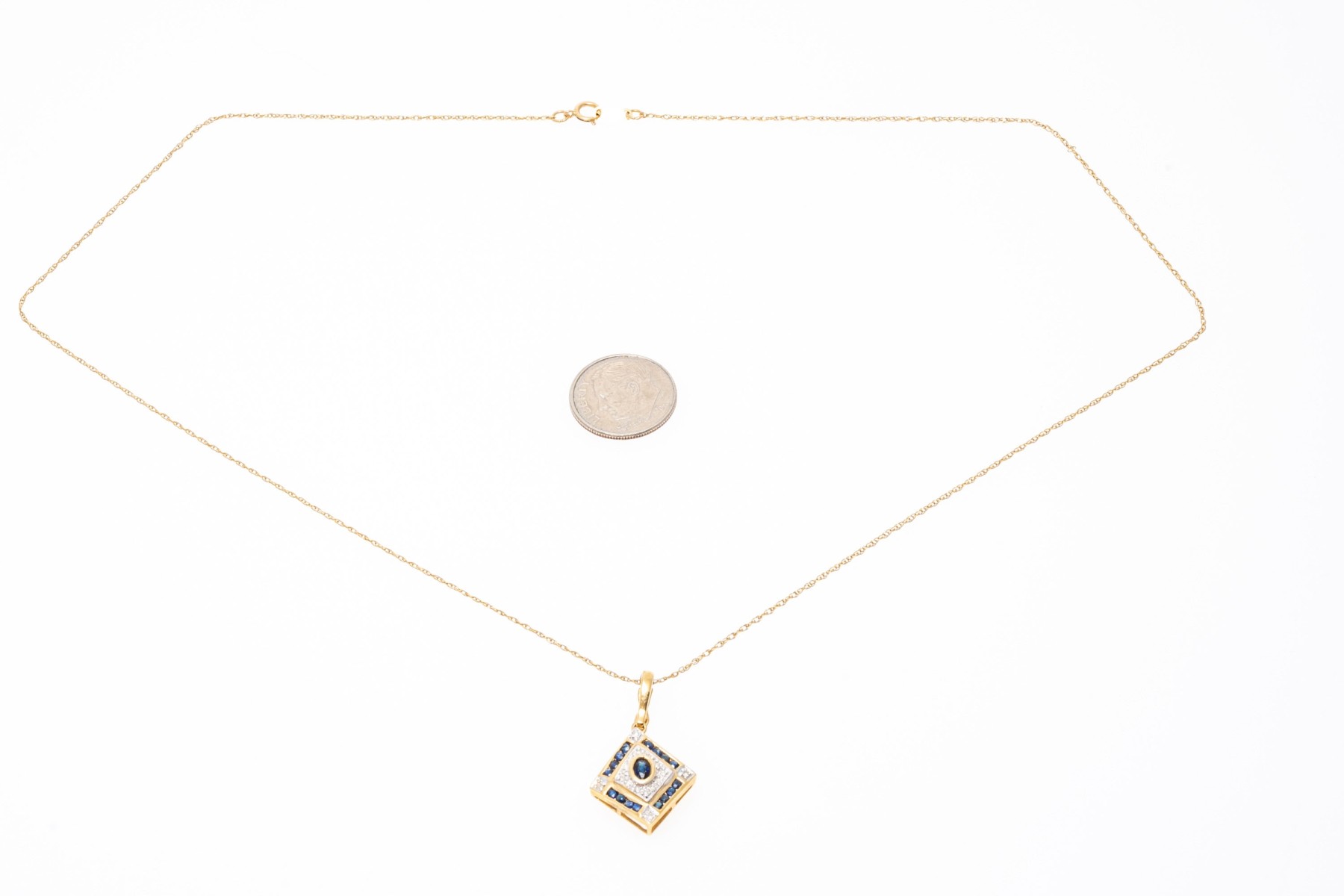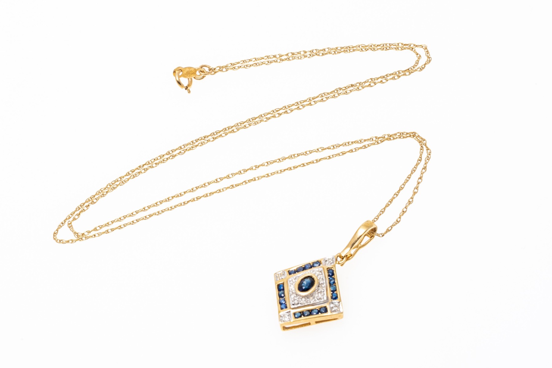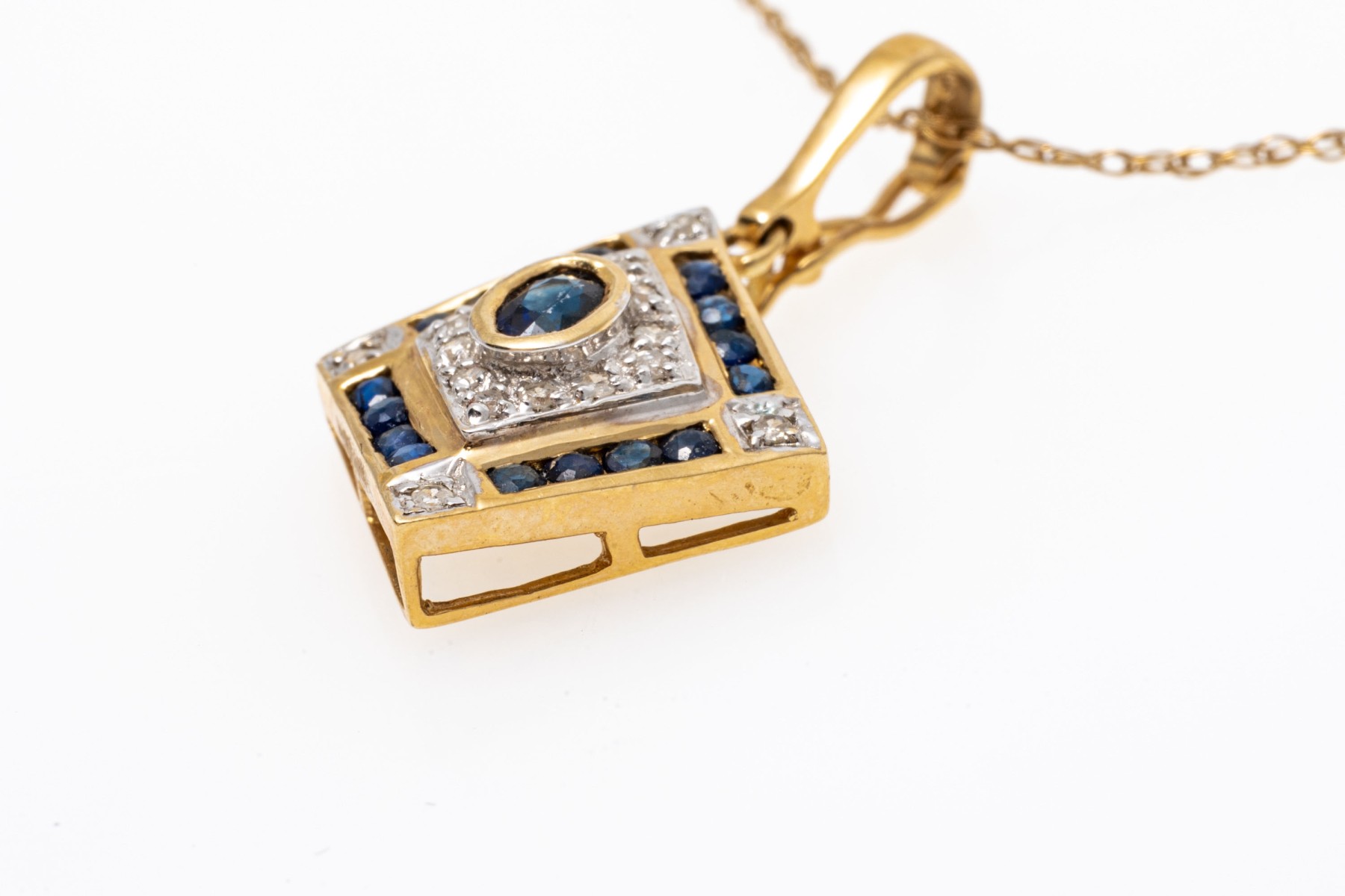 14k yellow gold retro sapphire and diamond set pendant, with chain, app. 0.10 TCW diamonds