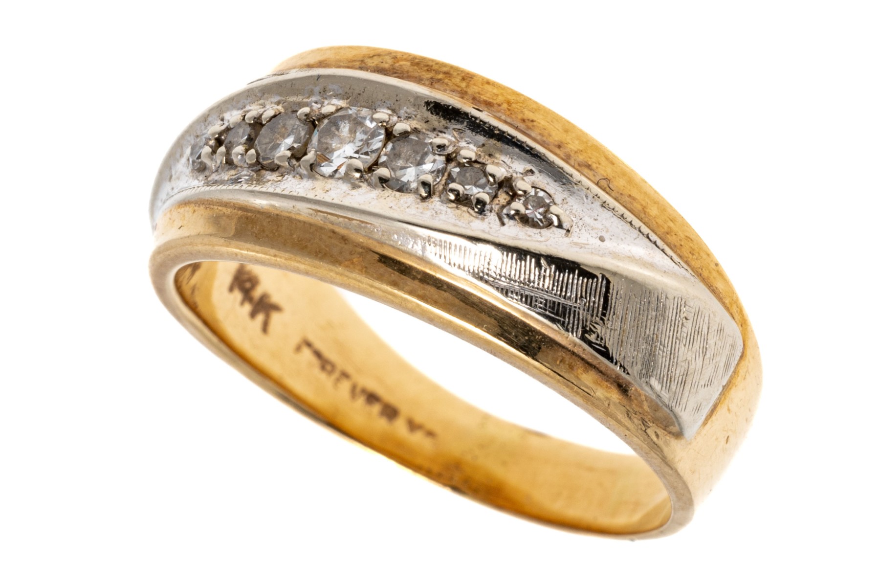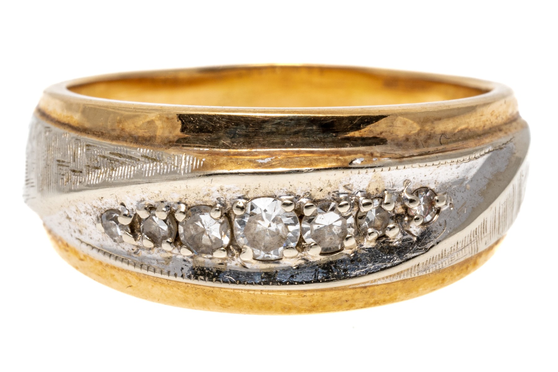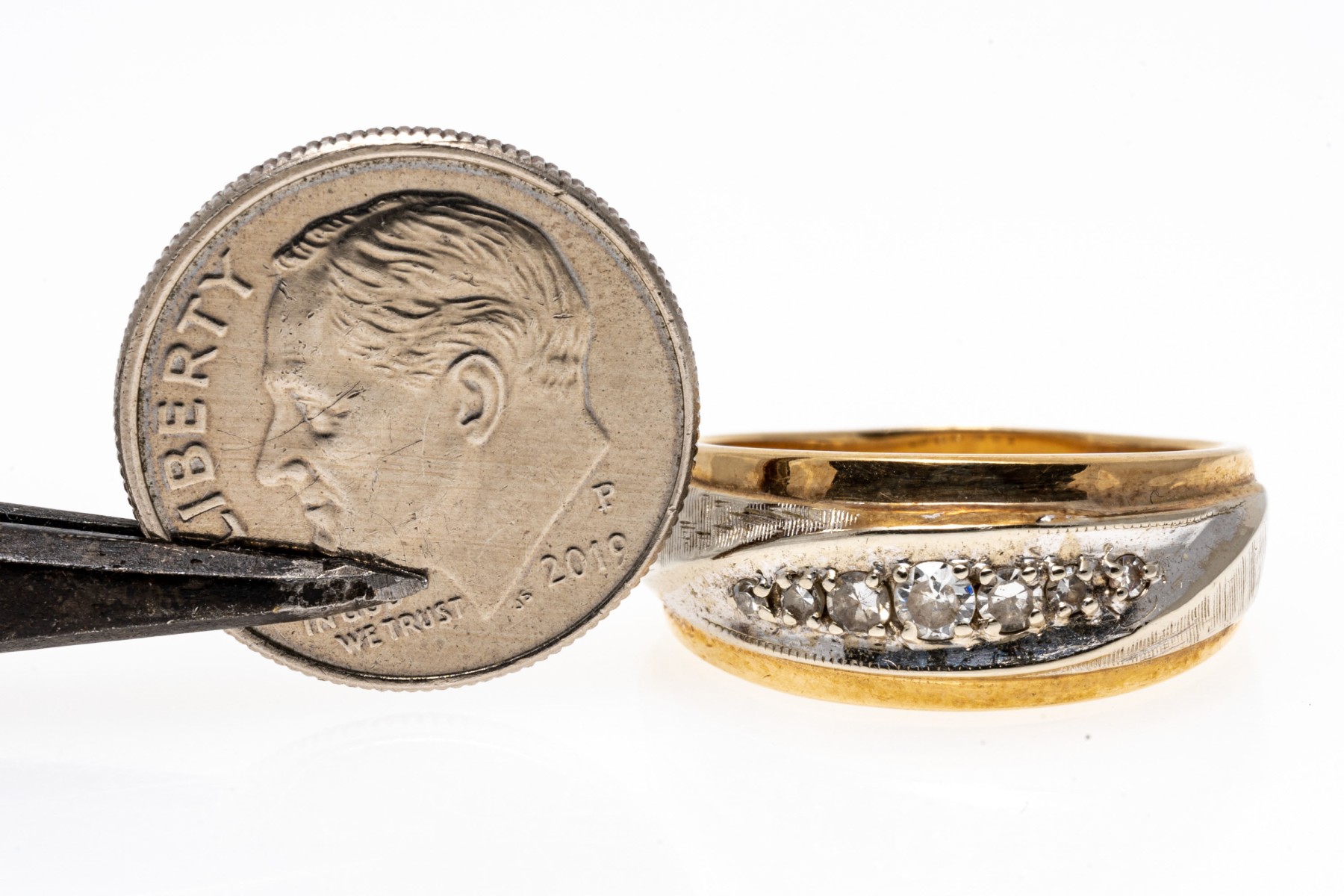 A 14K yellow gold ring. The ring is set with seven graduated round cut diamonds over a white gold setting. The diamonds are approximately 0.19 TCW. Ring size 6.25.