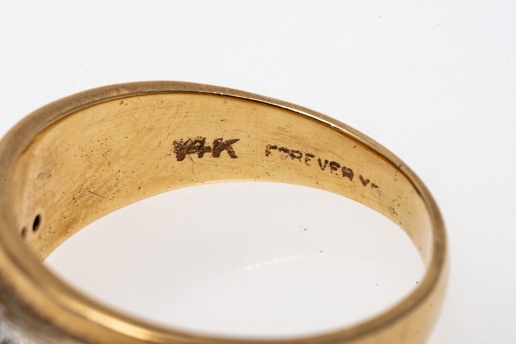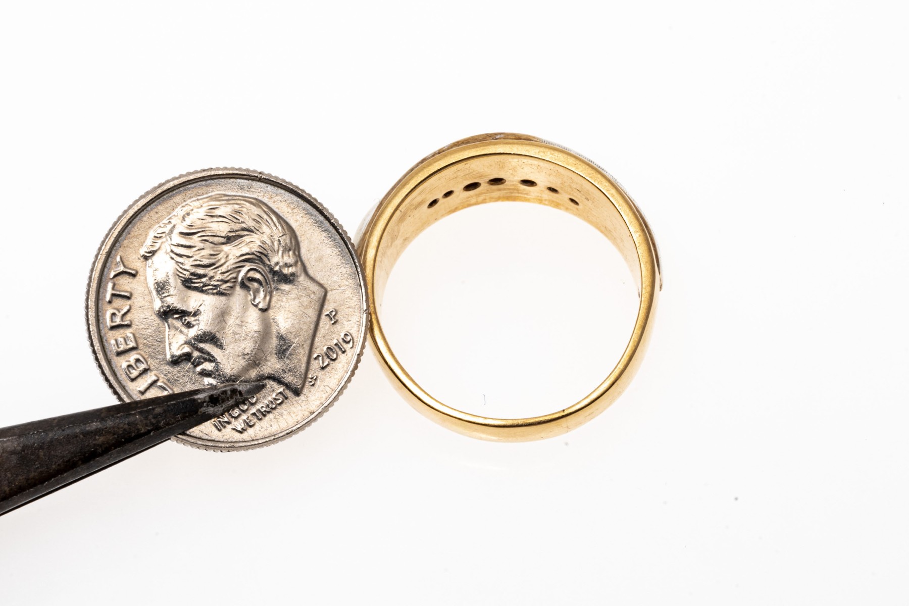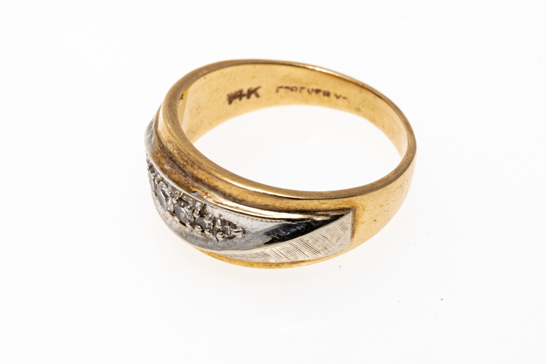 A 14K yellow gold ring. The ring is set with seven graduated round cut diamonds over a white gold setting. The diamonds are approximately 0.19 TCW. Ring size 6.25.