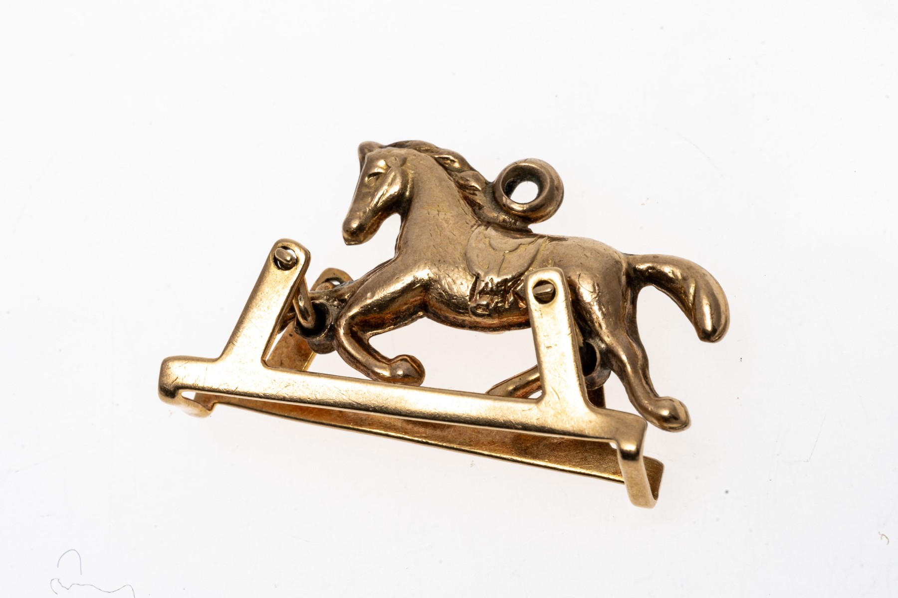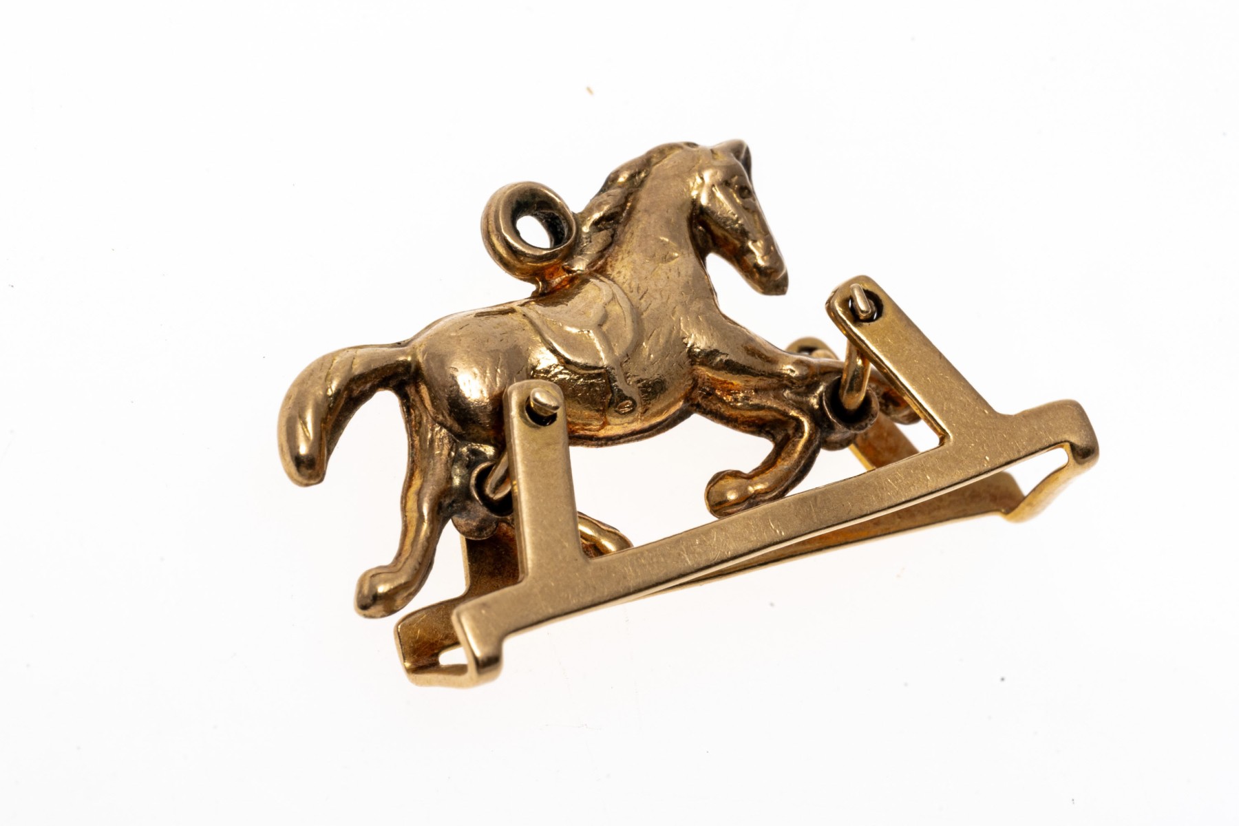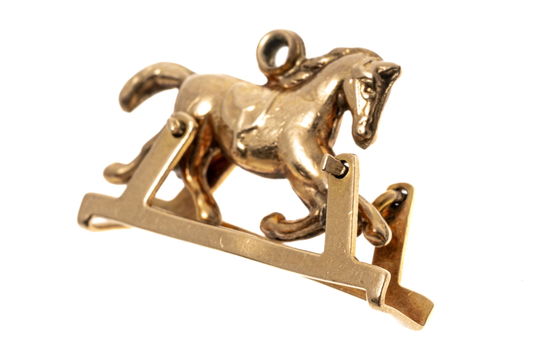 An endearing yellow gold pendant or charm of a trotting horse, set within a frame that allows the horse to rotate within the base for a fun mechanical element.