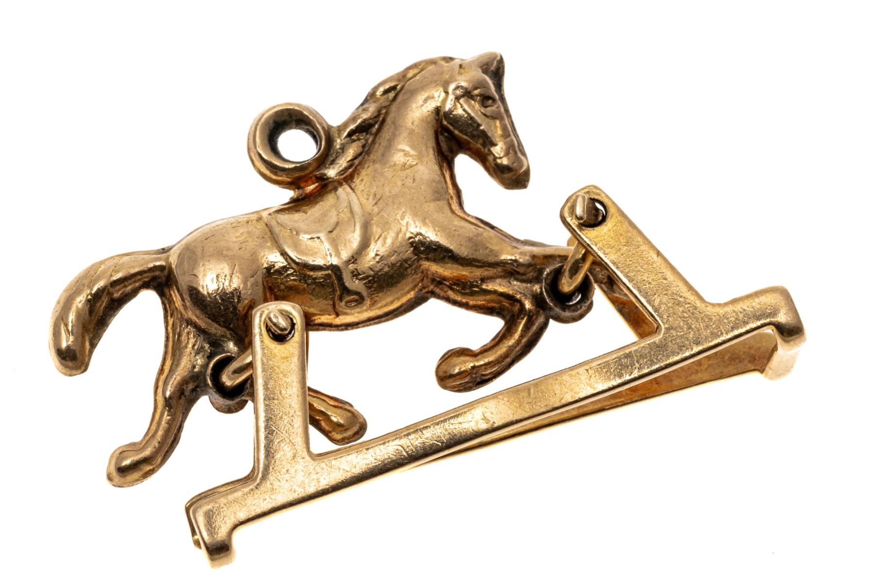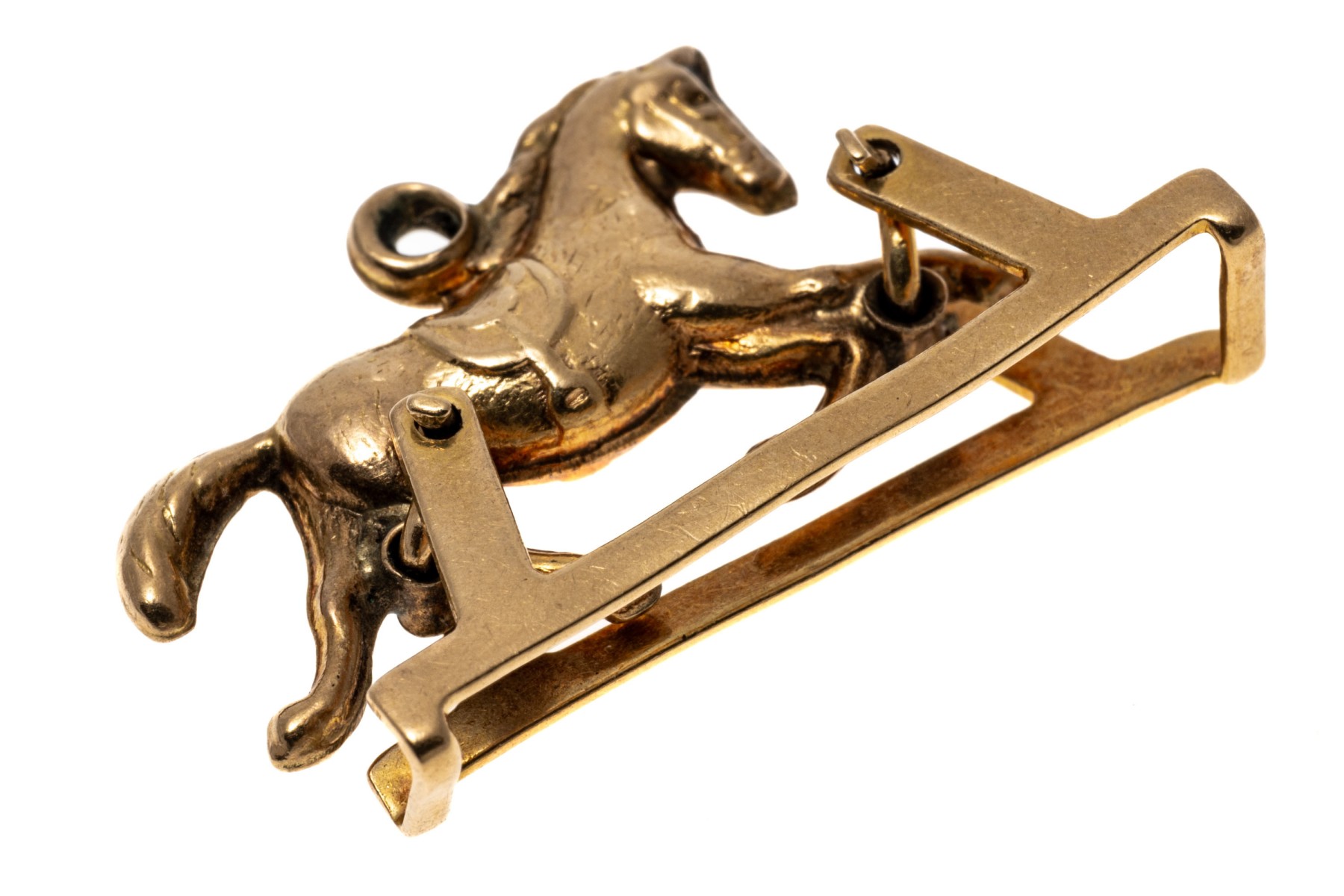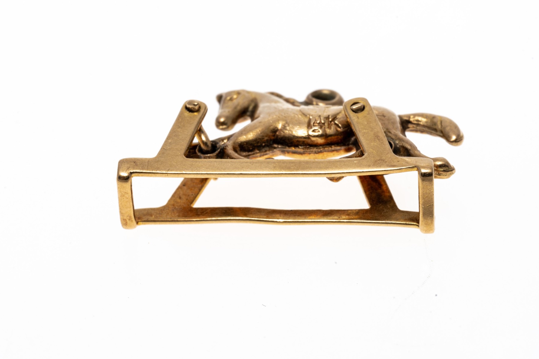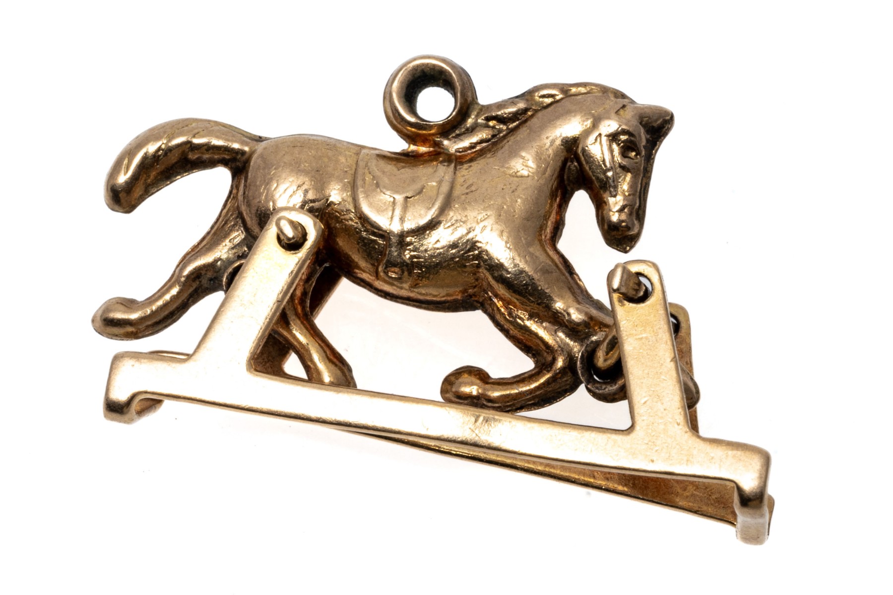 An endearing yellow gold pendant or charm of a trotting horse, set within a frame that allows the horse to rotate within the base for a fun mechanical element.