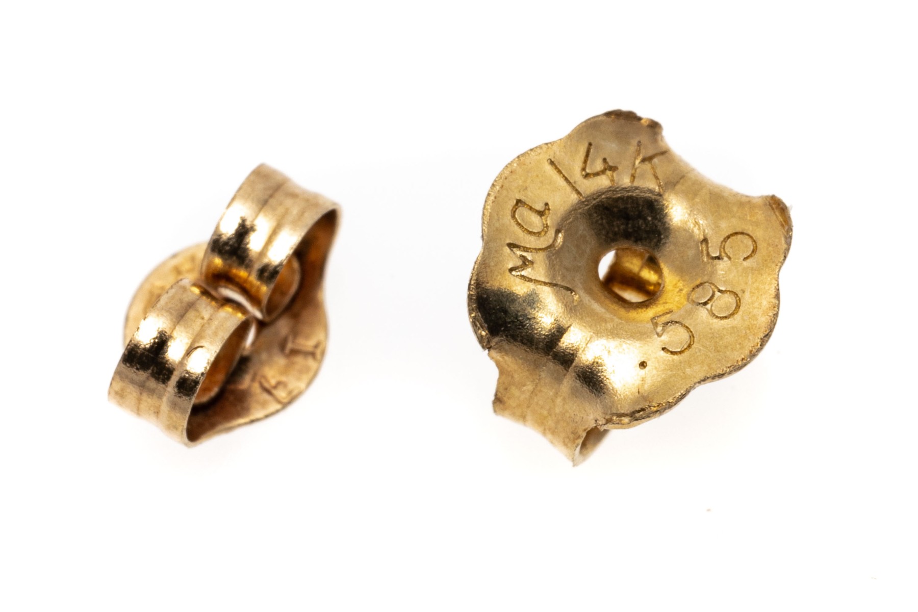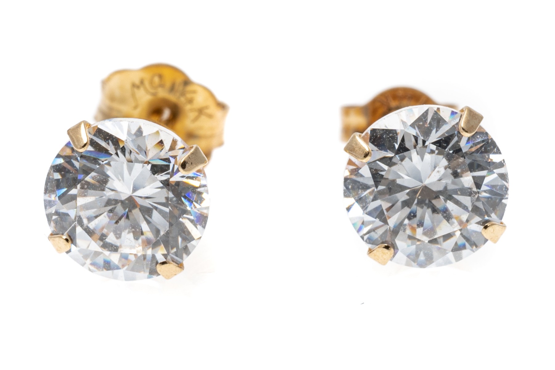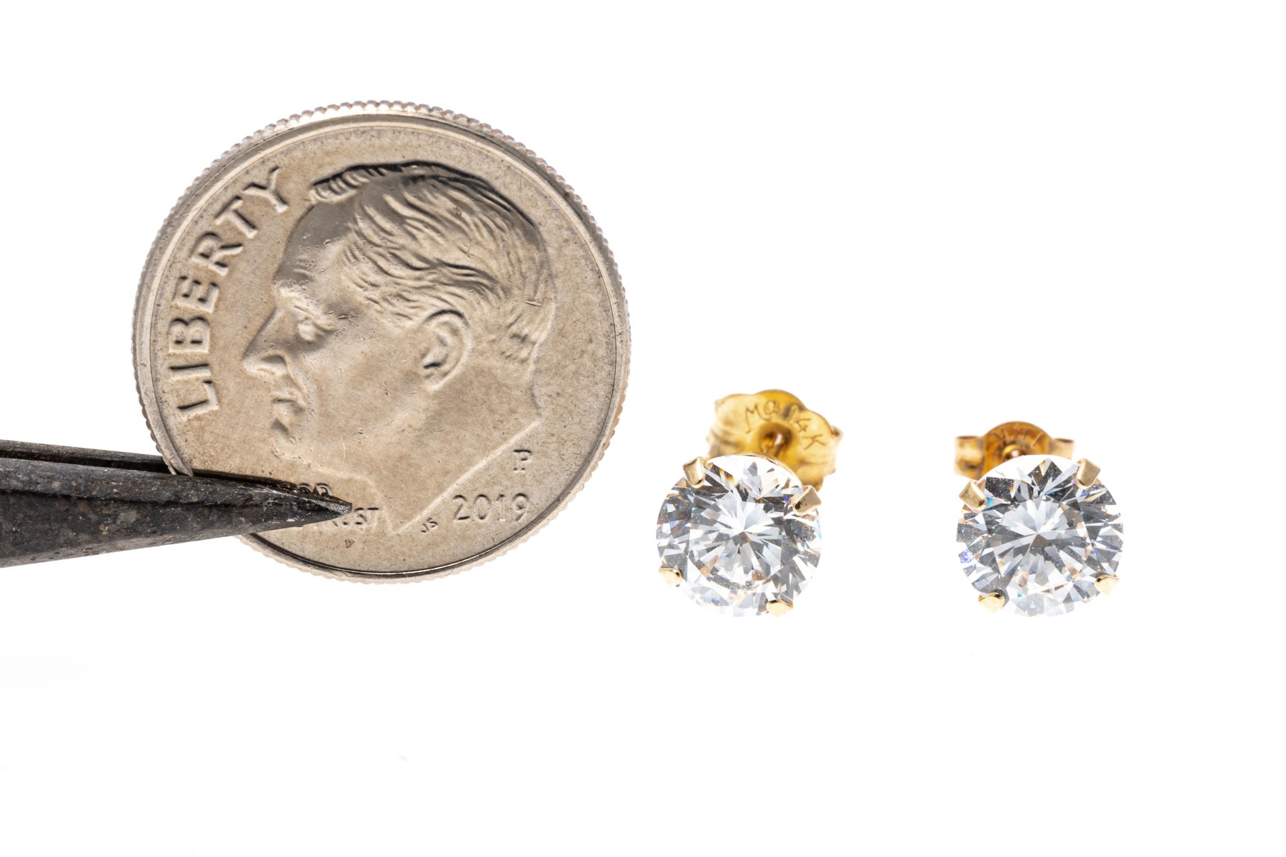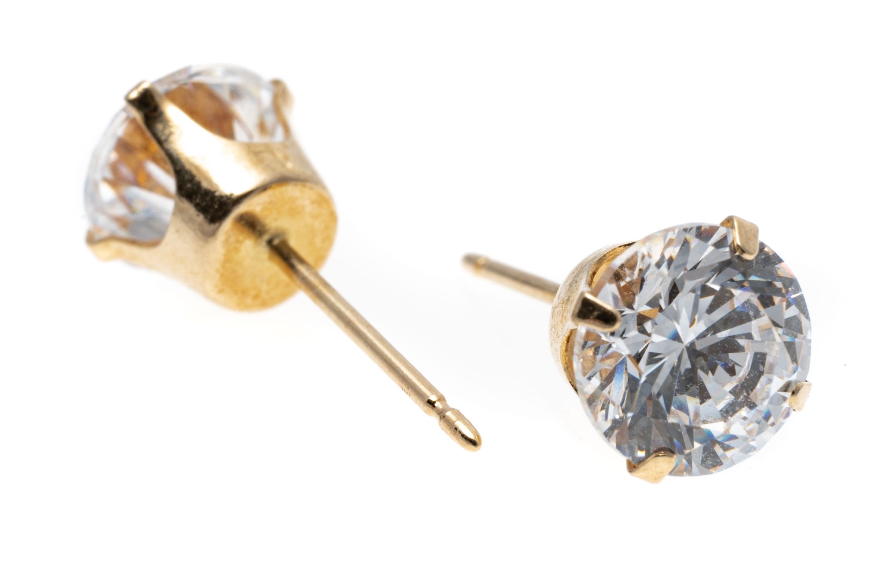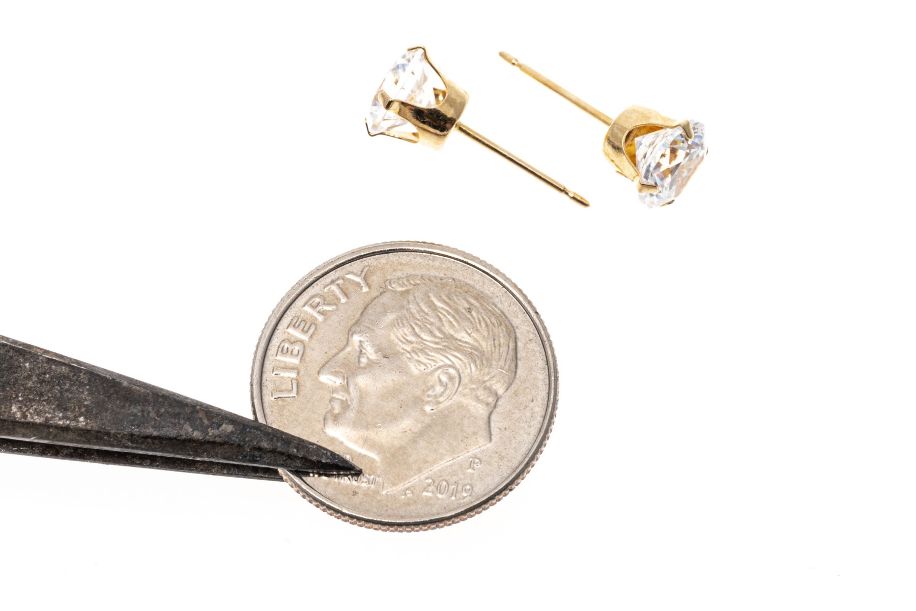 14k yellow gold earrings. These classic stud earrings contain a round, faceted brilliant cut cz stone, set in a four prong mounting. The earrings have posts with clutch style backs.