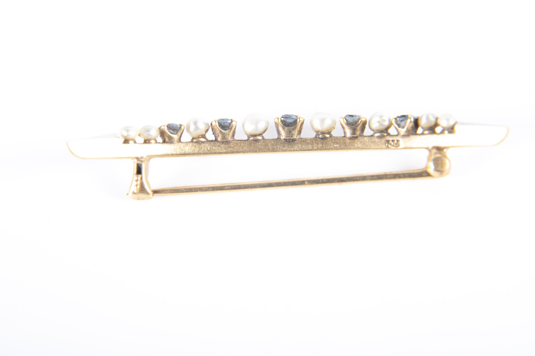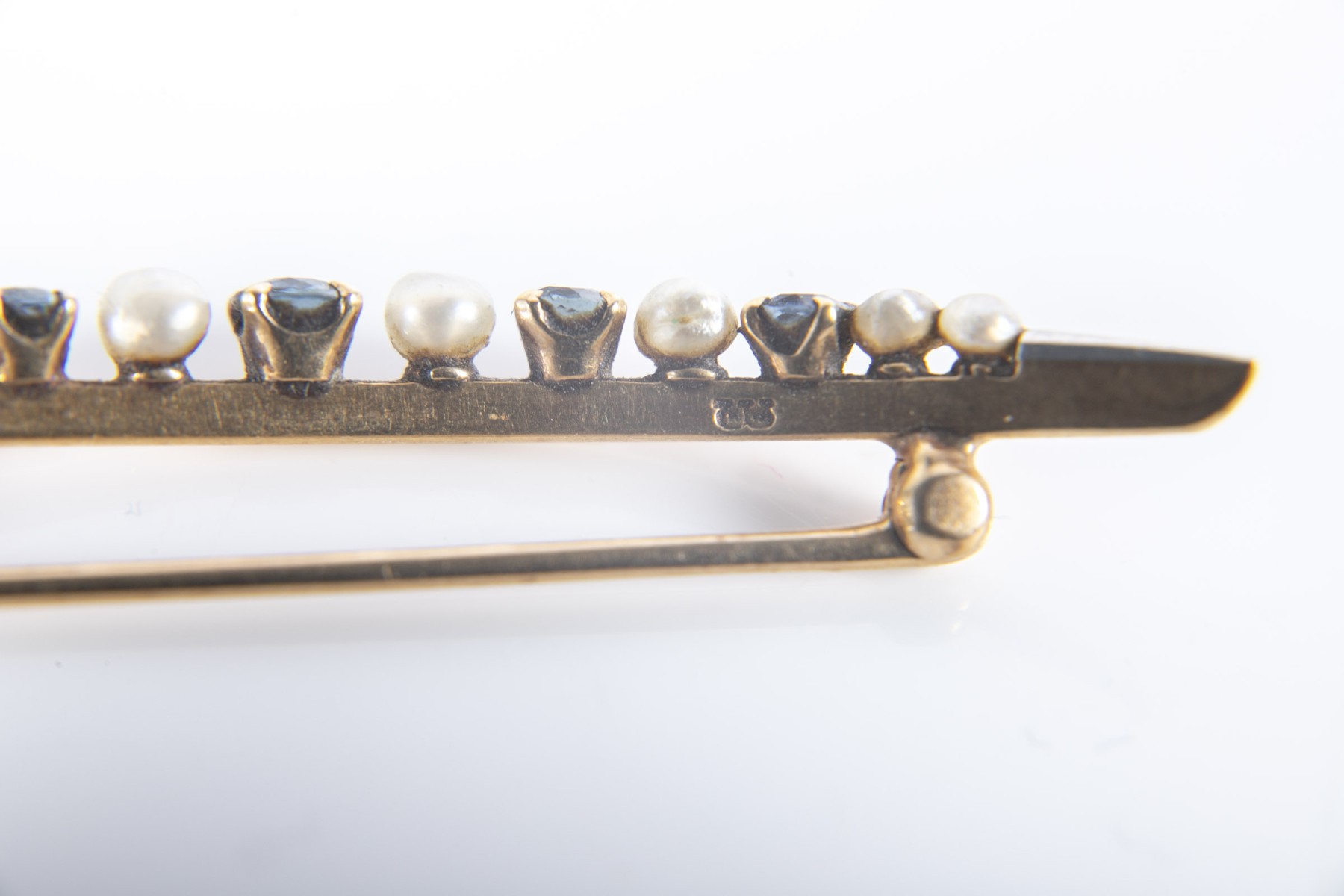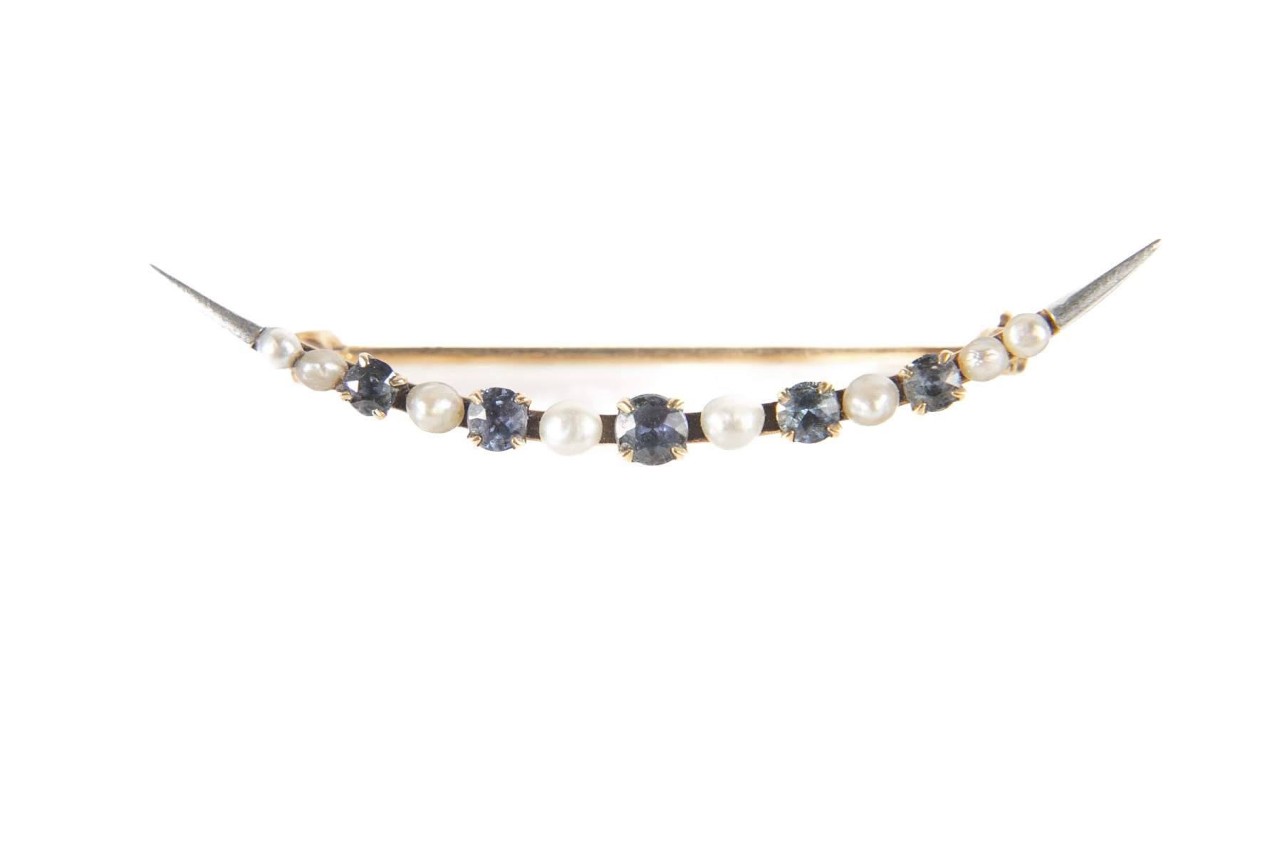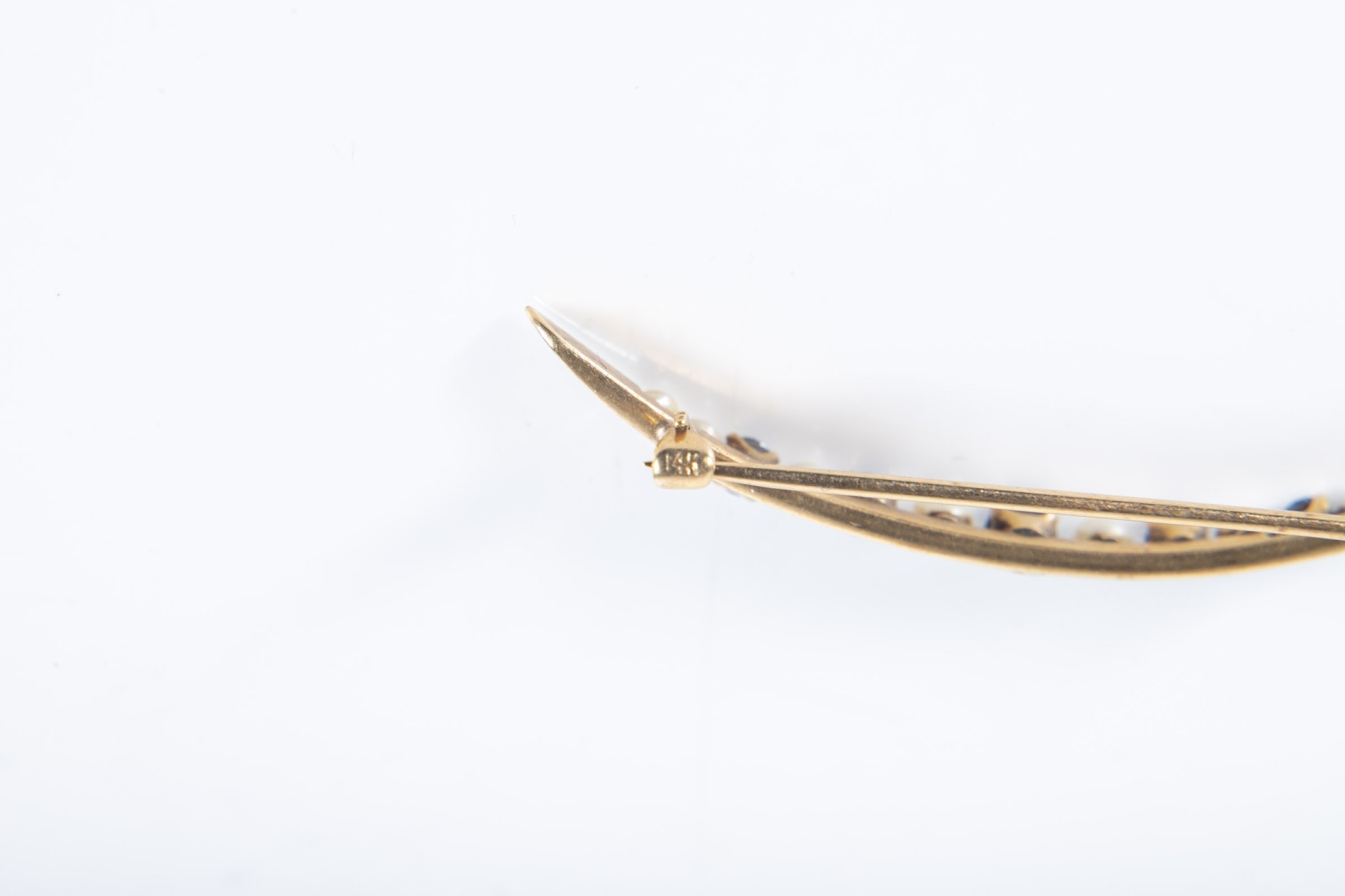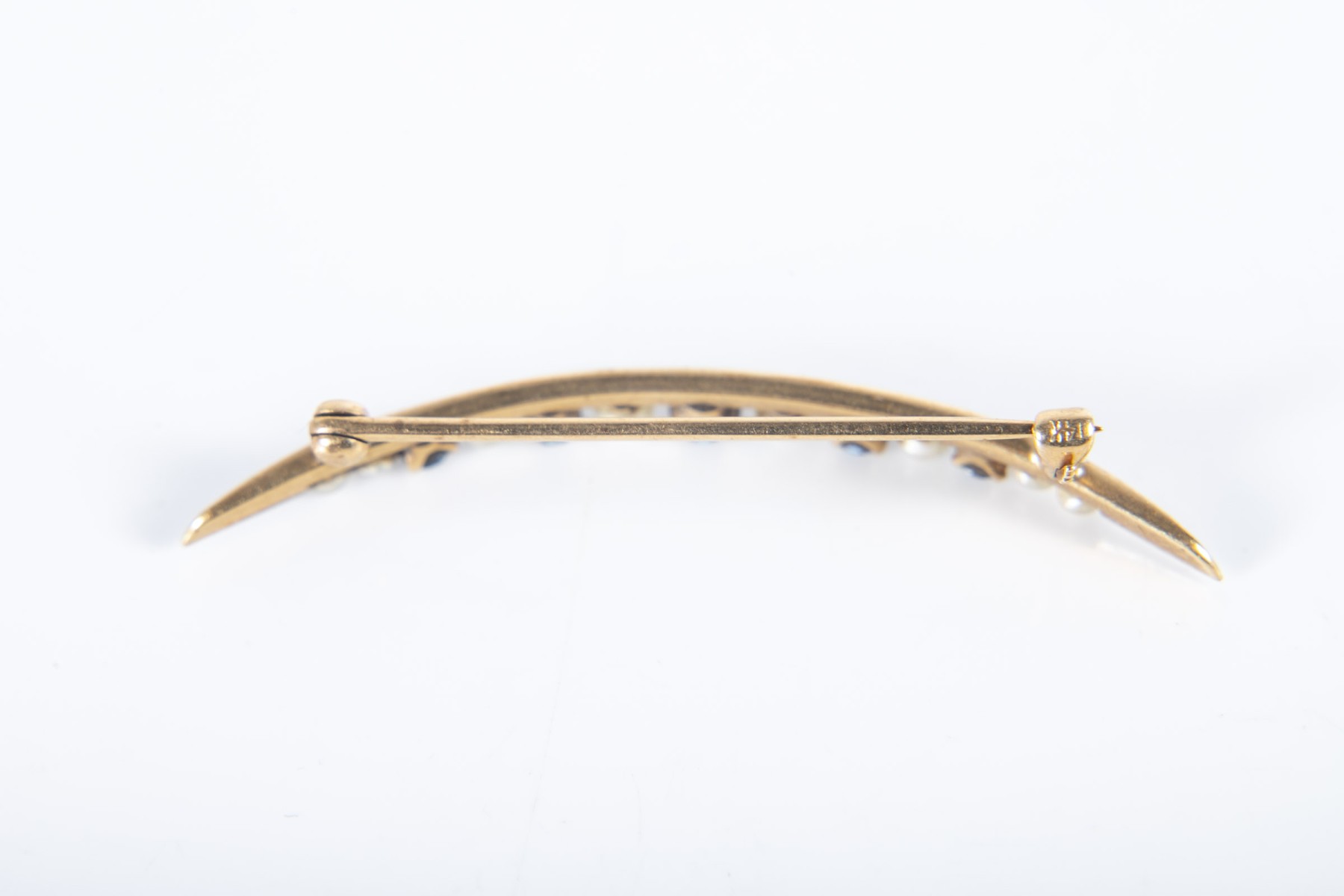 A delightful yellow gold crescent-shaped brooch displaying graduating off-round cultured pearls alternating between pale baby blue sapphires.