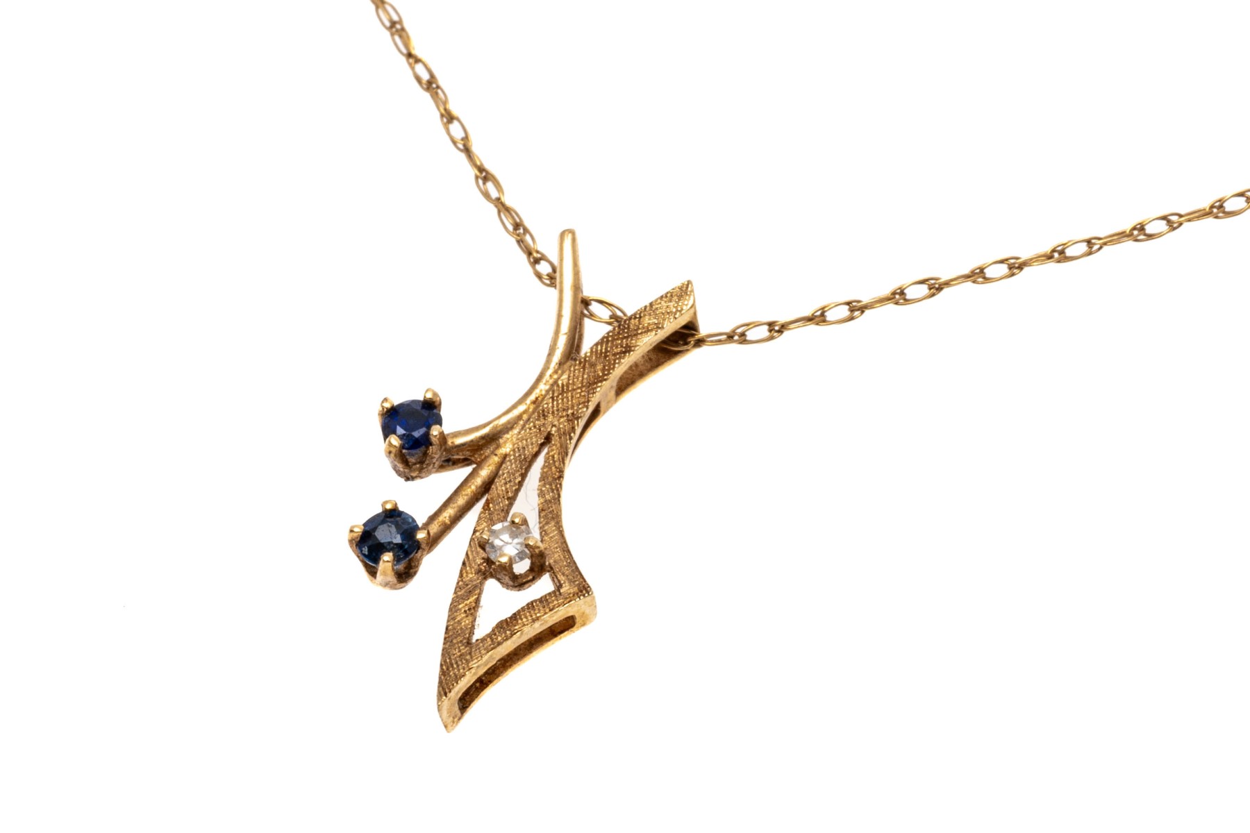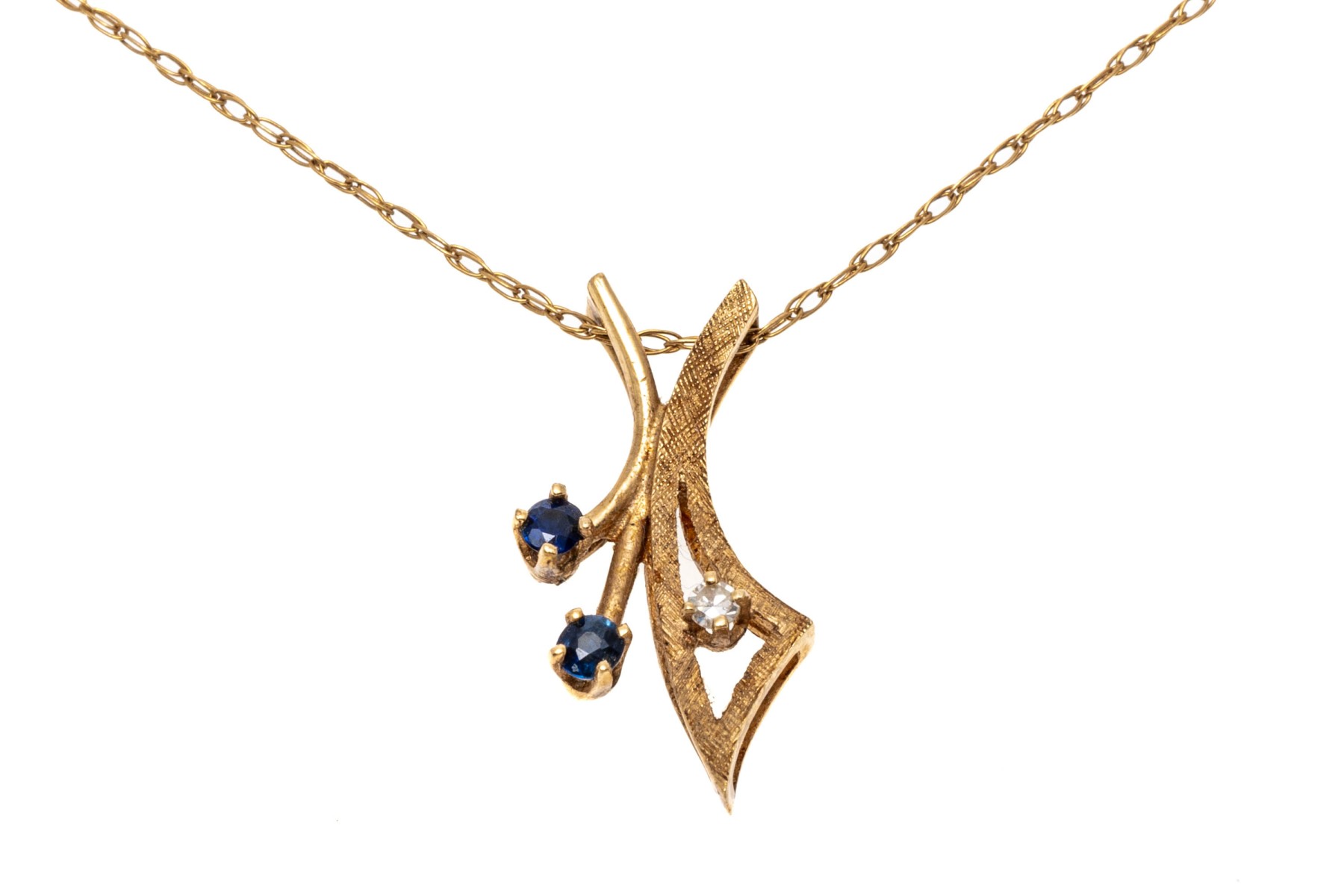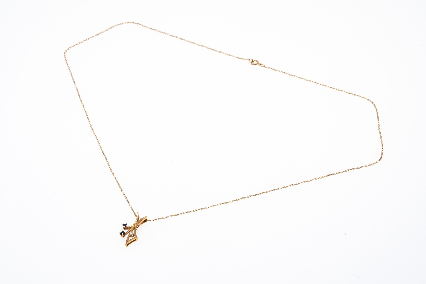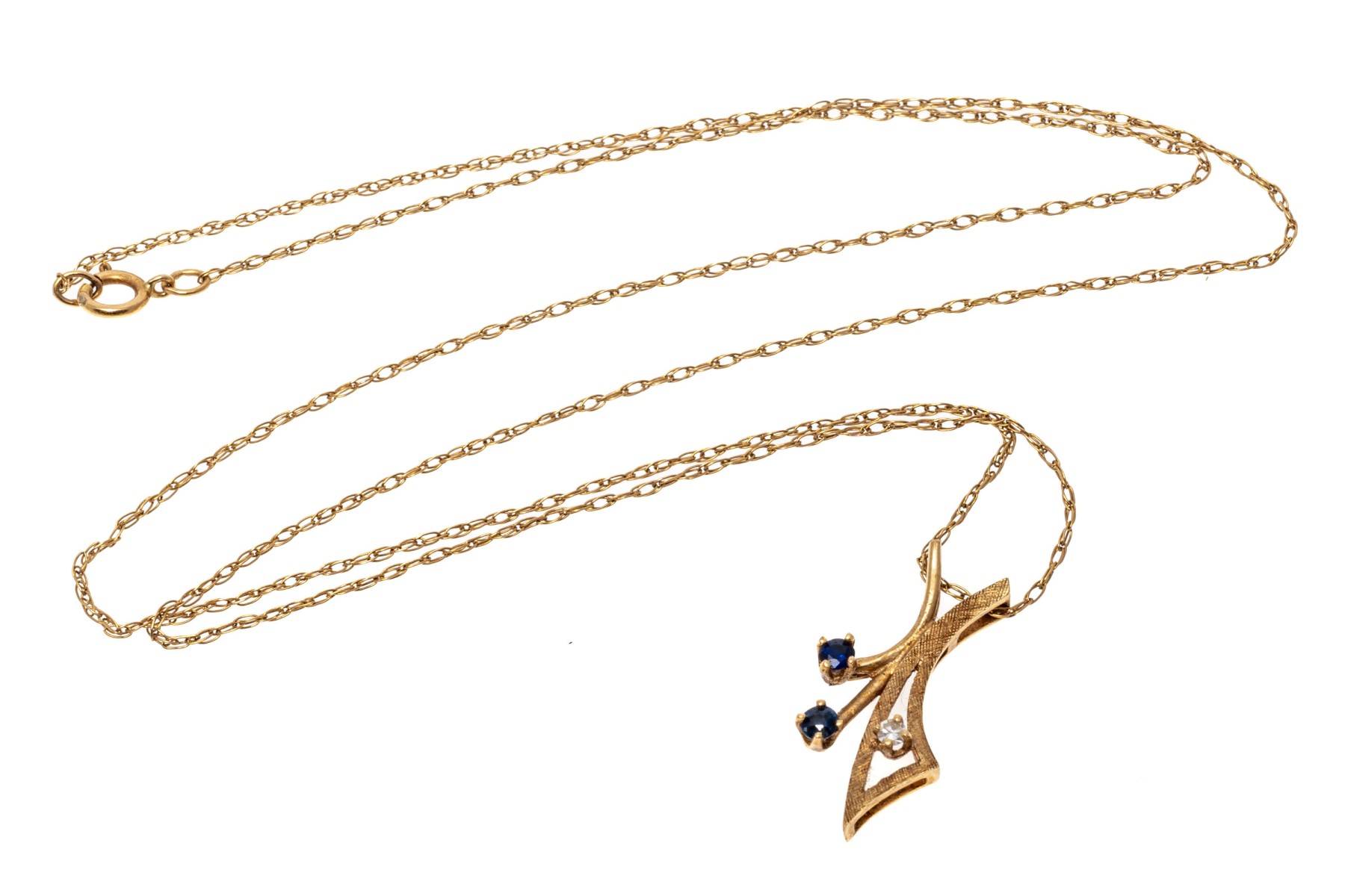 An elegant necklace displaying an asymmetrical swooping pendant accented with sapphires and a diamond, hanging from a double-link curb chain.