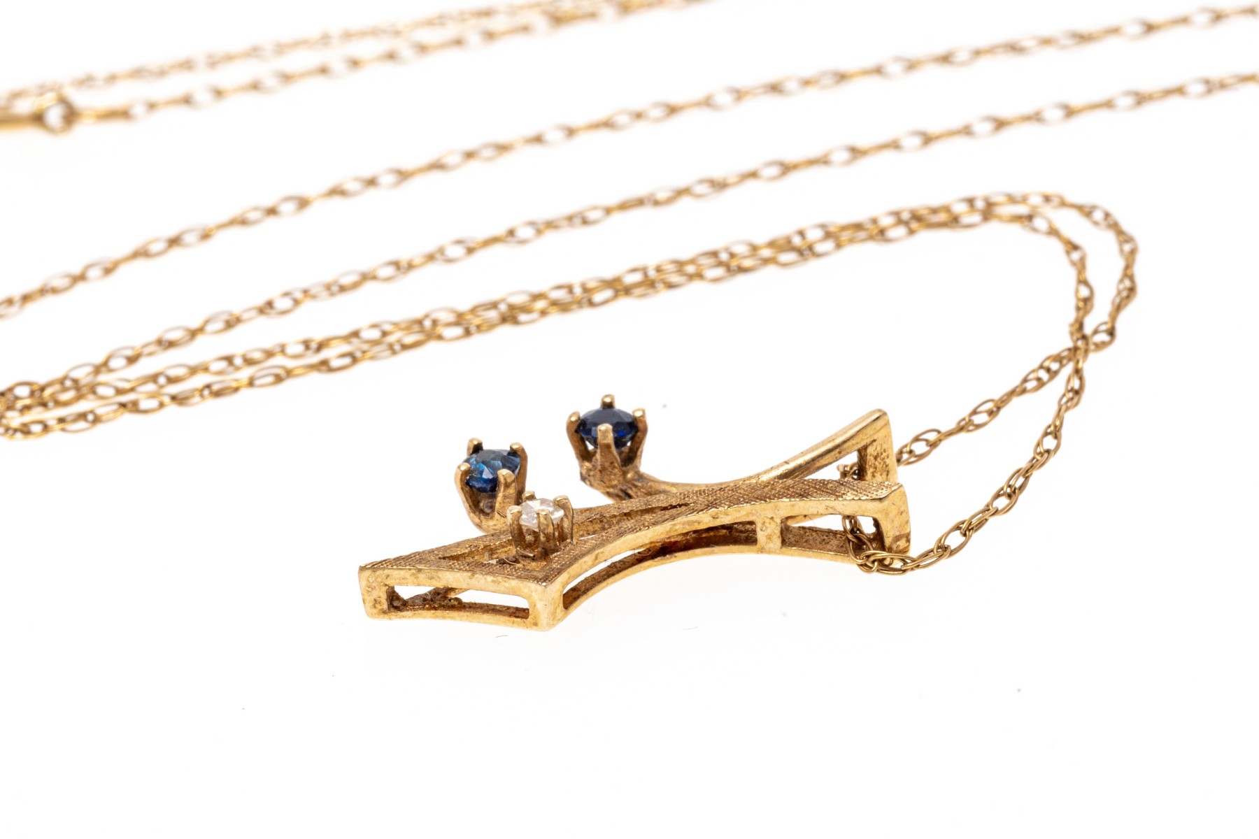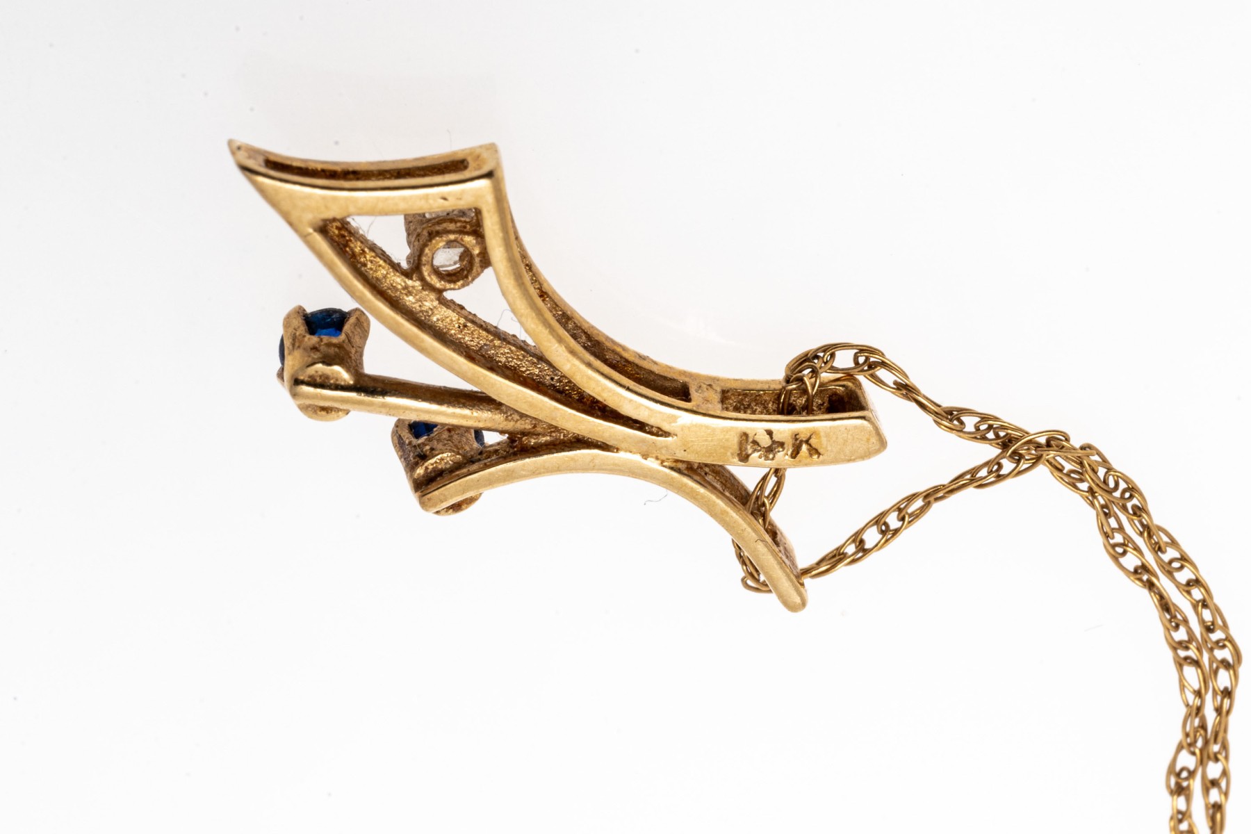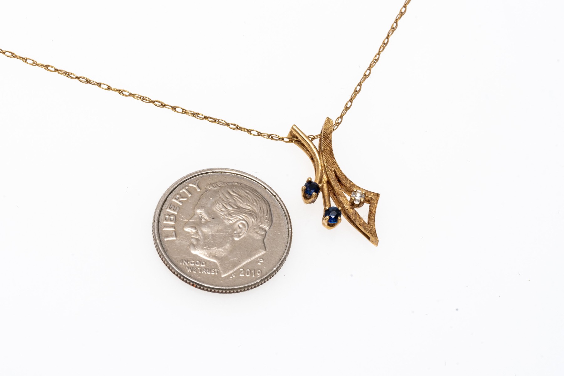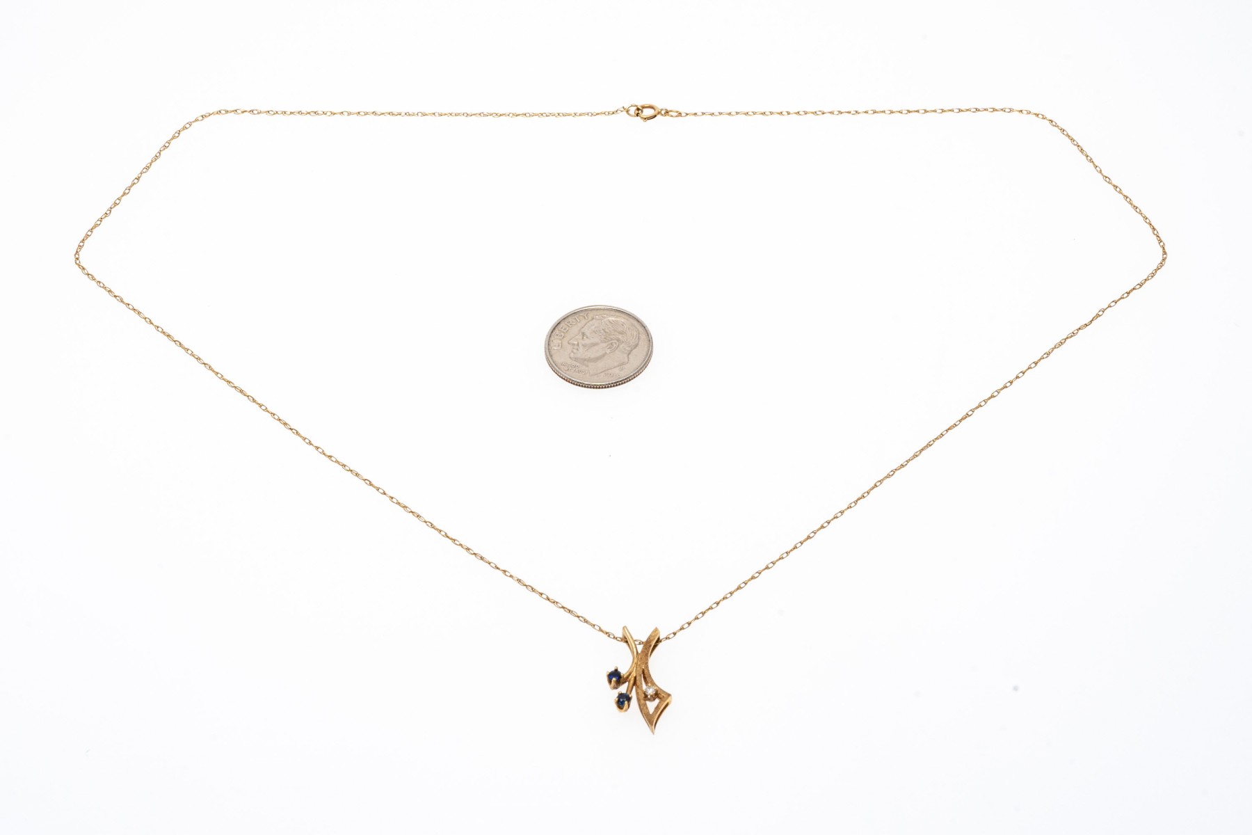 An elegant necklace displaying an asymmetrical swooping pendant accented with sapphires and a diamond, hanging from a double-link curb chain.