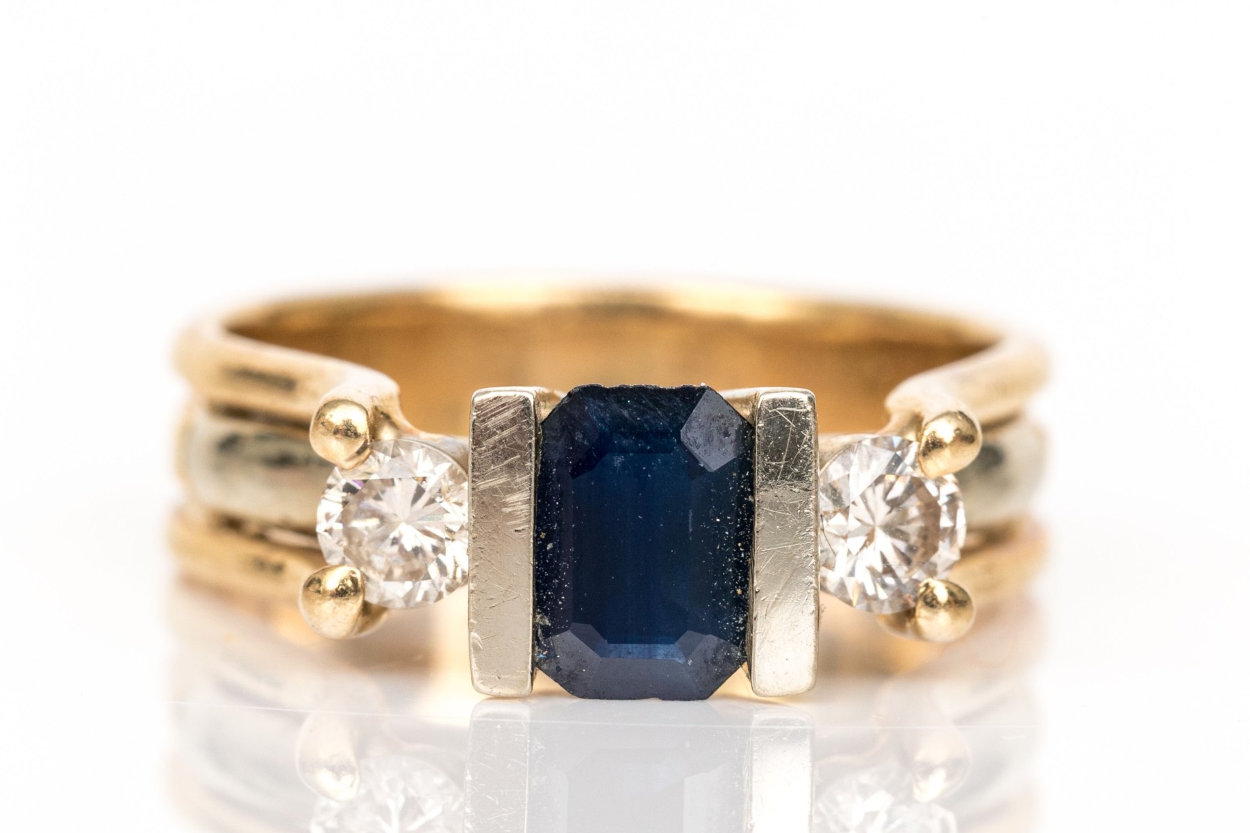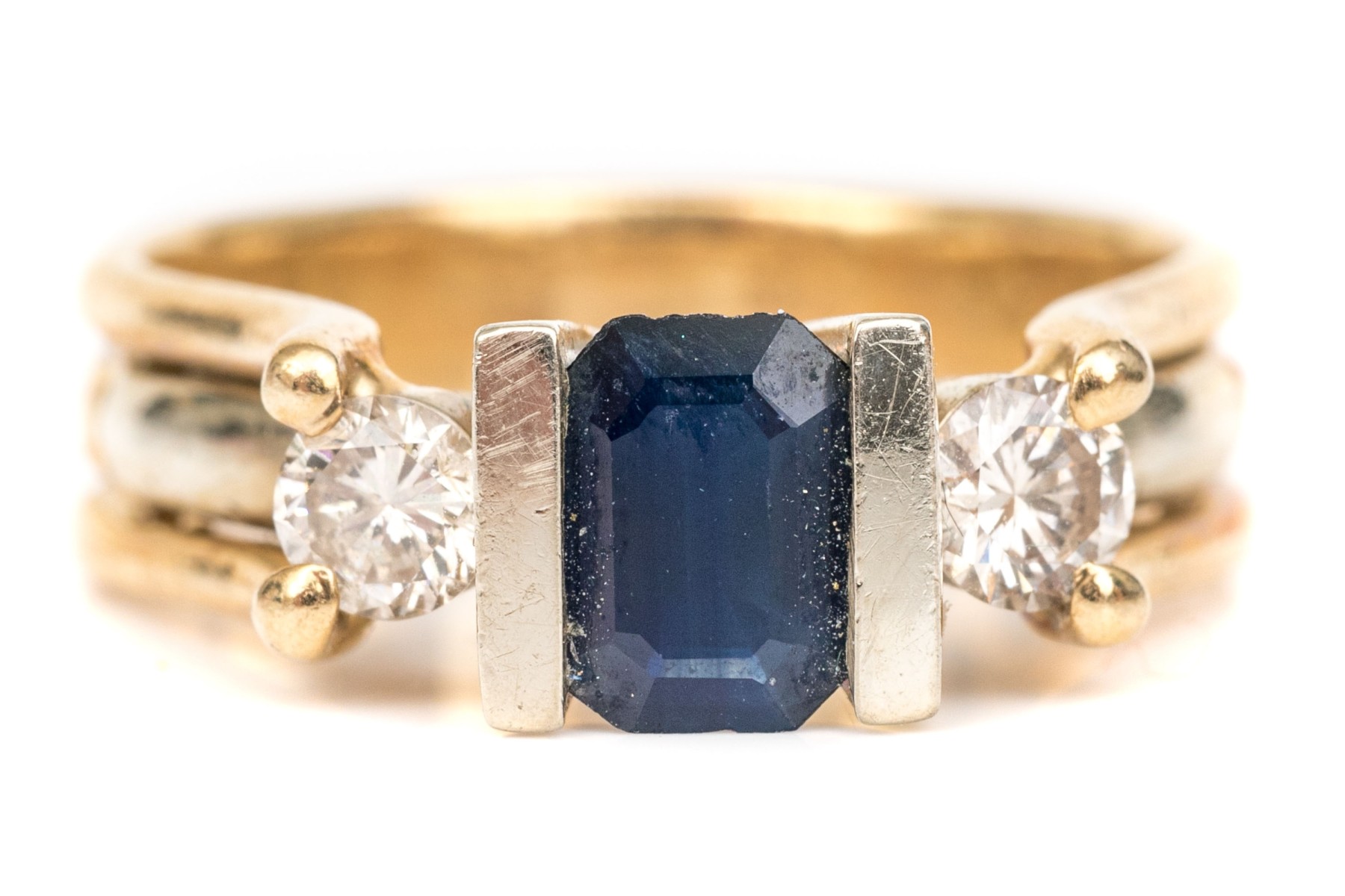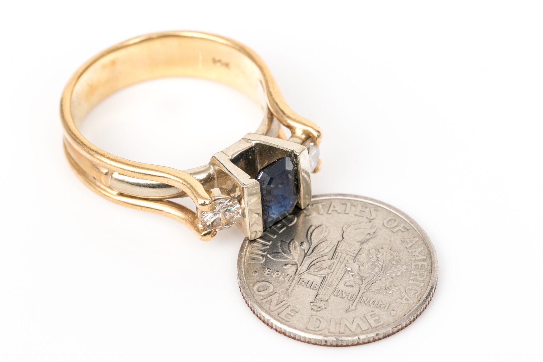 14k yellow gold sapphire and diamond three stone ring, app. 0.42 TCW in diamonds, size 7