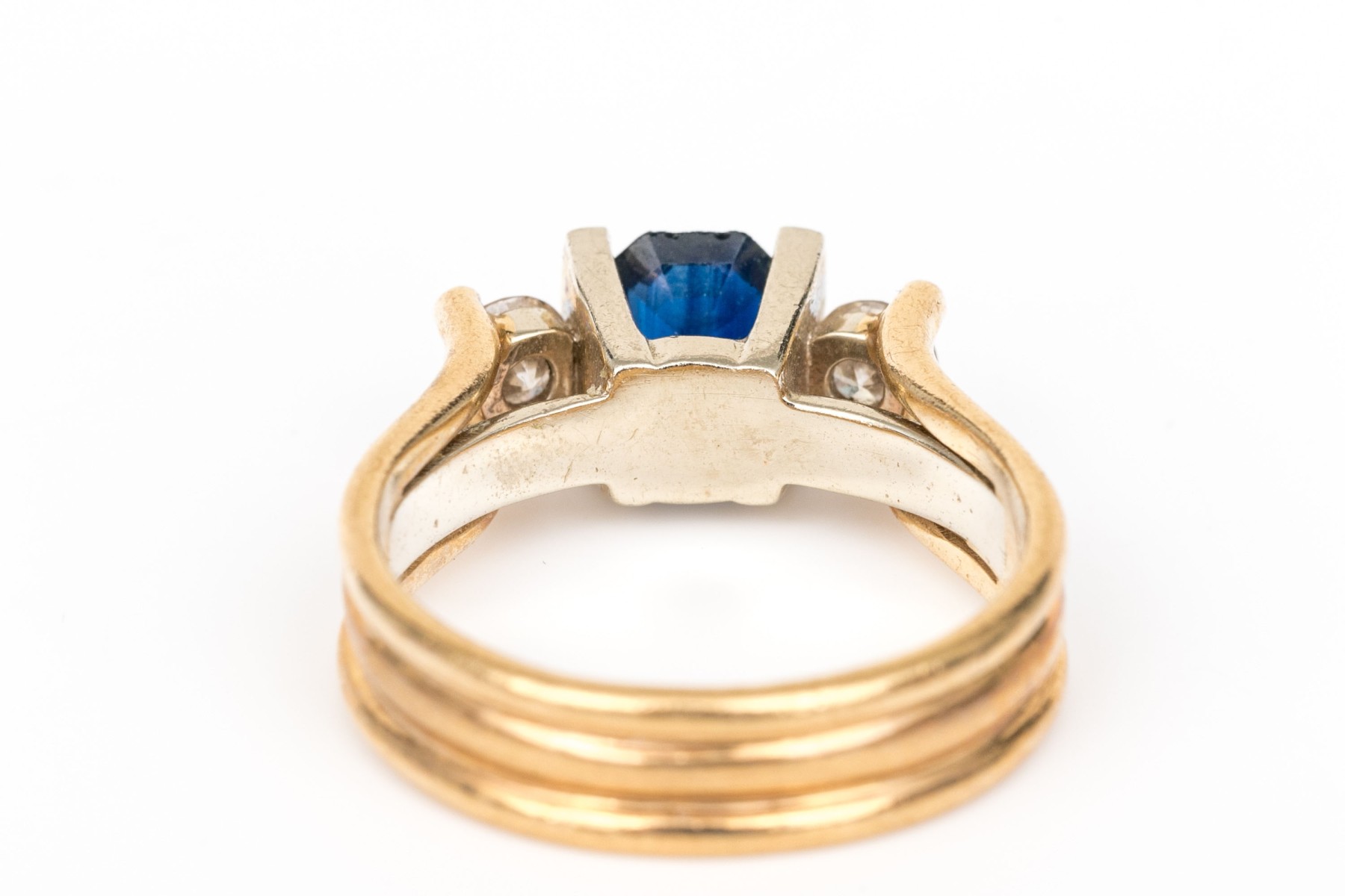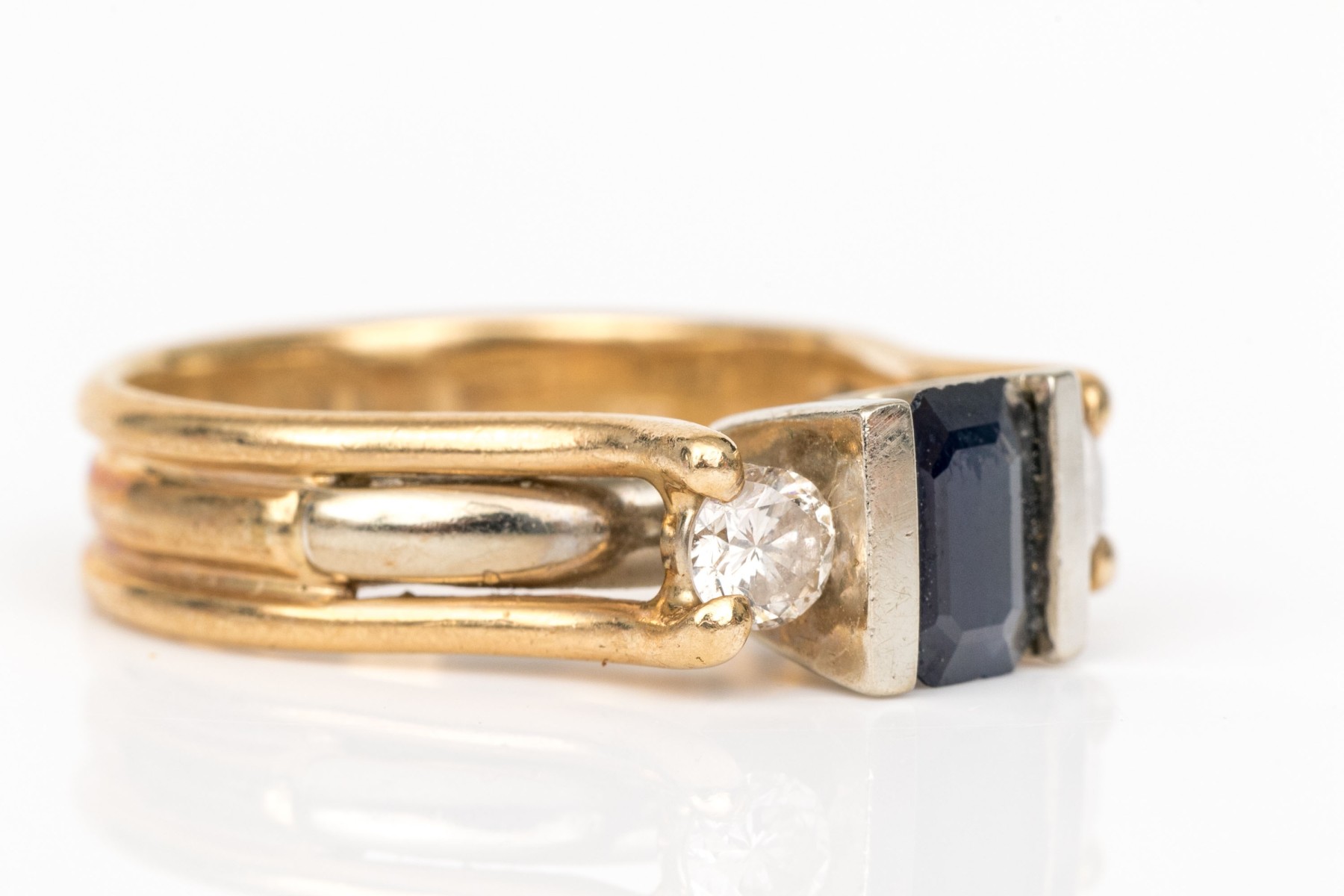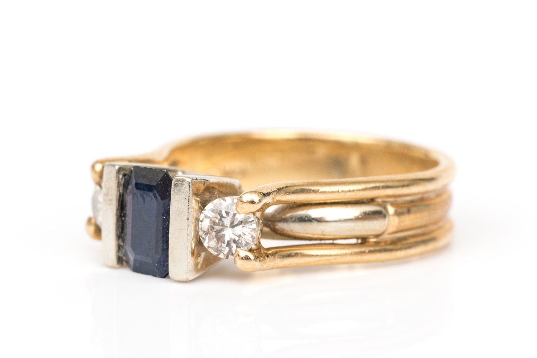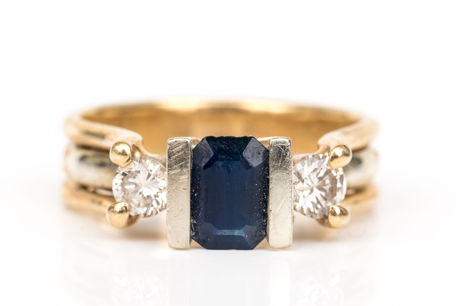 14k yellow gold sapphire and diamond three stone ring, app. 0.42 TCW in diamonds, size 7