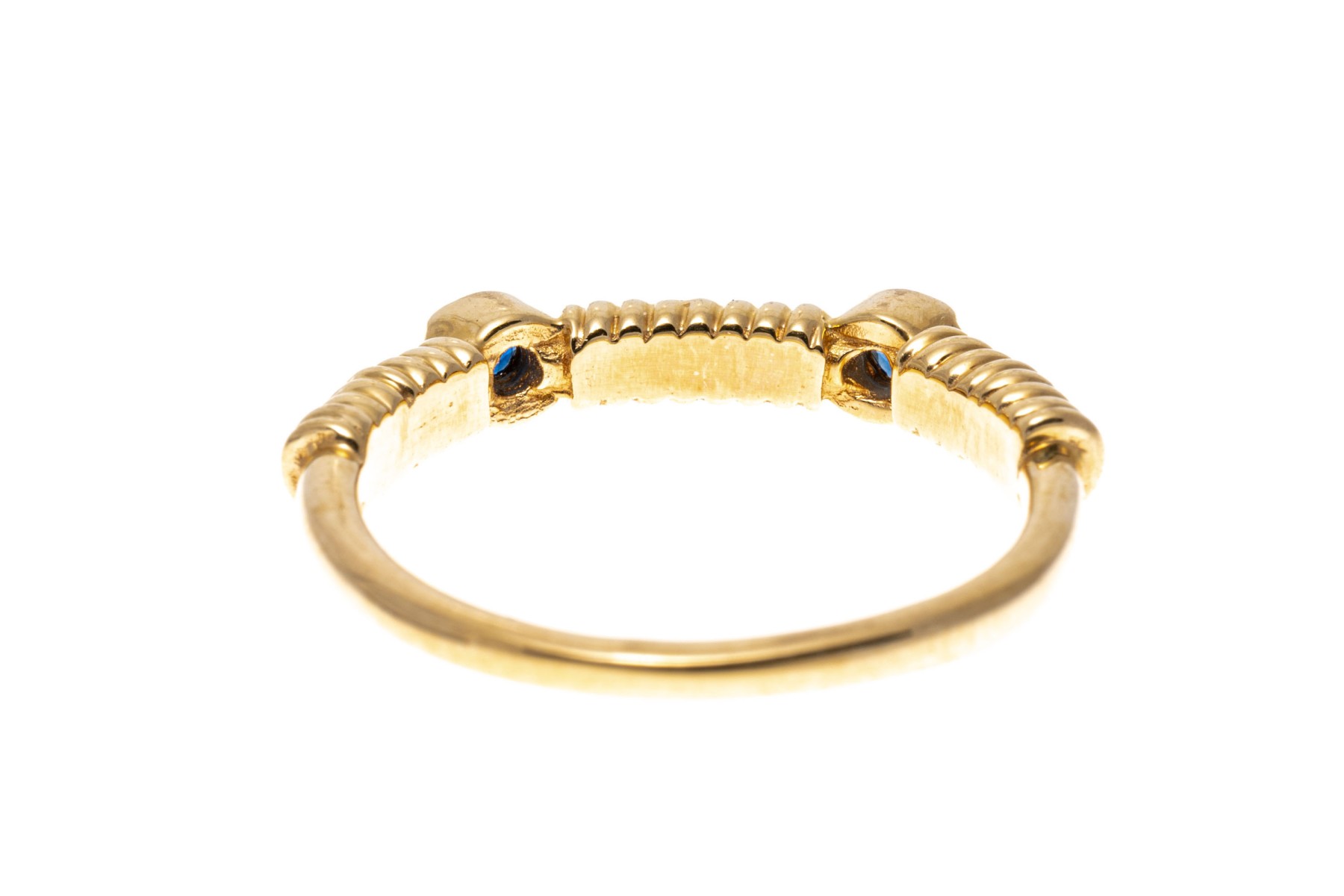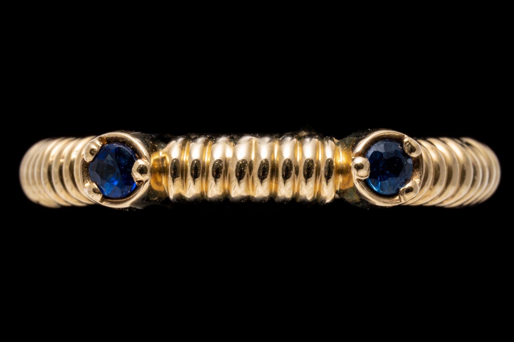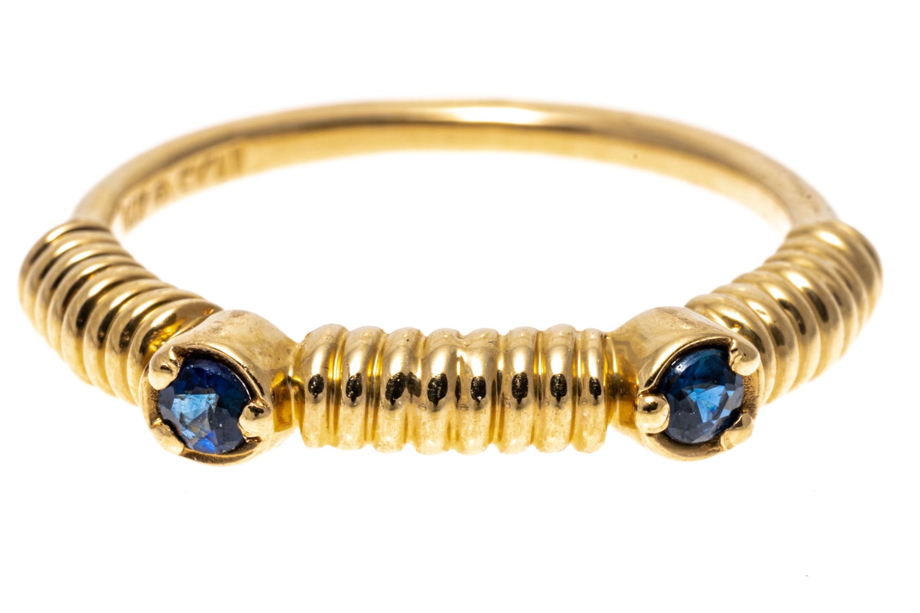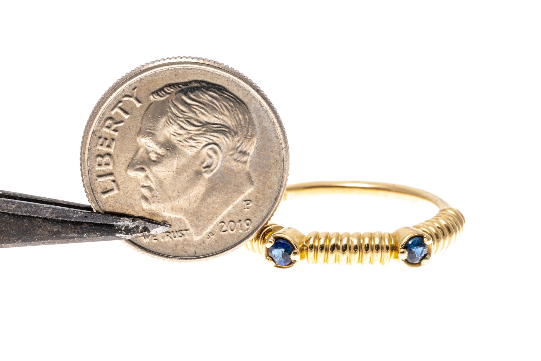 A unique yellow gold ring showcasing two round sapphires in prong and bezel settings flanked by lengths of bobbin ribbed texture for excellent visual interest. The sapphires are approximately 0.1 TCW.