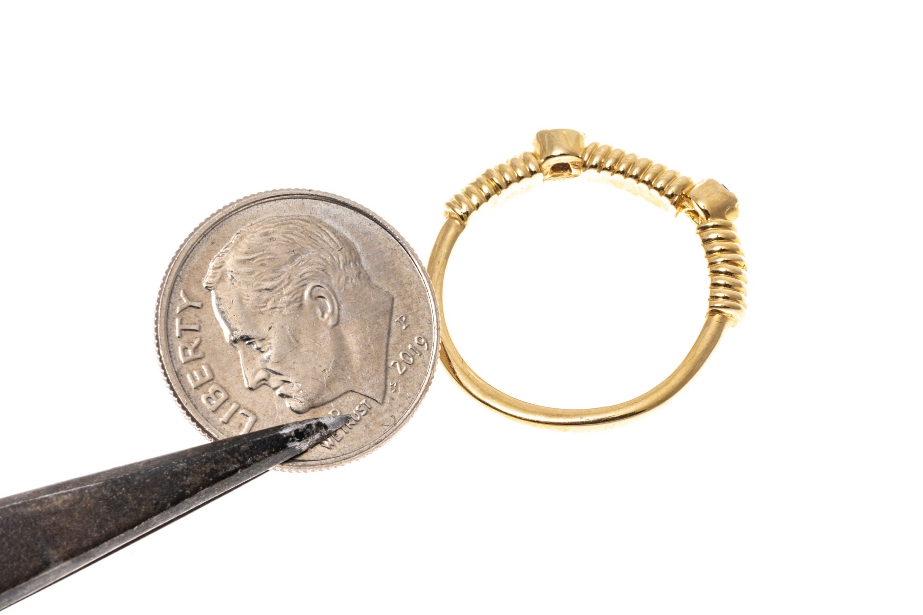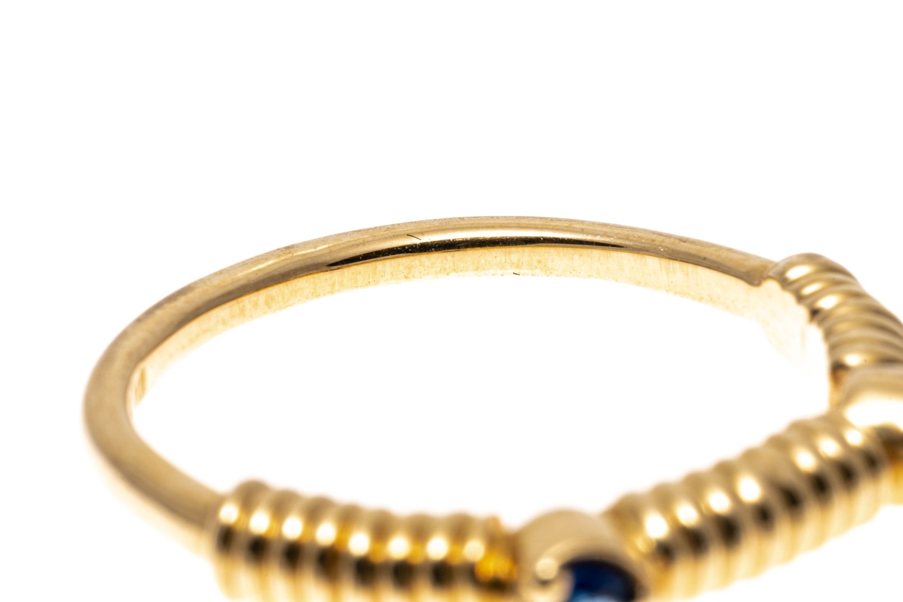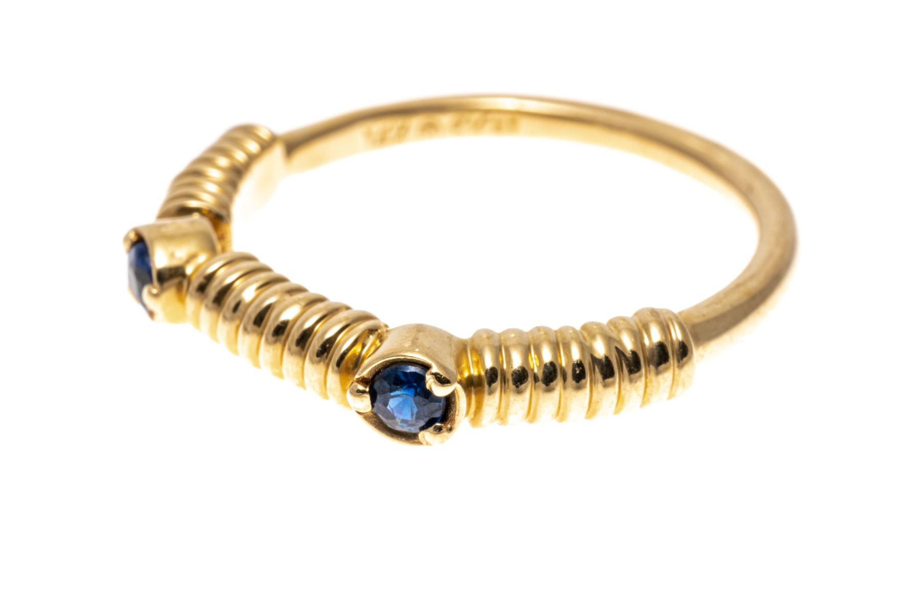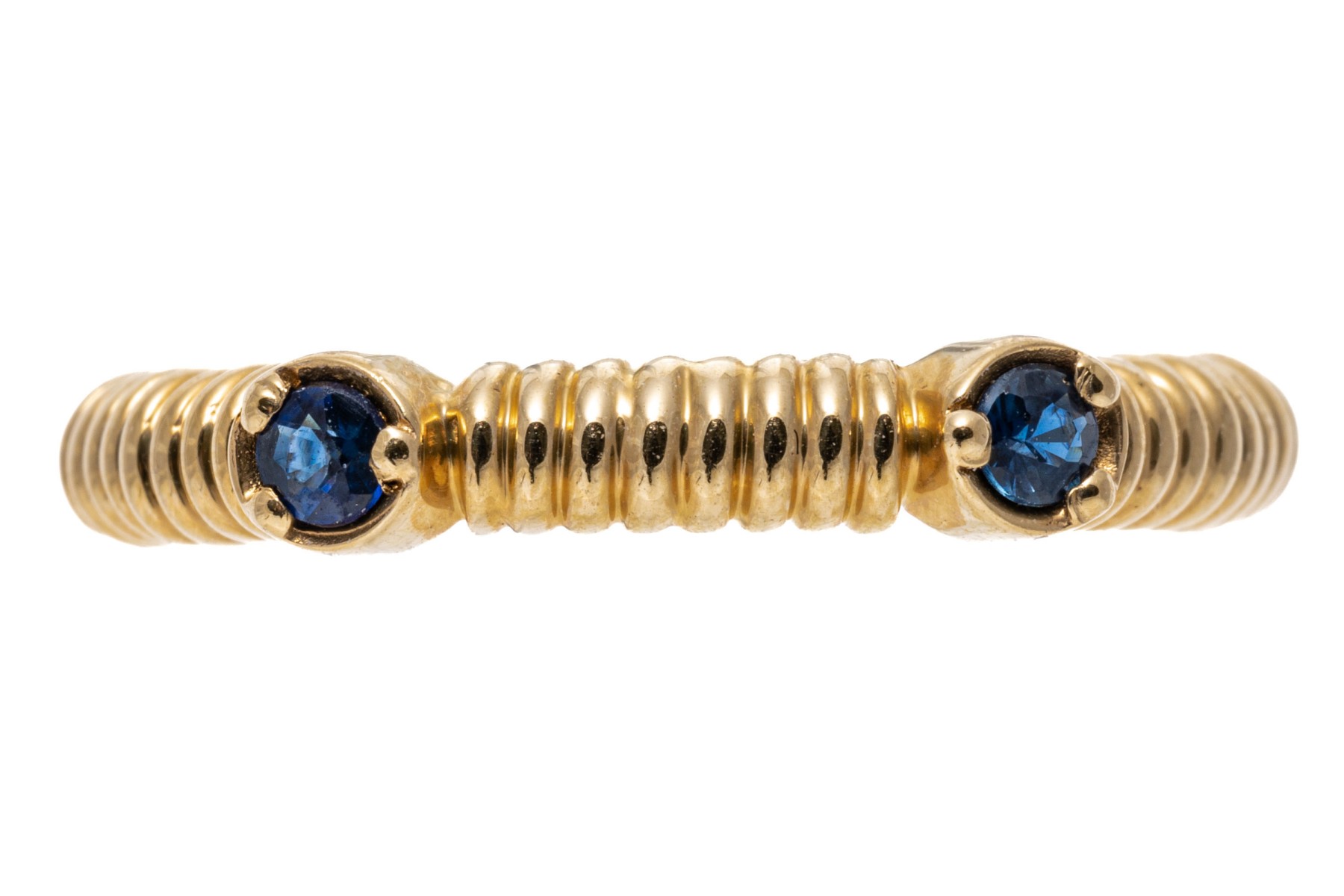 A unique yellow gold ring showcasing two round sapphires in prong and bezel settings flanked by lengths of bobbin ribbed texture for excellent visual interest. The sapphires are approximately 0.1 TCW.