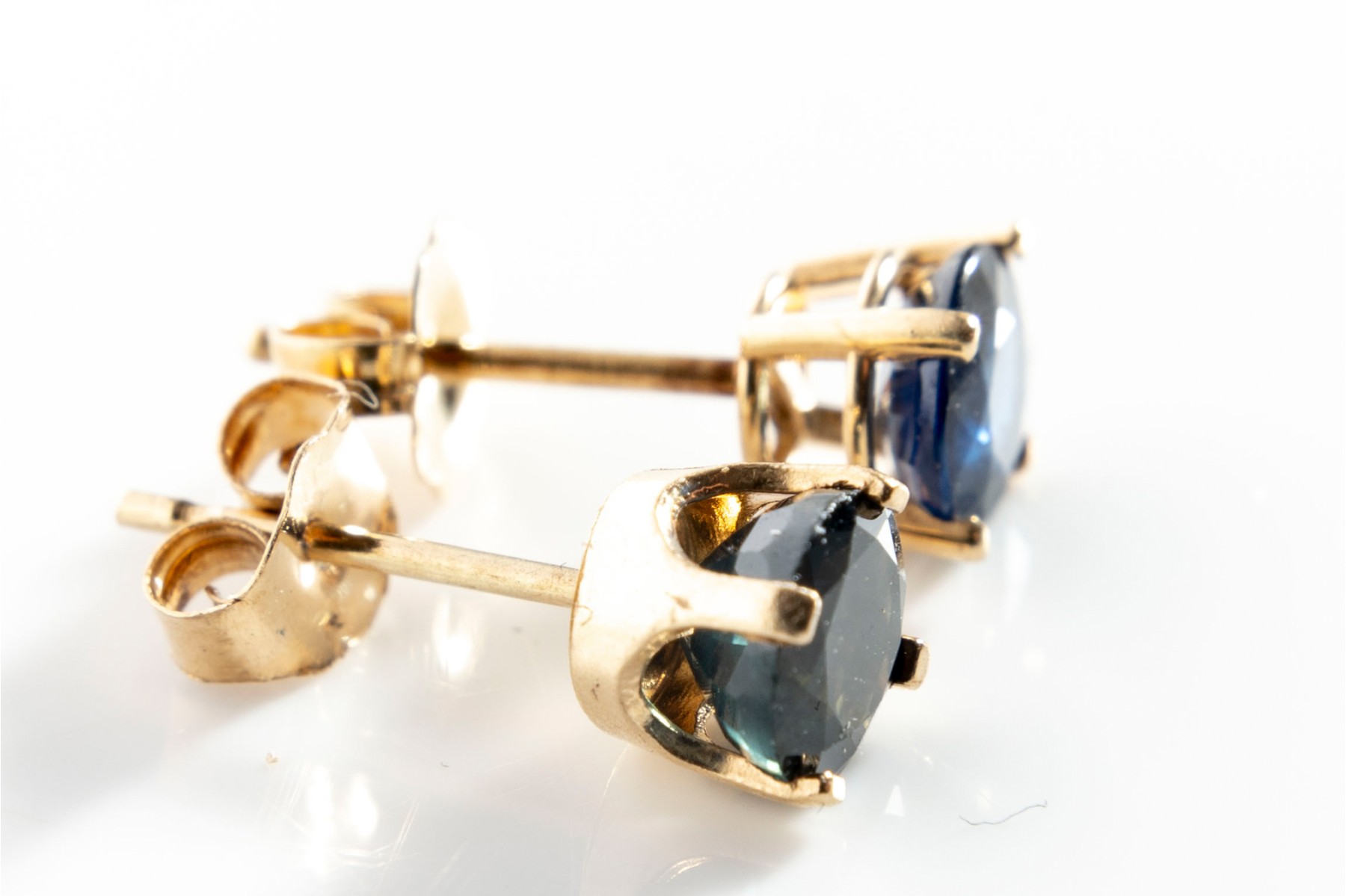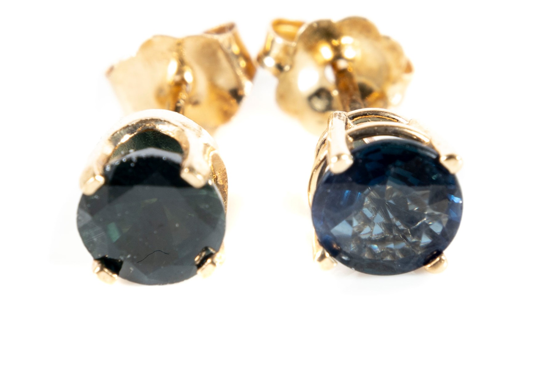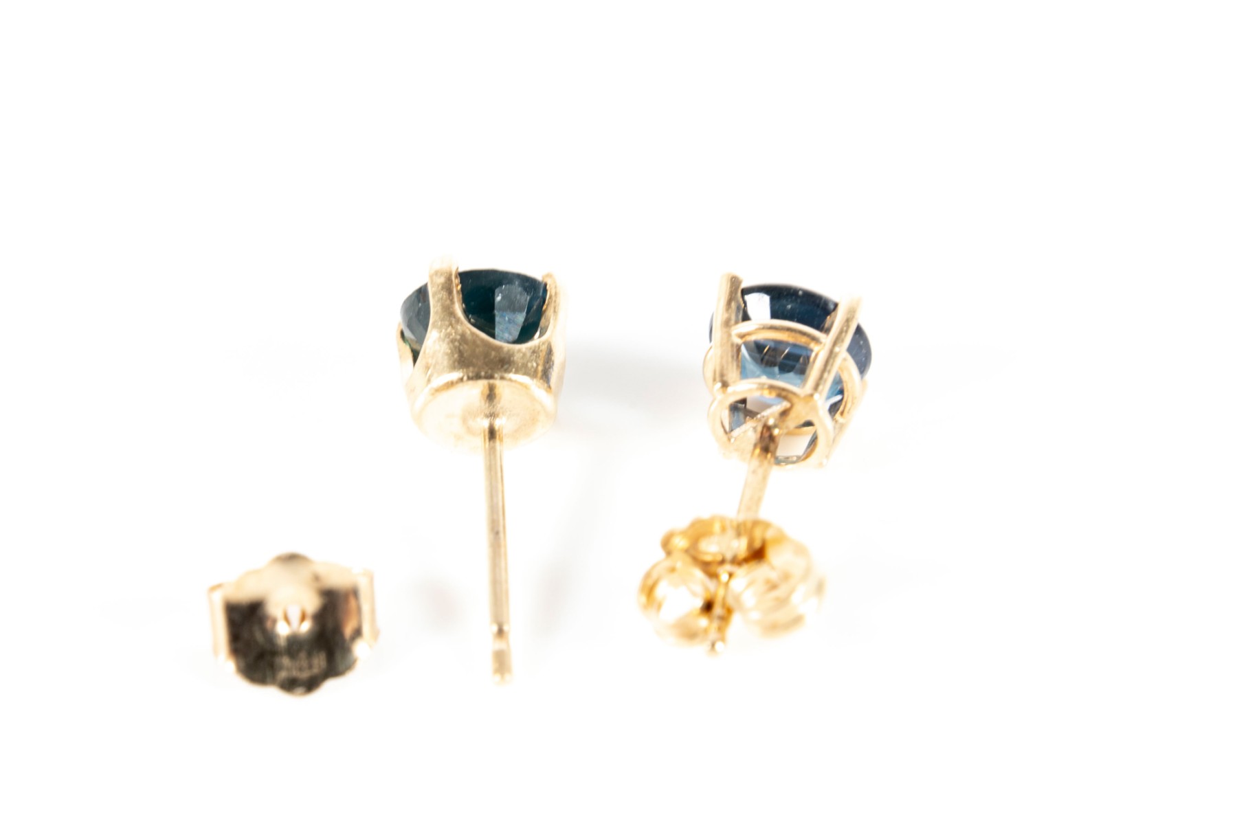 A pair of simple, elegant yellow gold studs displaying round dark blue sapphires in prong settings.