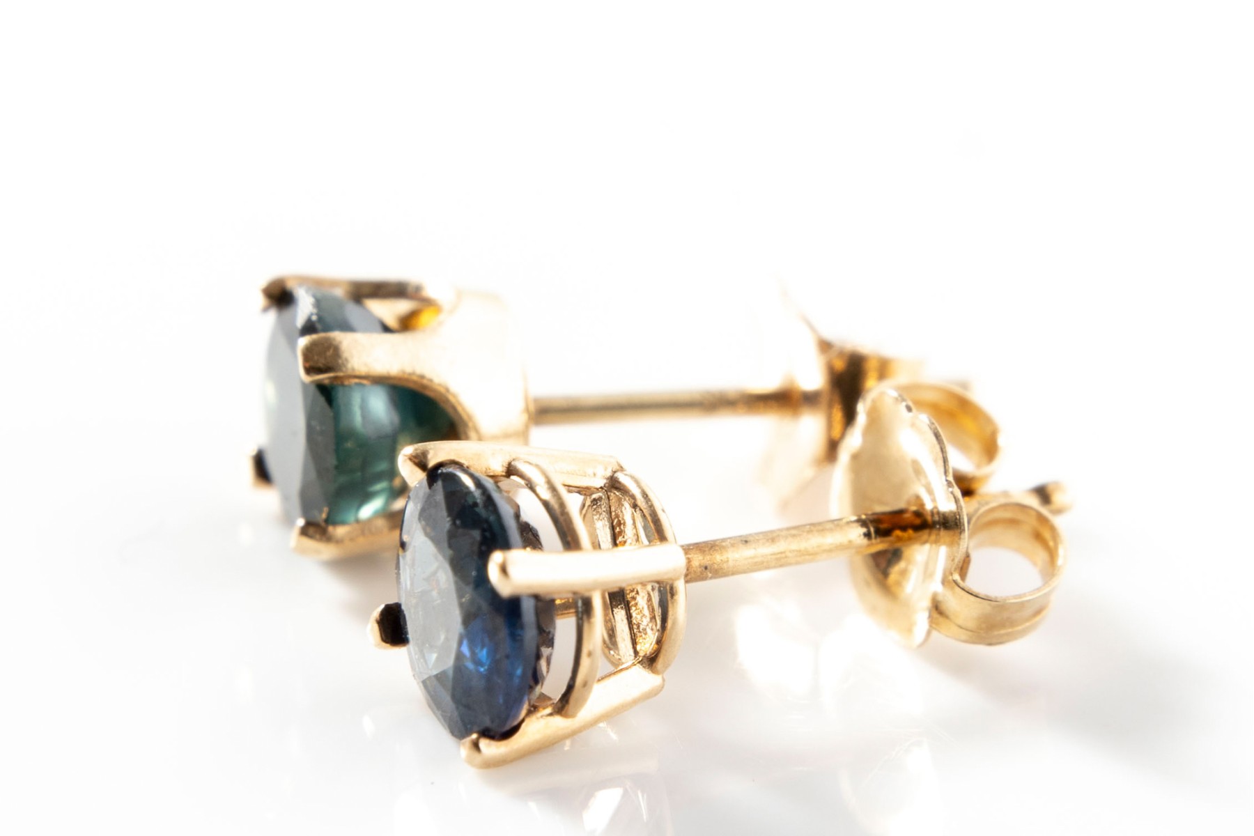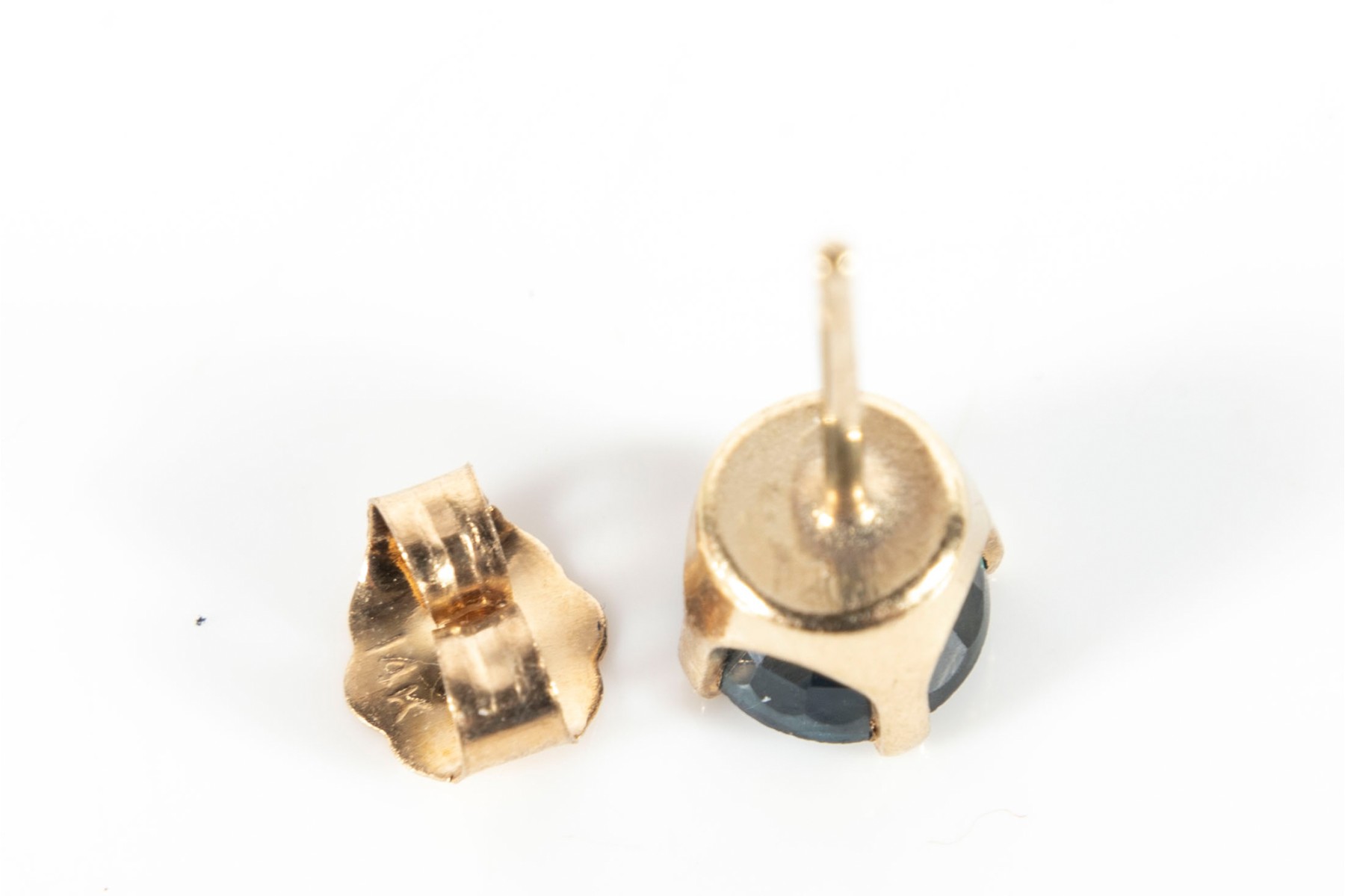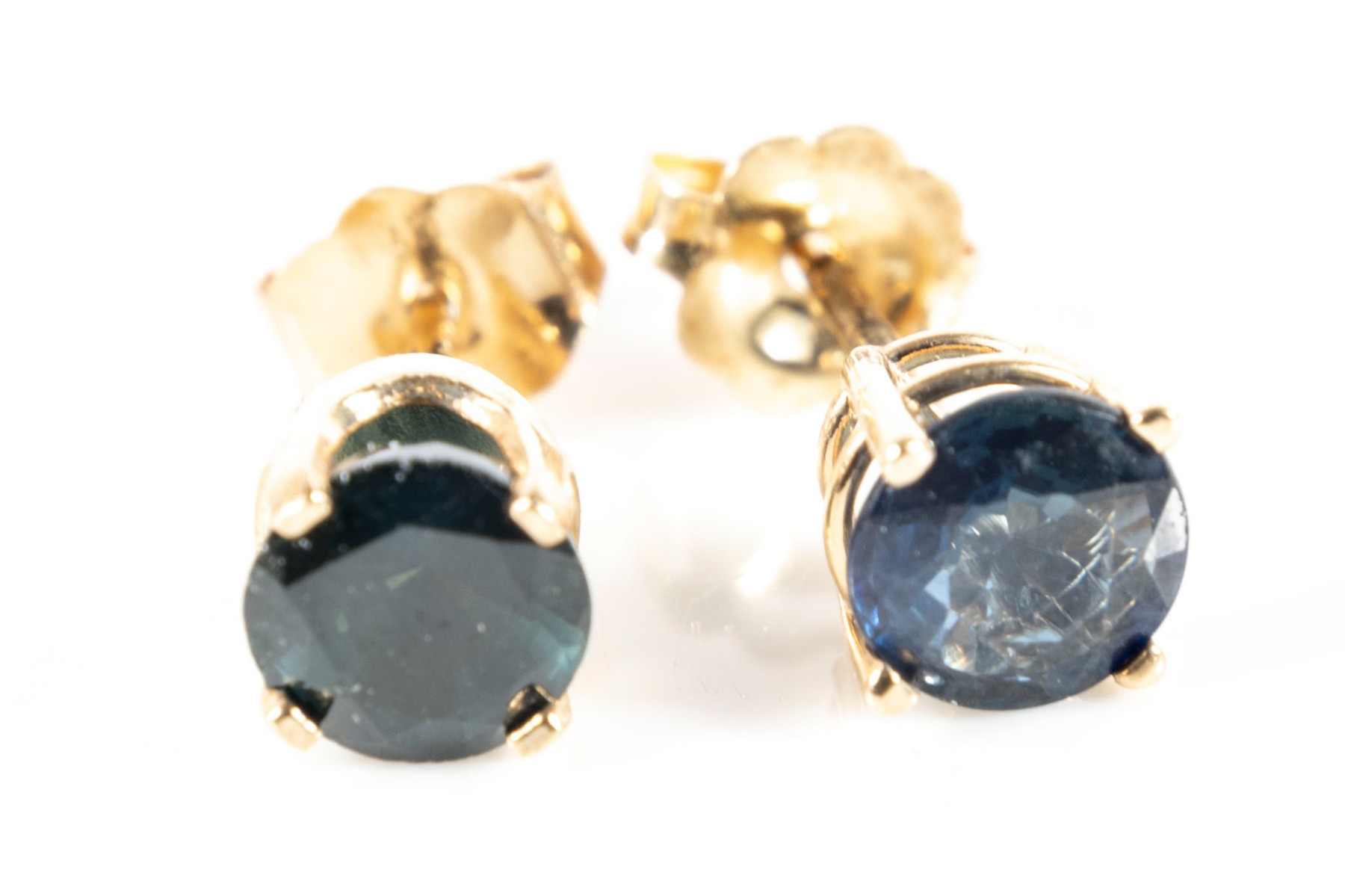 A pair of simple, elegant yellow gold studs displaying round dark blue sapphires in prong settings.