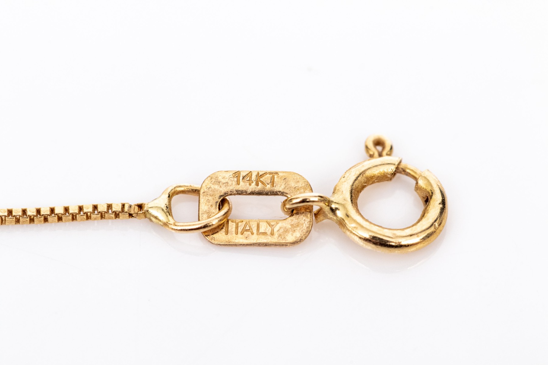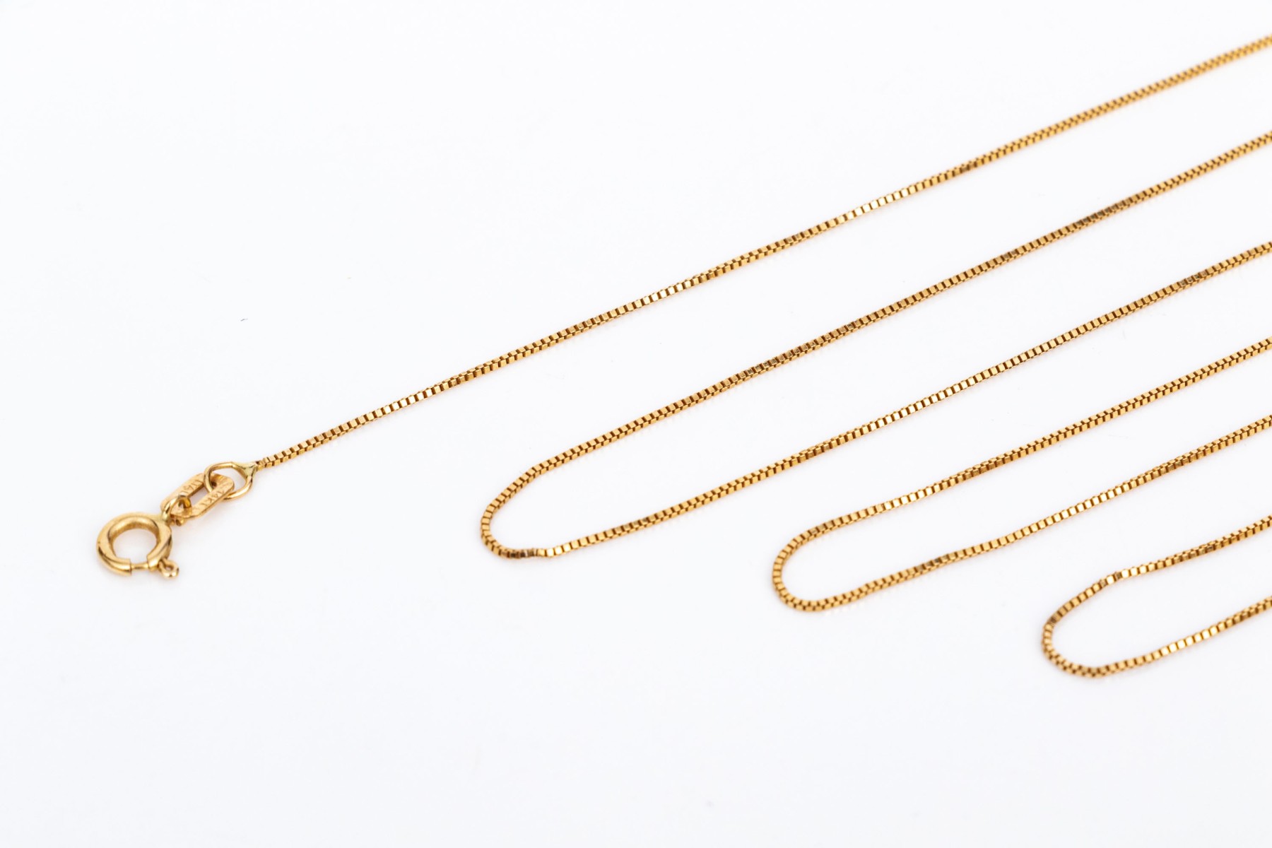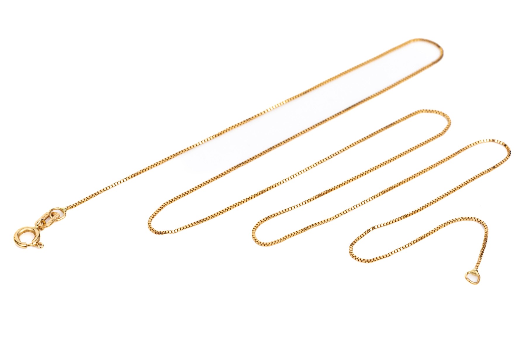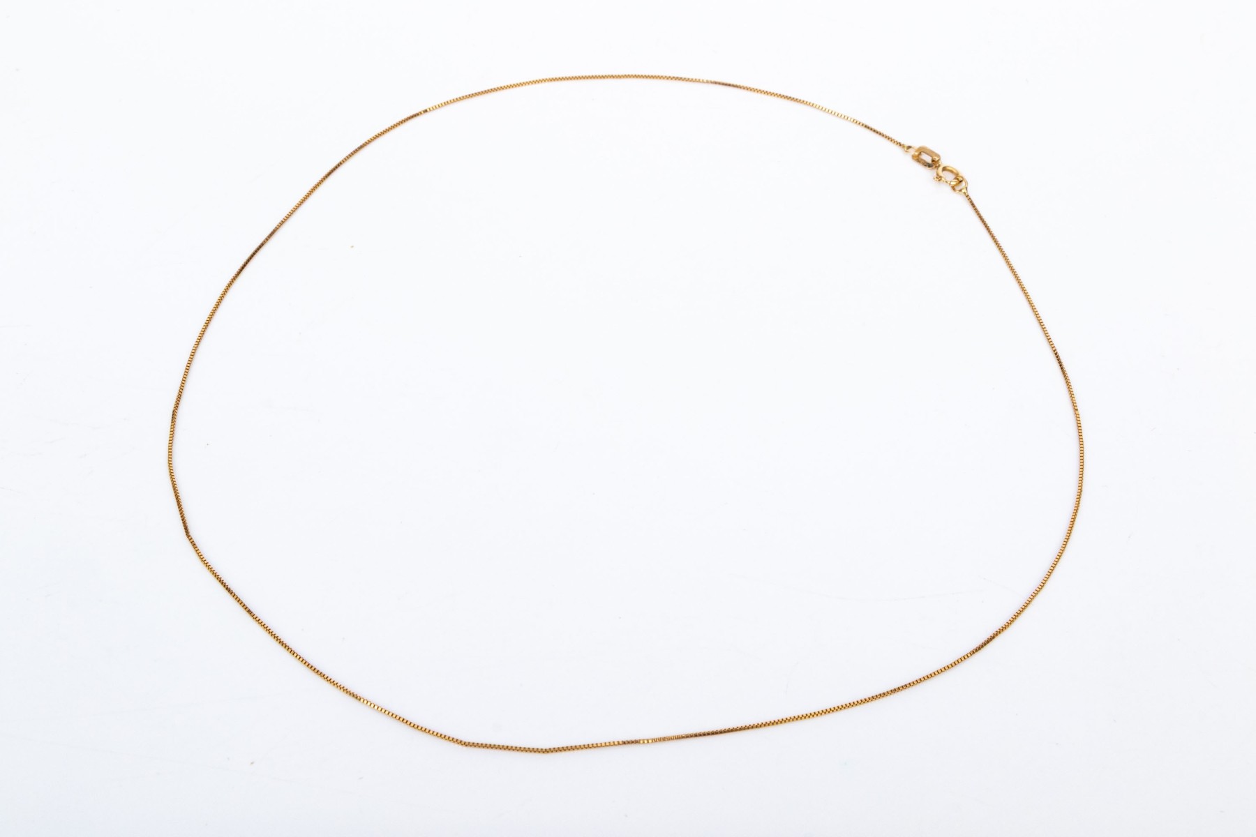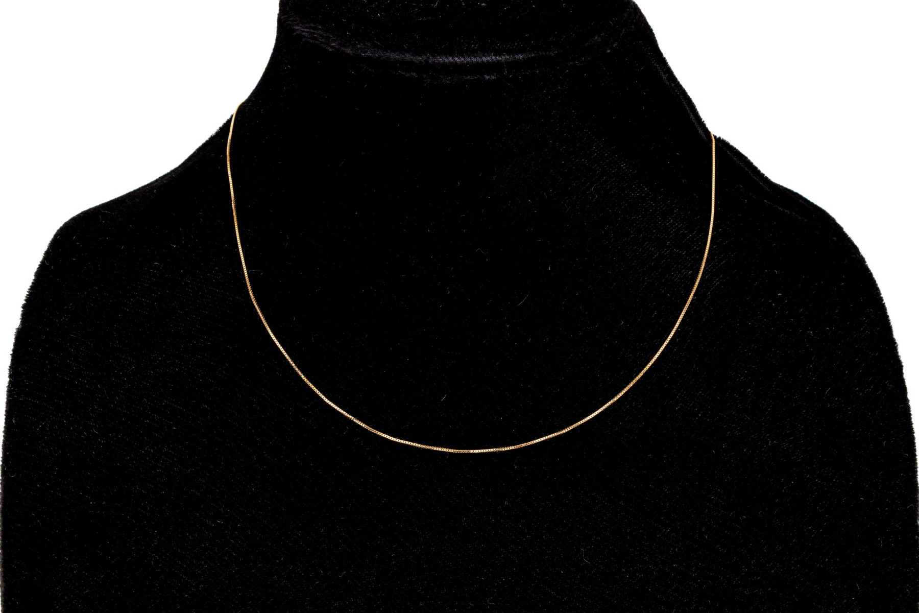 14k yellow gold simple fine box style chain, finished with a spring ring style clasp