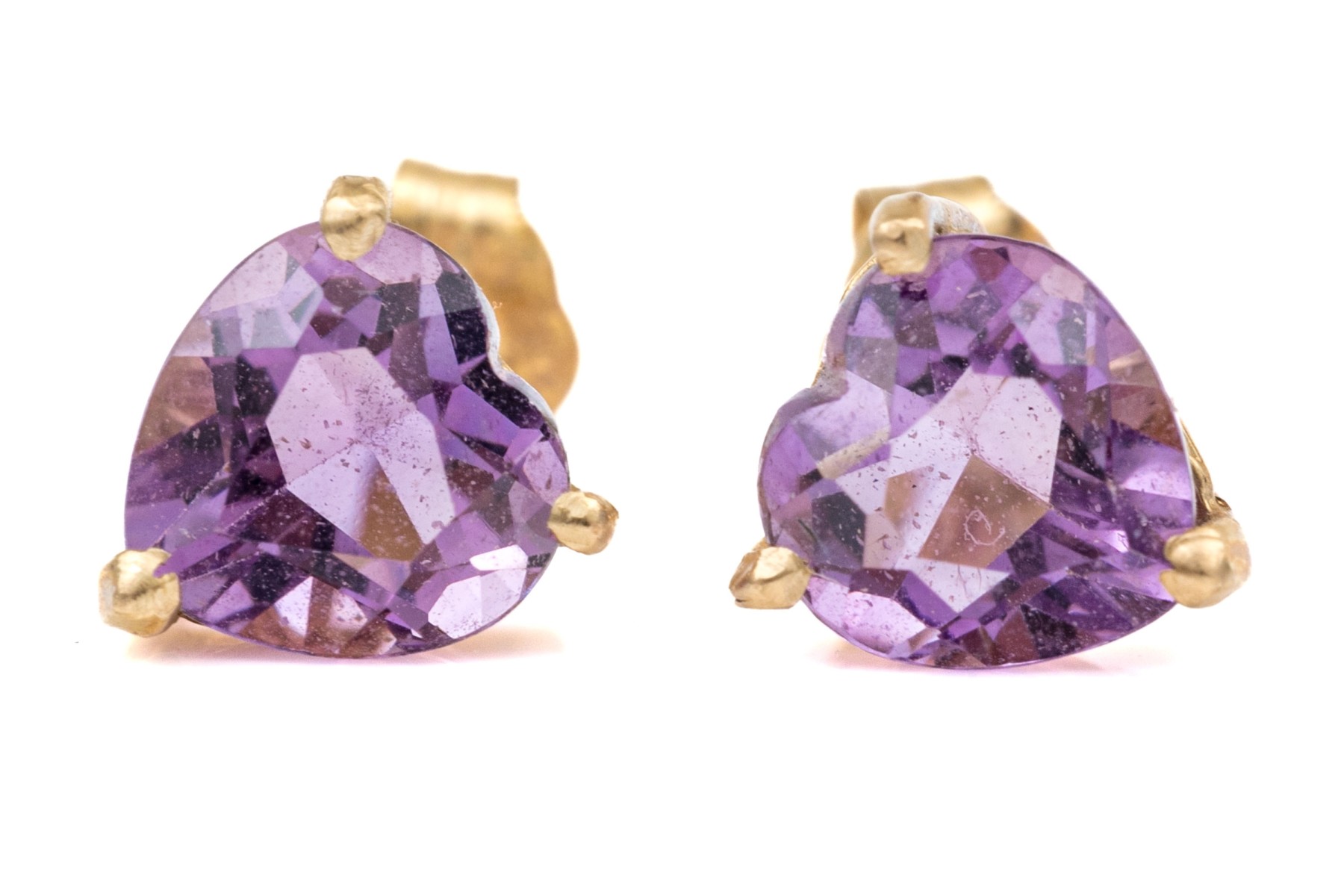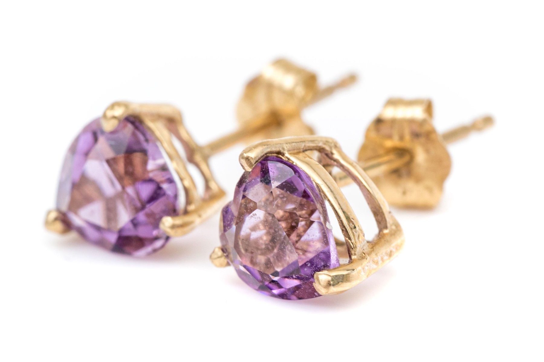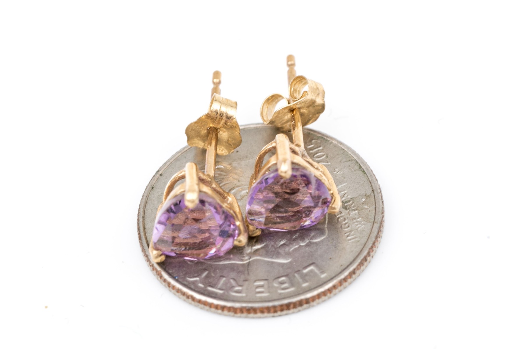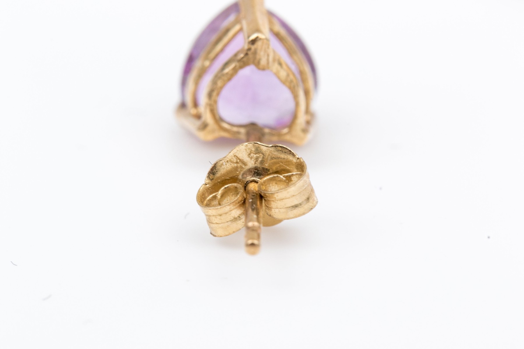 14k yellow gold simple purple amethyst heart stud earrings, app. 1.20 TCW, prong set. The earrings are finished by posts with clutch style backs