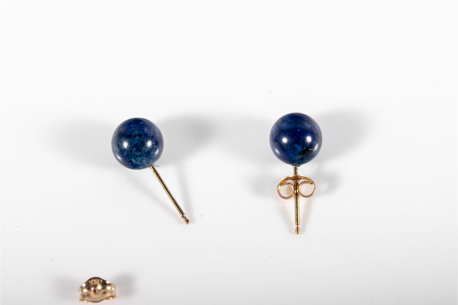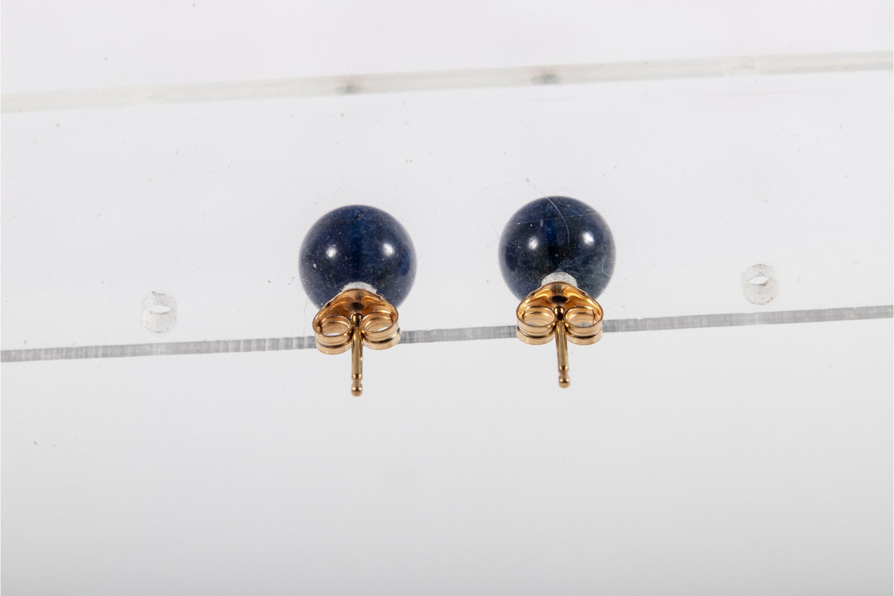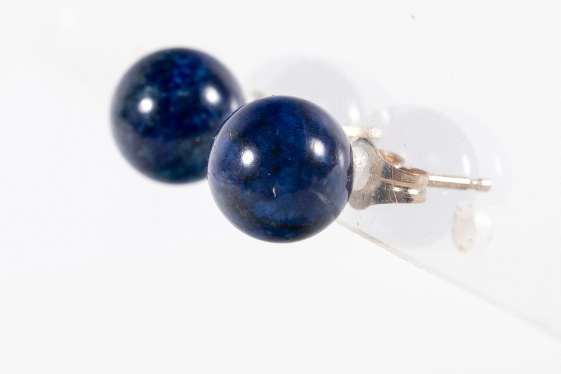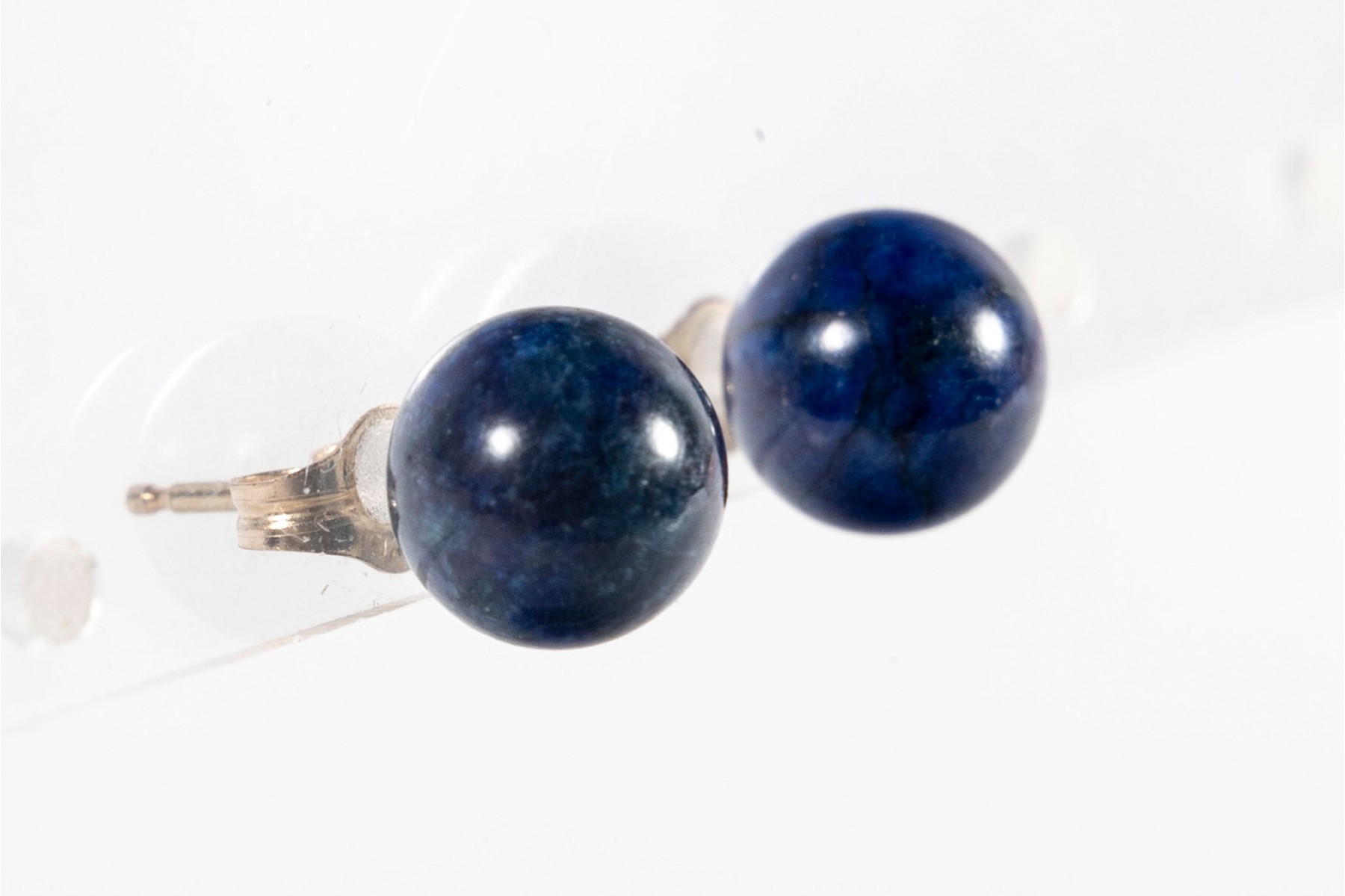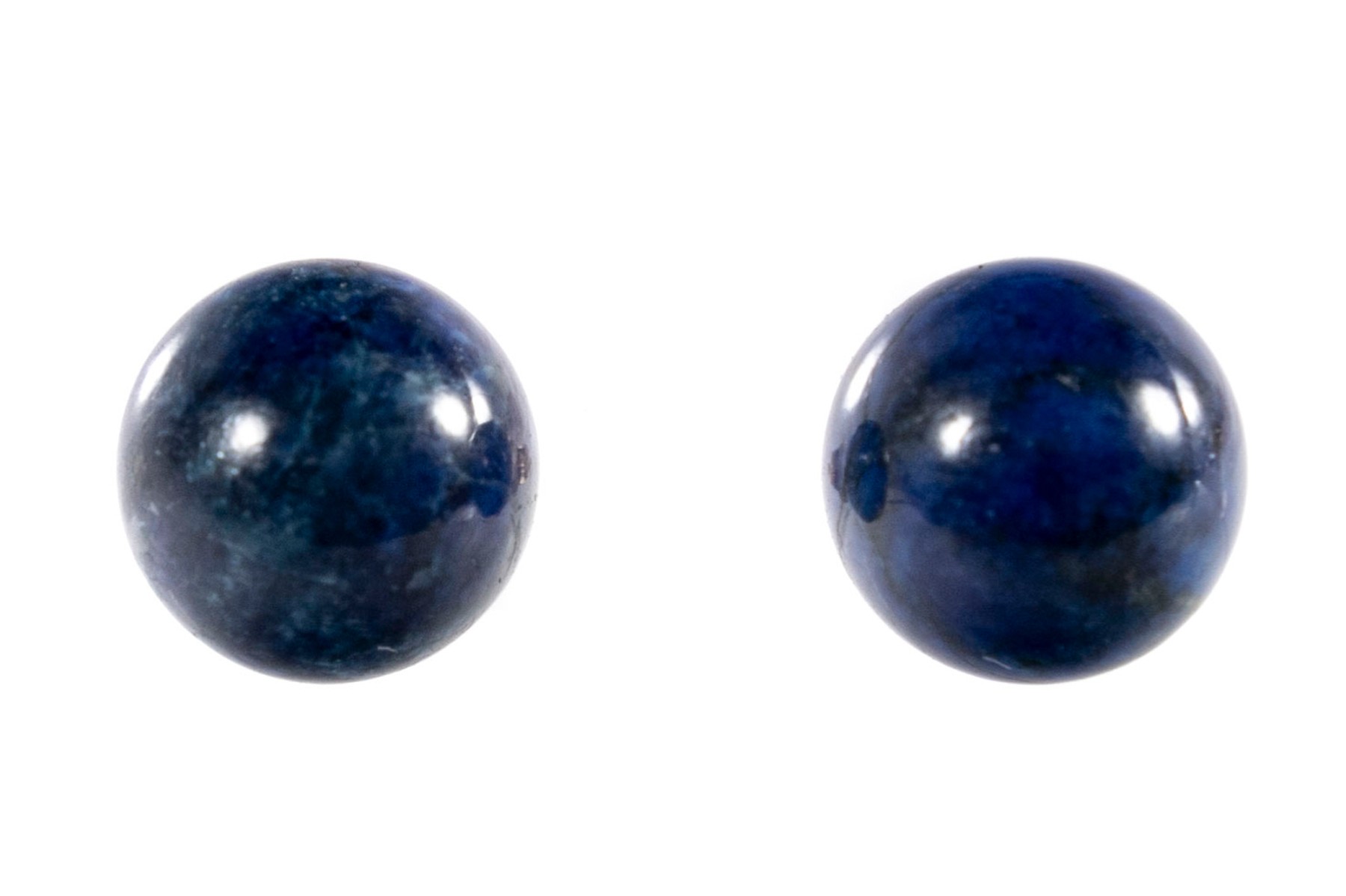 A pair of simple and classy sodalite studs in dark blue with subtle lighter variation, mounted to yellow gold posts.