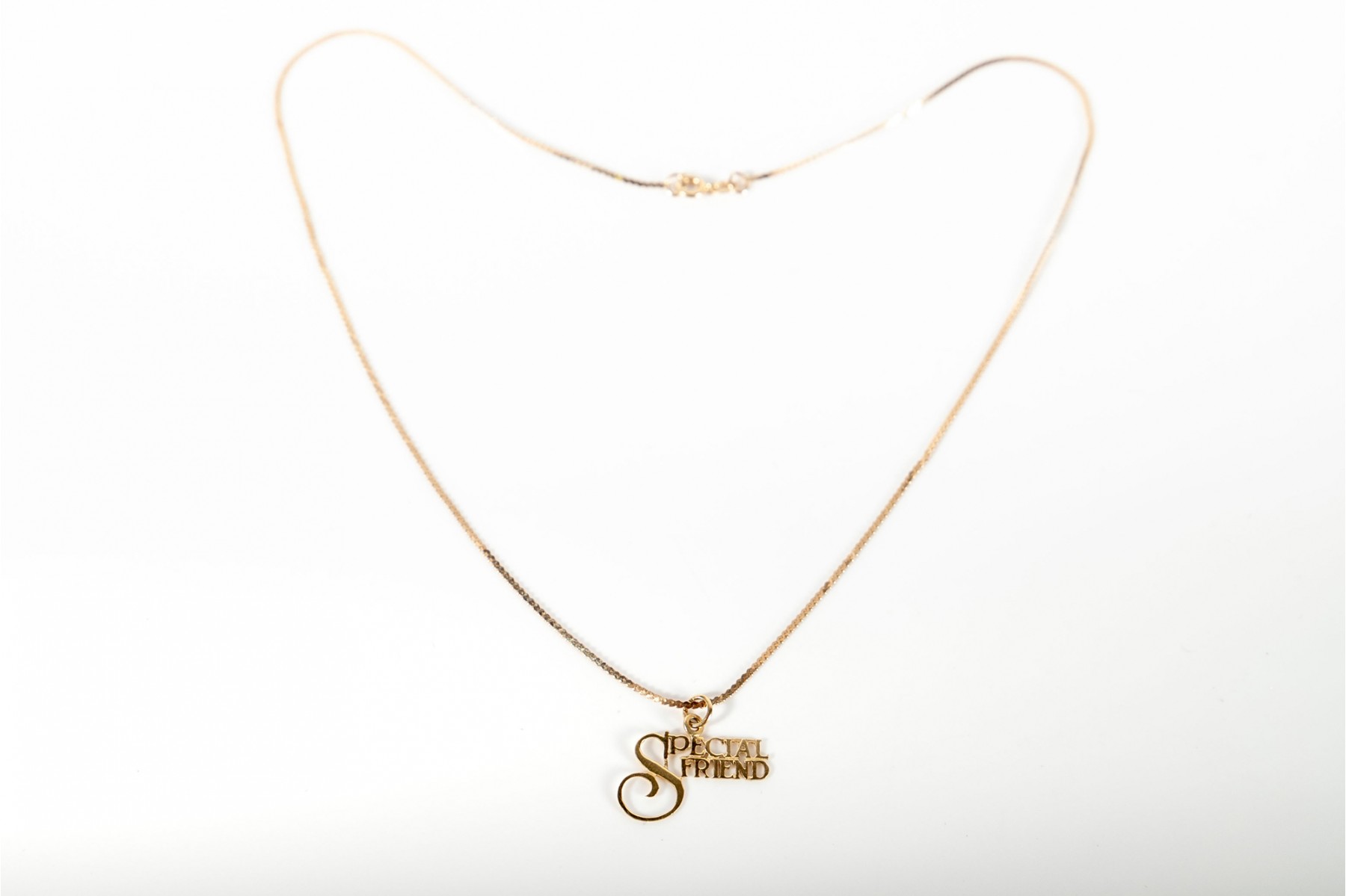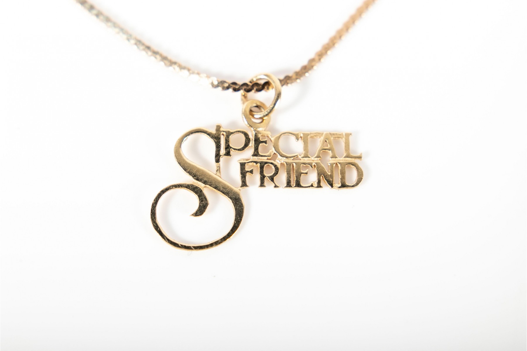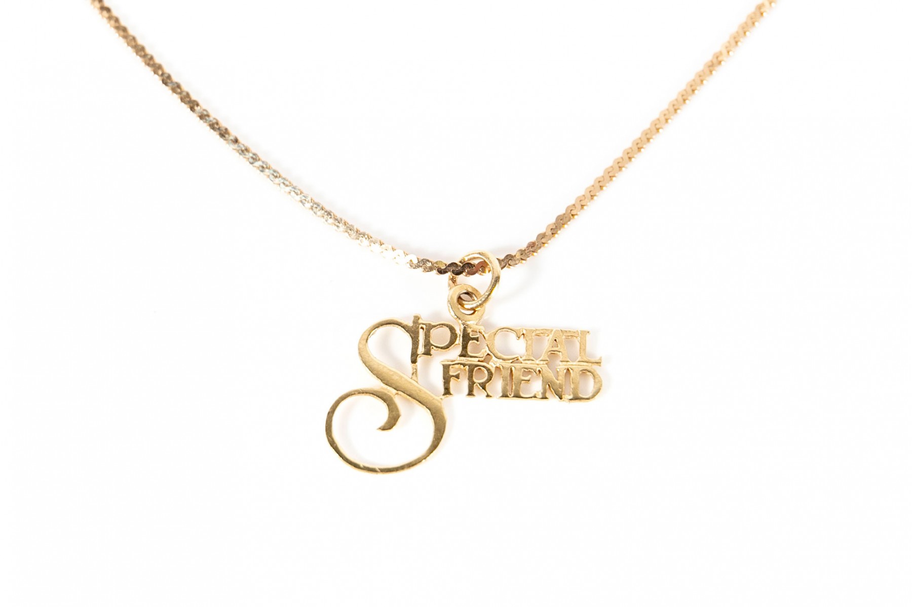 A yellow gold necklace displaying a pendant with the pierced phrase "Special Friend," hanging from a serpentine chain.
