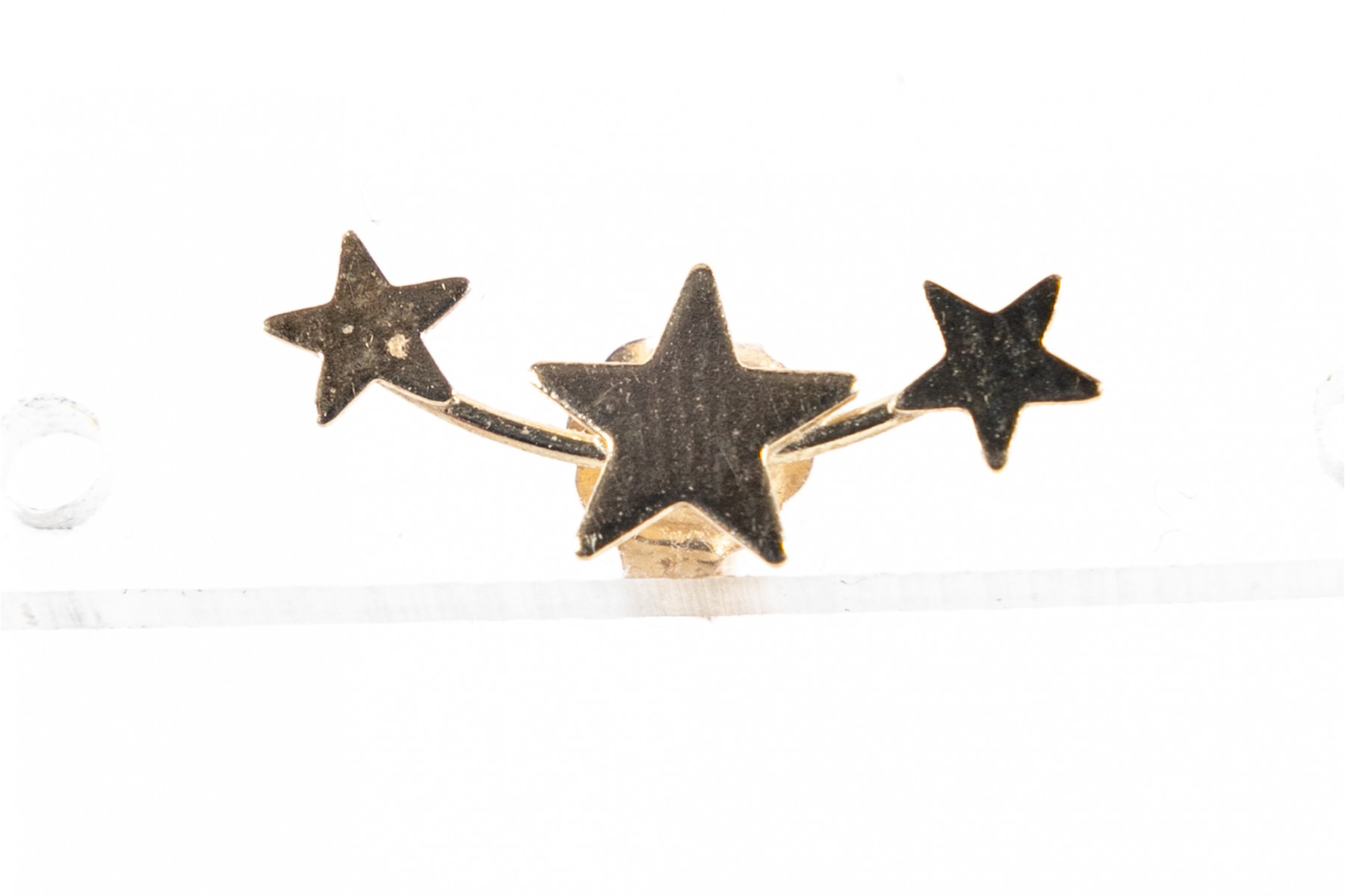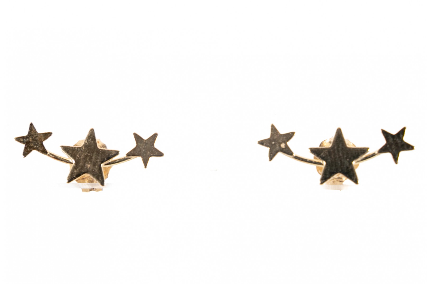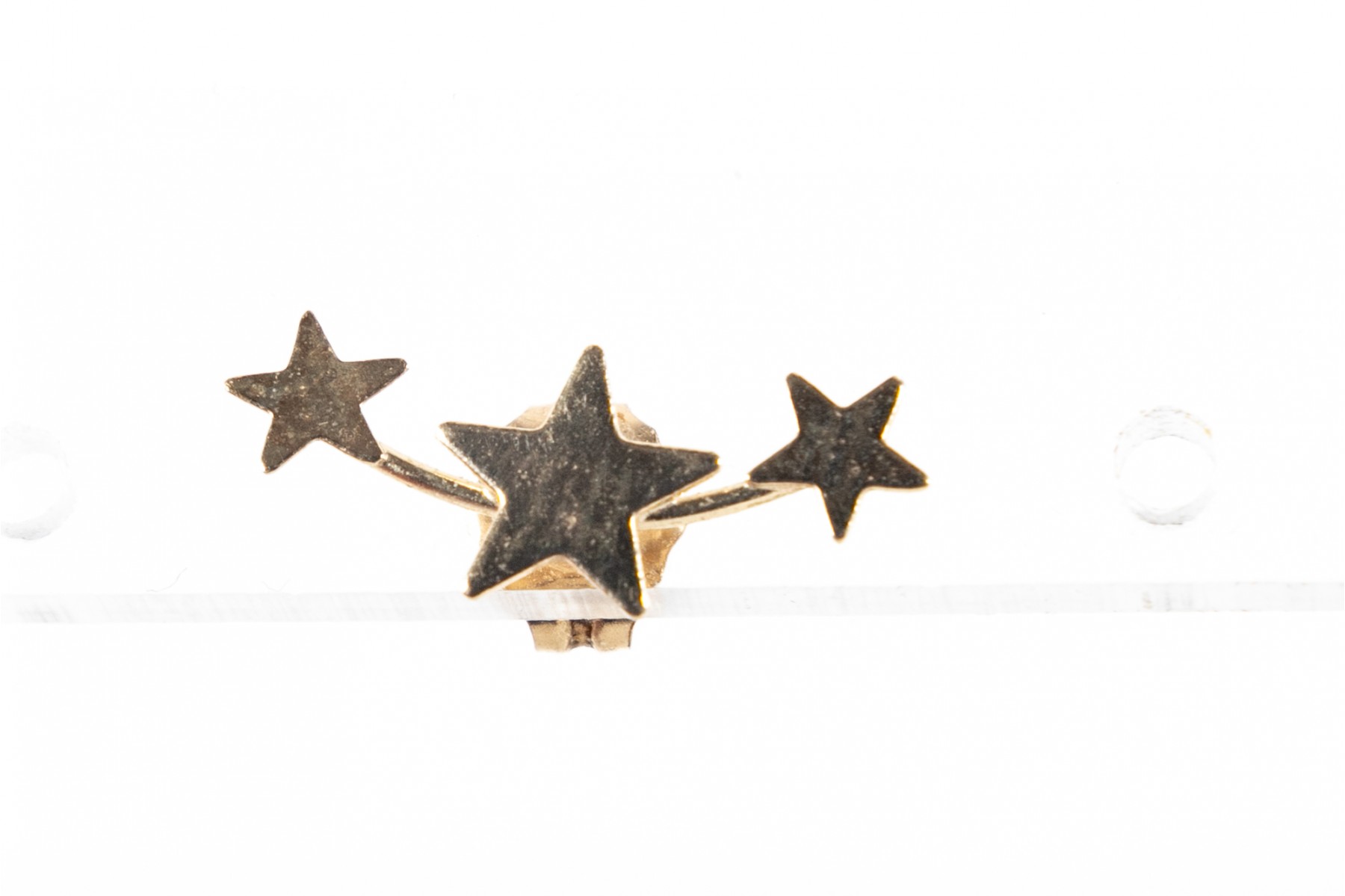 A pair of yellow gold studs displaying larger center star motifs flanked by smaller stars following dainty curving rods.