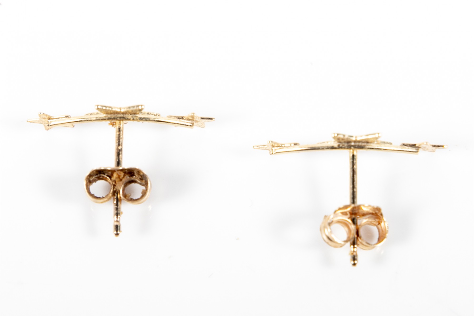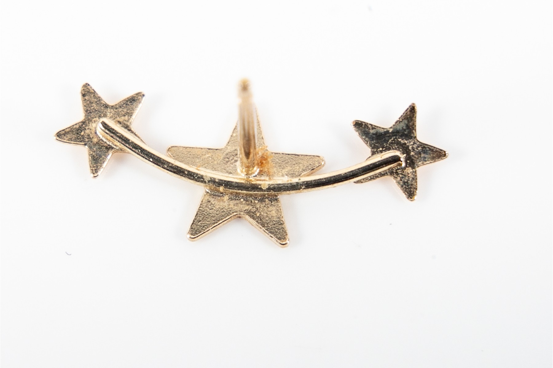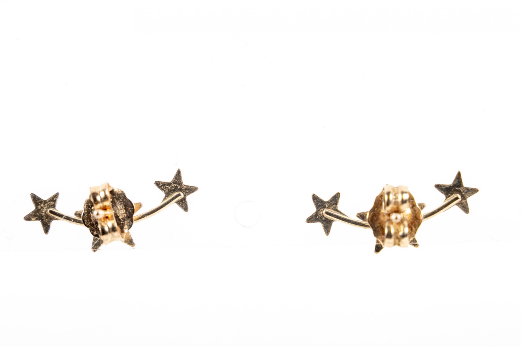 A pair of yellow gold studs displaying larger center star motifs flanked by smaller stars following dainty curving rods.