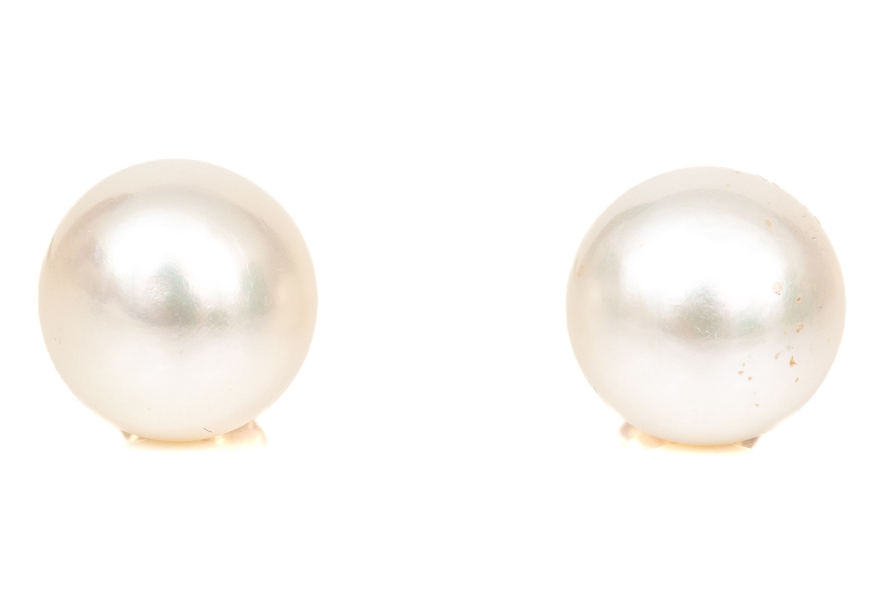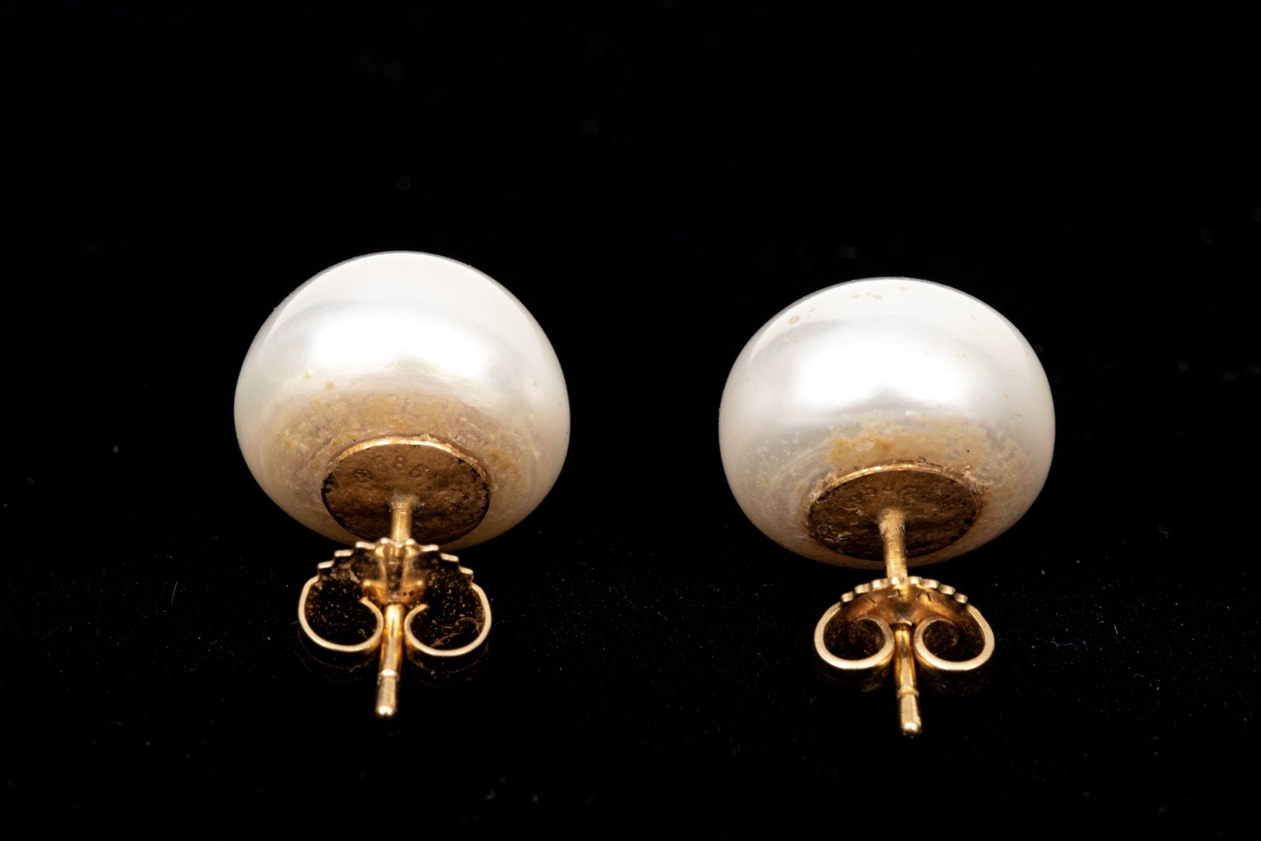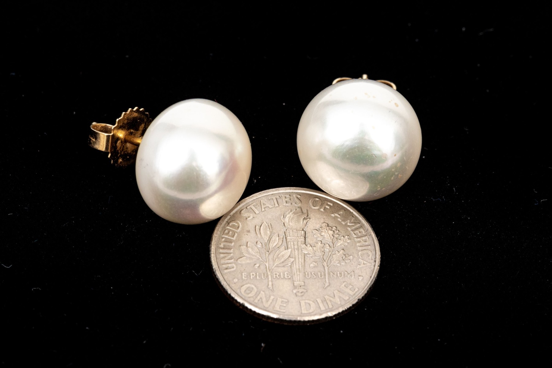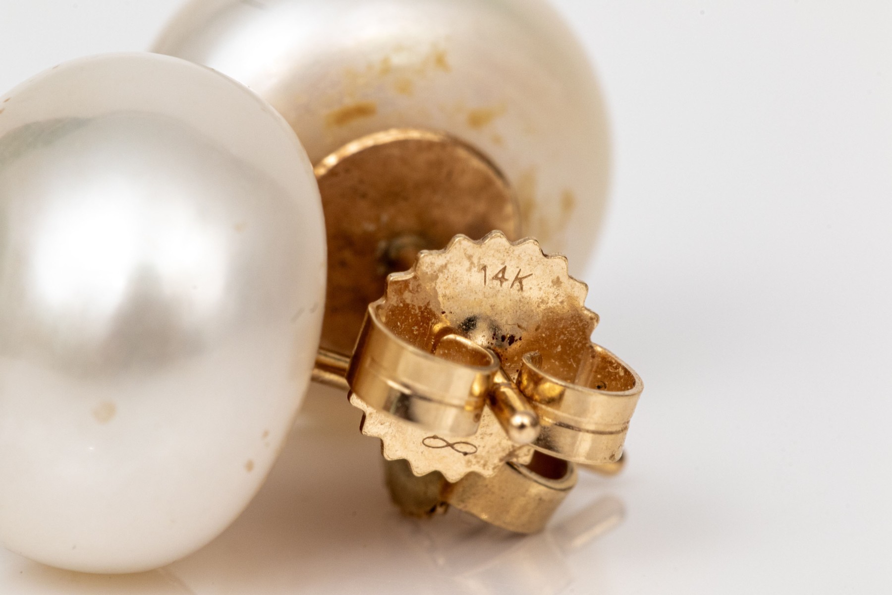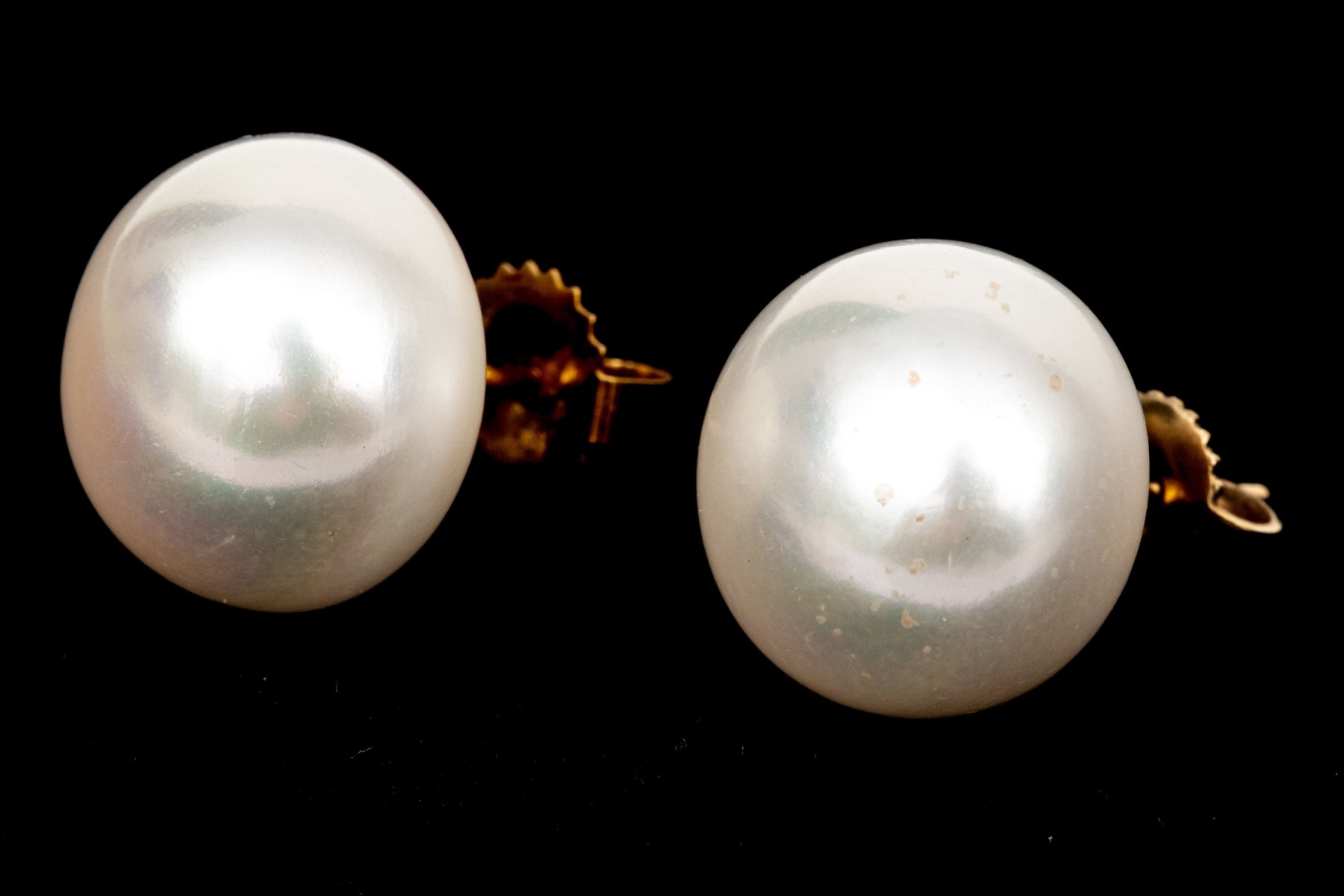 14k yellow gold striking 13mm cultured freshwater pearl earrings, finished with posts and clutch style backs