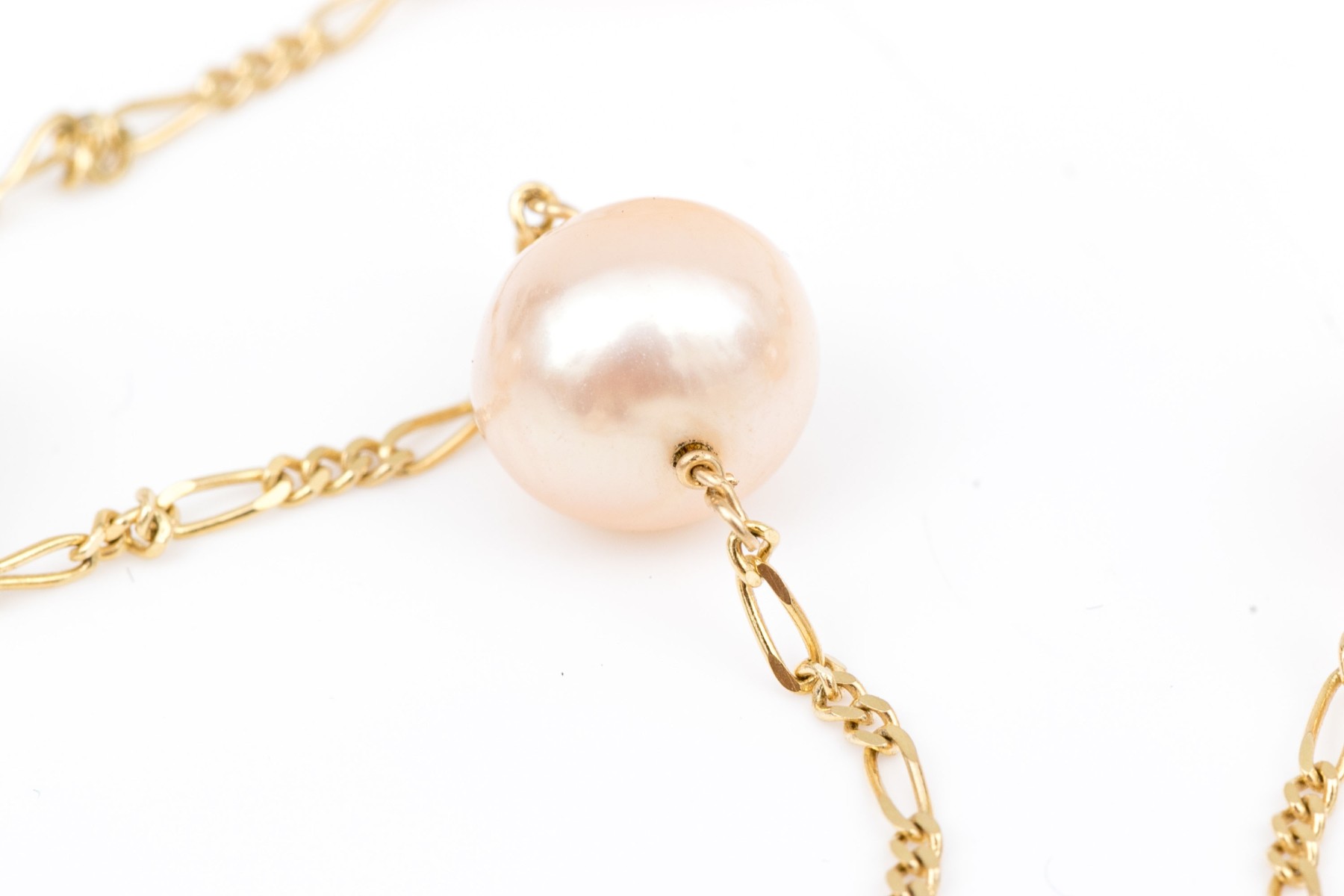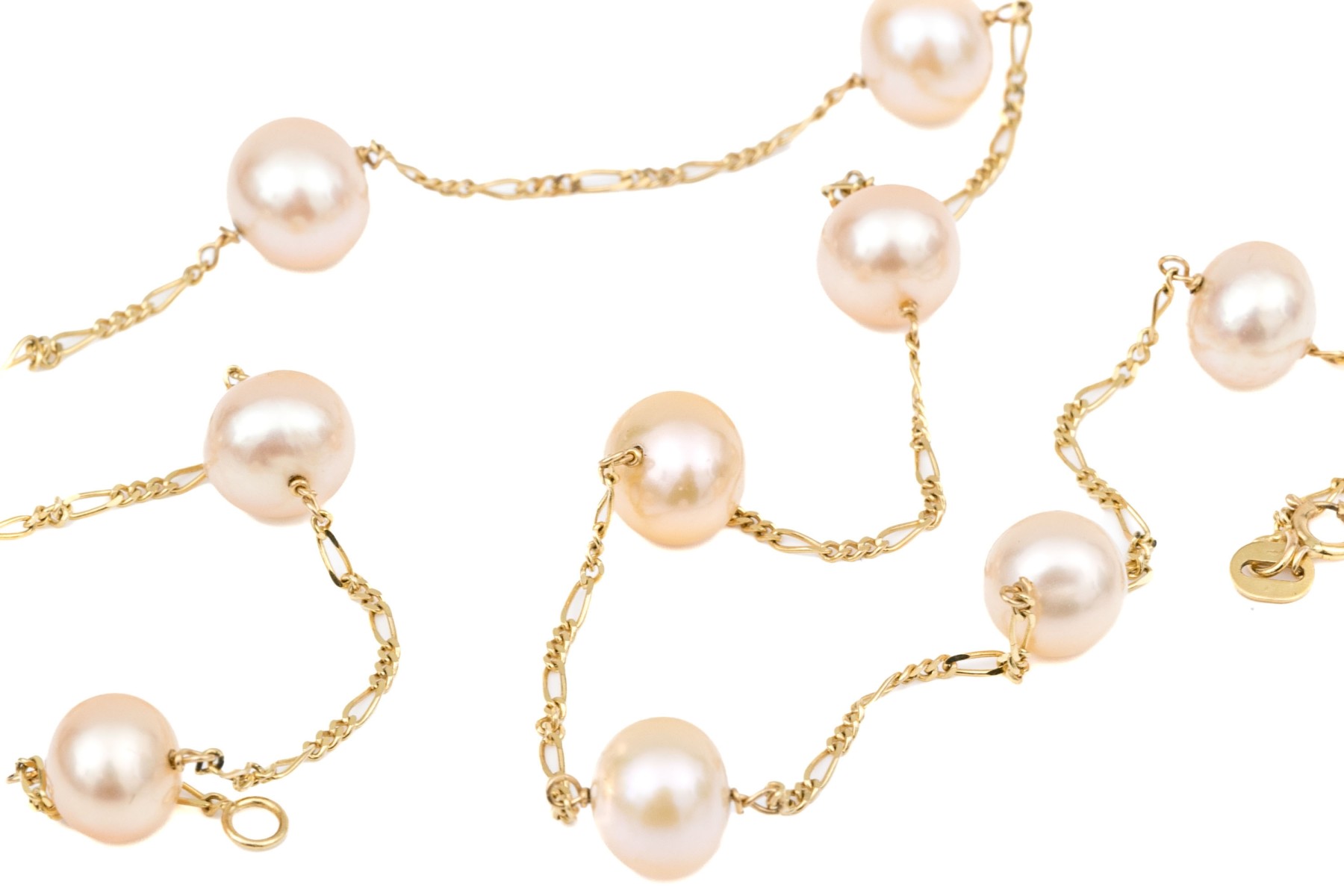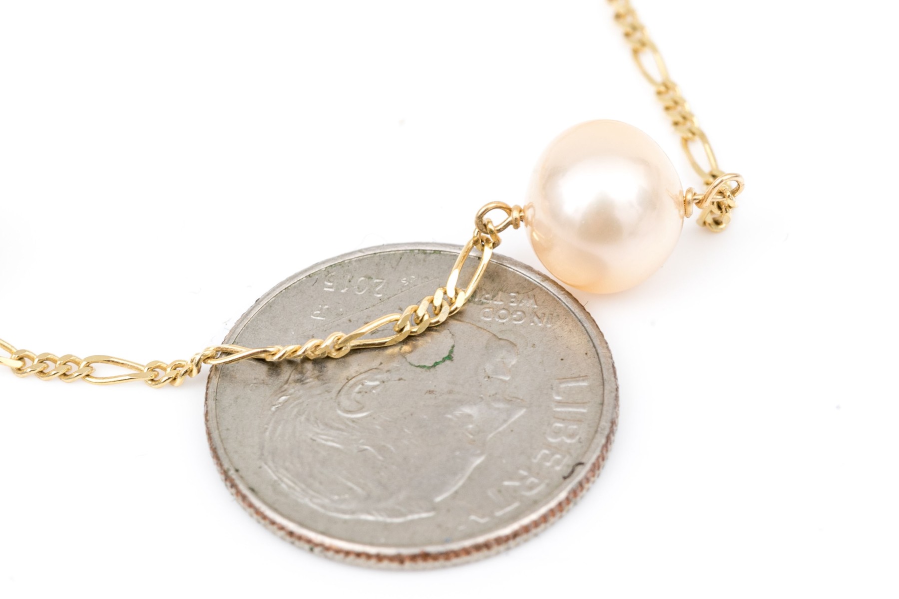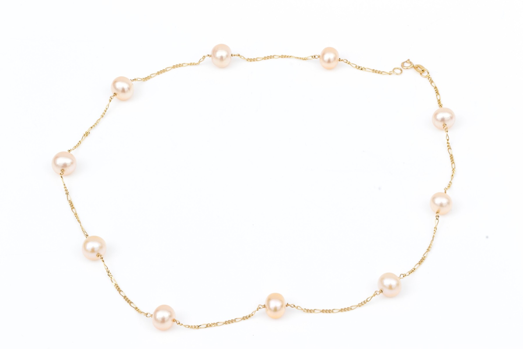 14k yellow gold striking champagne cultured freshwater pearl station necklace, 8.25 mm cultured freshwater pearls, finished with a spring ring style clasp