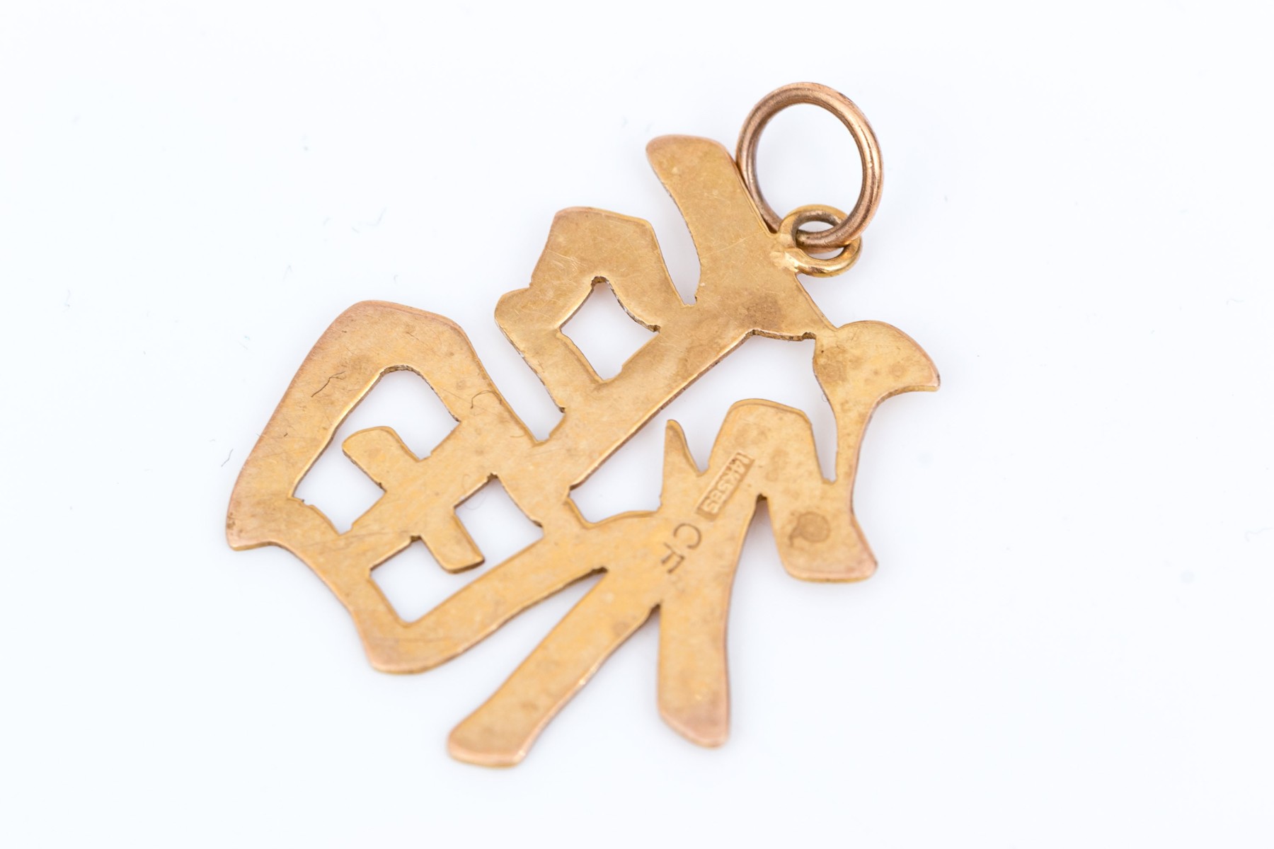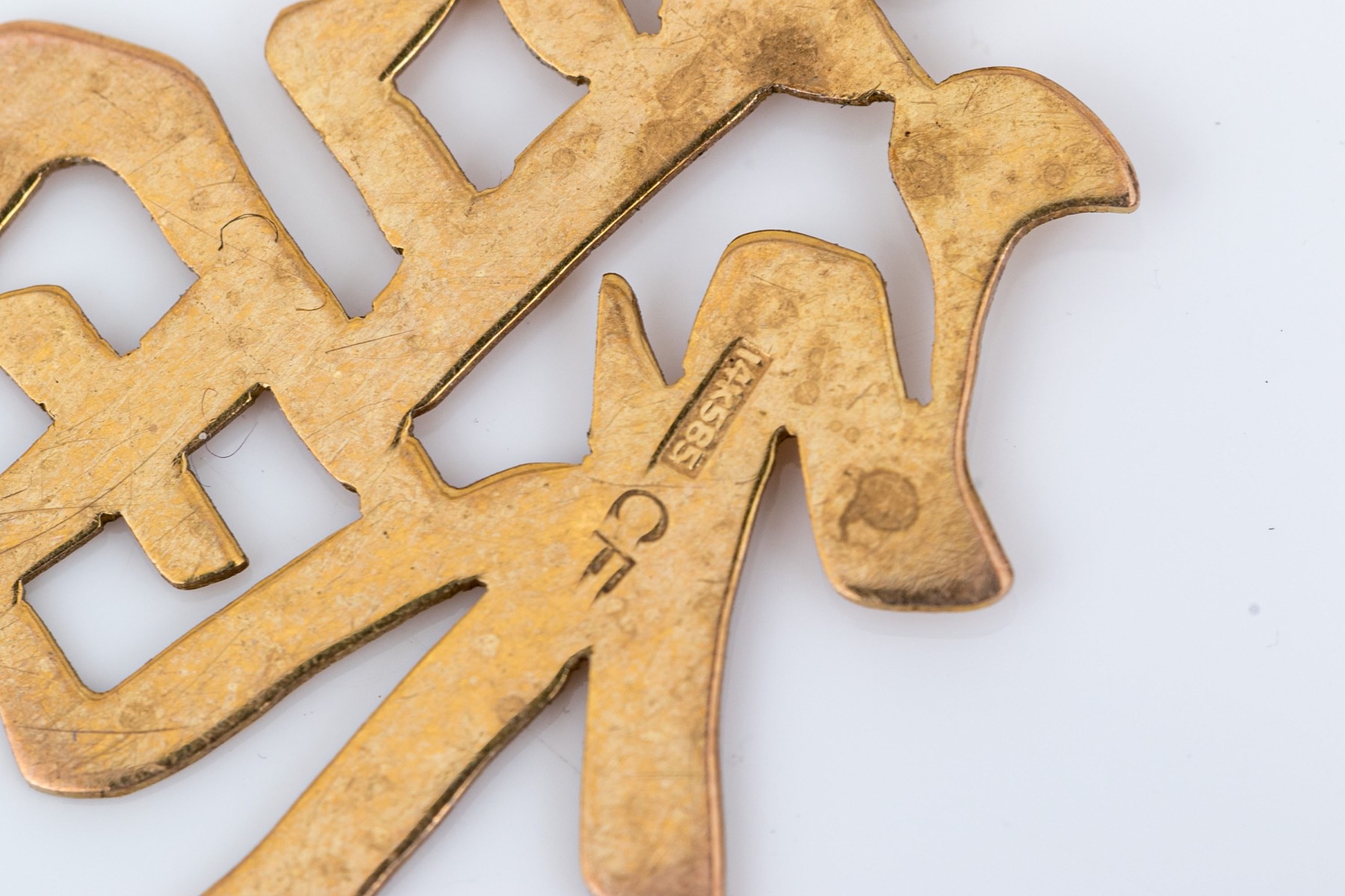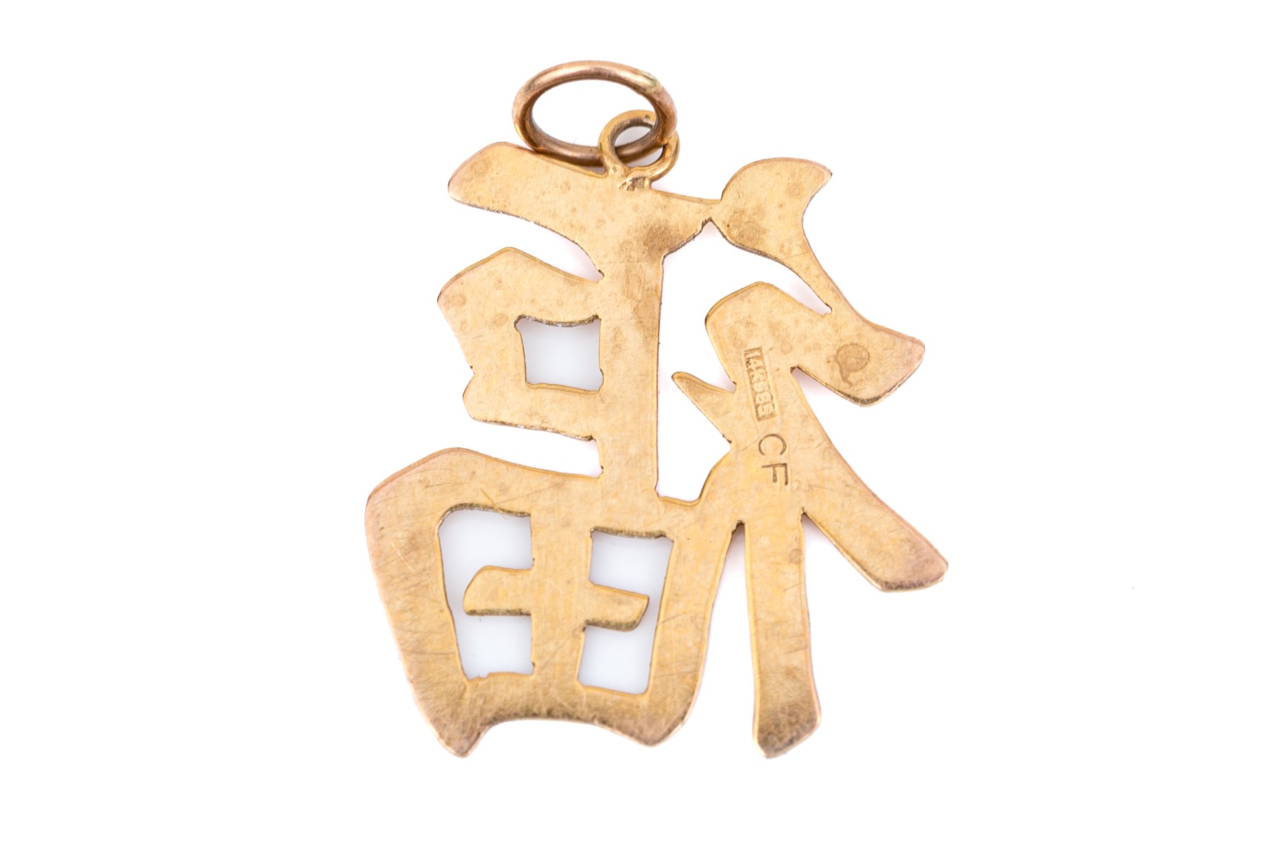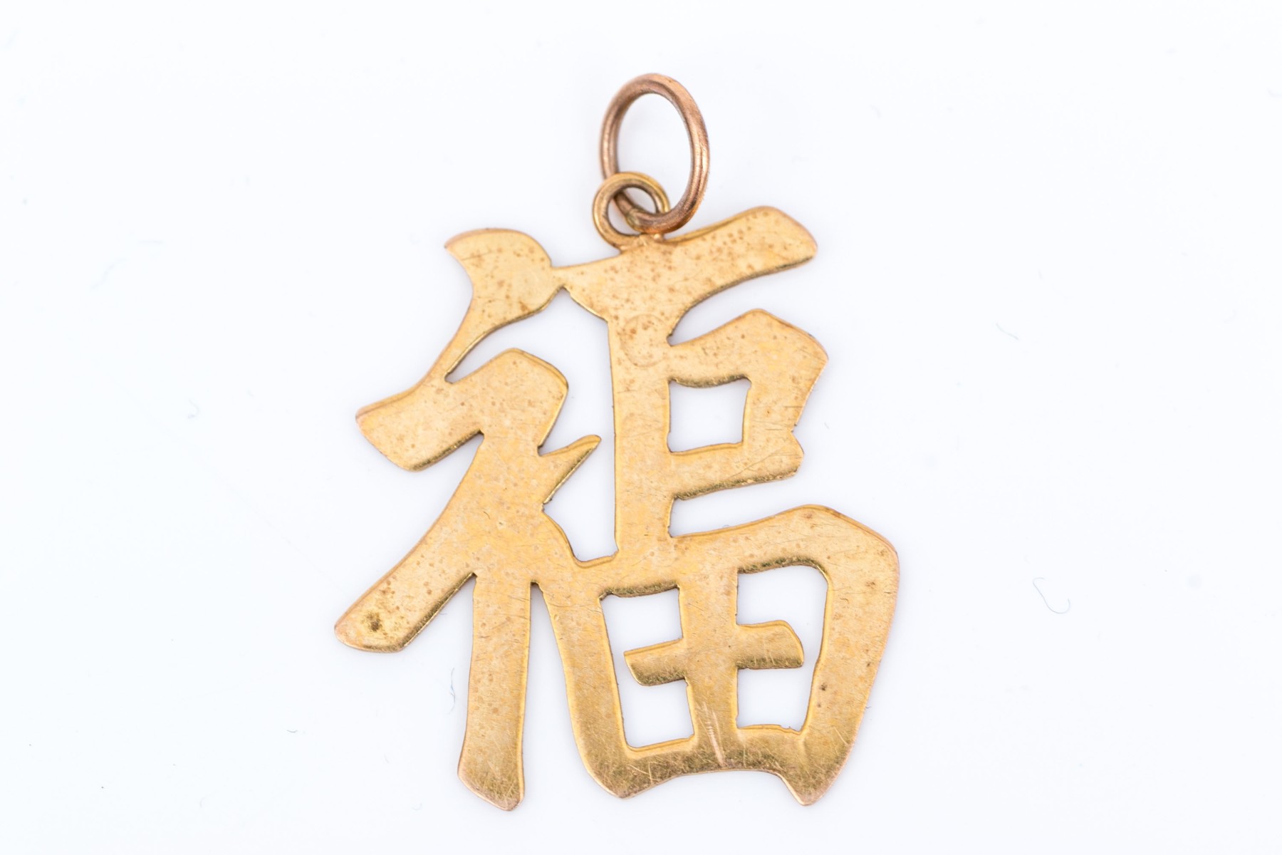 14k yellow gold striking Chinese calligraphy pendant, finished with a jump ring style bale