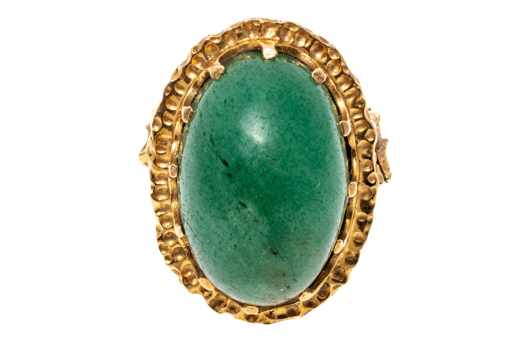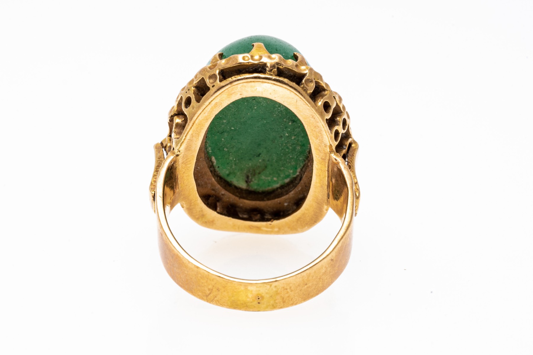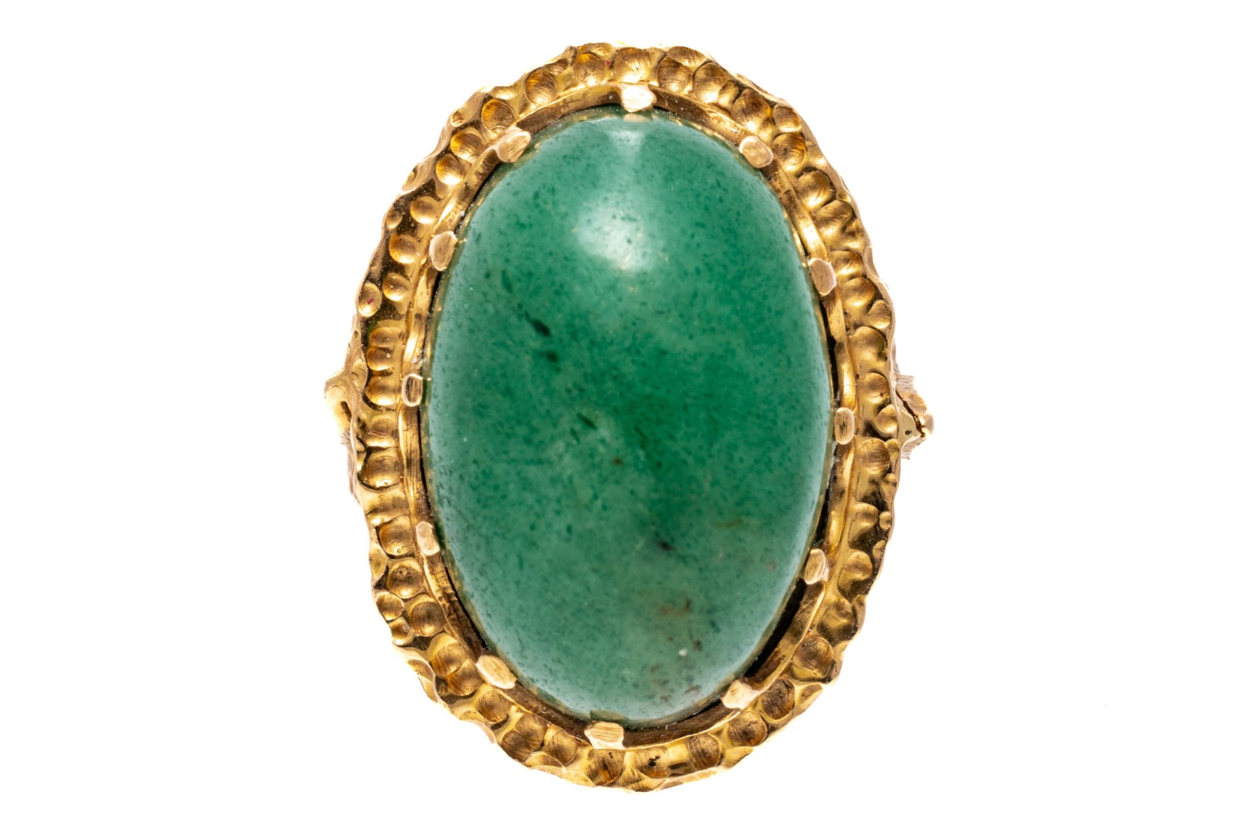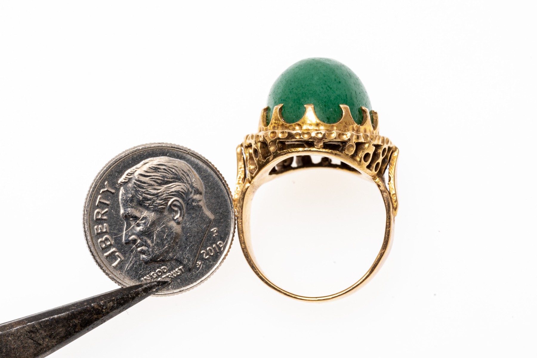 14k yellow gold striking chunky vintage oval cabachon green jade ring, set with multiple prongs and decorated with a figure 8 patterned gallery