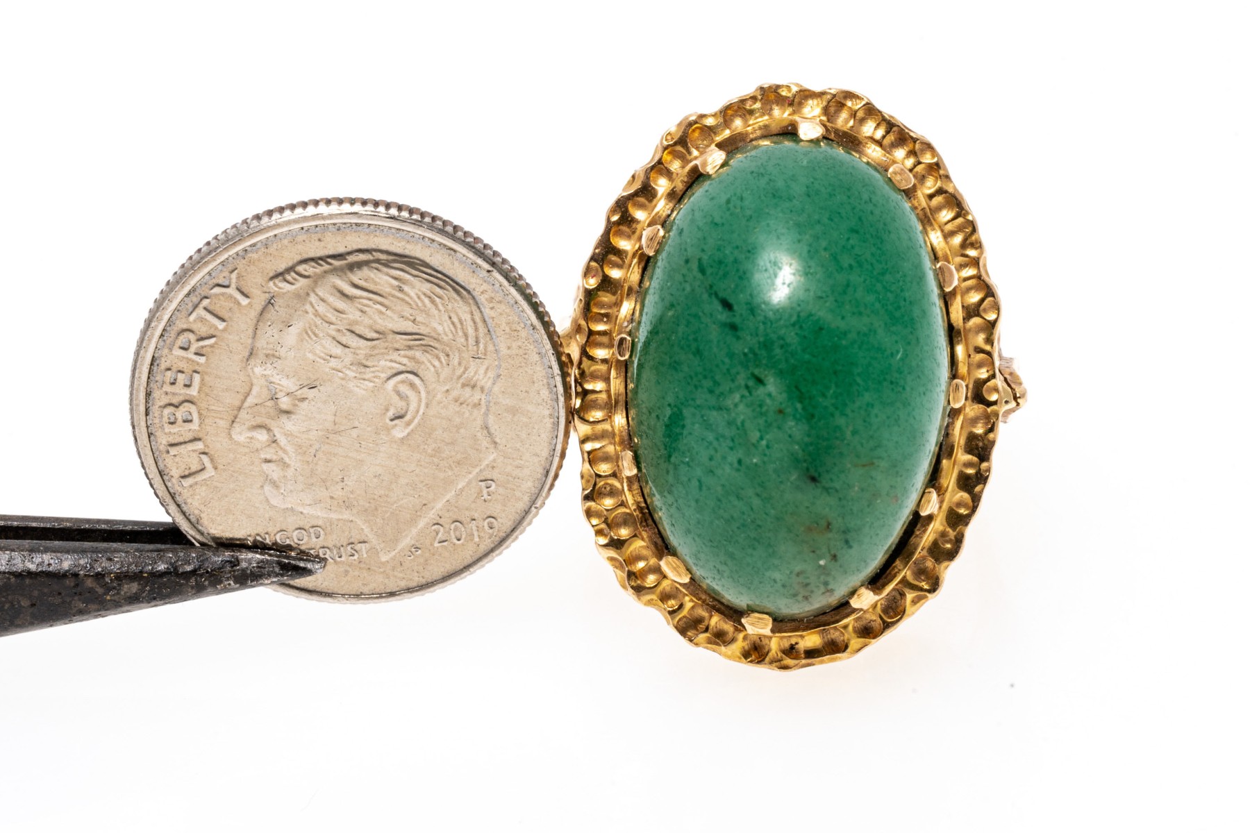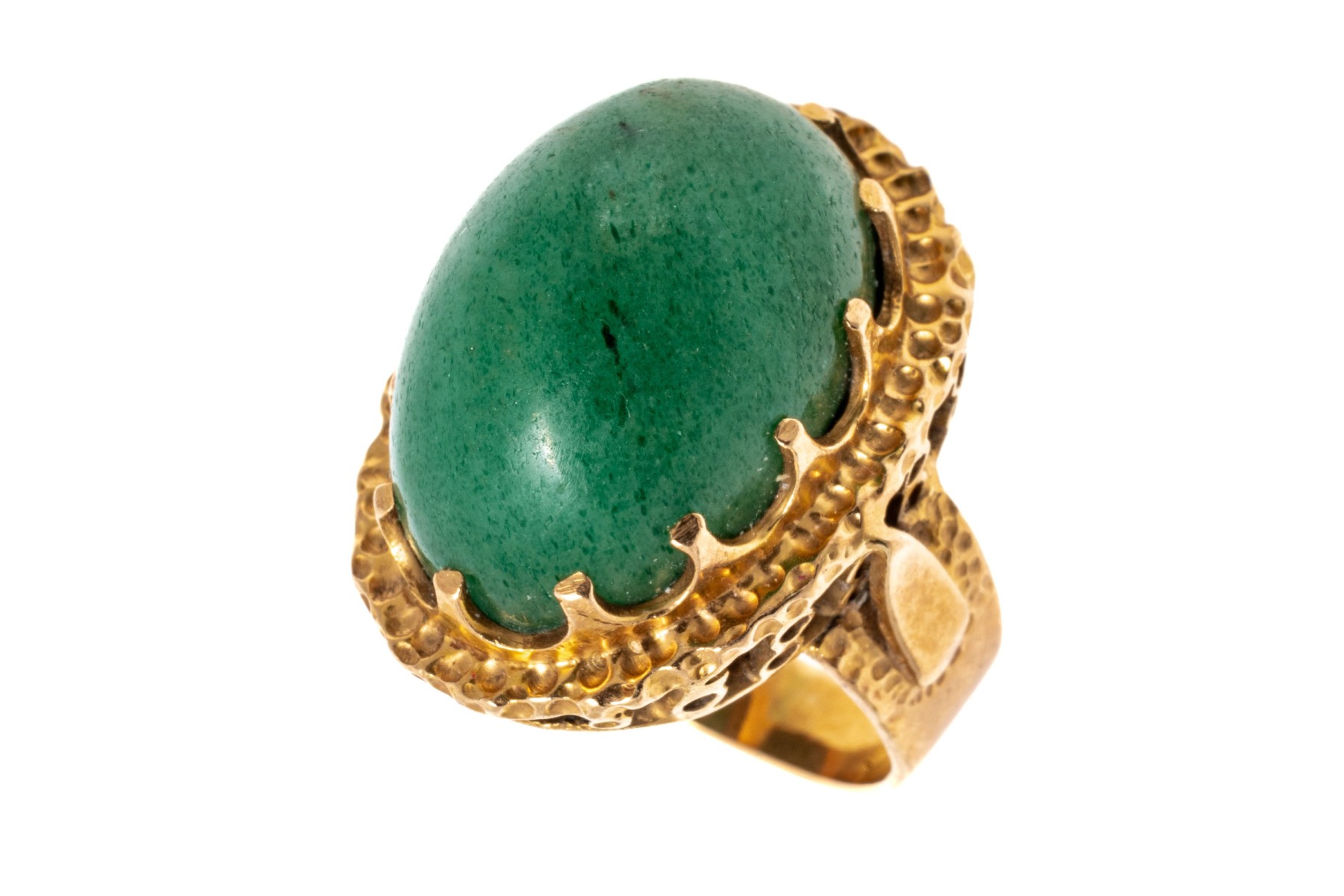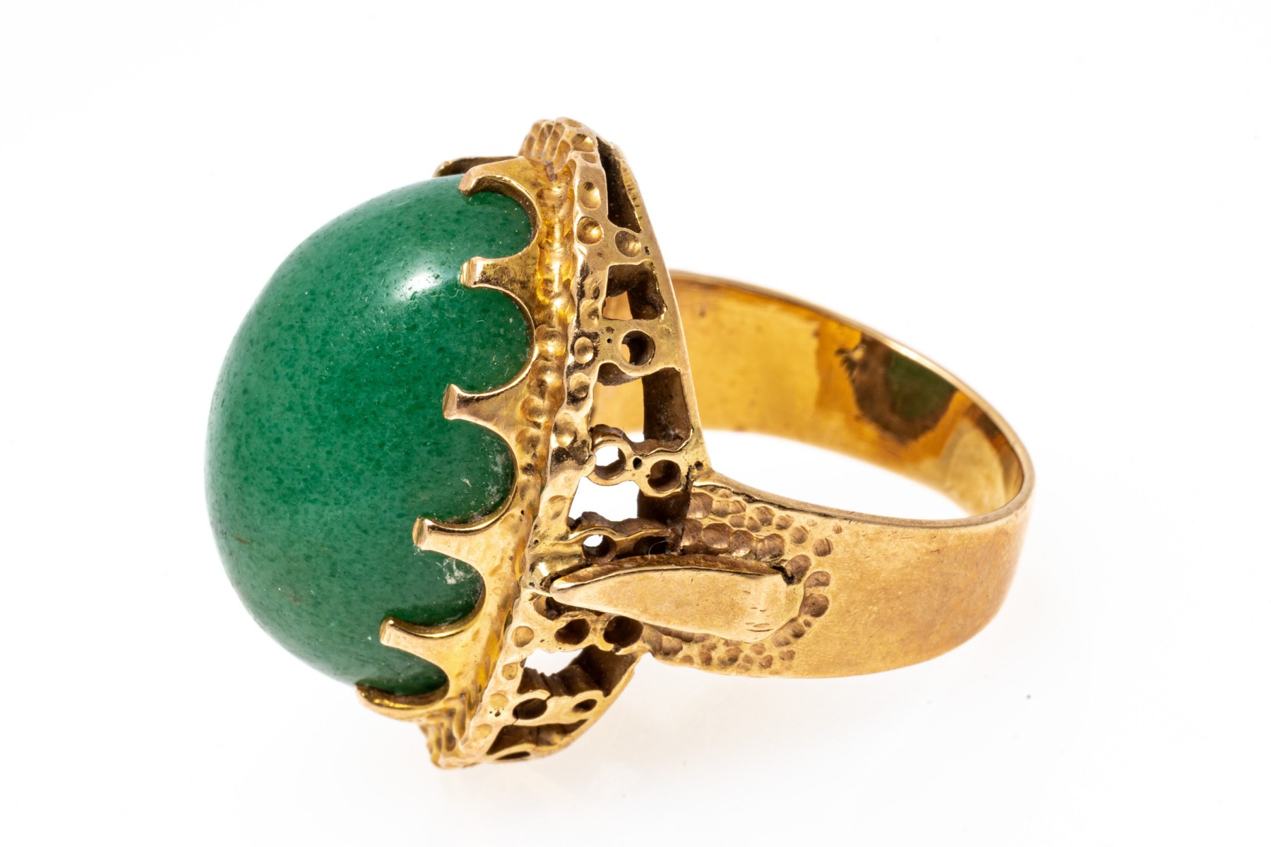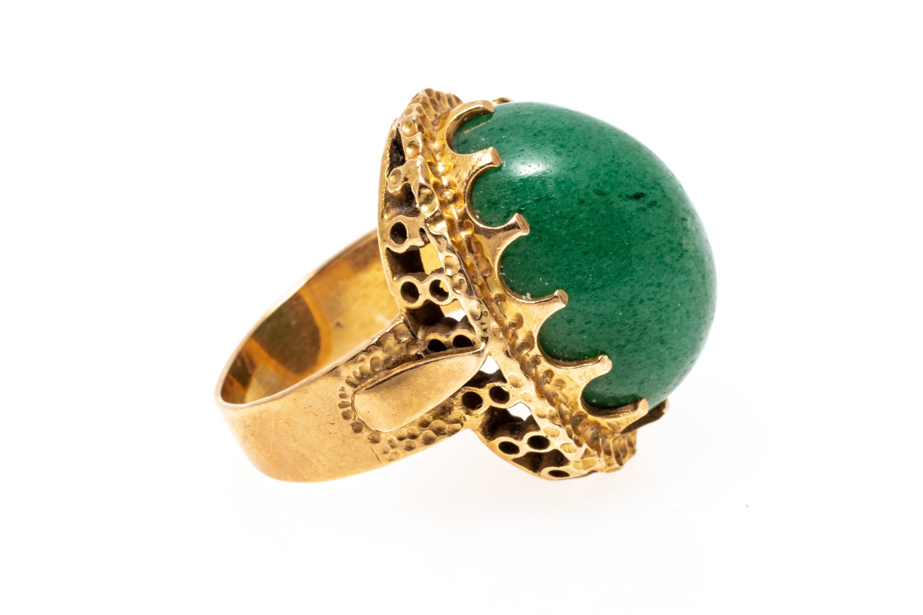 14k yellow gold striking chunky vintage oval cabachon green jade ring, set with multiple prongs and decorated with a figure 8 patterned gallery