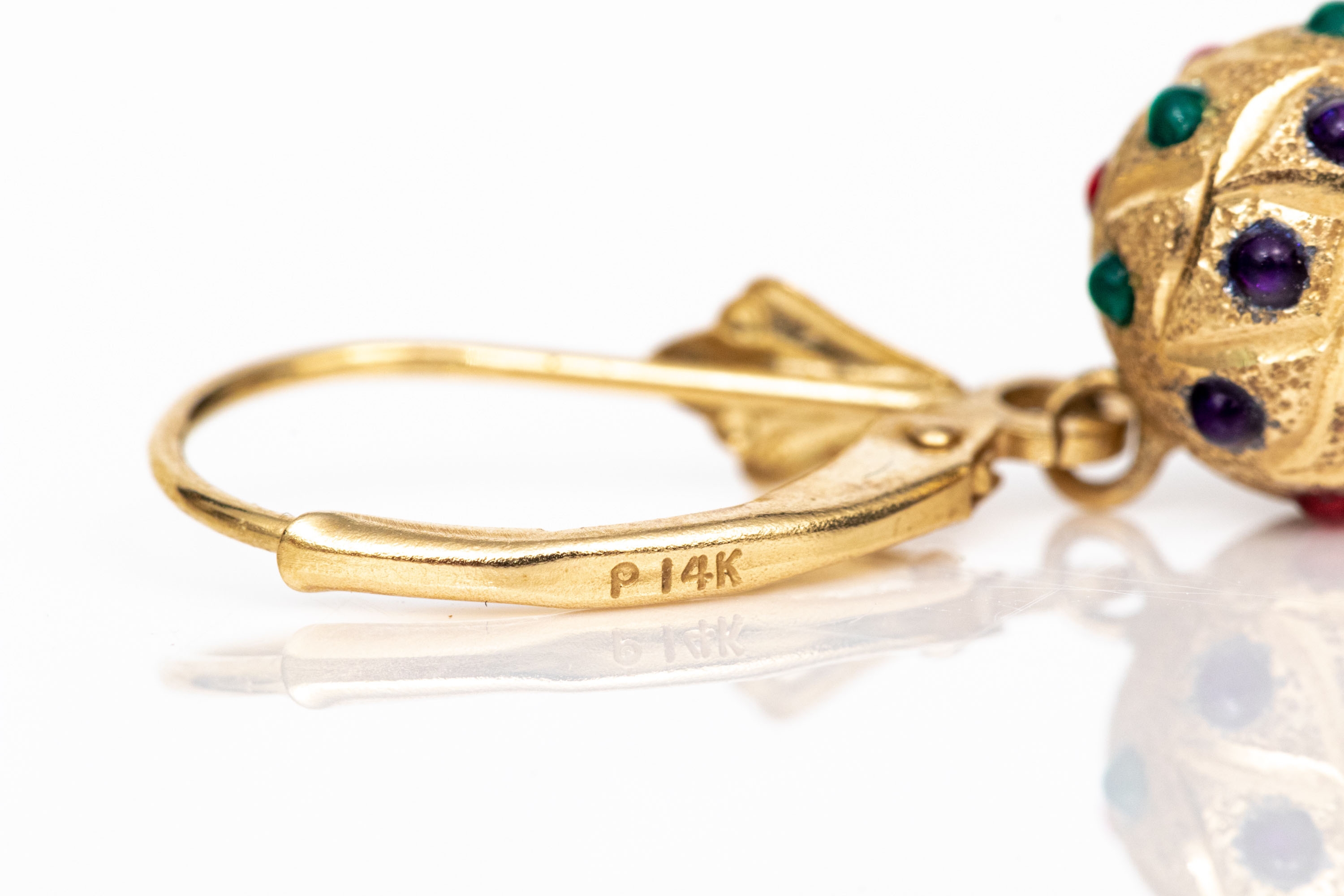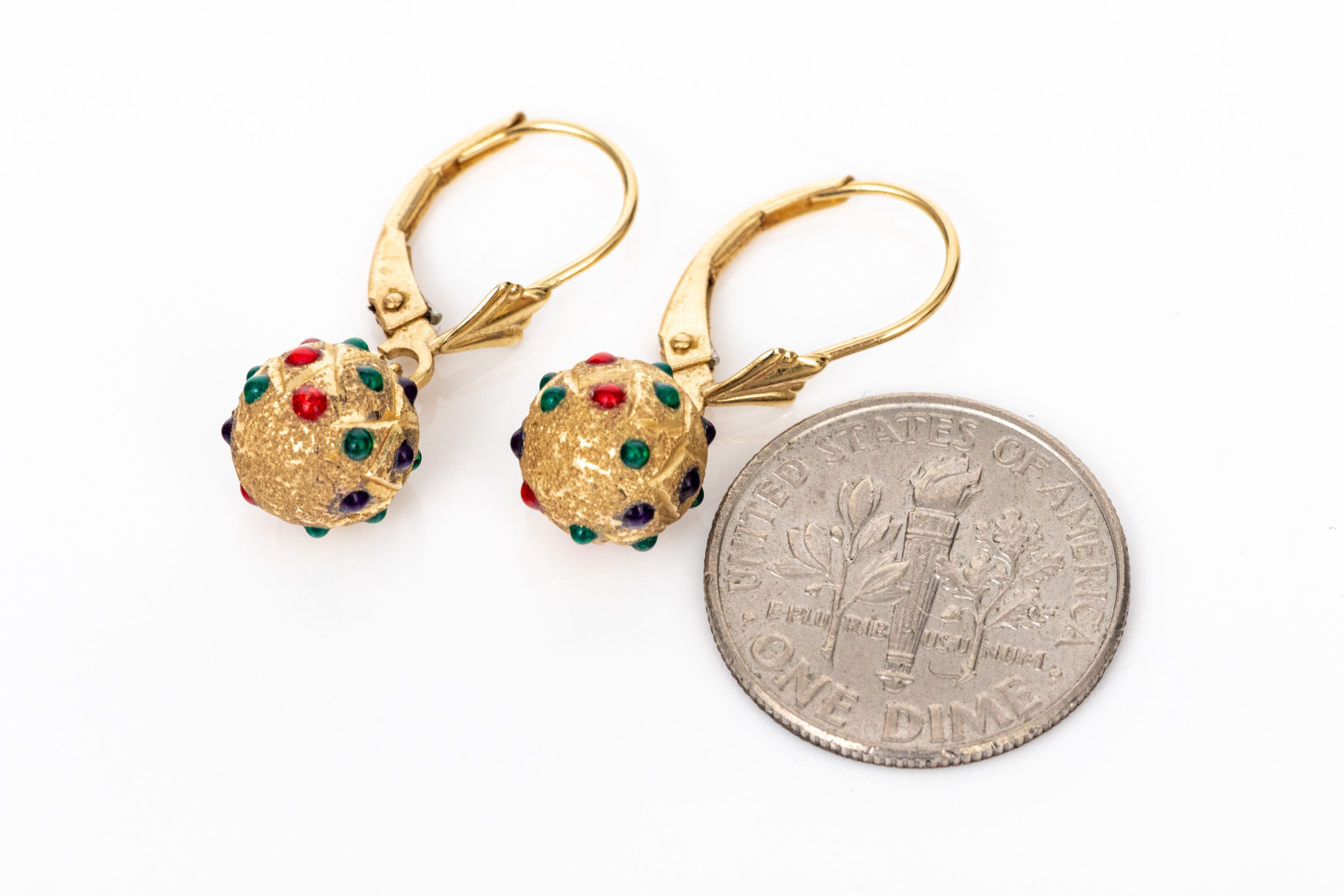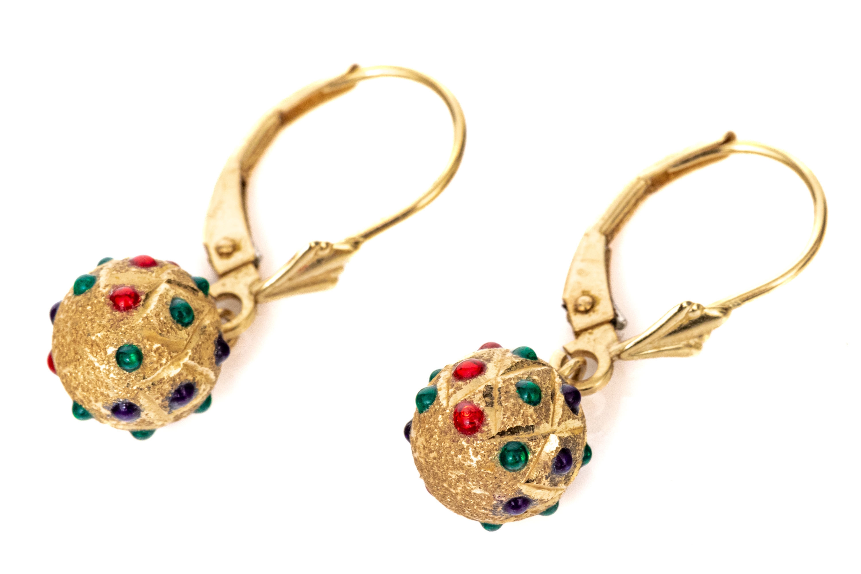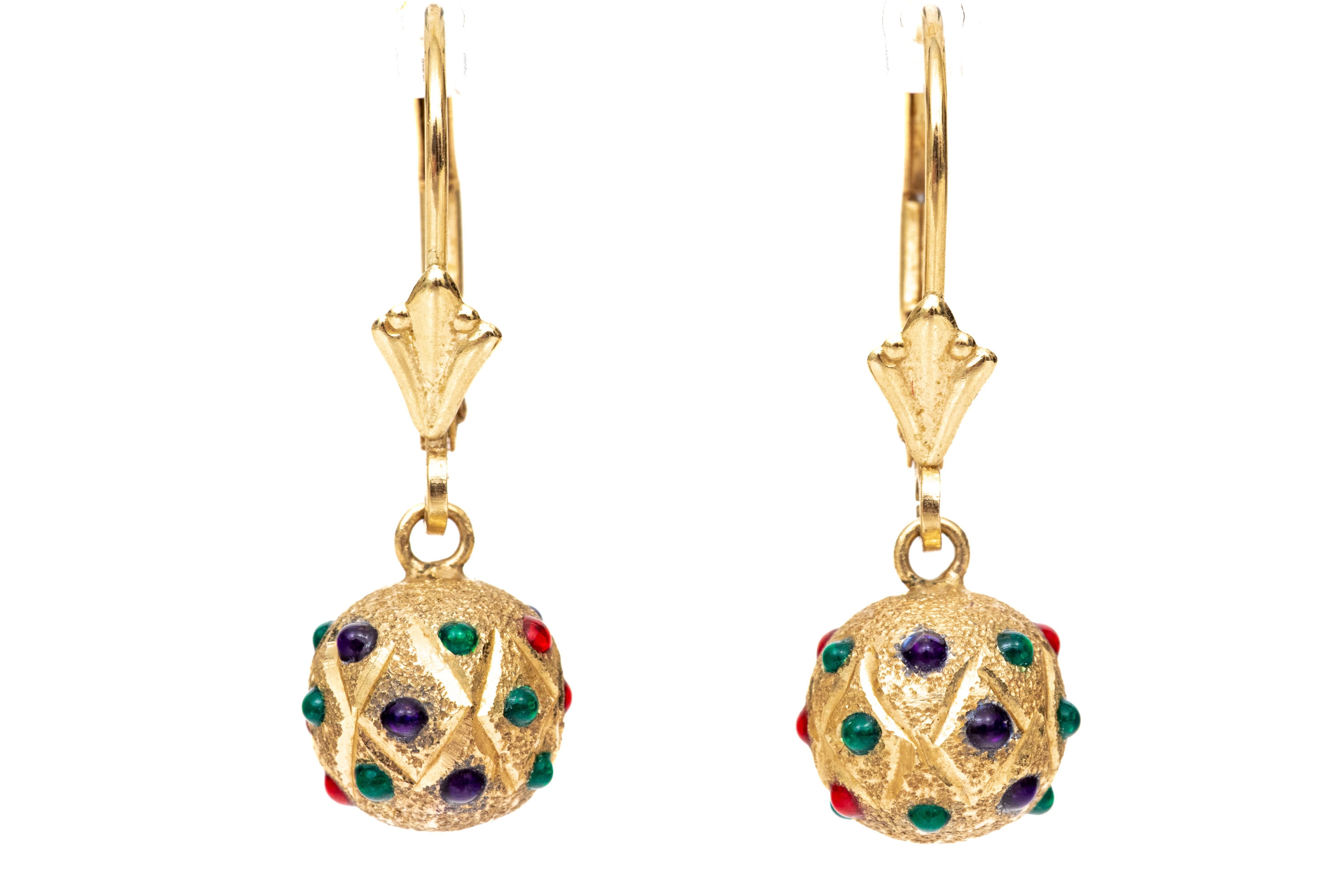 14k yellow gold striking colorful decorated sandblasted ball drop pendant earrings, finished with wires and lever style backs