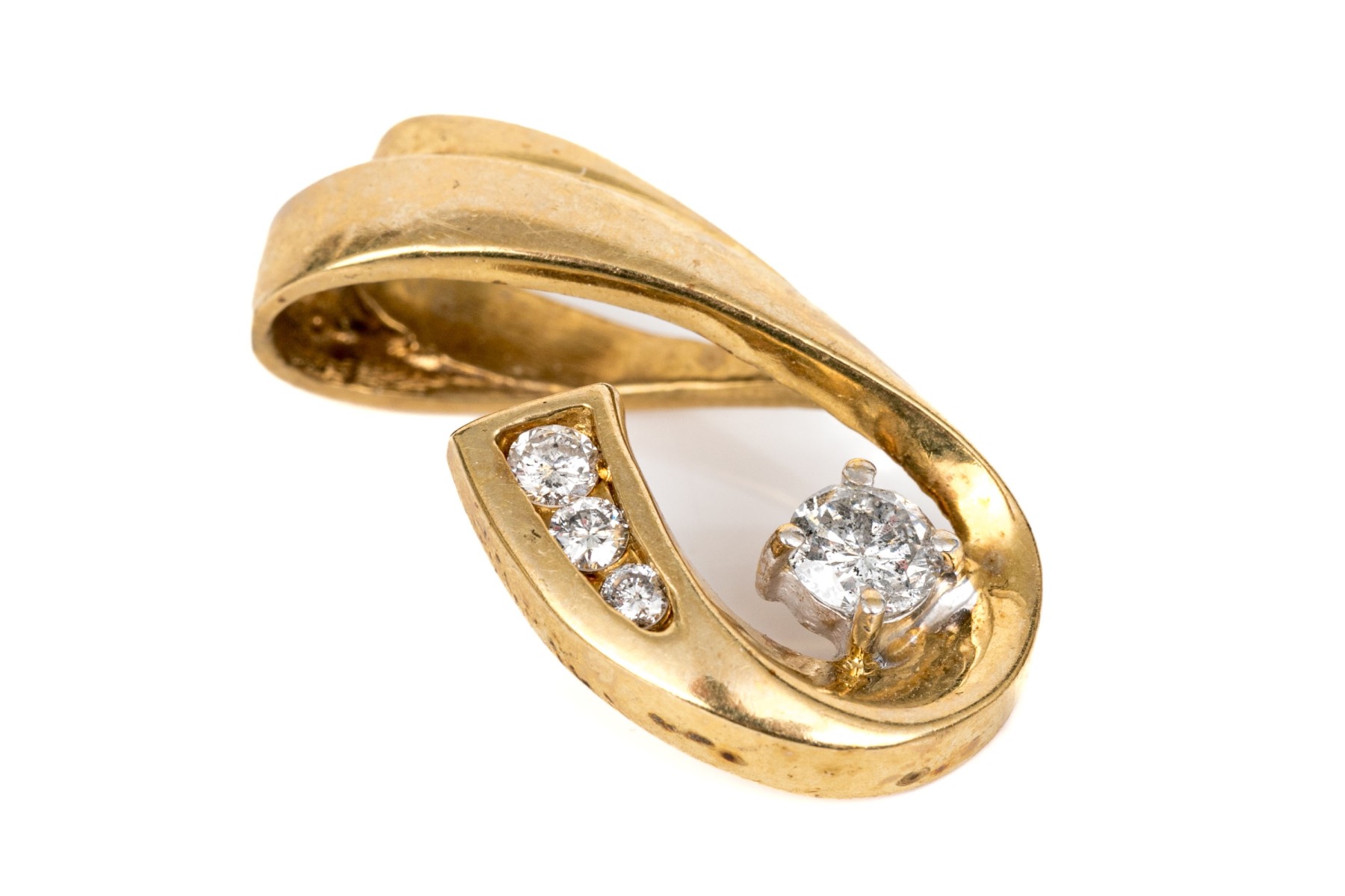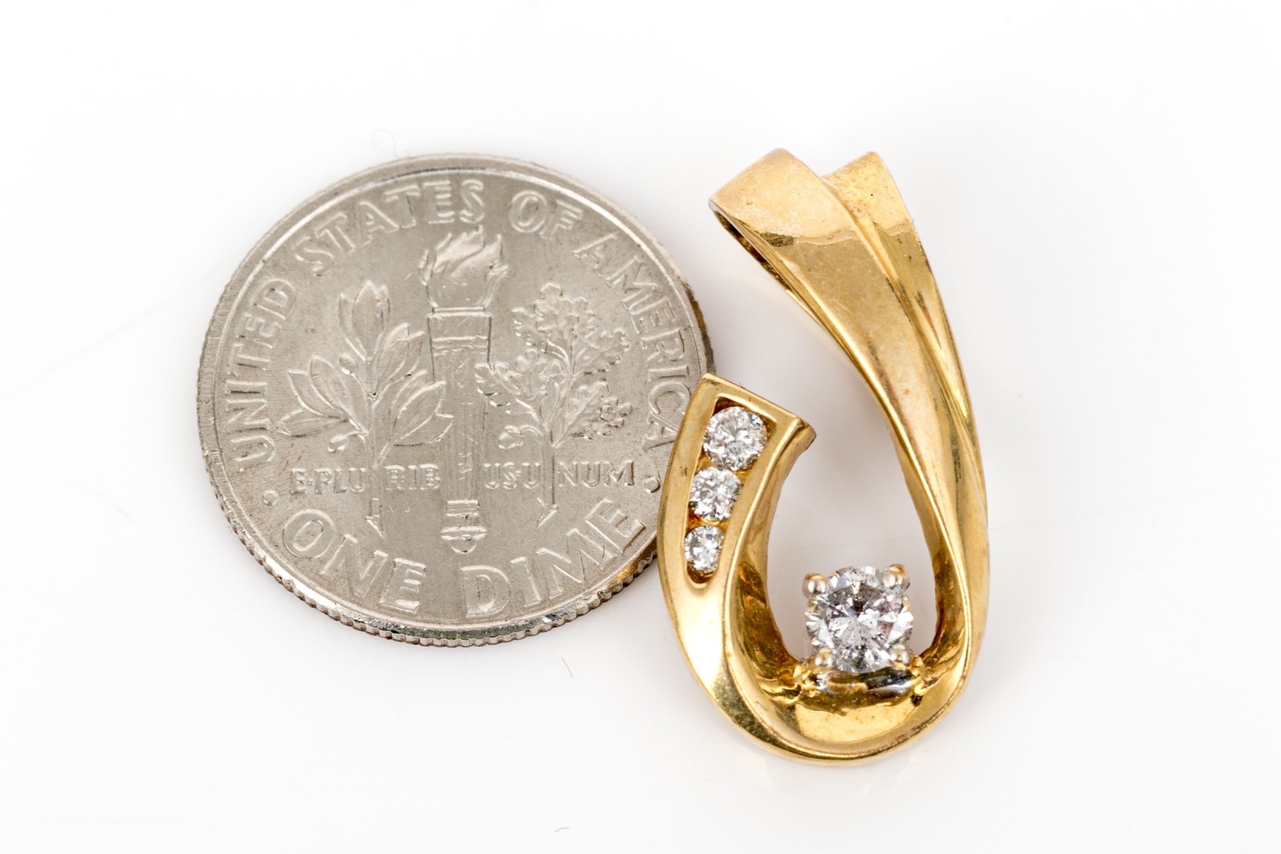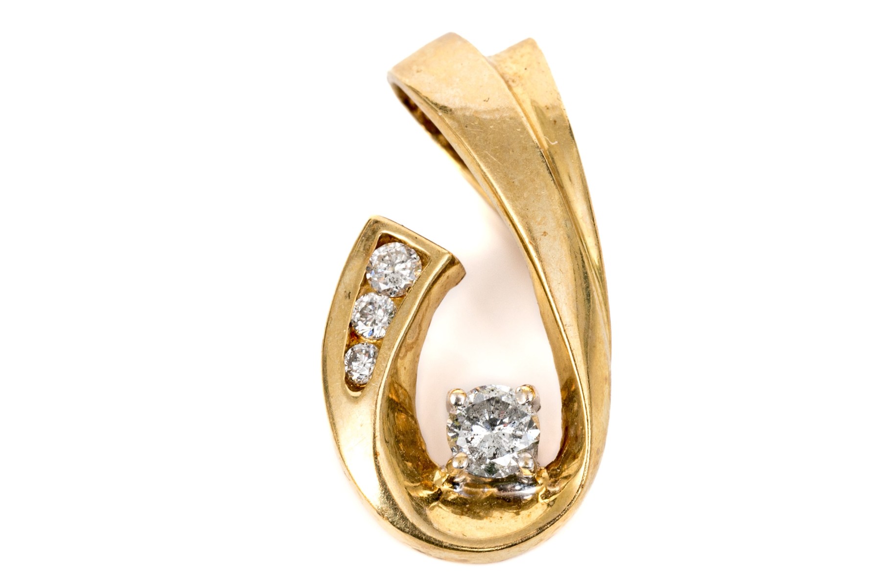 14k yellow gold striking contemporary diamond set swirl pendant, app. 0.19 TCW, prong and channel set and finished with an integral style bale. The diamonds are I1, J to K color