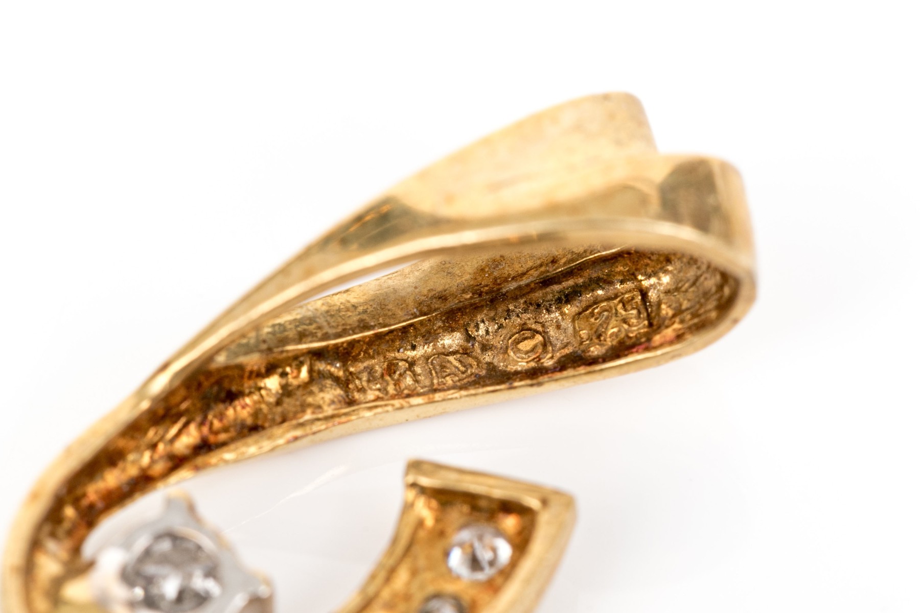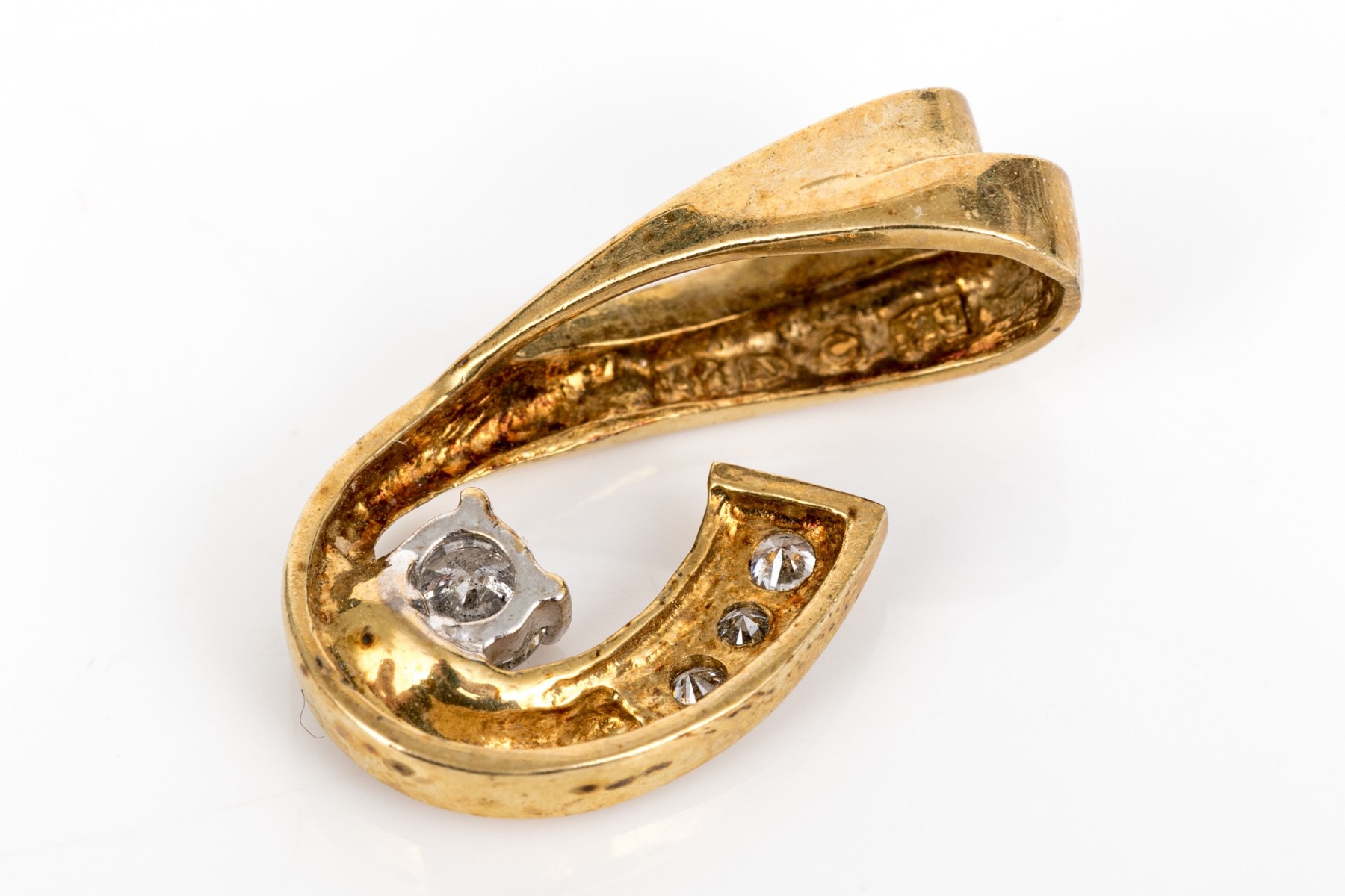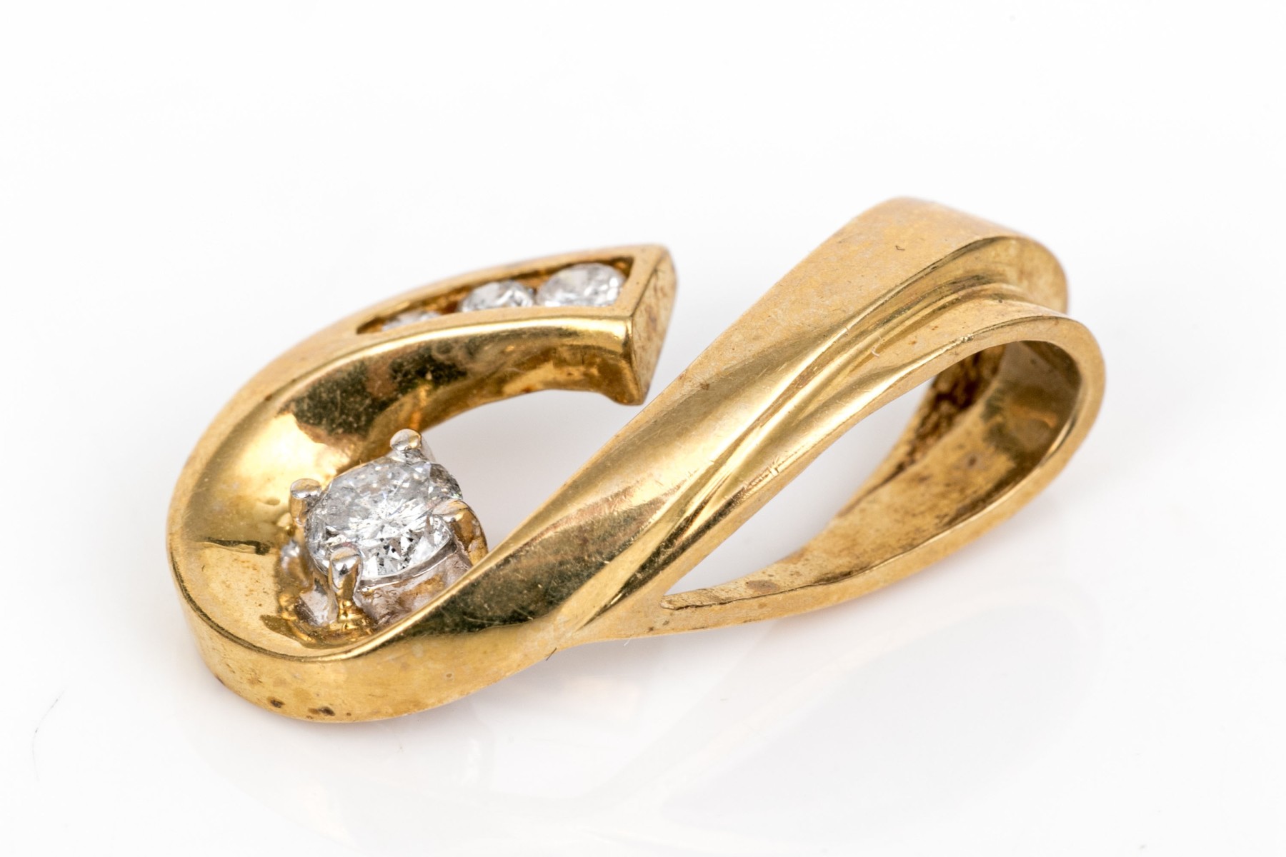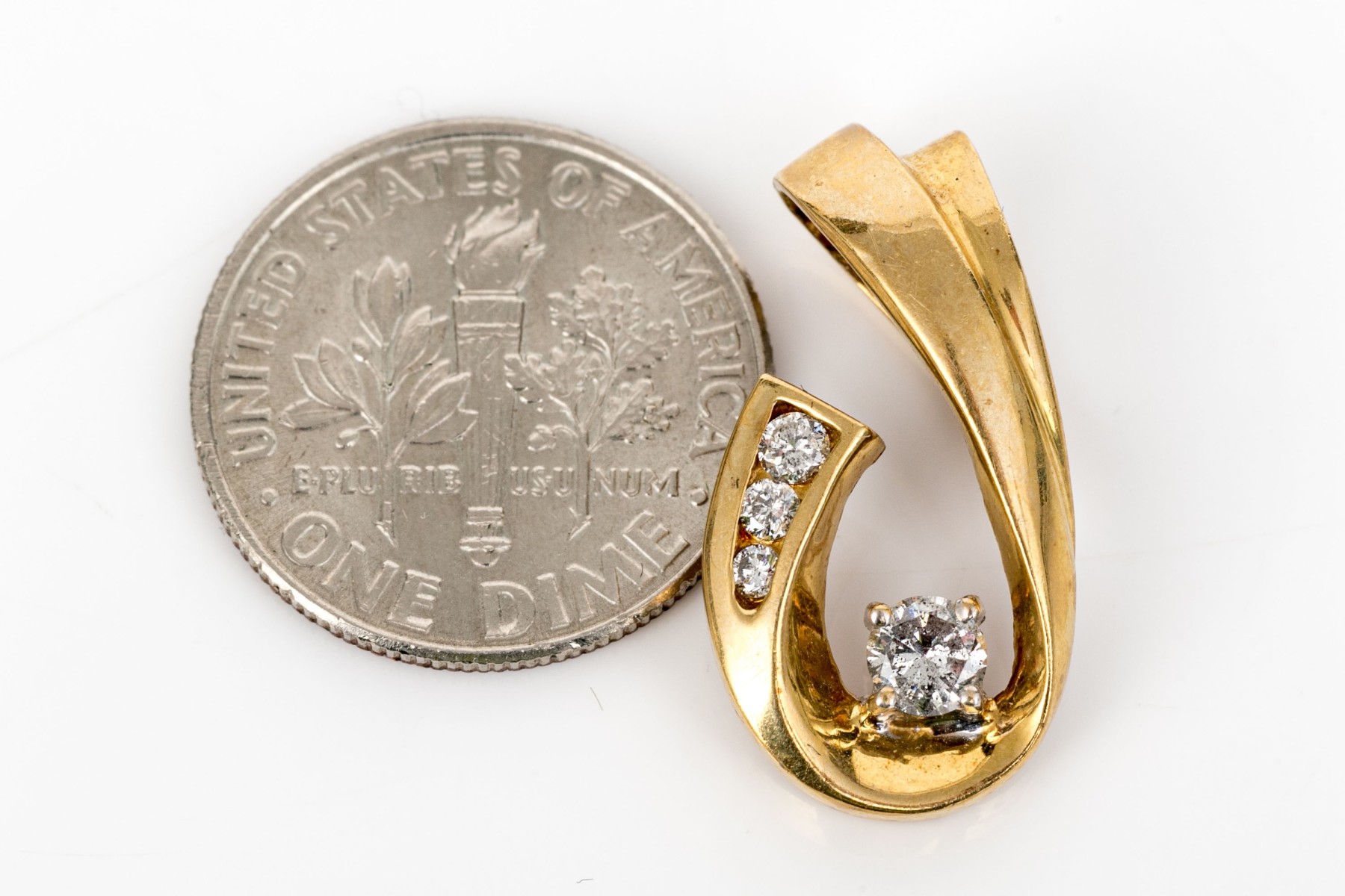 14k yellow gold striking contemporary diamond set swirl pendant, app. 0.19 TCW, prong and channel set and finished with an integral style bale. The diamonds are I1, J to K color
