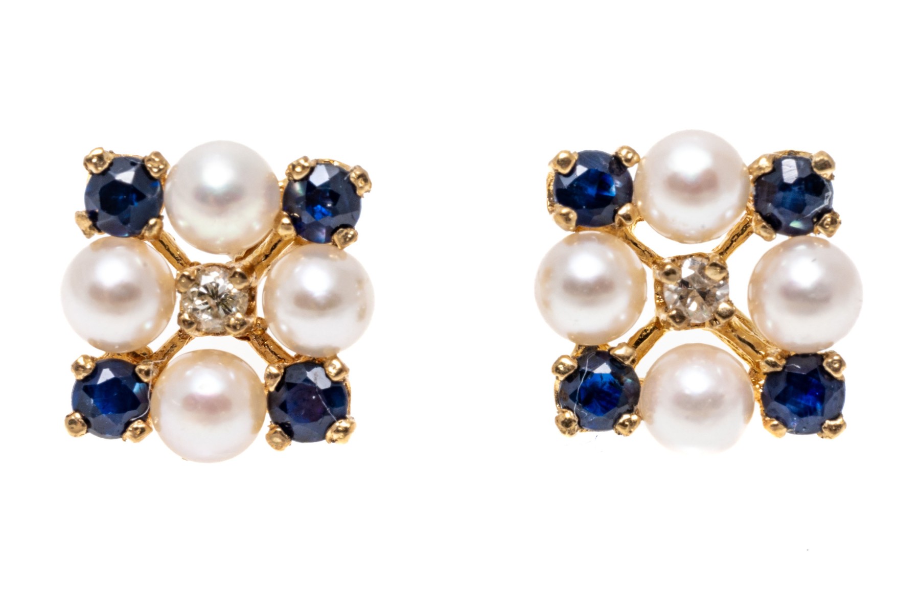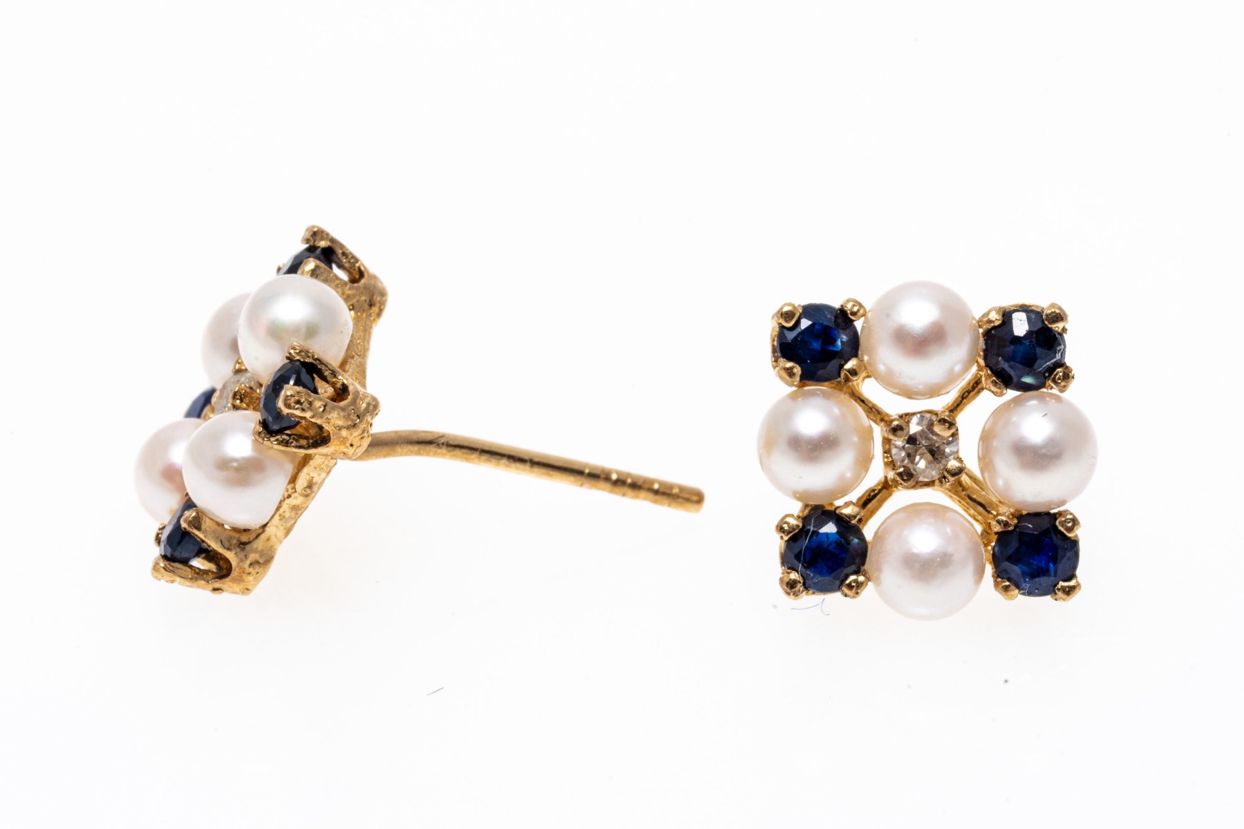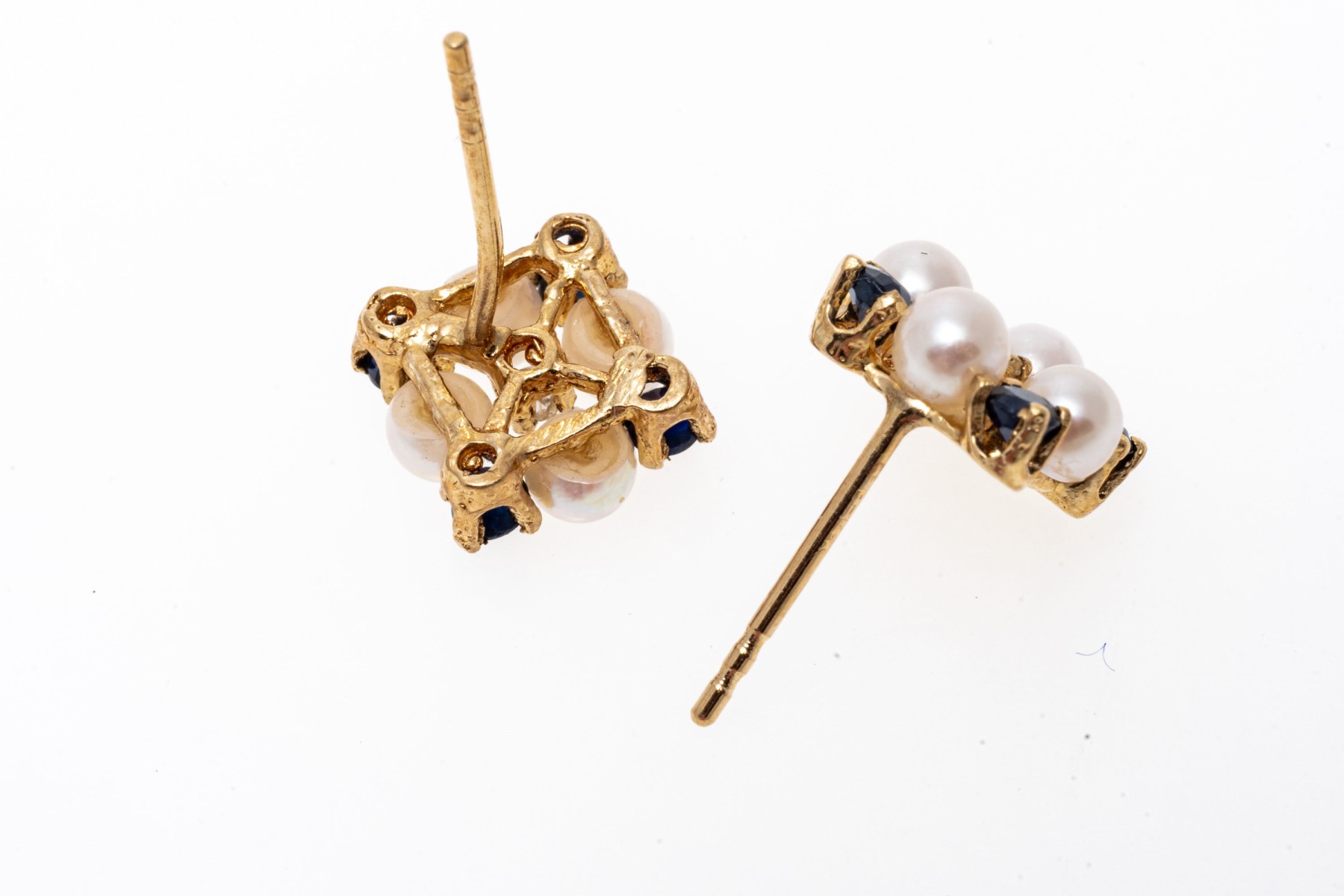 14k yellow gold striking cultured pearl blue sapphire and diamond cluster earrings, app. 0.24 TCW in sapphires; finished with posts and missing clutch backs