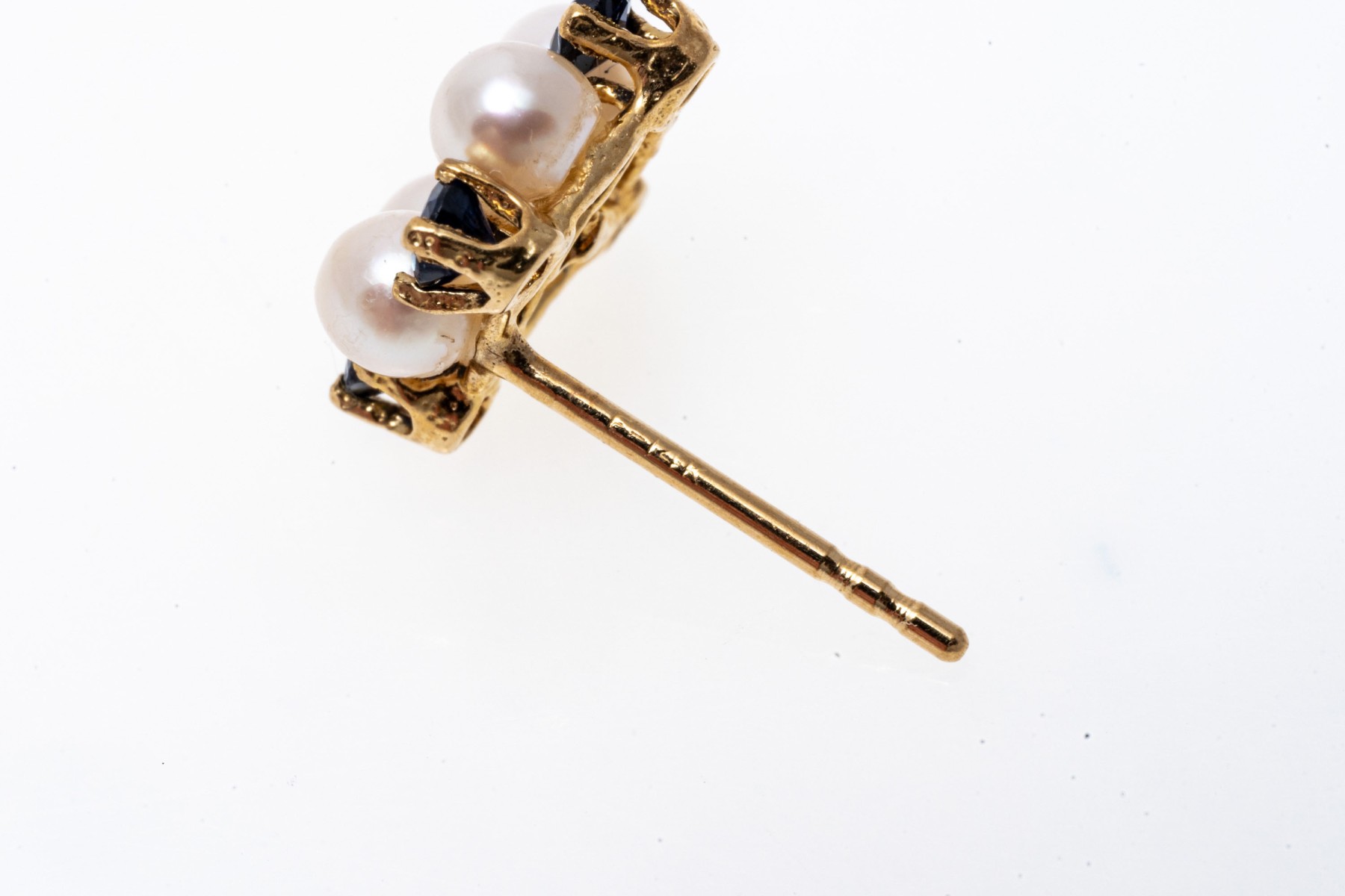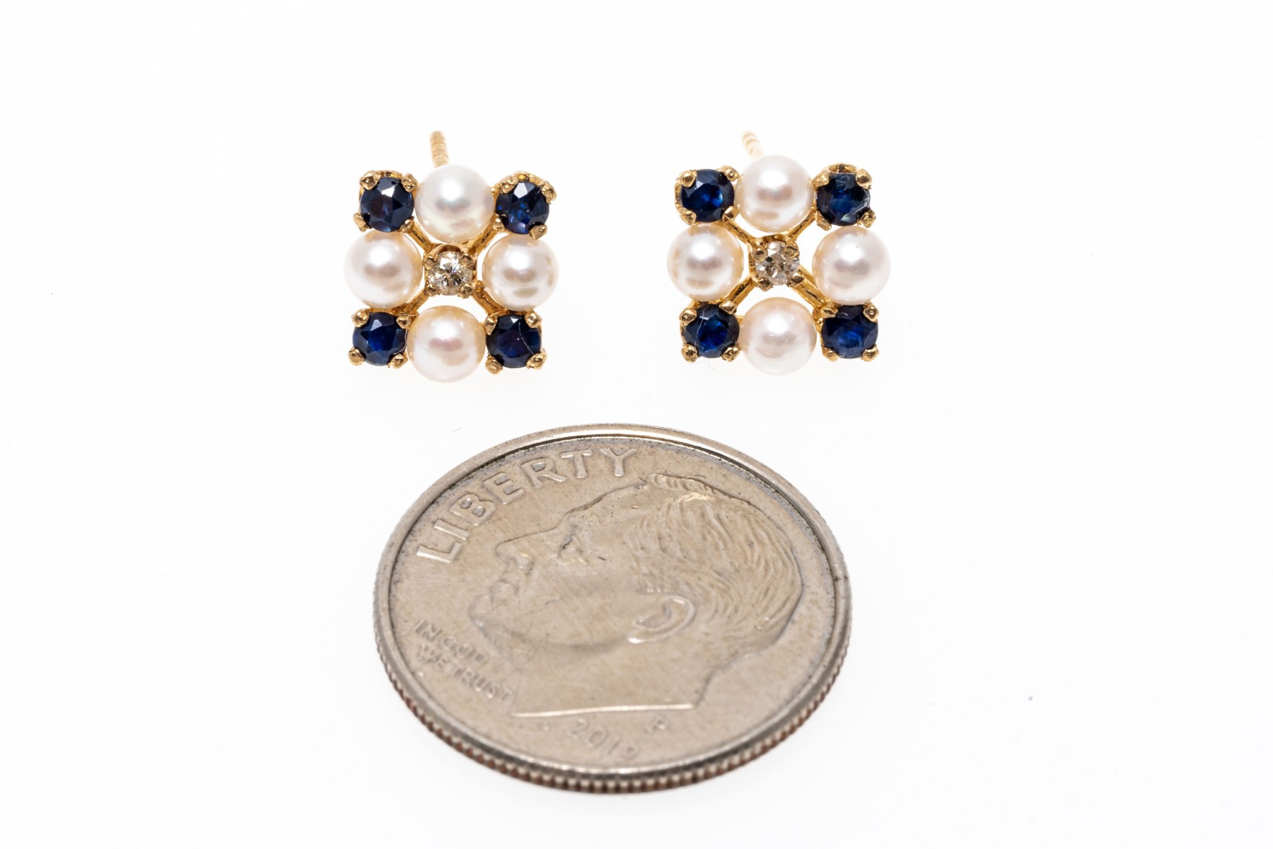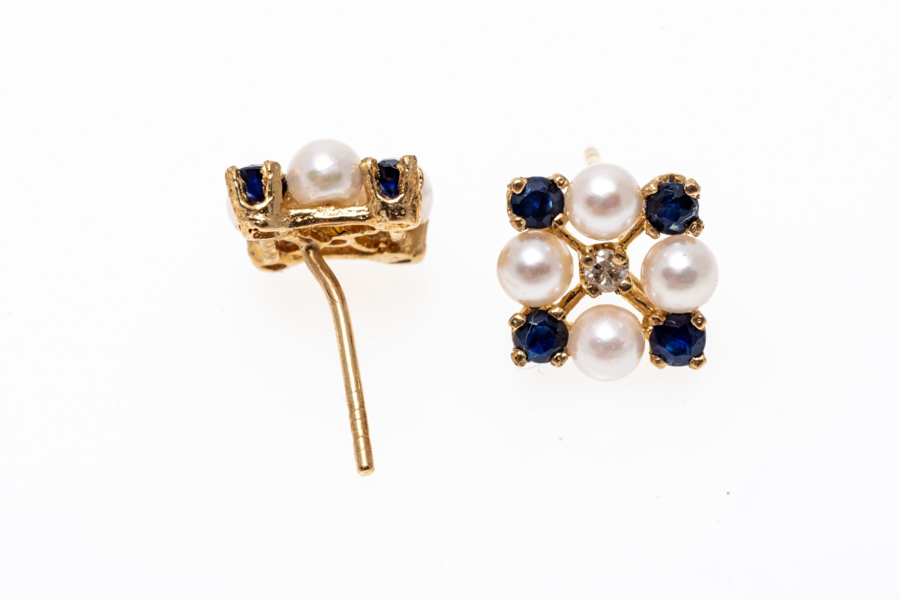 14k yellow gold striking cultured pearl blue sapphire and diamond cluster earrings, app. 0.24 TCW in sapphires; finished with posts and missing clutch backs