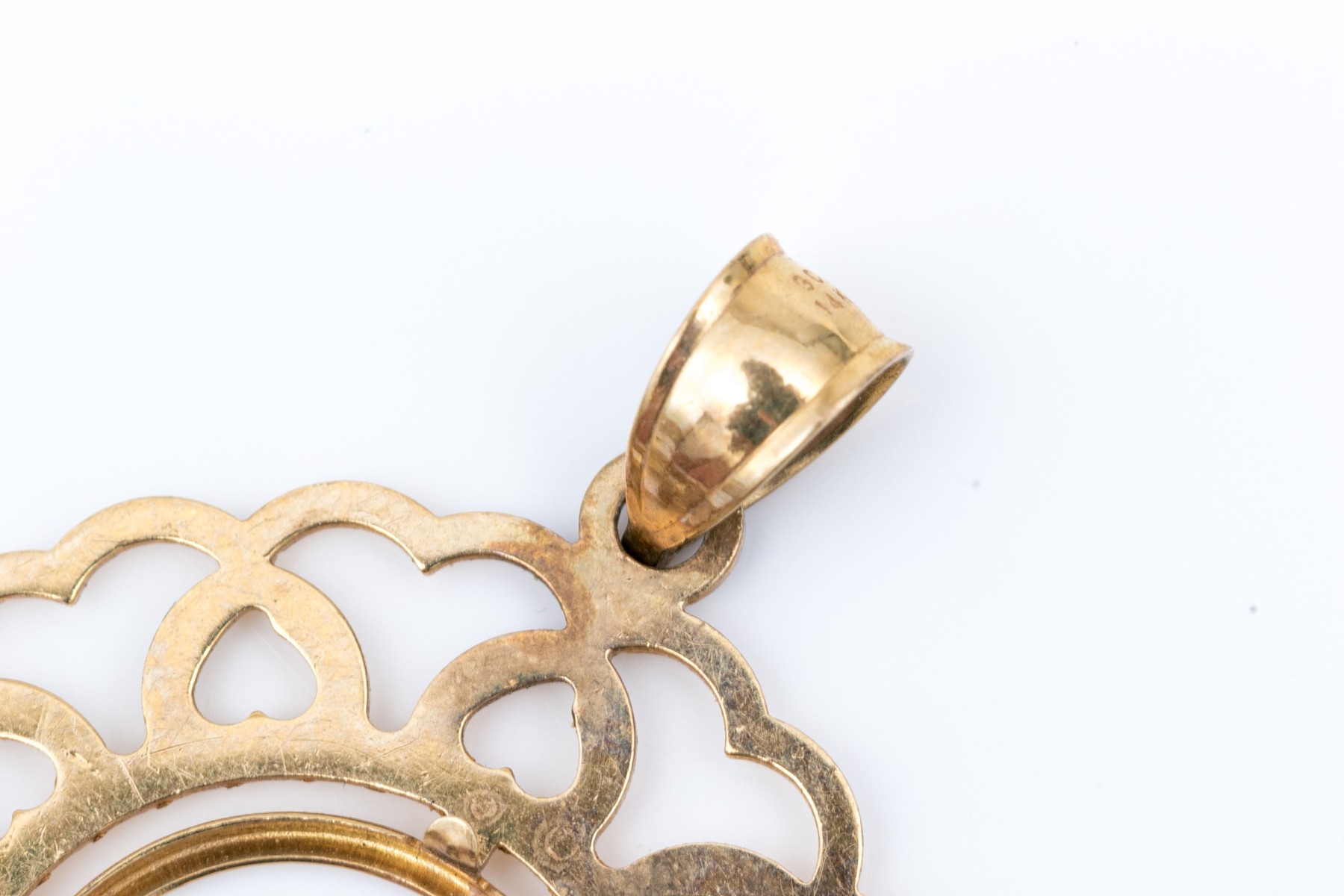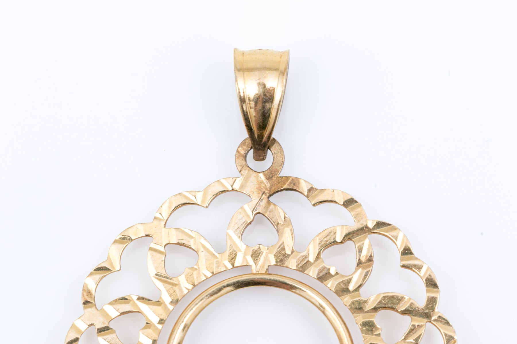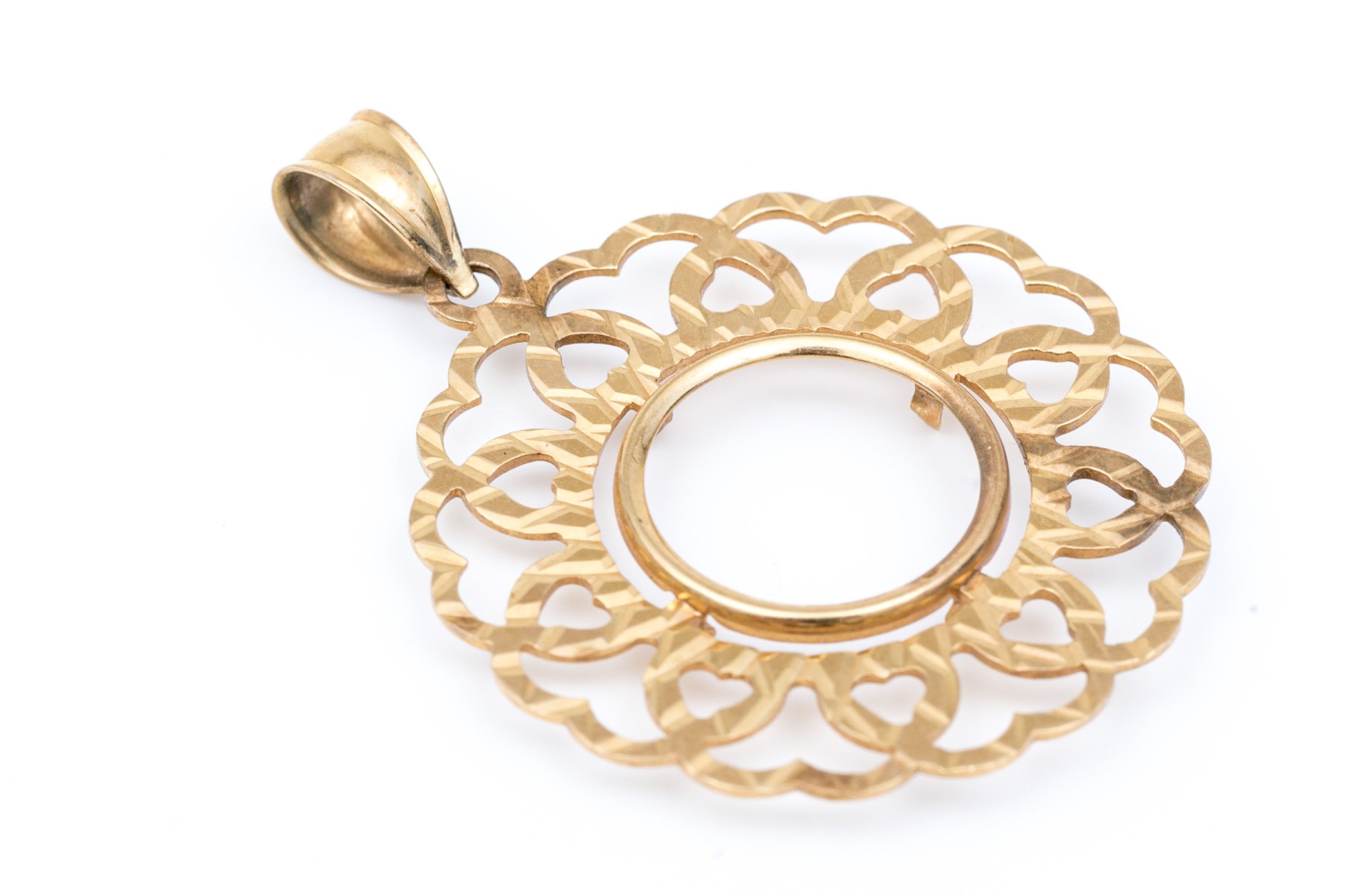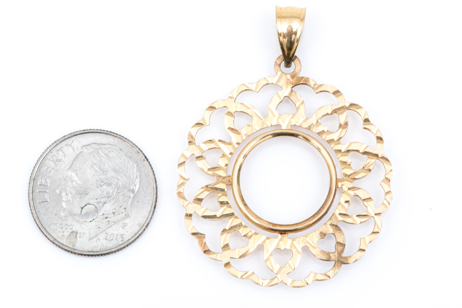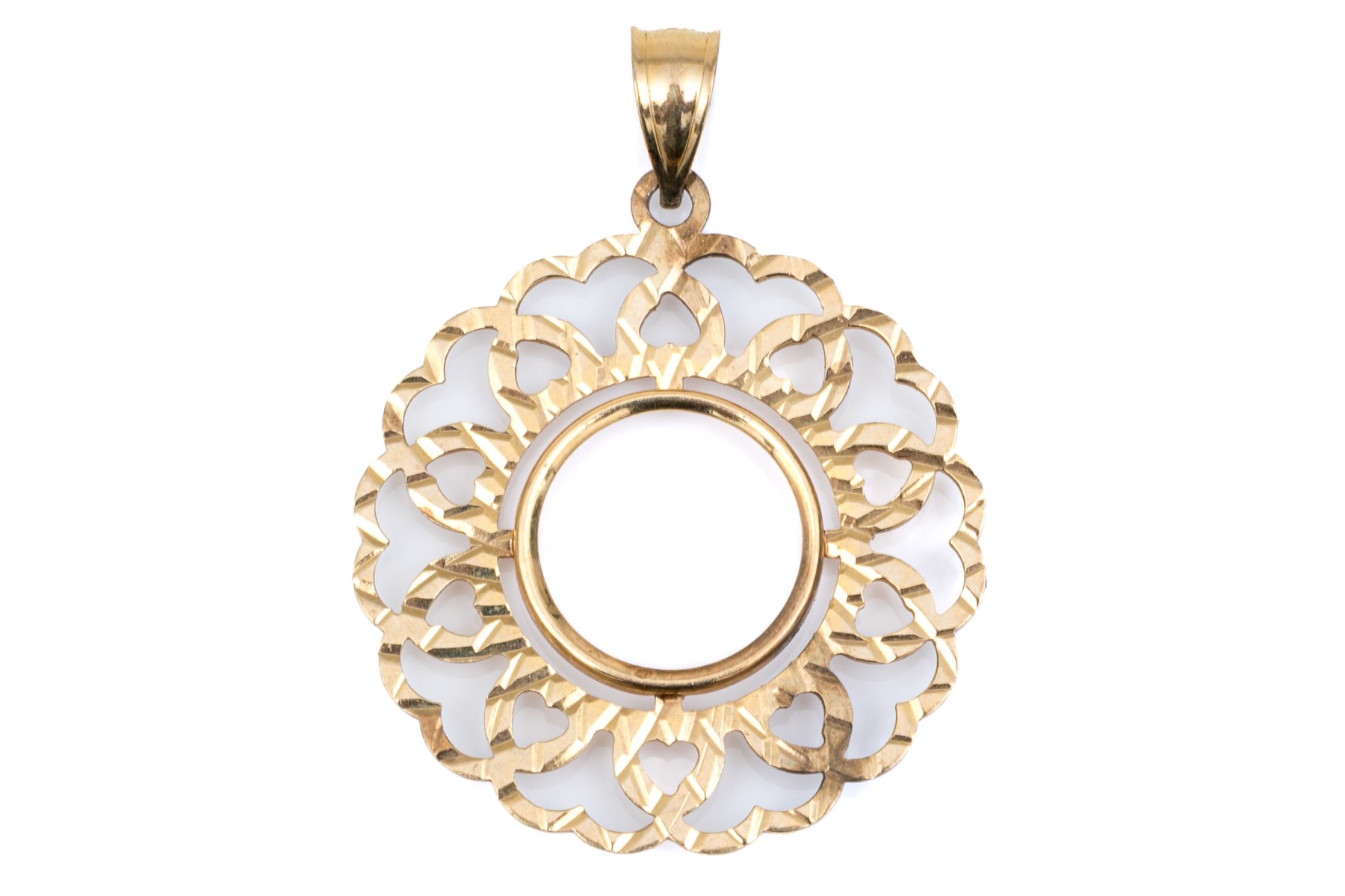 14k yellow gold striking diamond cut wide bezel coin holder (without coin), finished with a ribbed bale