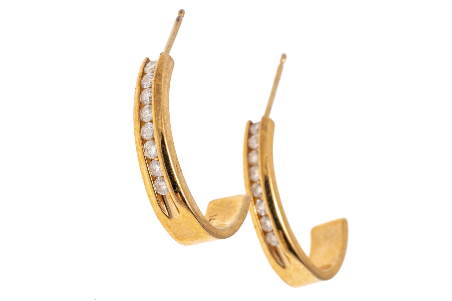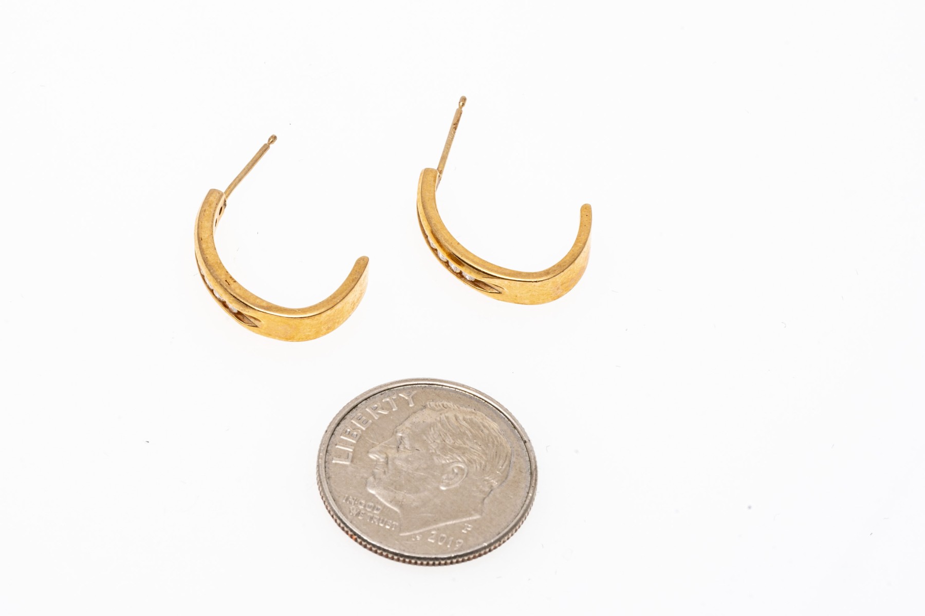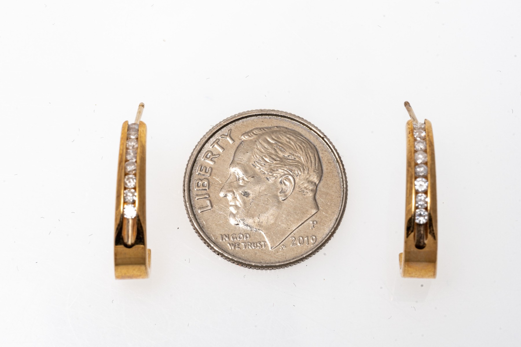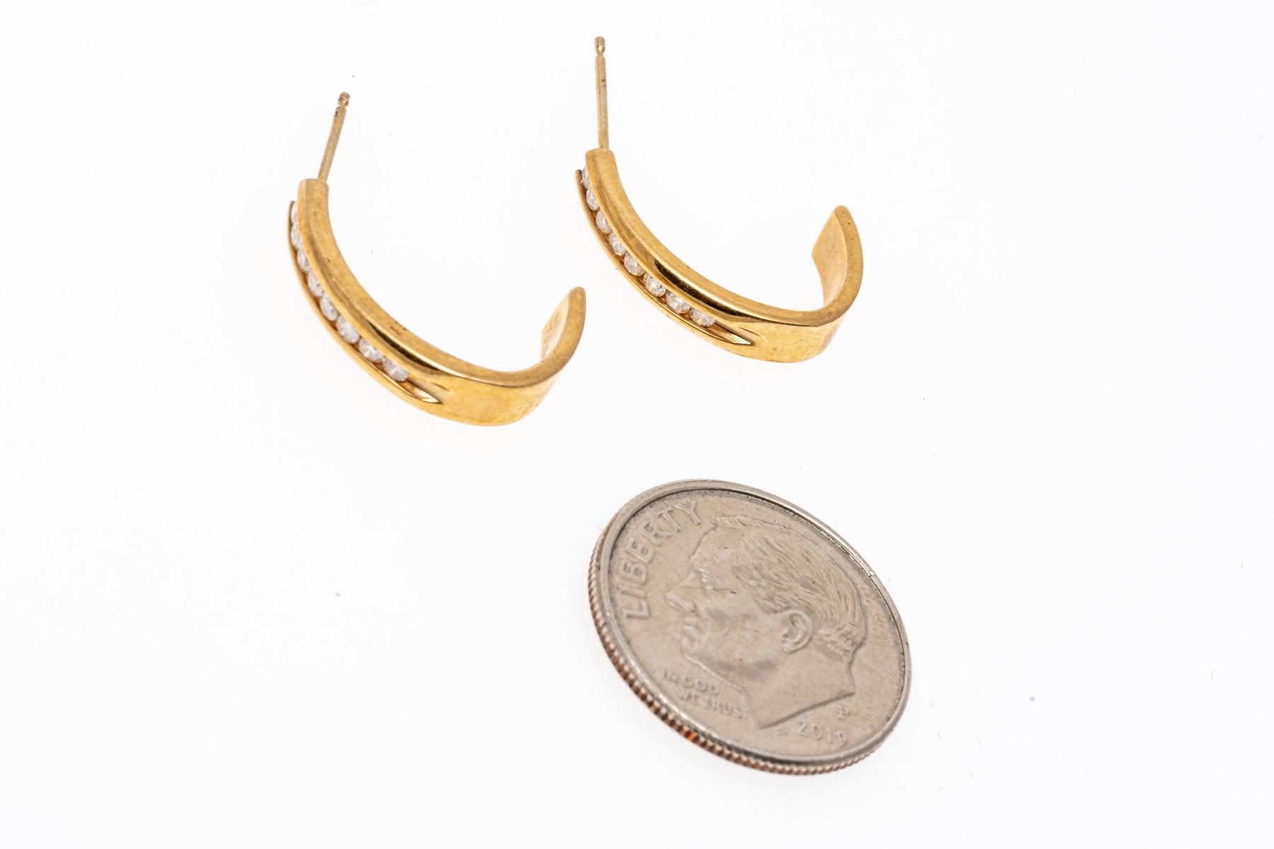 14k yellow gold striking round faceted diamond channel set hoop "j" hoop earrings, app. 0.16 TCW. The earrings have posts and missing clutch style backs