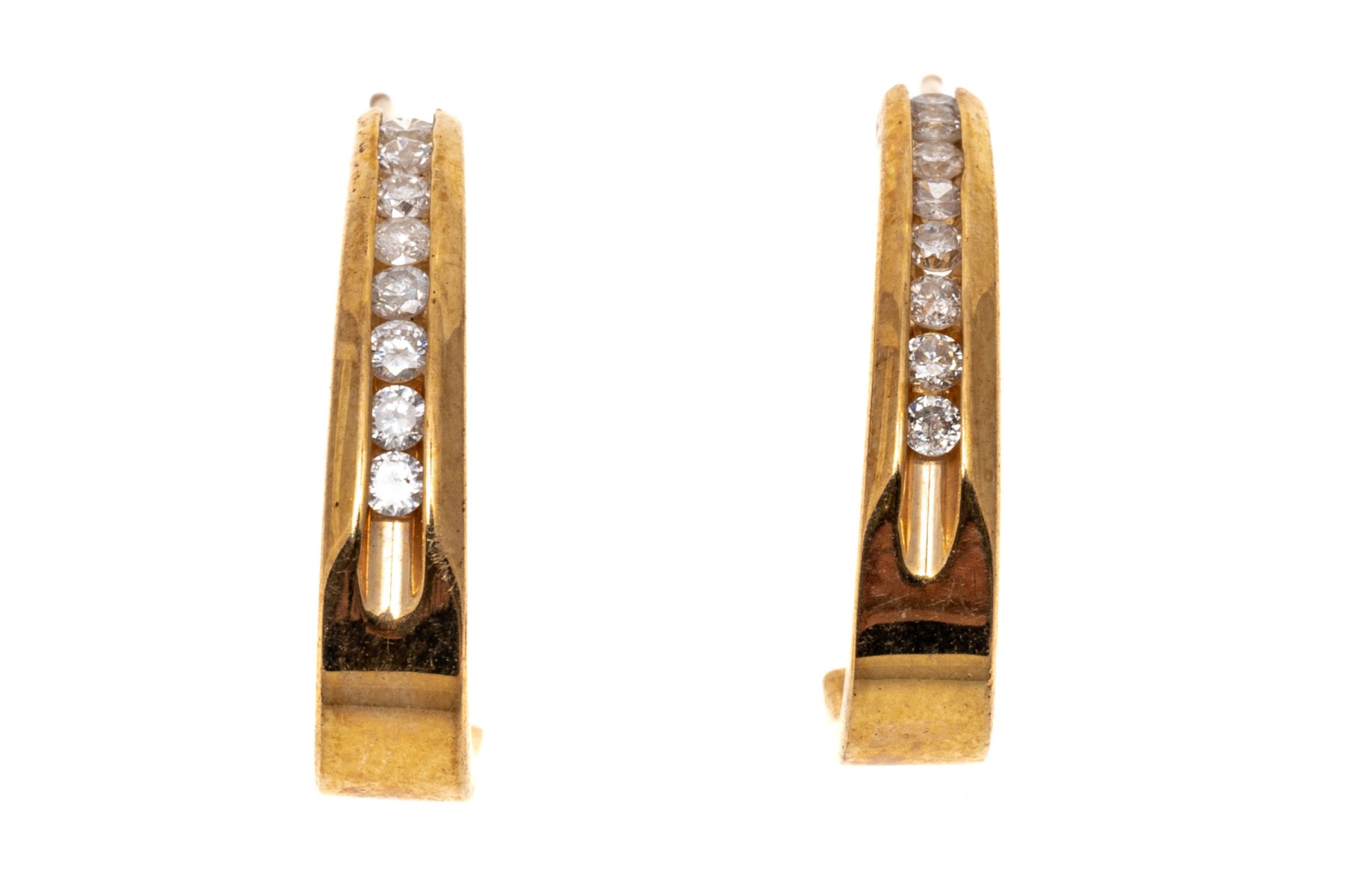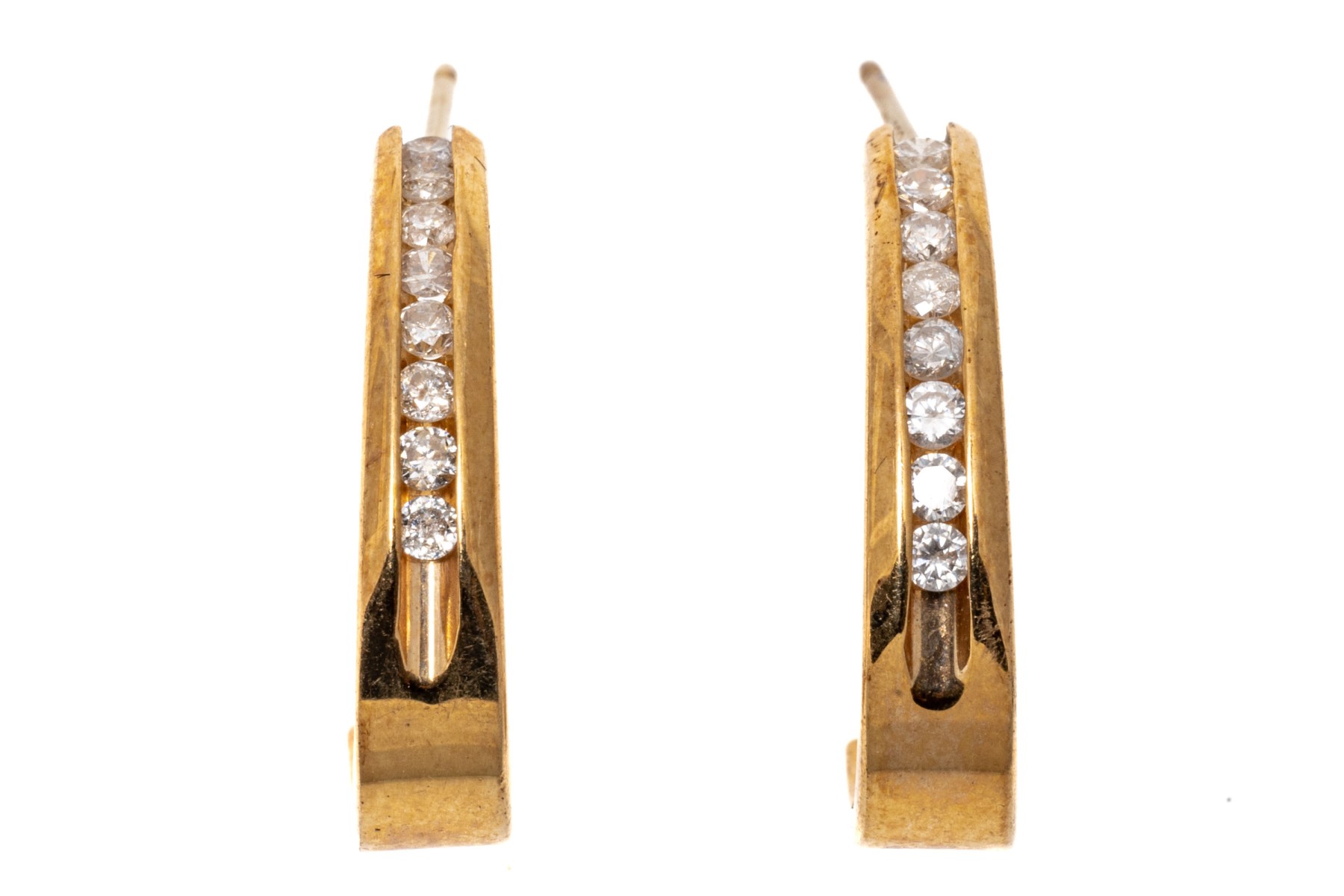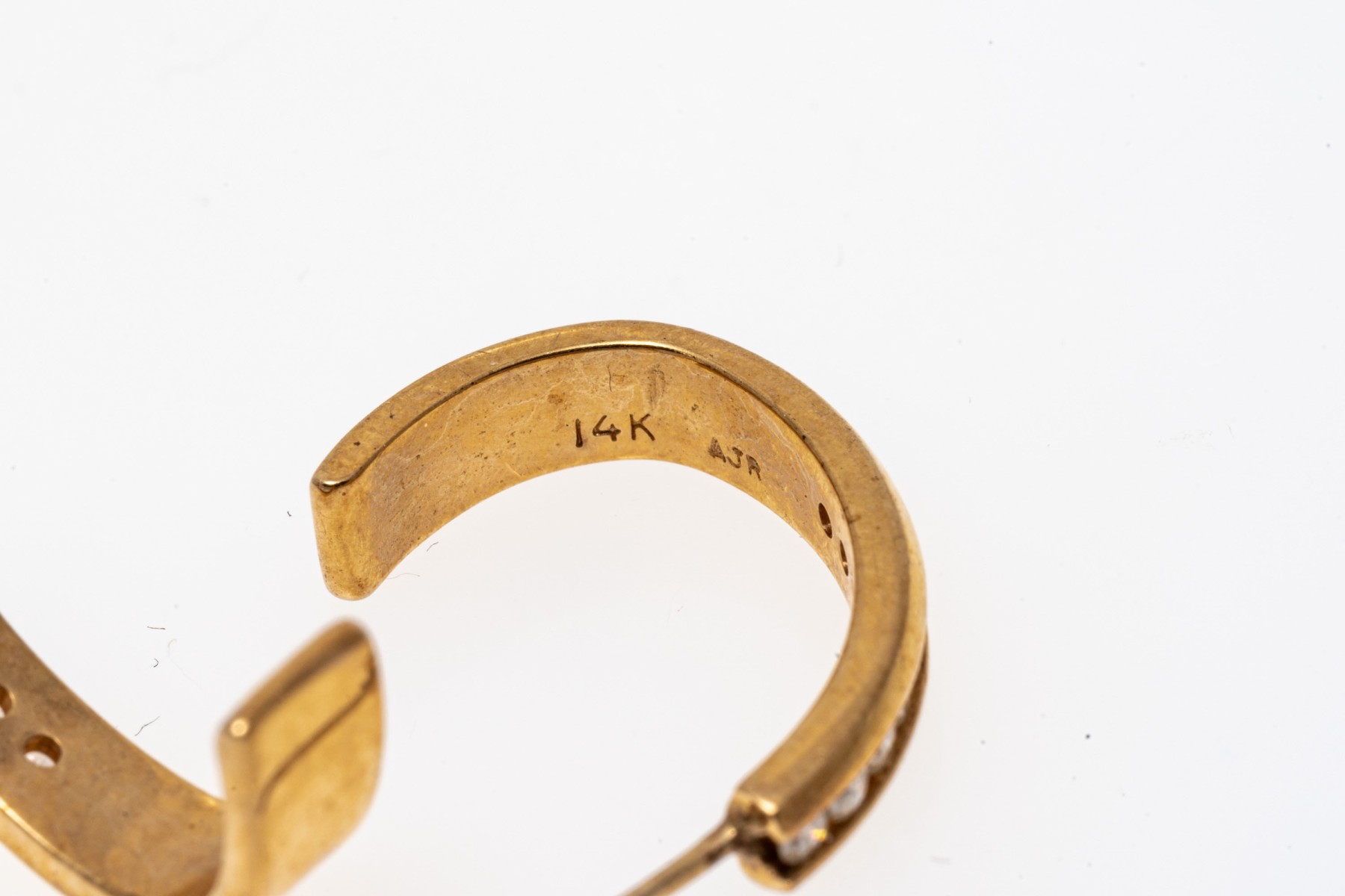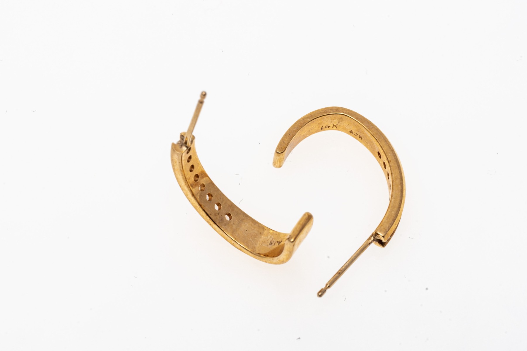 14k yellow gold striking round faceted diamond channel set hoop "j" hoop earrings, app. 0.16 TCW. The earrings have posts and missing clutch style backs