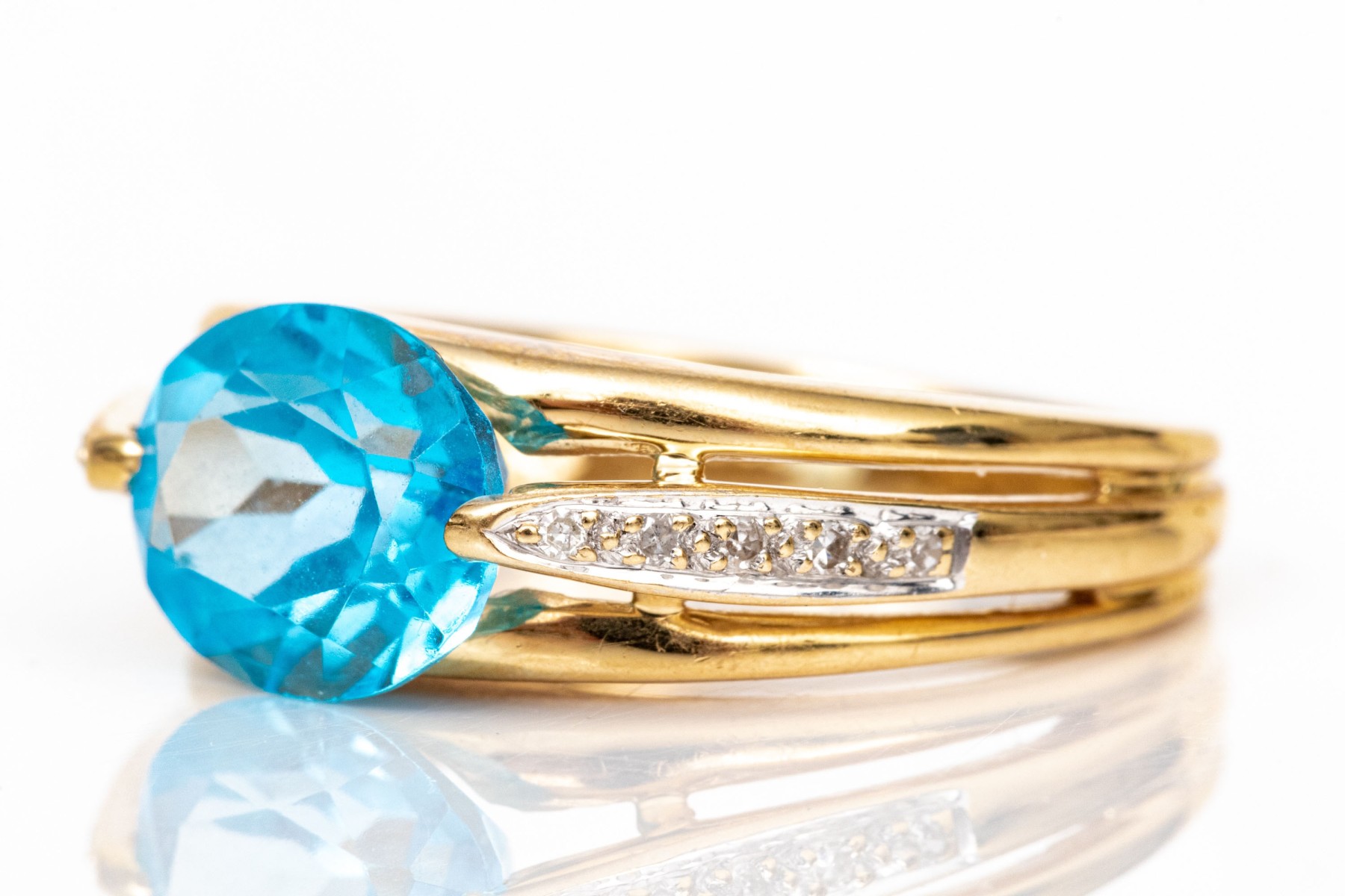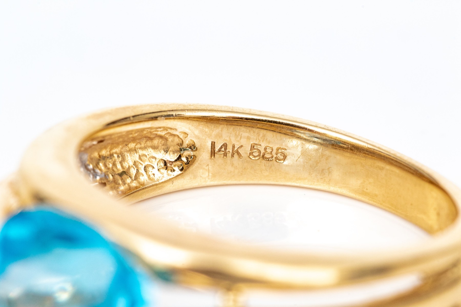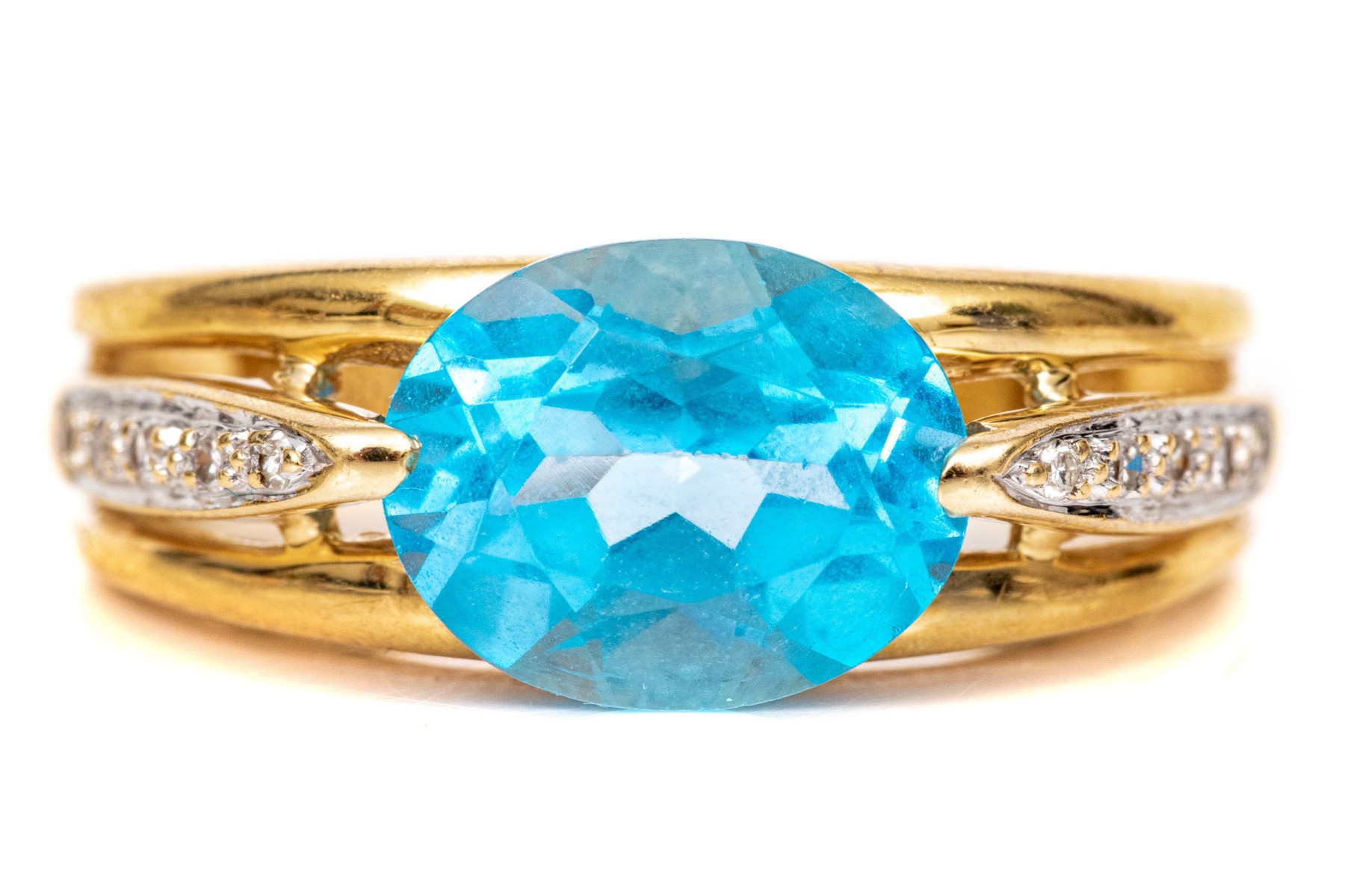14k yellow gold striking east/west set blue topaz and diamond ring, size 6.75. The blue topaz is oval faceted, app. 3.05 CTS, and round faceted diamonds, app. 0.02 TCW, I1 to I2 clarity, J to K color