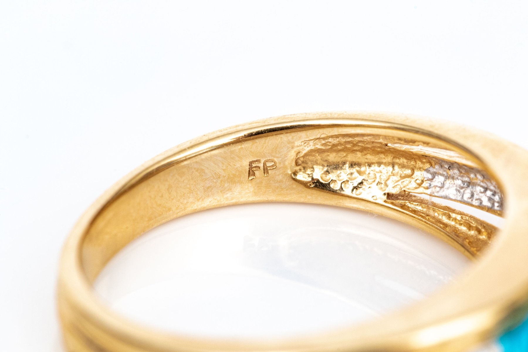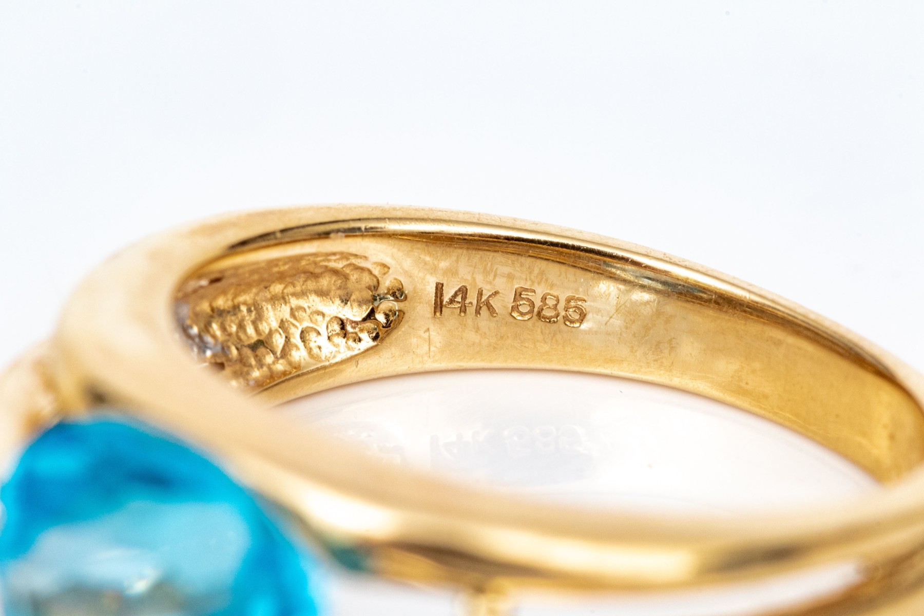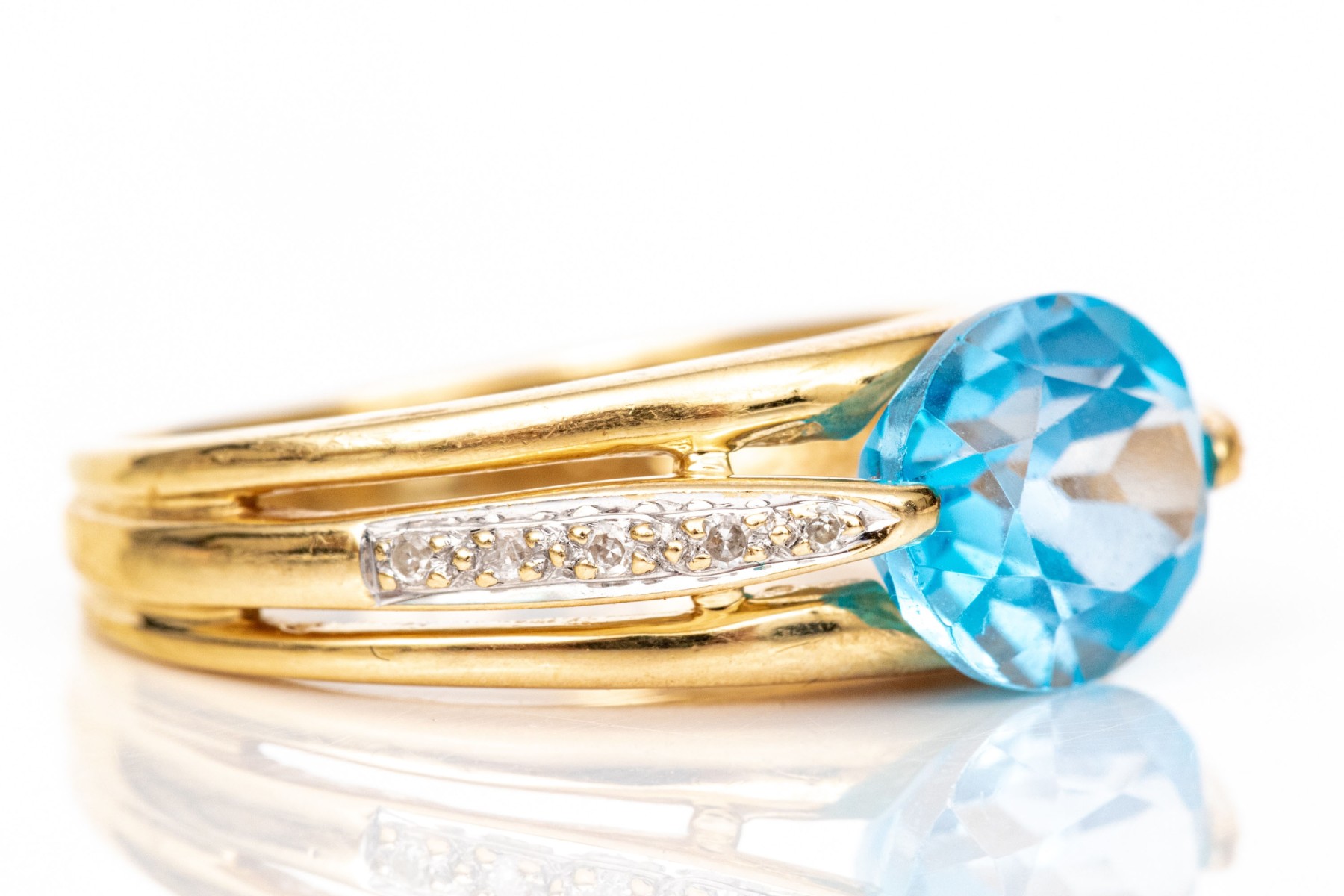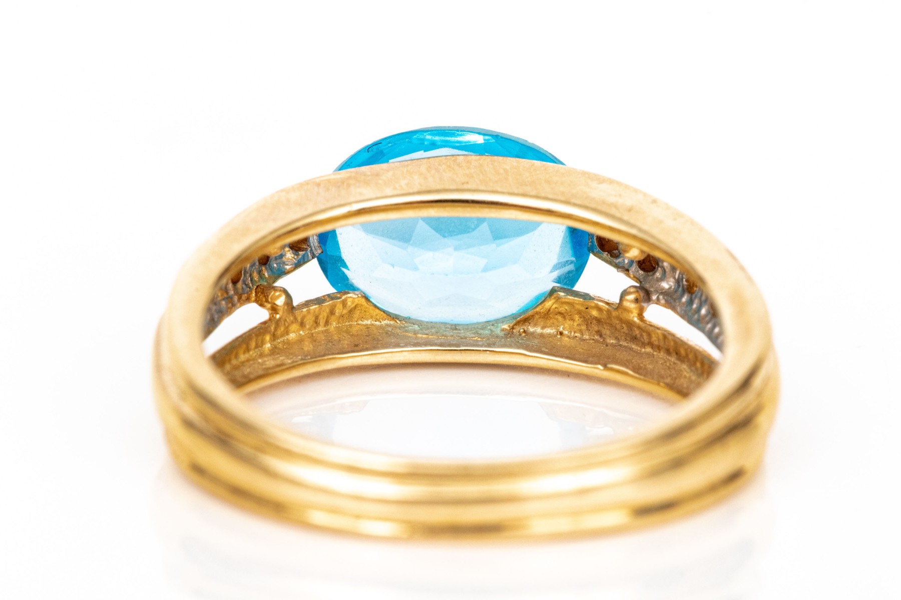 14k yellow gold striking east/west set blue topaz and diamond ring, size 6.75. The blue topaz is oval faceted, app. 3.05 CTS, and round faceted diamonds, app. 0.02 TCW, I1 to I2 clarity, J to K color