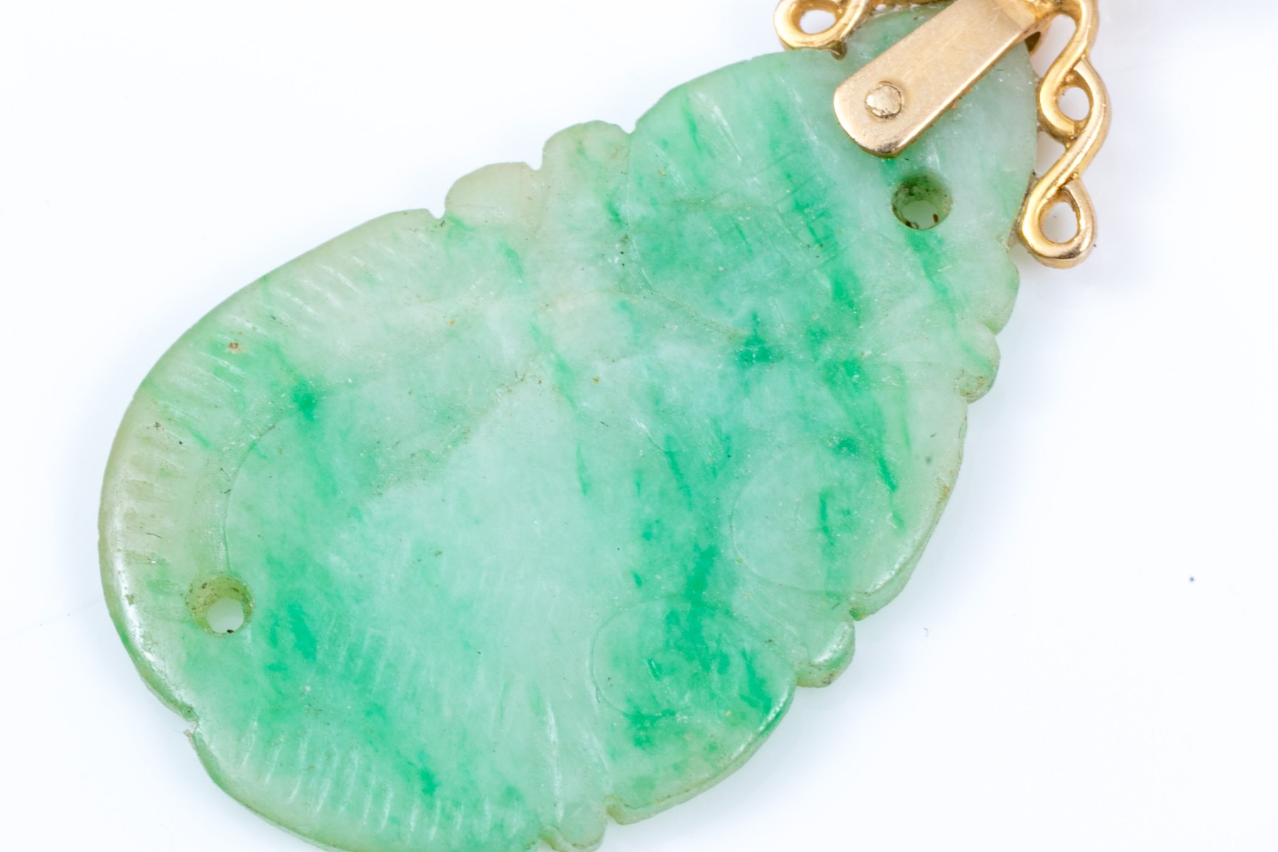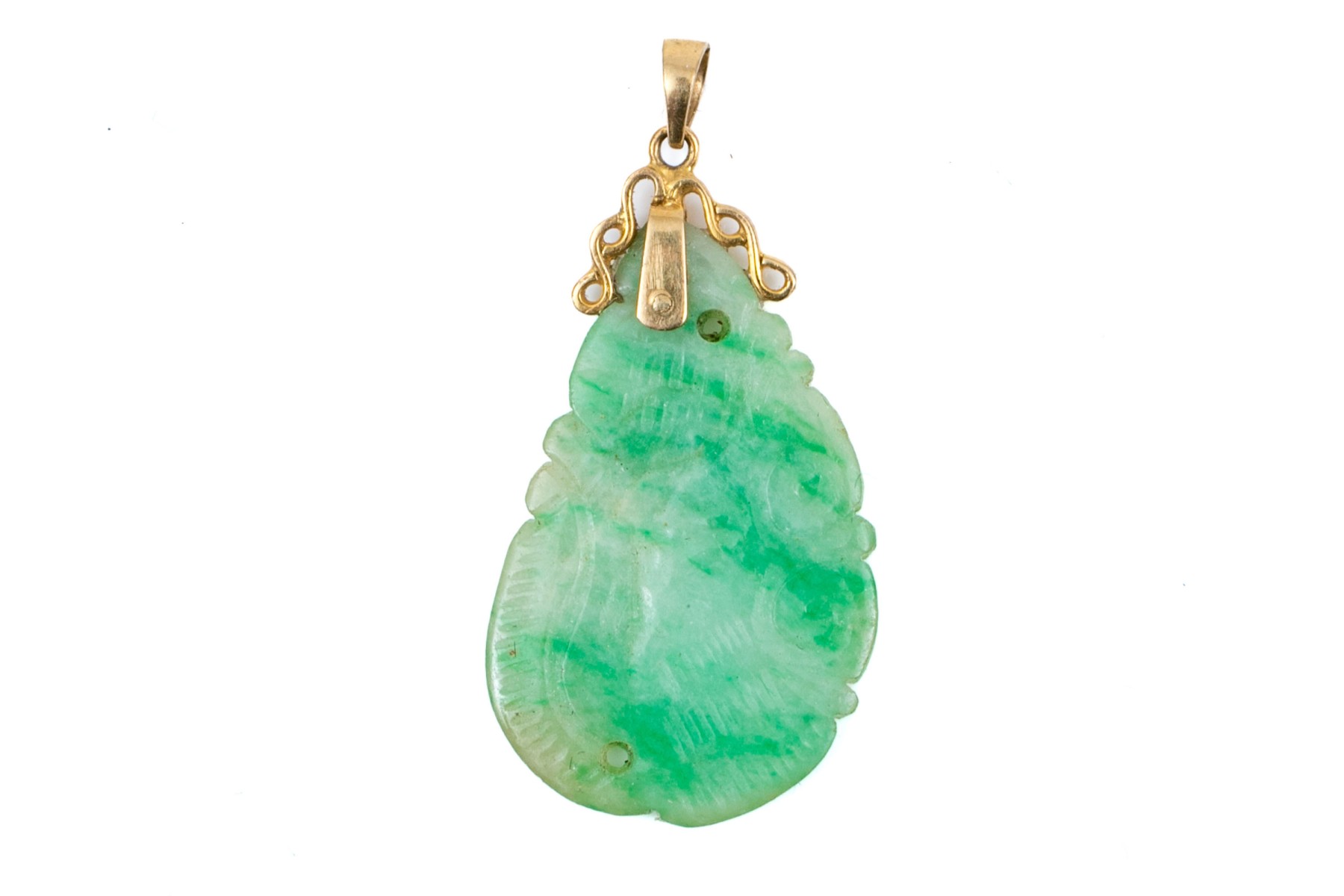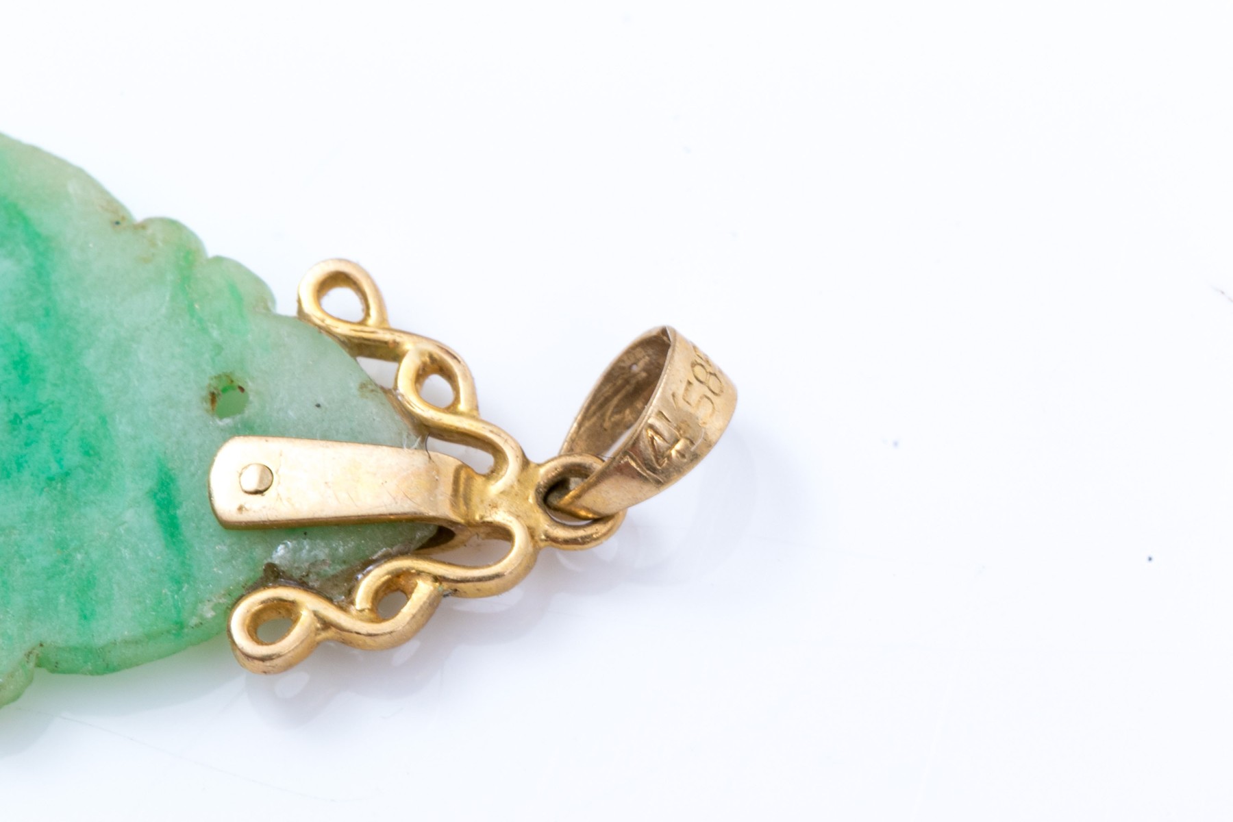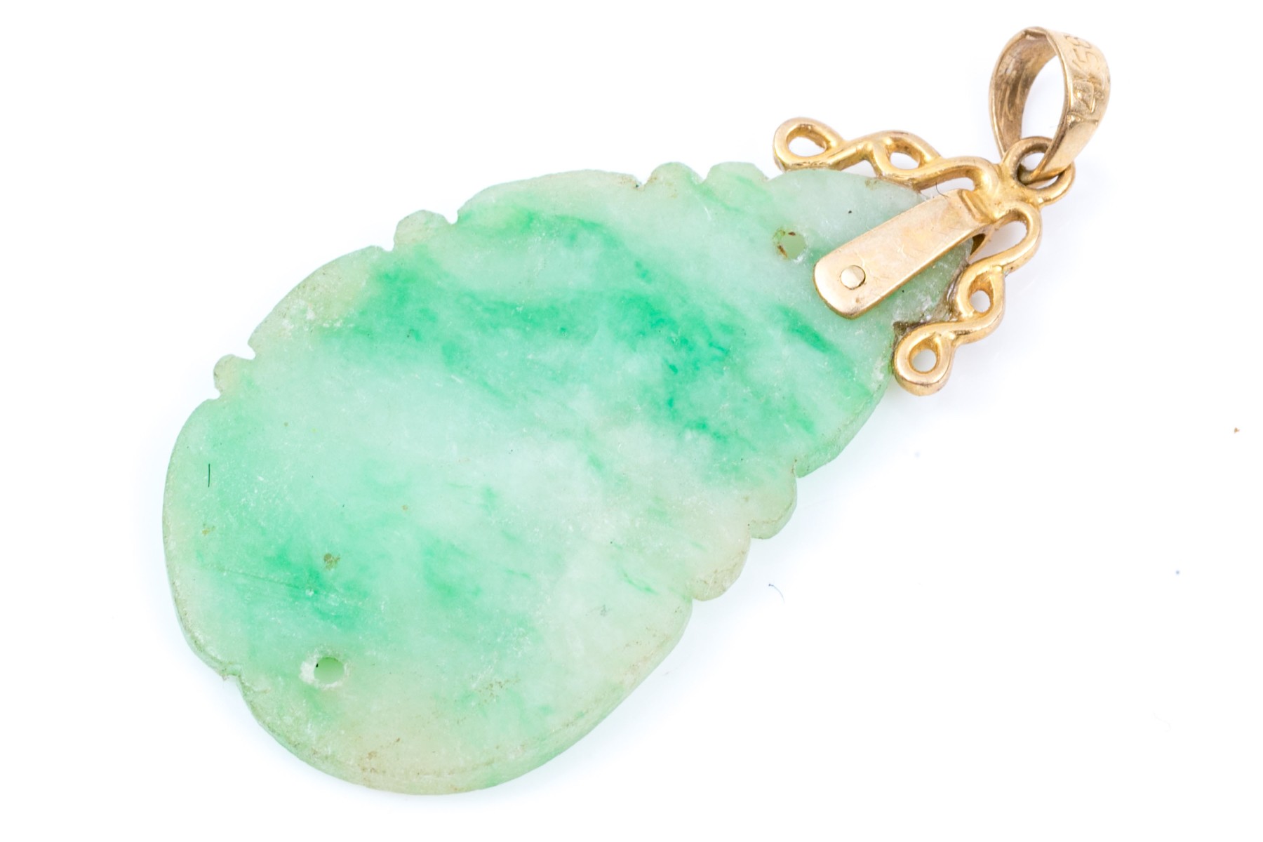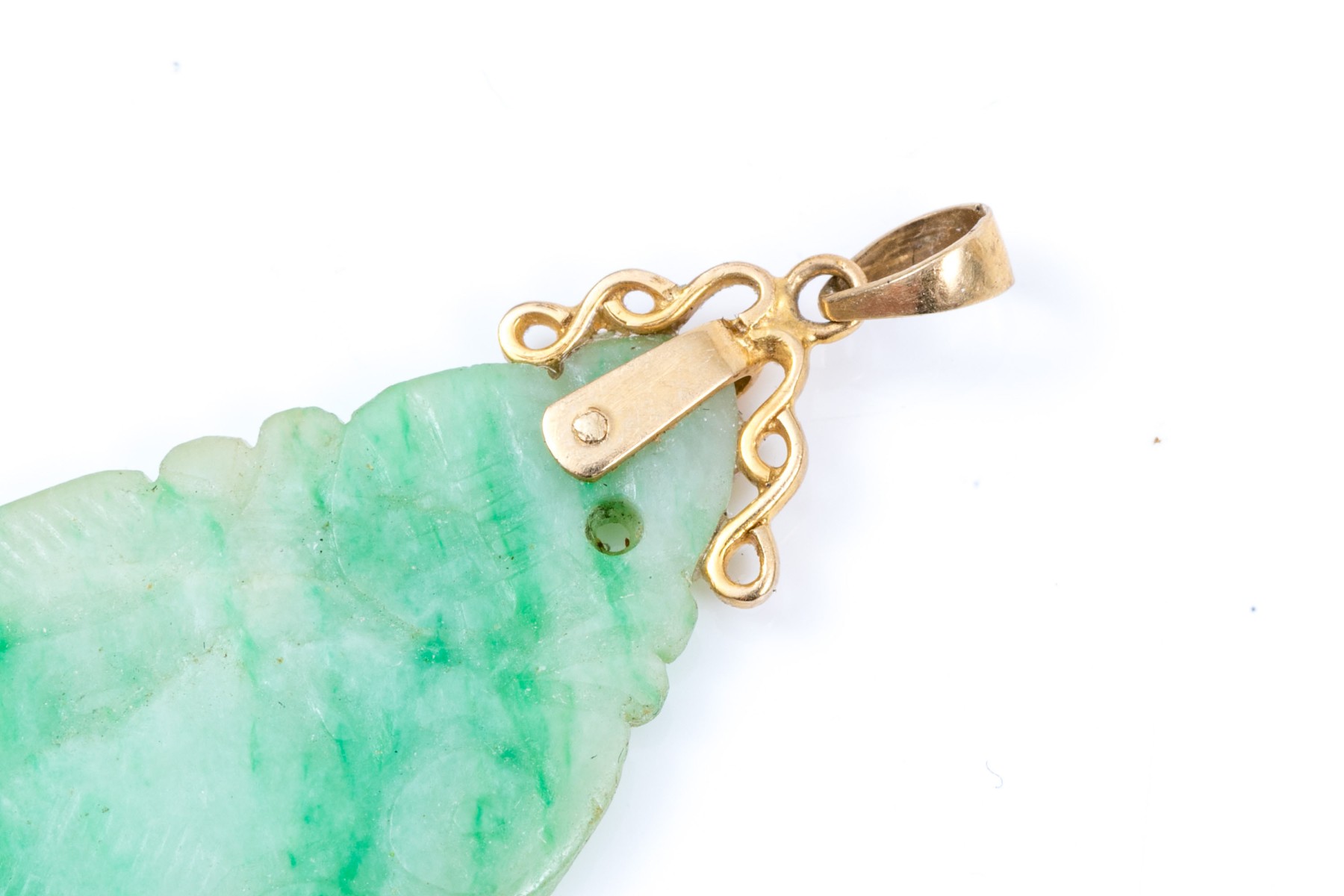 14k yellow gold striking green and white nephrite jade pendant, finished with a solid style bale