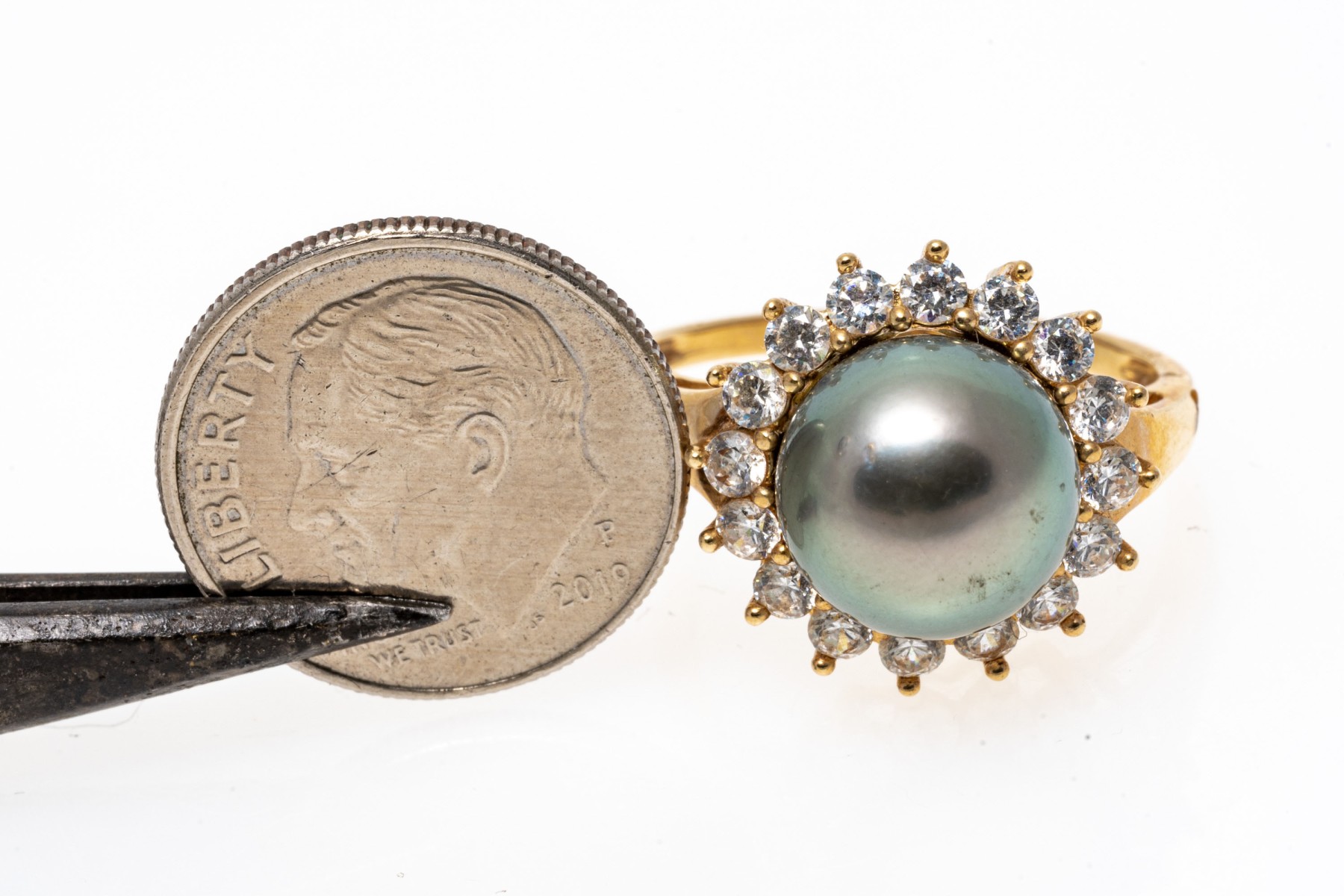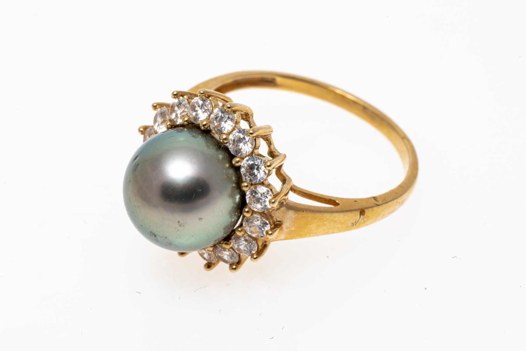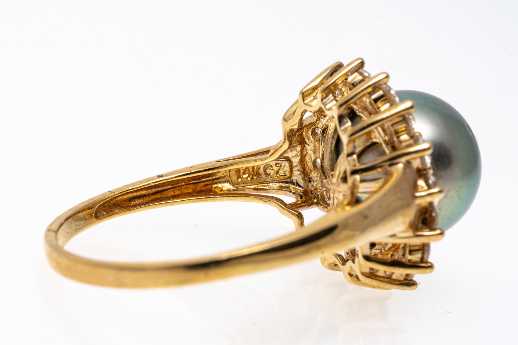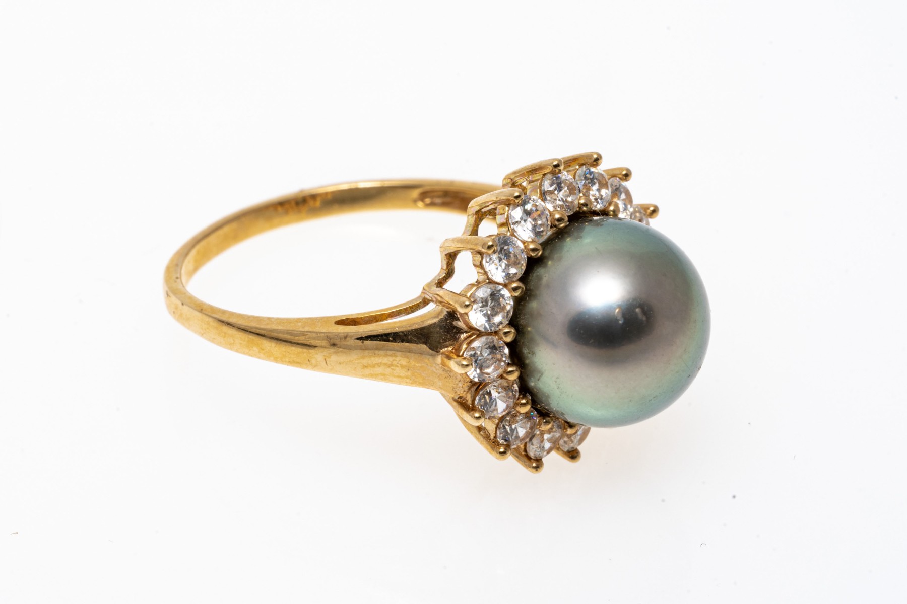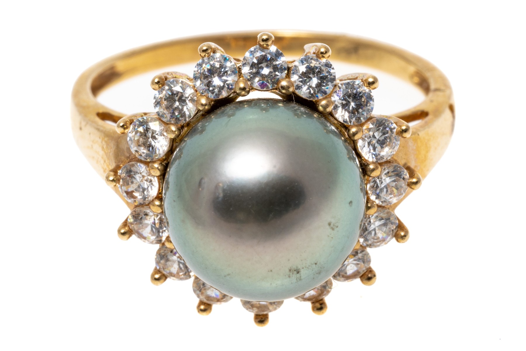 14k yellow gold striking grey cultured freshwater pearl and CZ halo ring