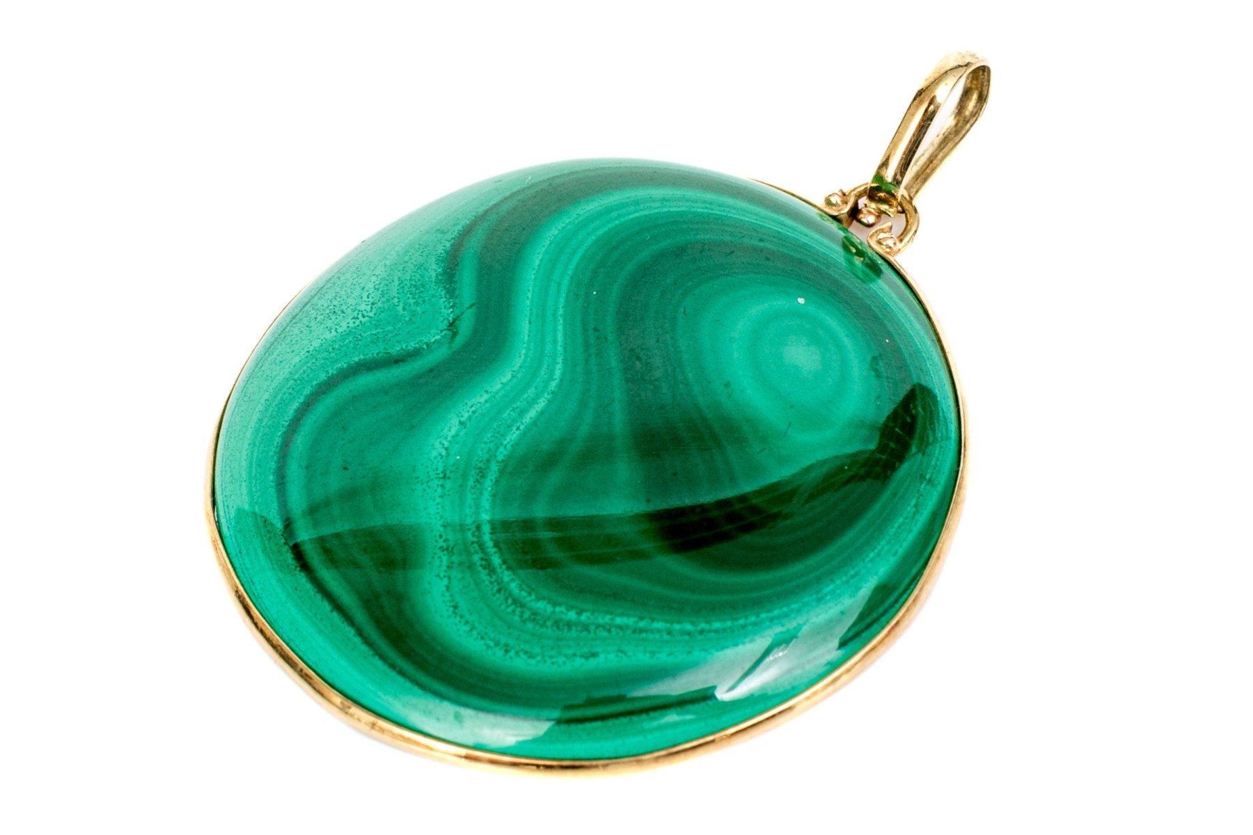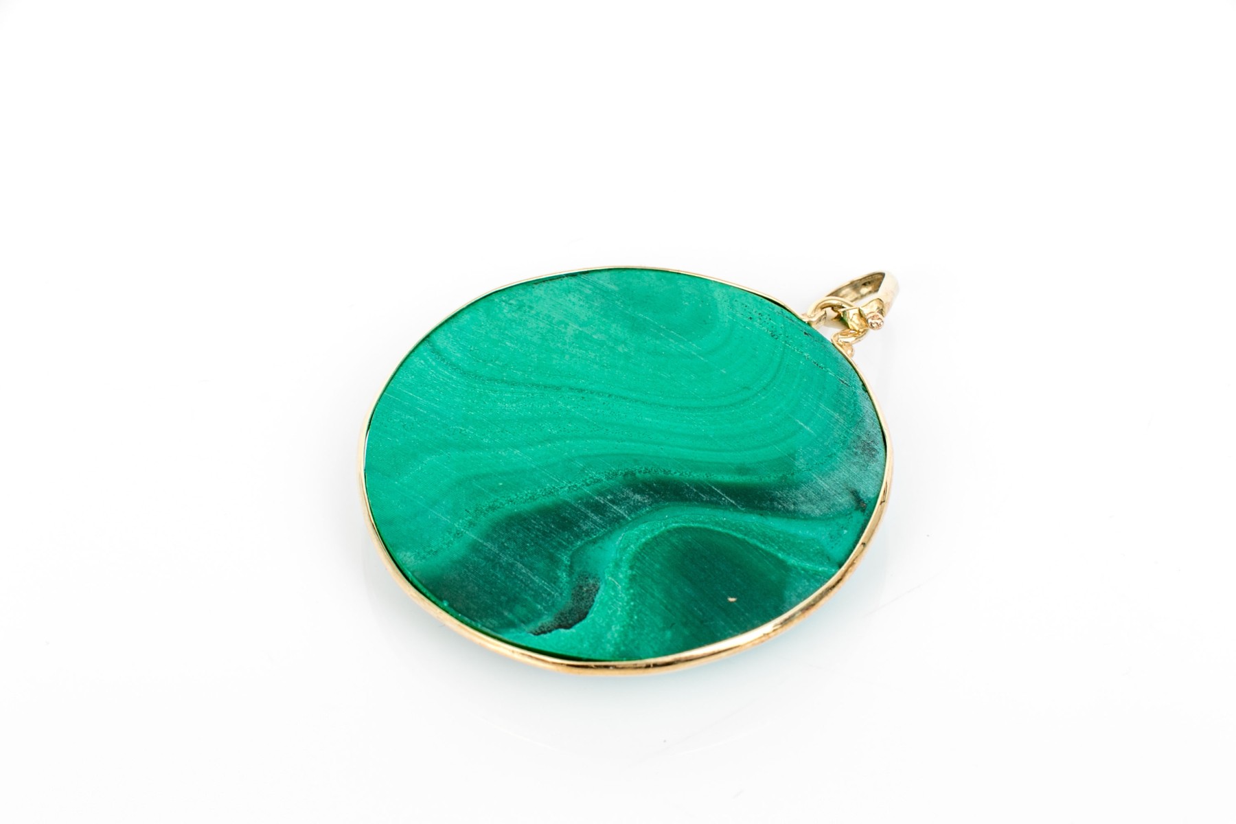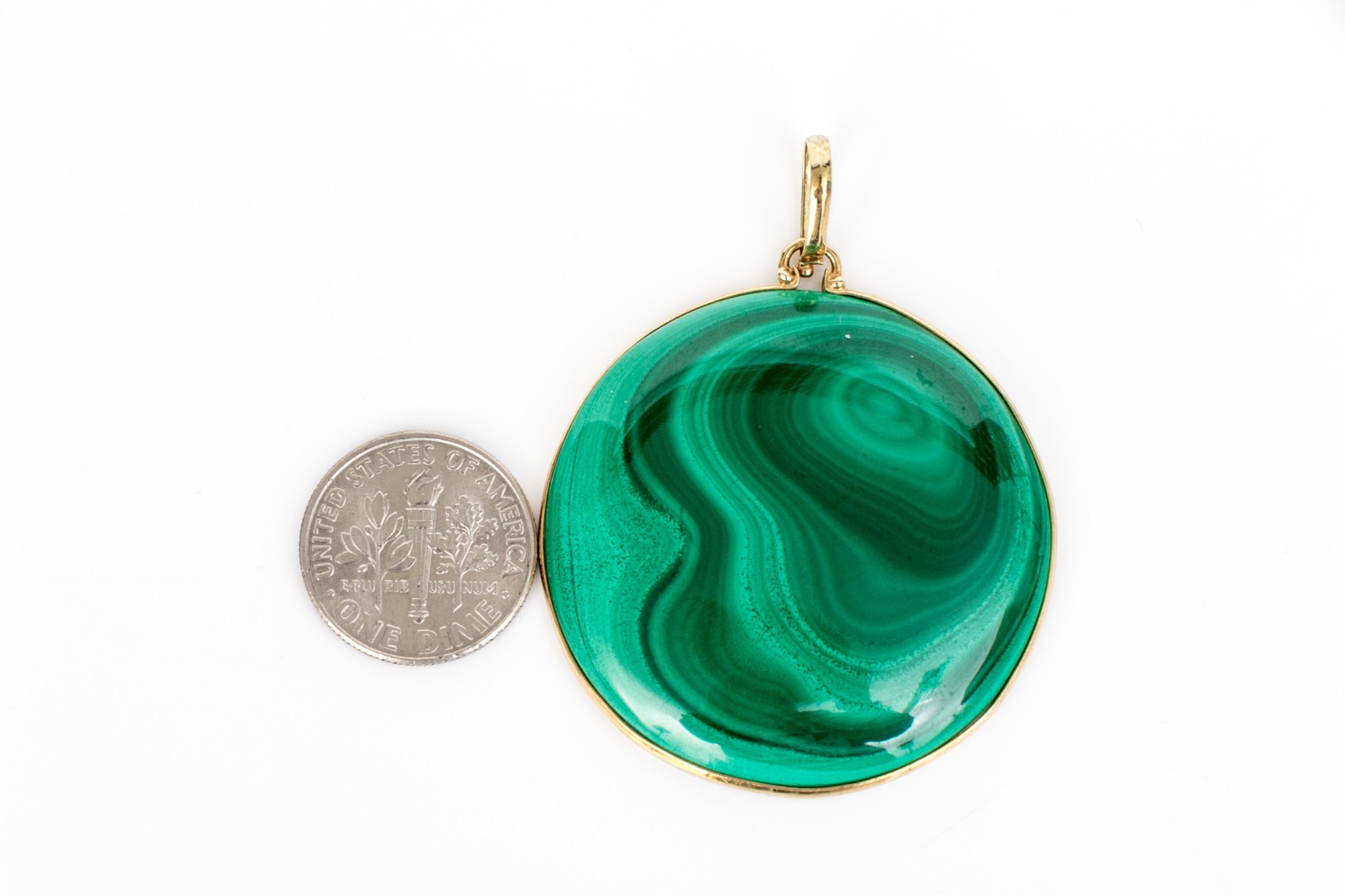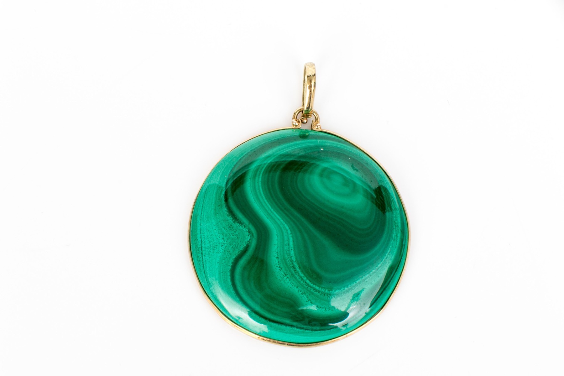 14k yellow gold striking large round green malachite pendant, bezel set,, pierced border and finished with a solid style bale