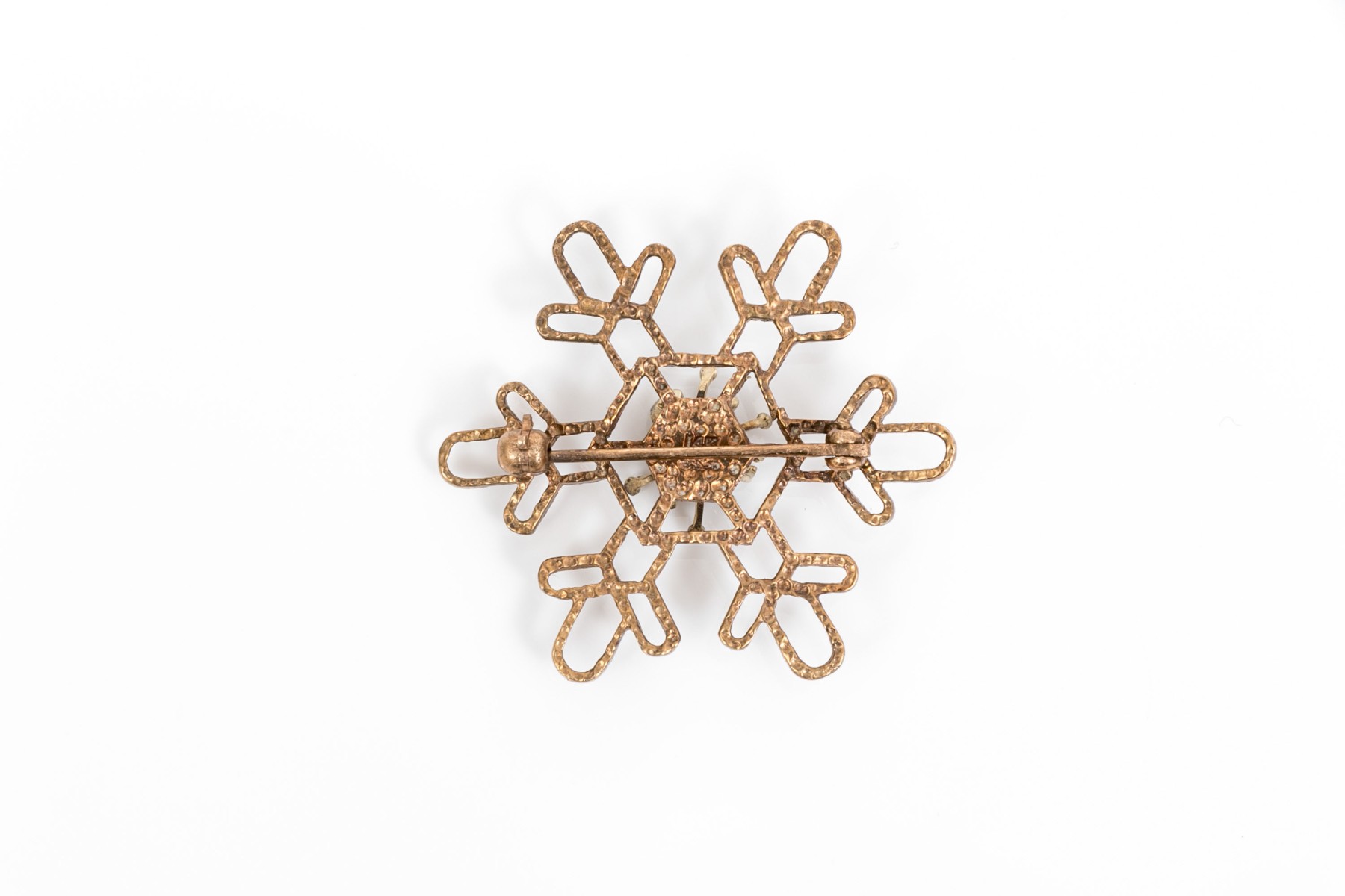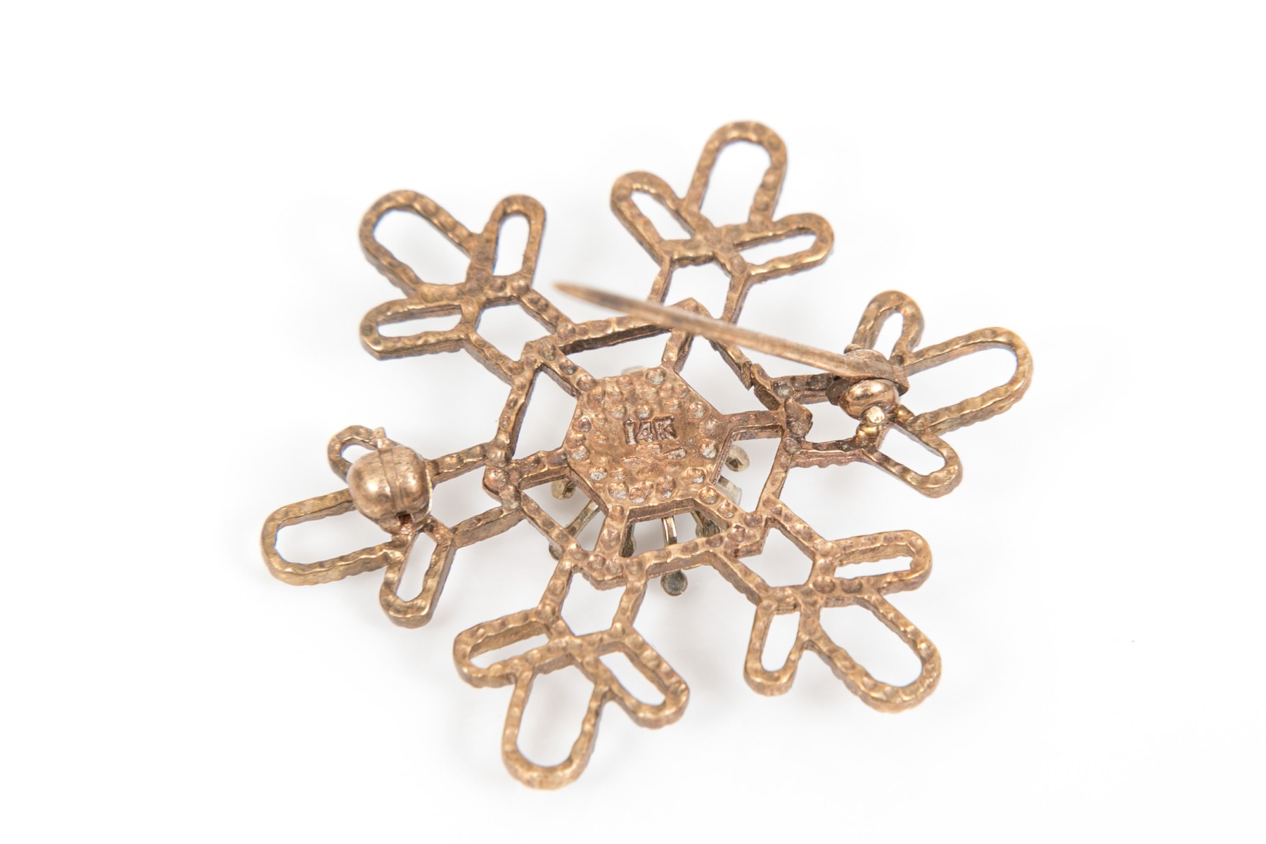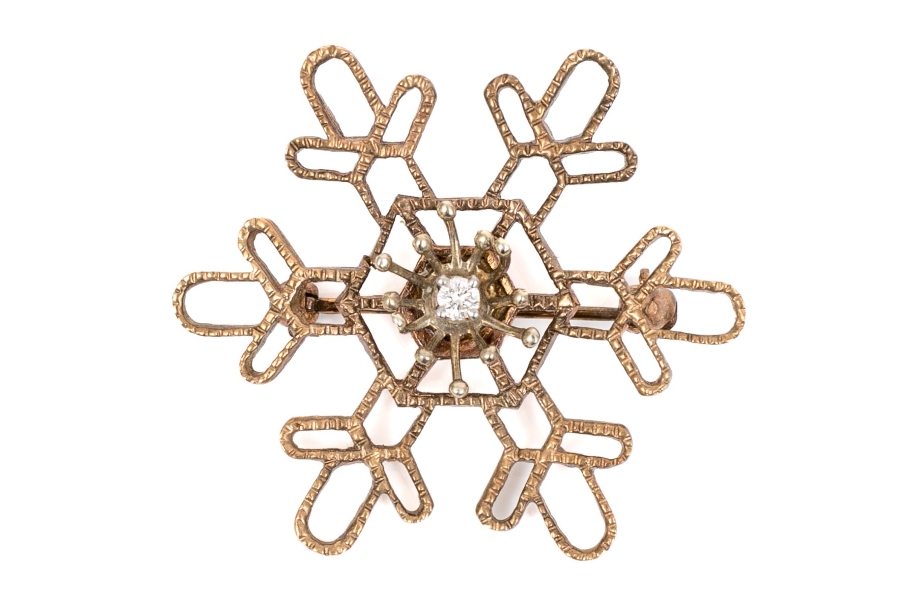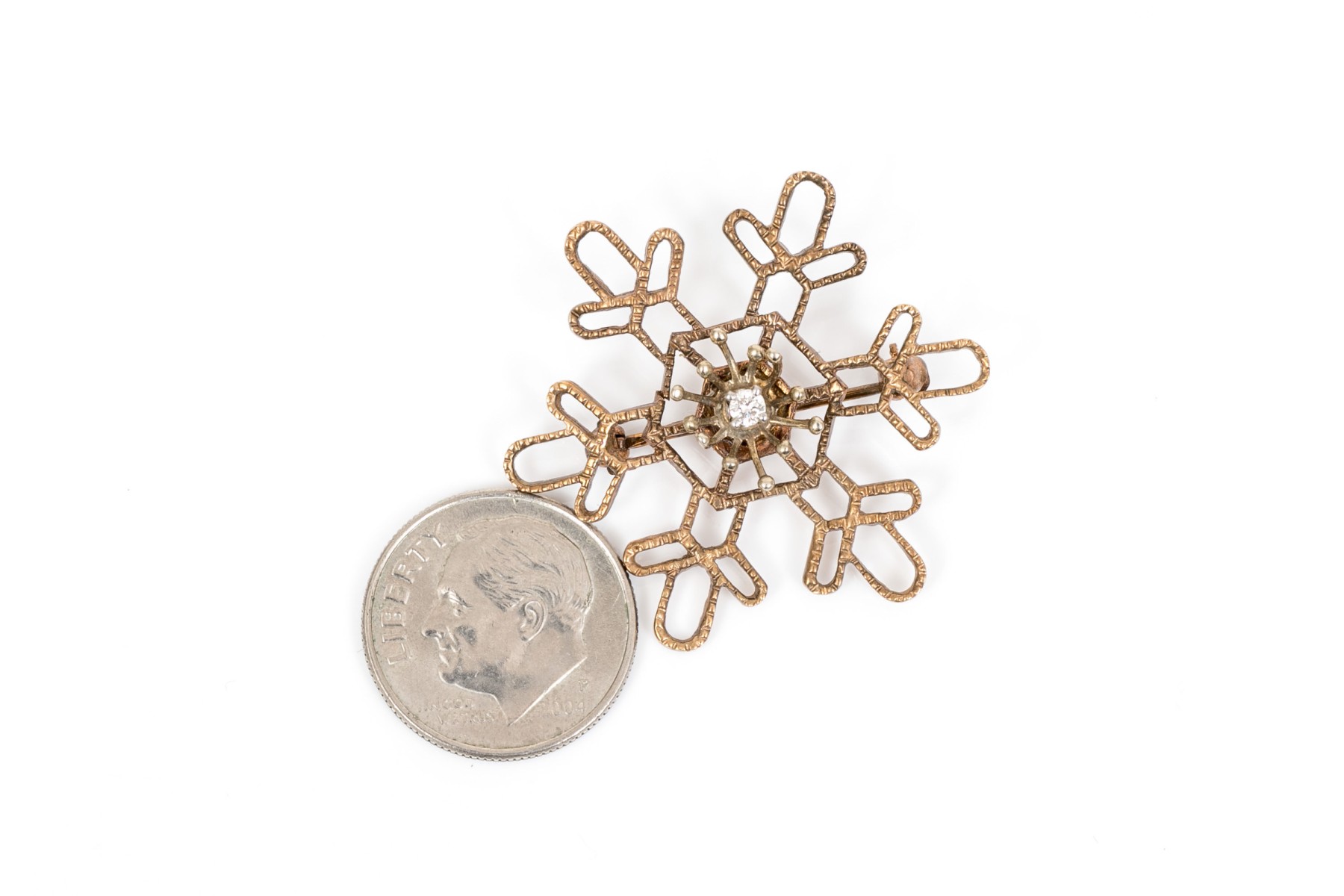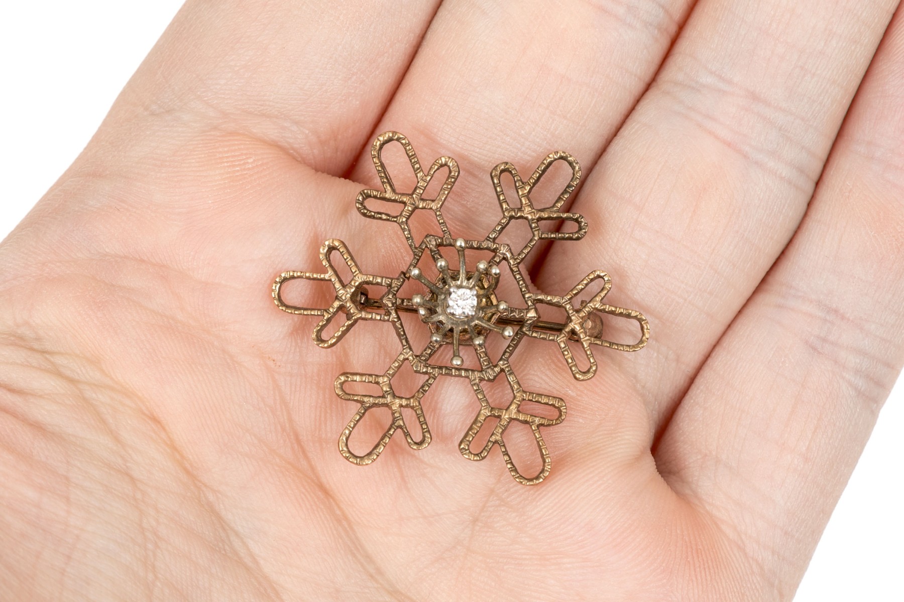 14k yellow gold striking open patterned snowflake brooch, diamond center, app. 0.04 CTS, prong set