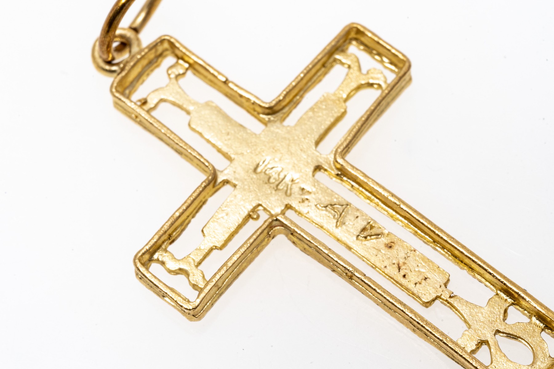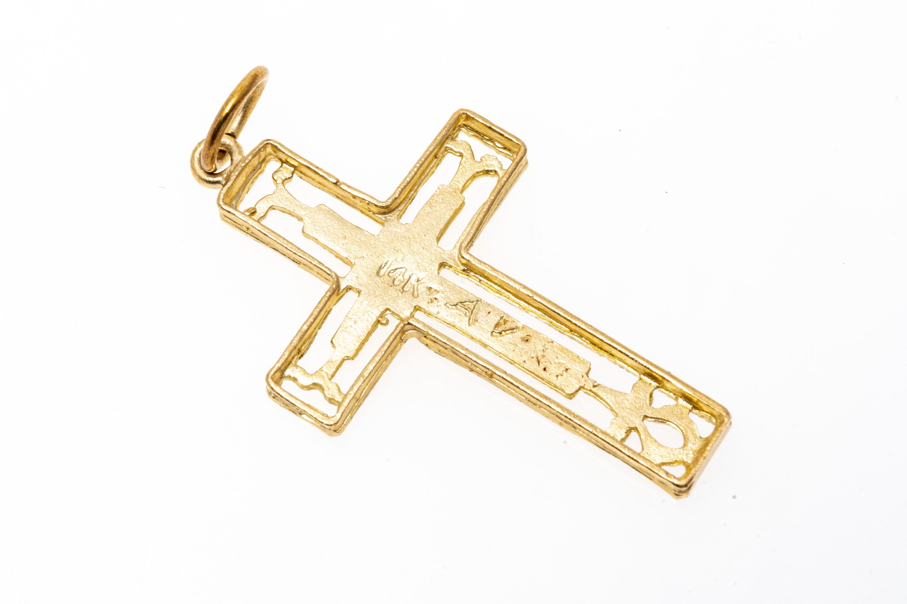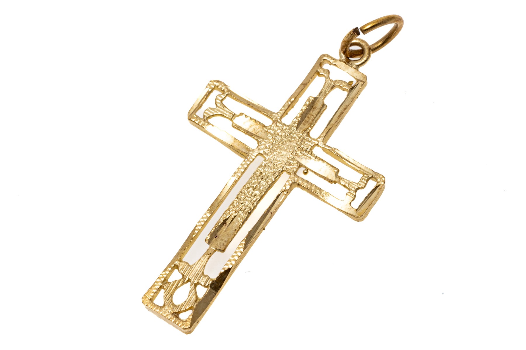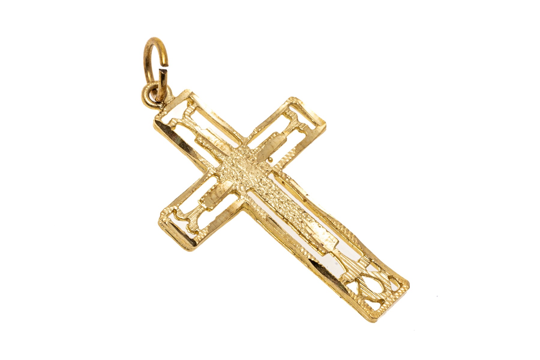 14k yellow gold striking pierced cross, diamond cut, finished with a jump ring style bale