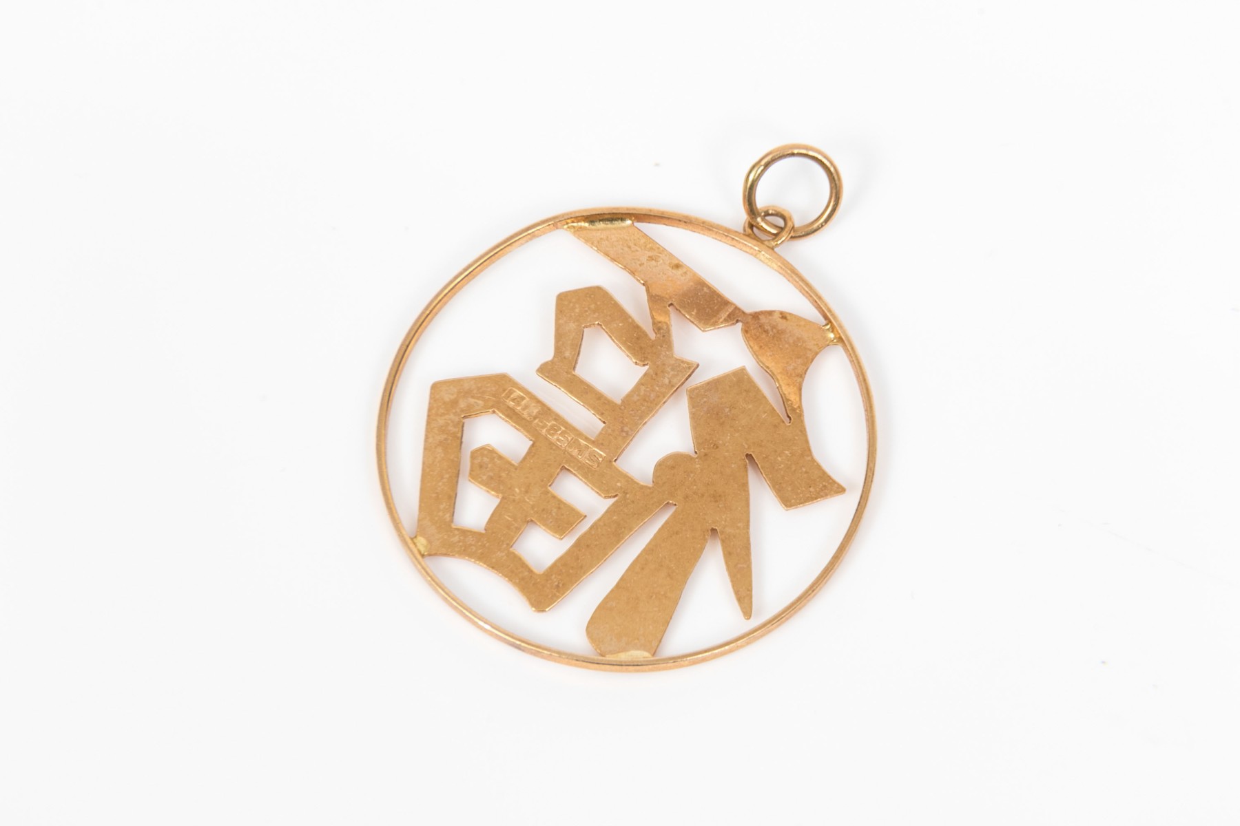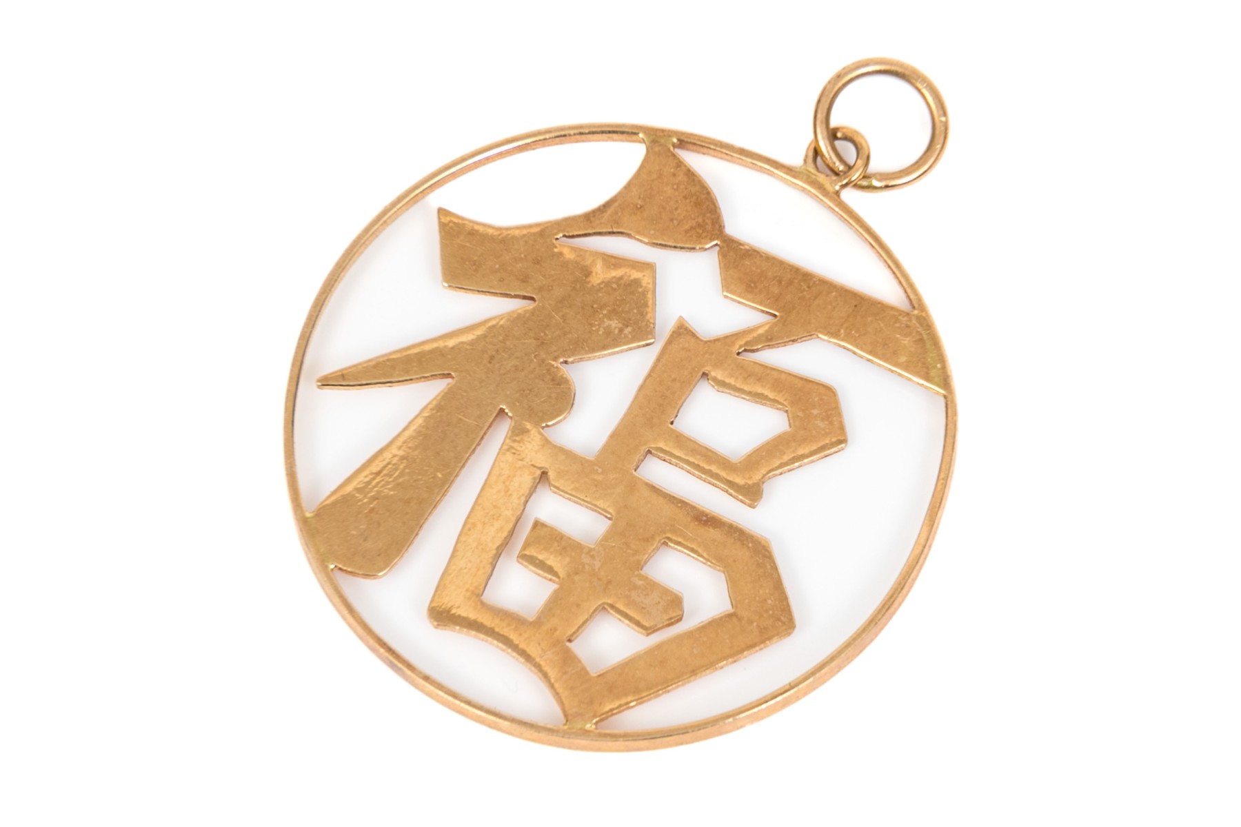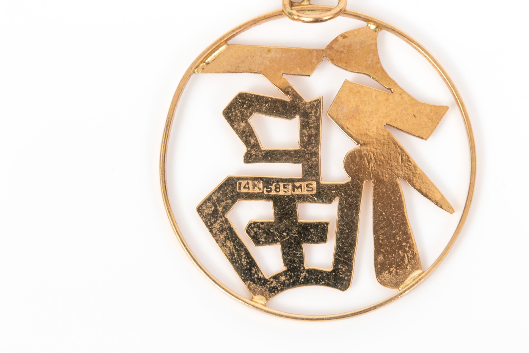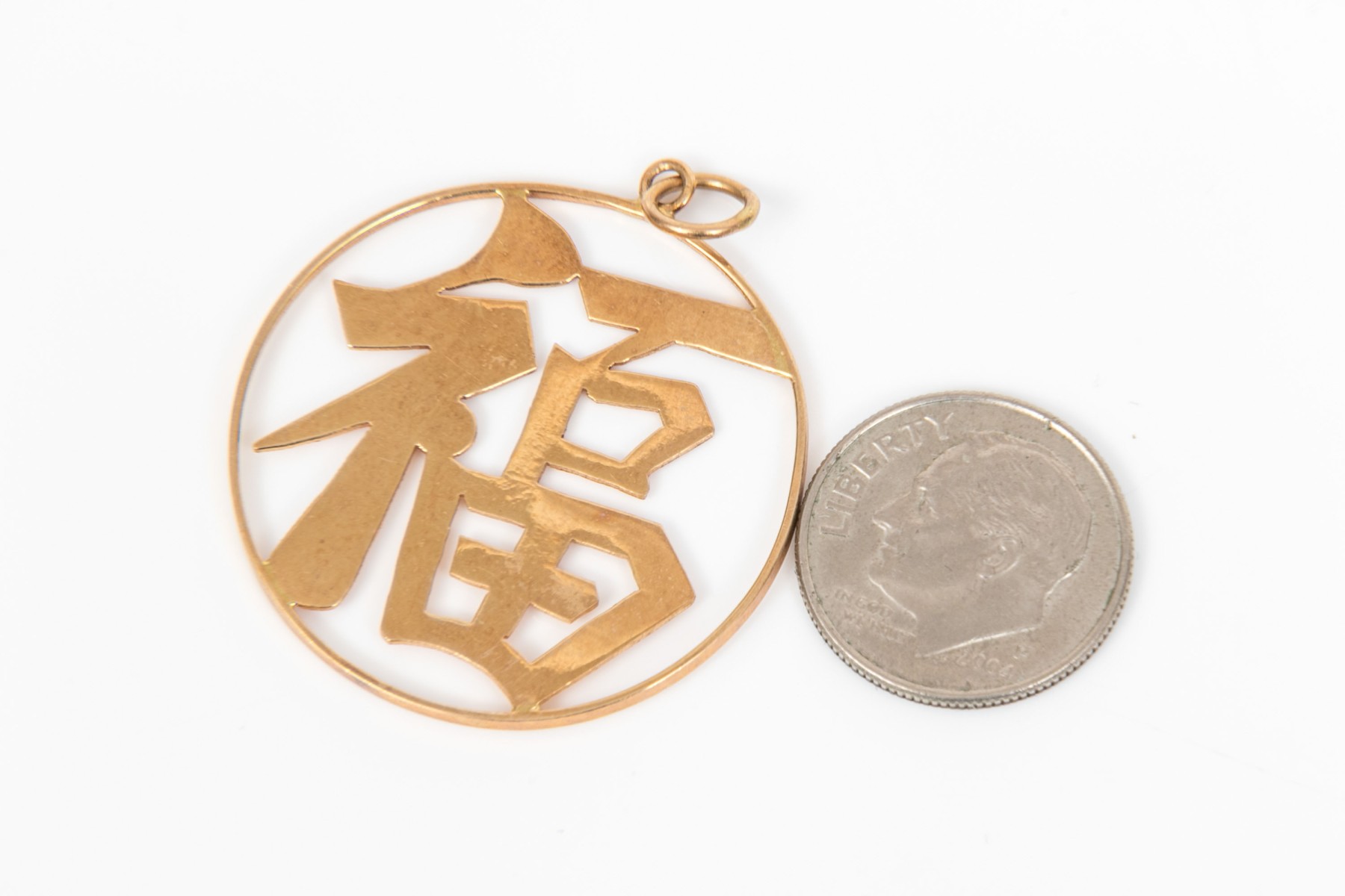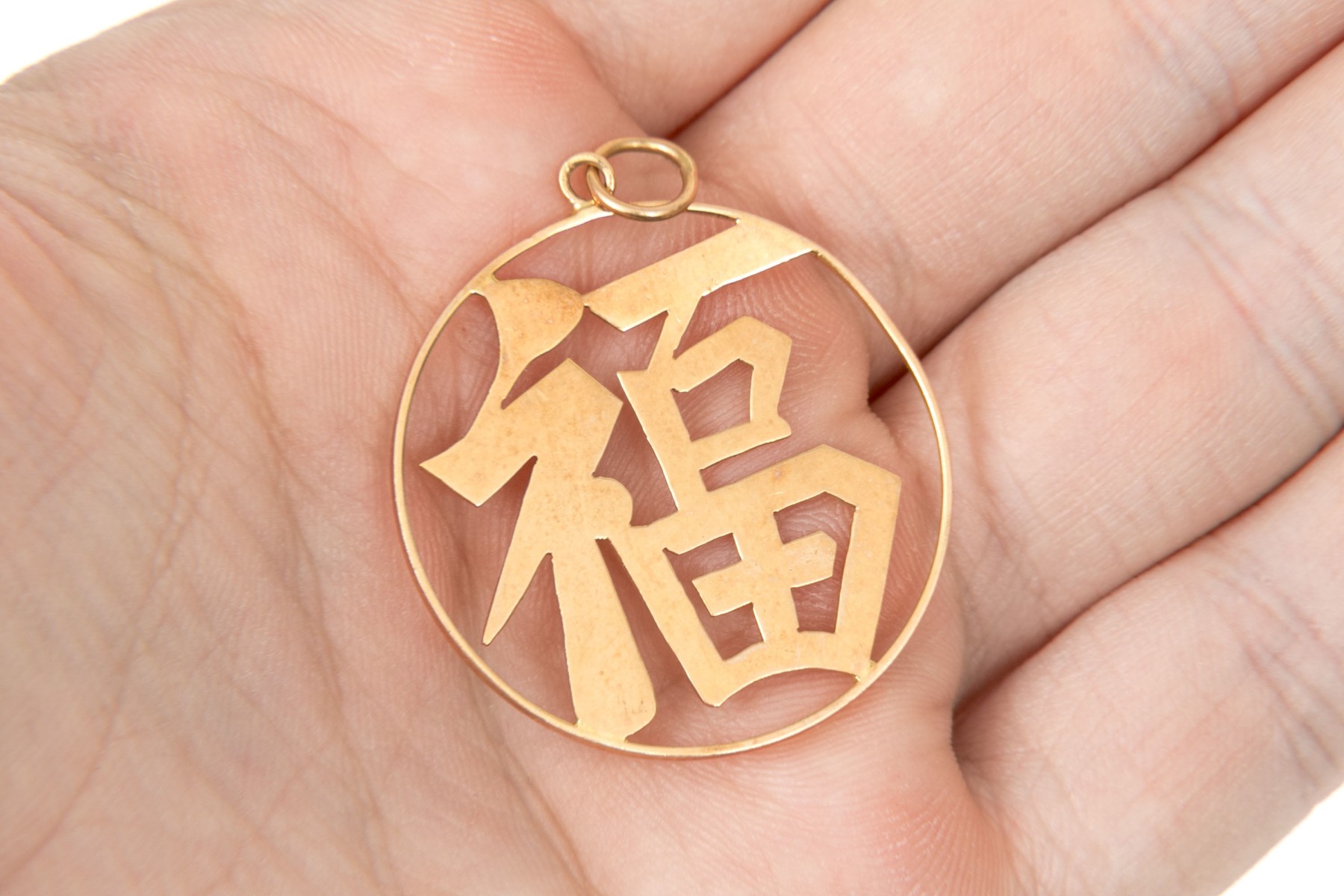 14k yellow gold striking round Chinese calligraphy pendant, finished with a solid bale