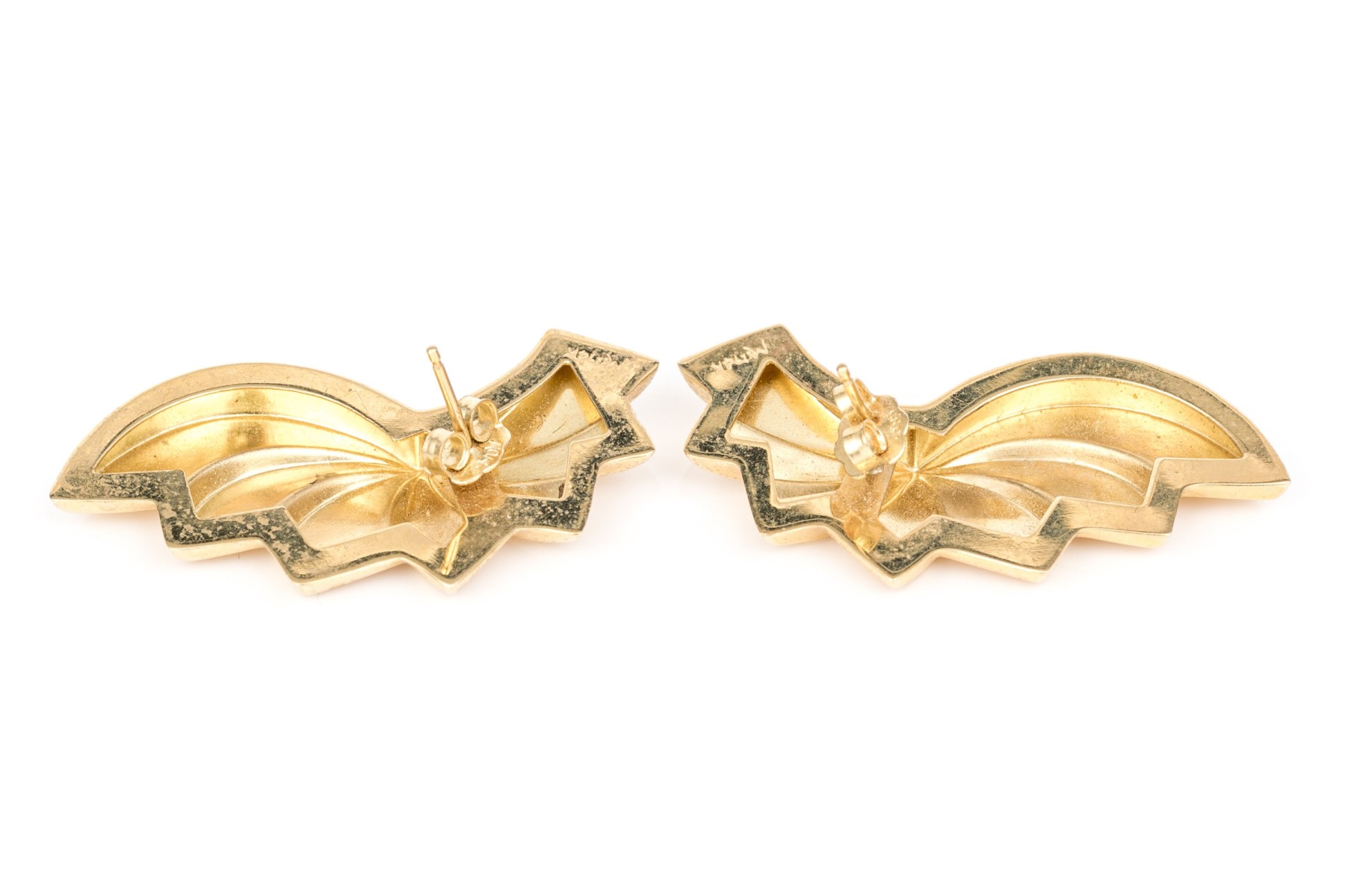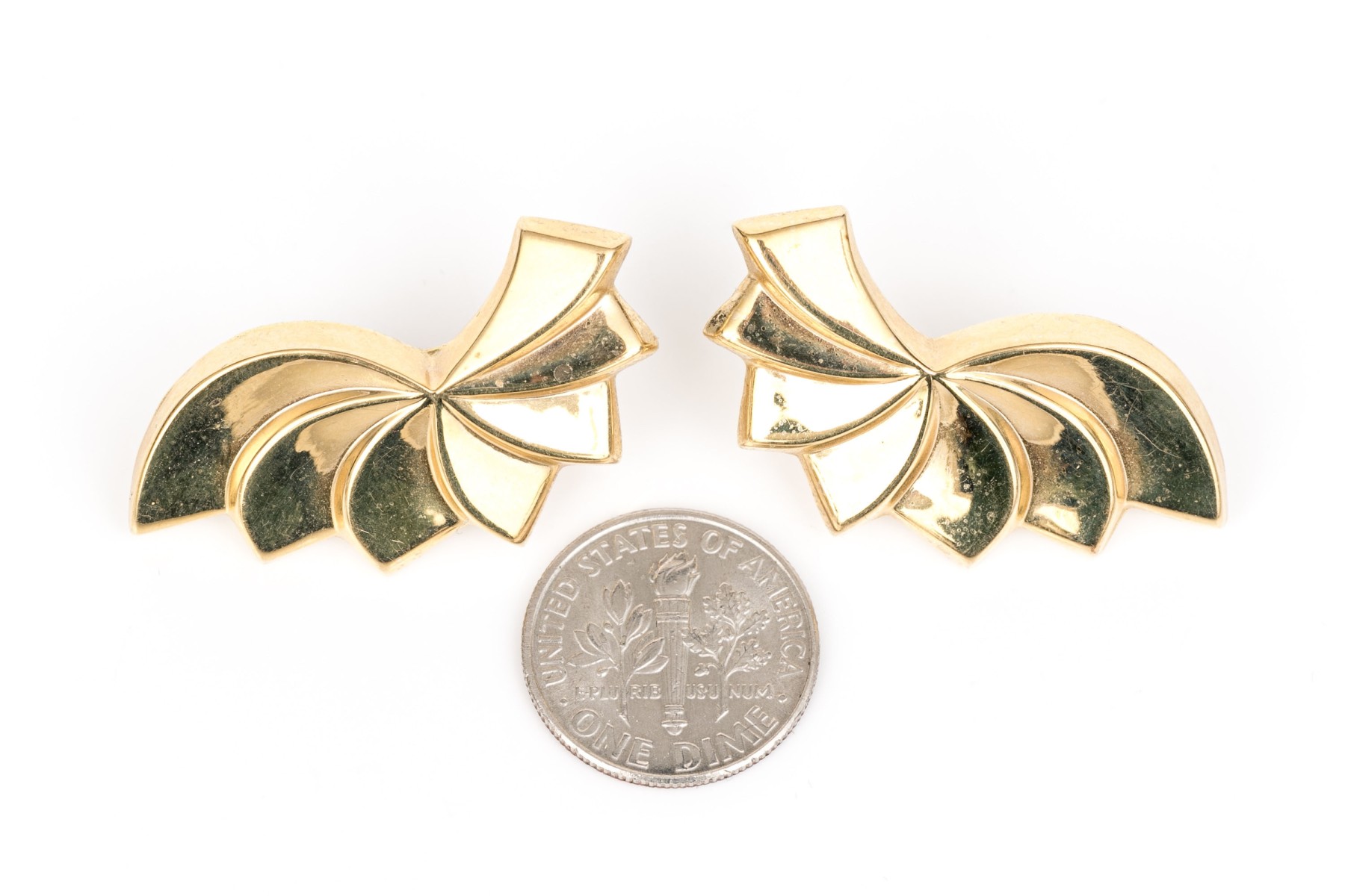 14k yellow gold striking stepped wing motif style earrings, finished by posts with clutch style backs