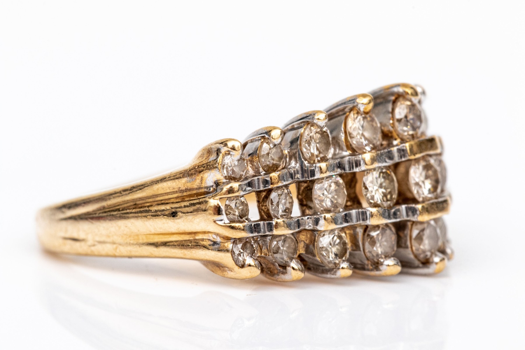 14k yellow gold striking three row diamond dome ring, app. 0.69 TCW, size 5