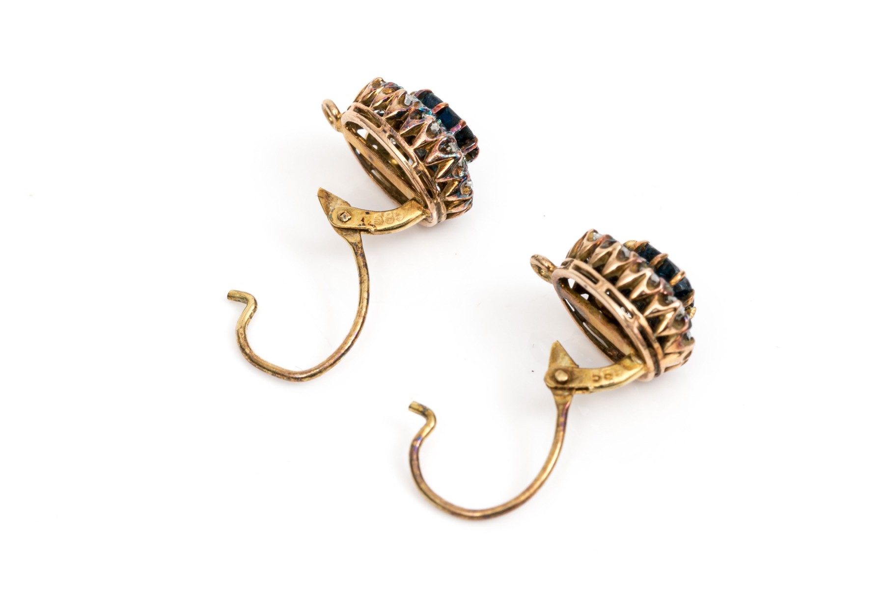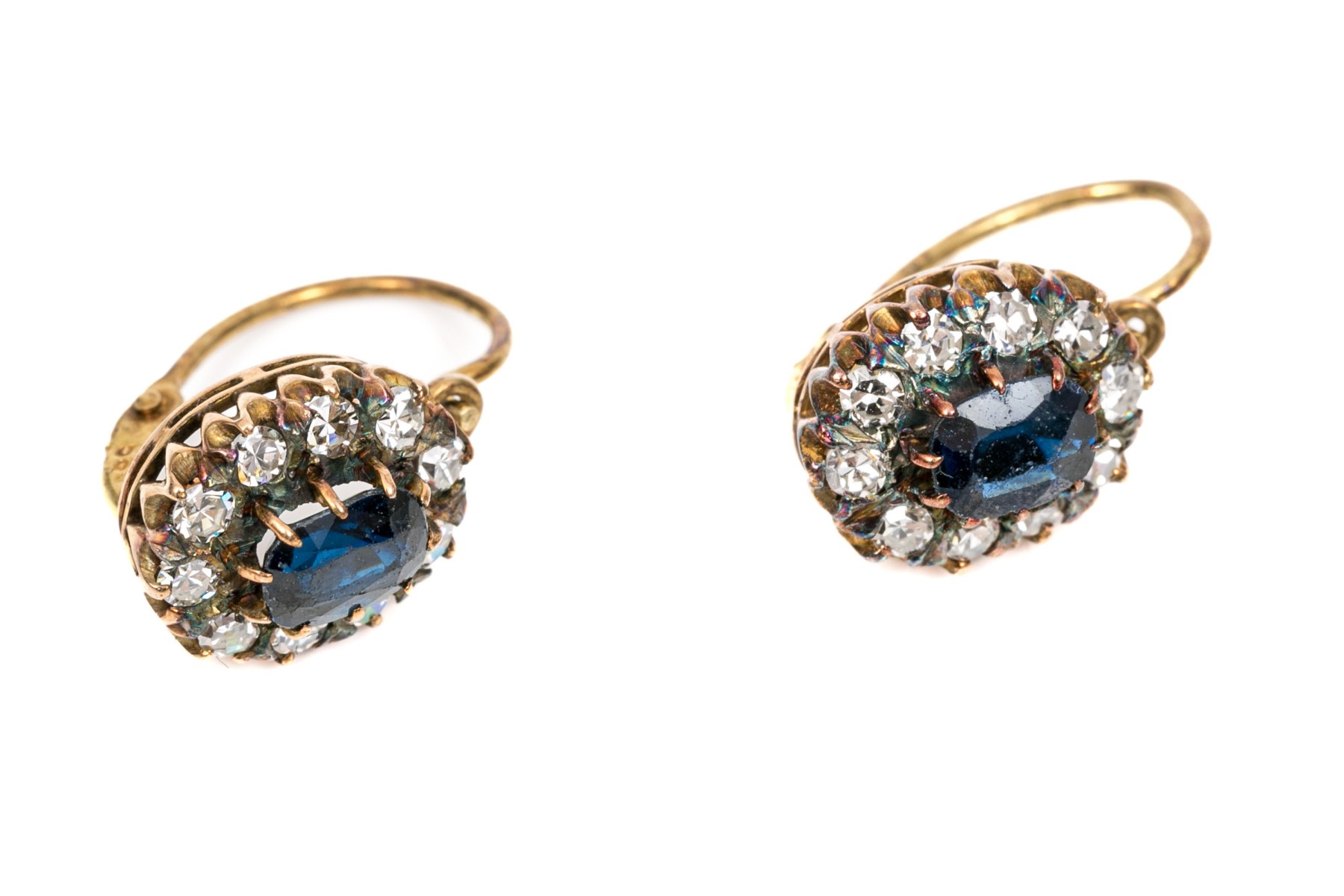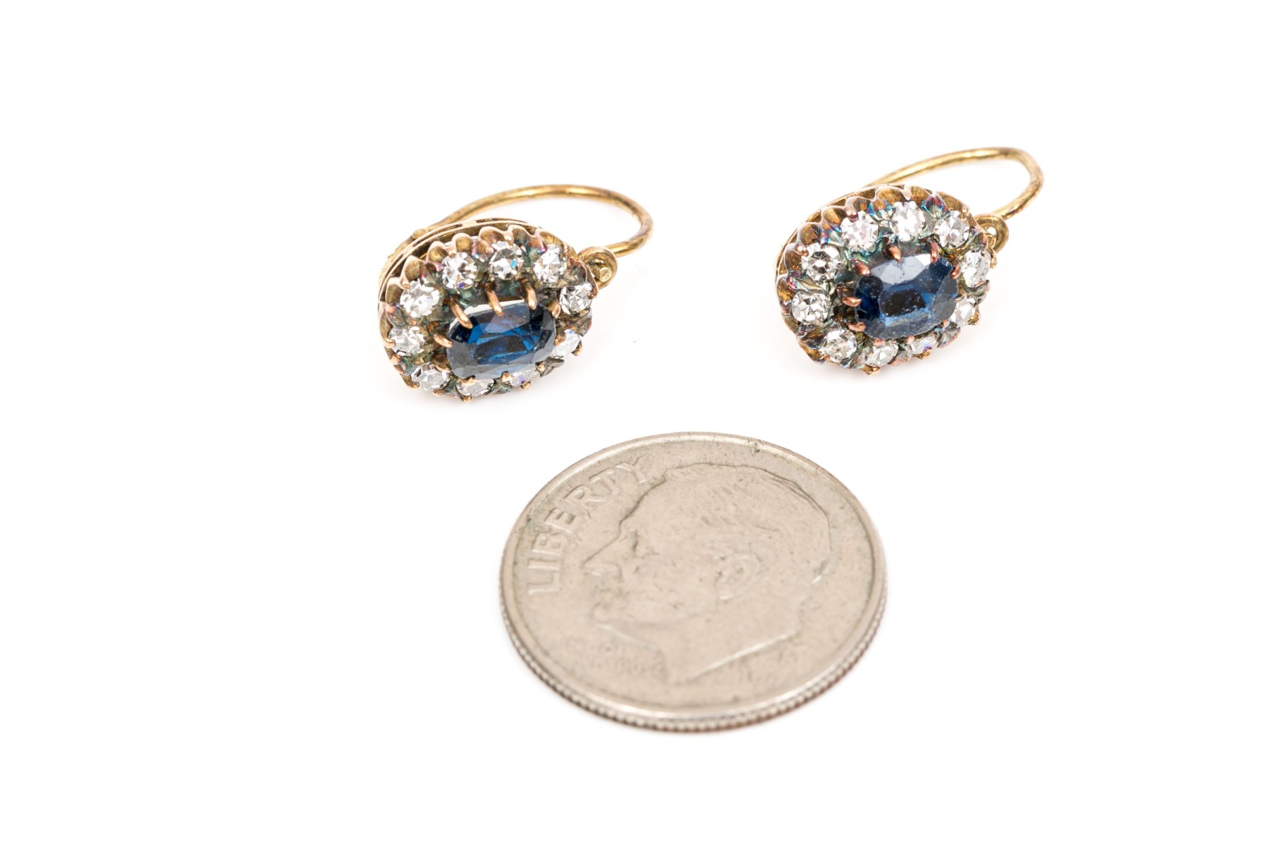 14k yellow gold striking vintage blue and white sapphire halo earrings, finished with wires and lever style backs