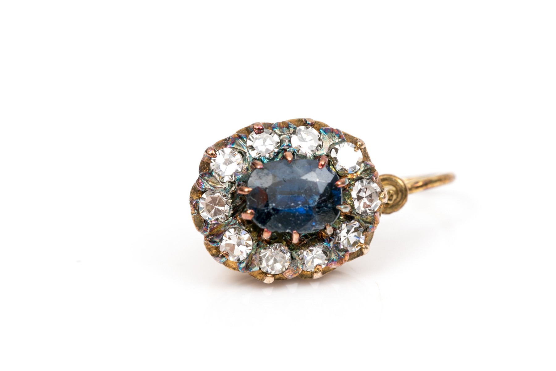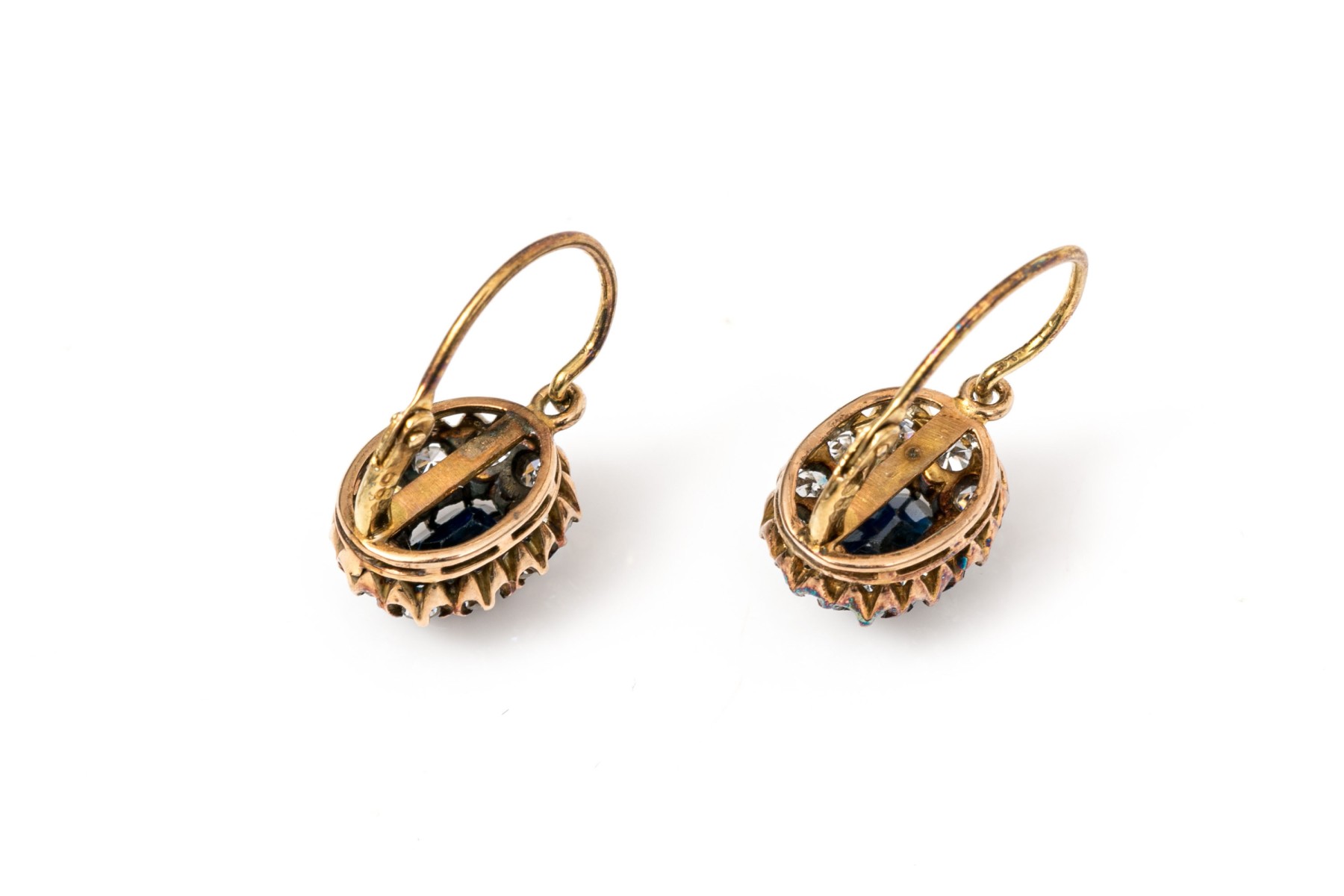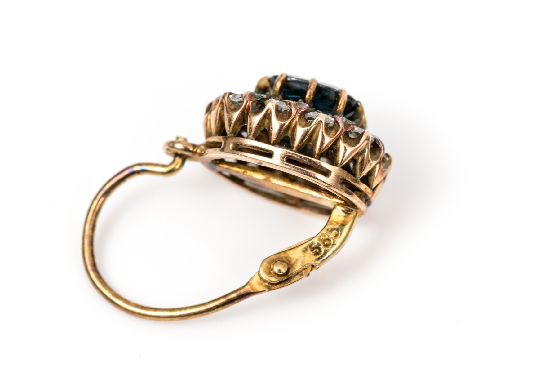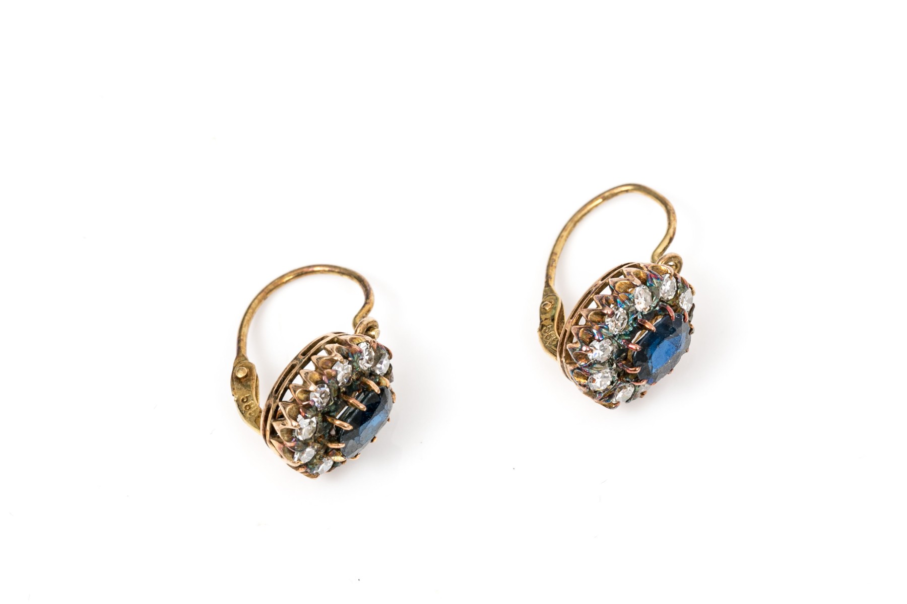 14k yellow gold striking vintage blue and white sapphire halo earrings, finished with wires and lever style backs